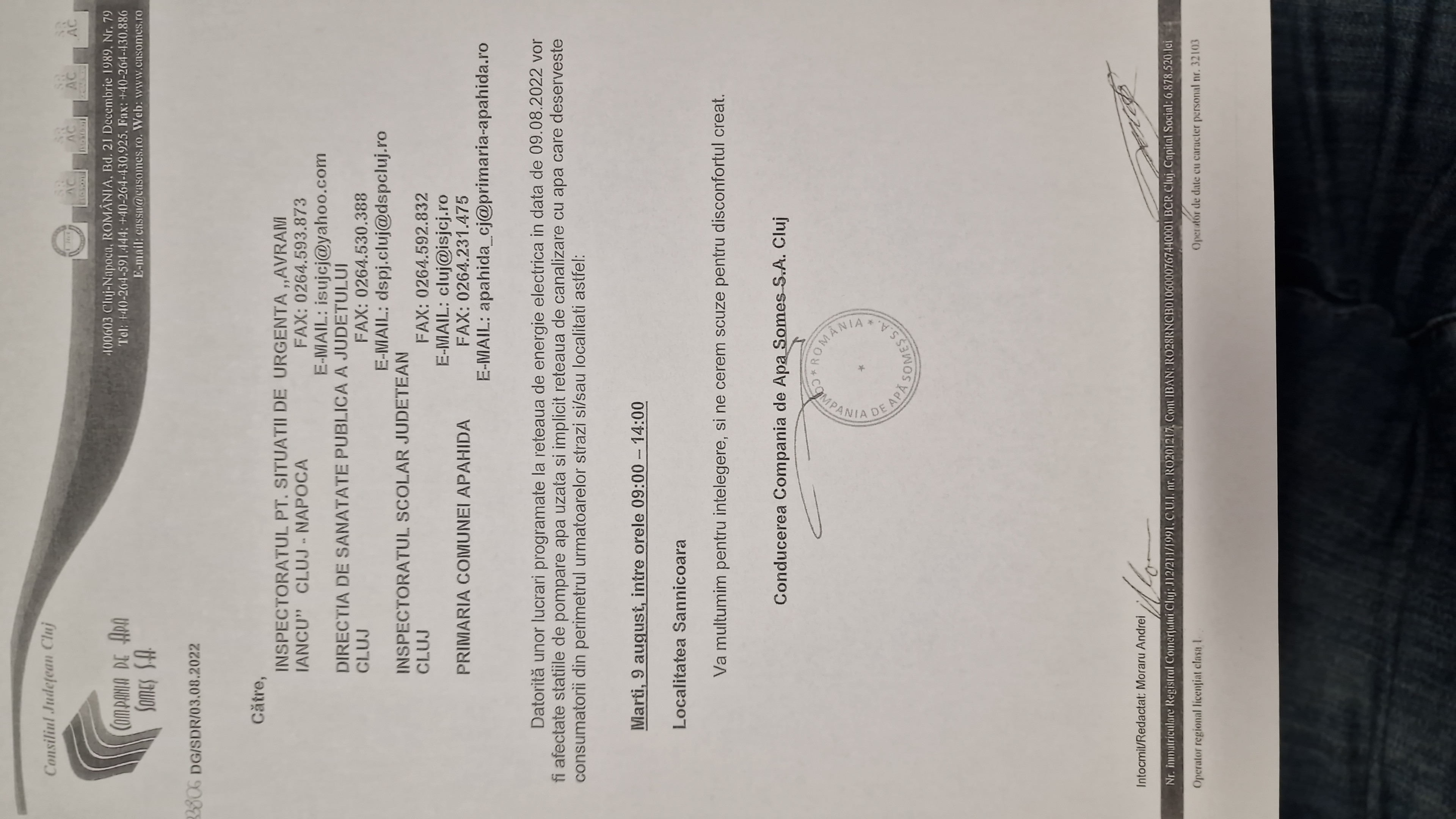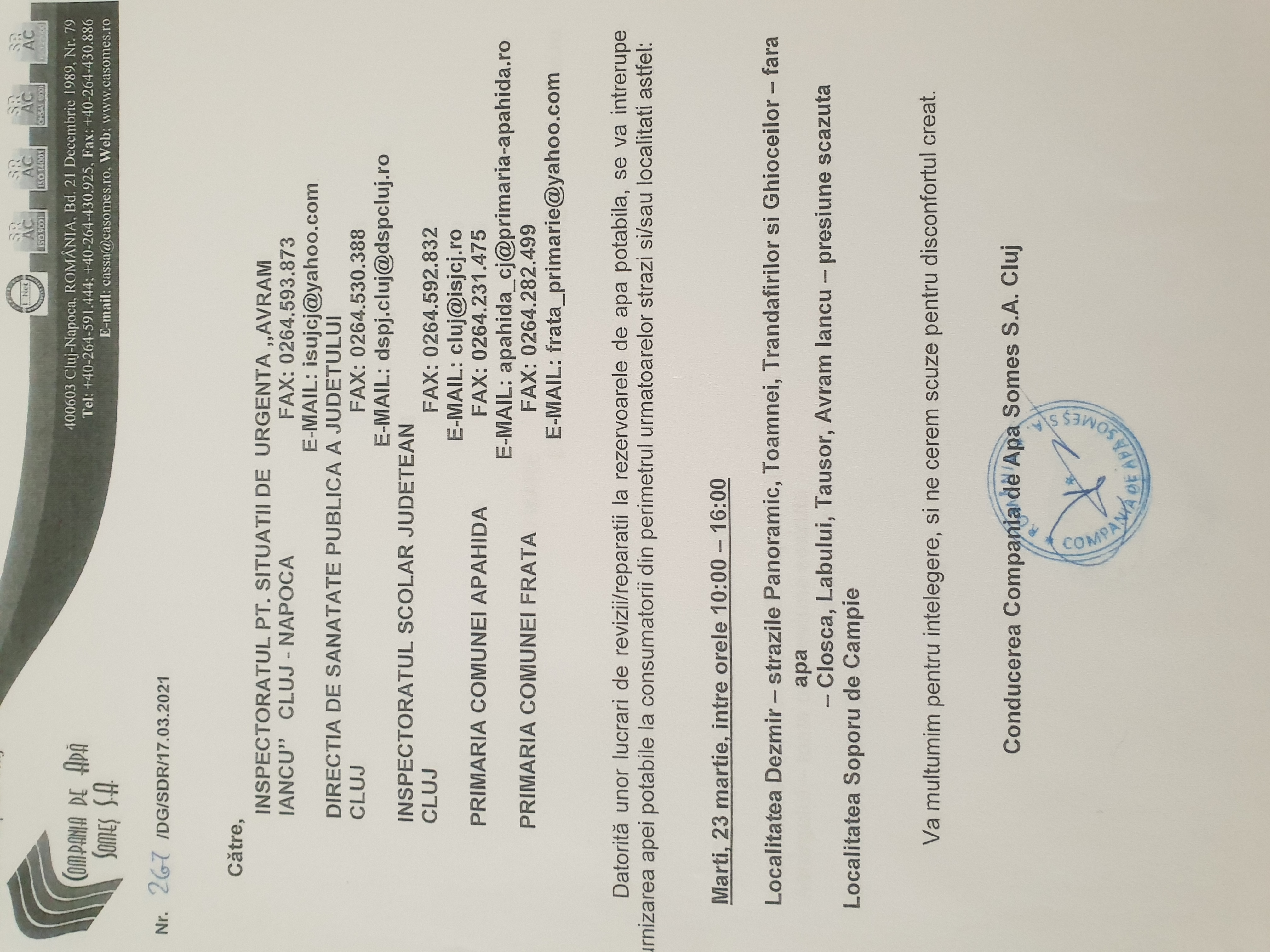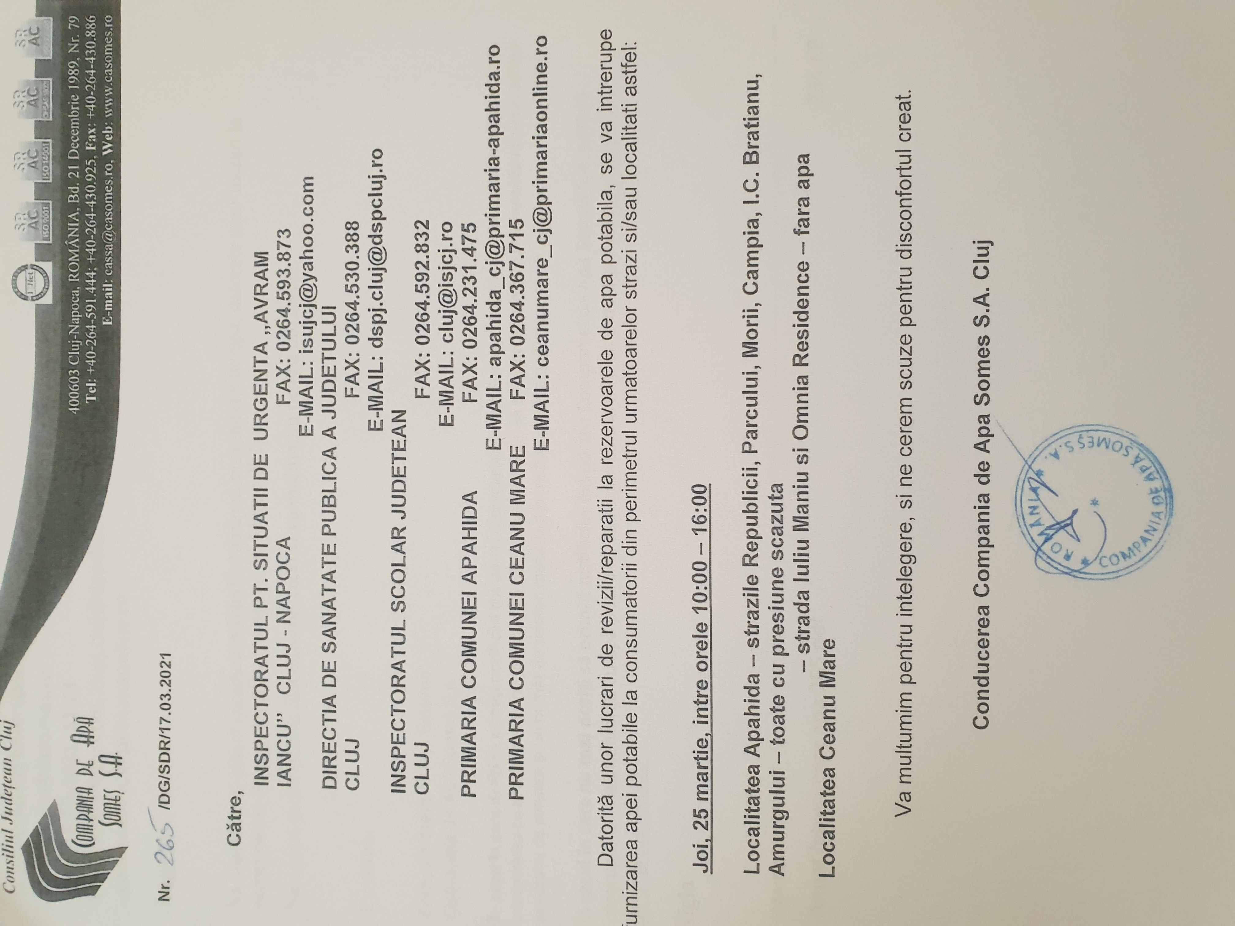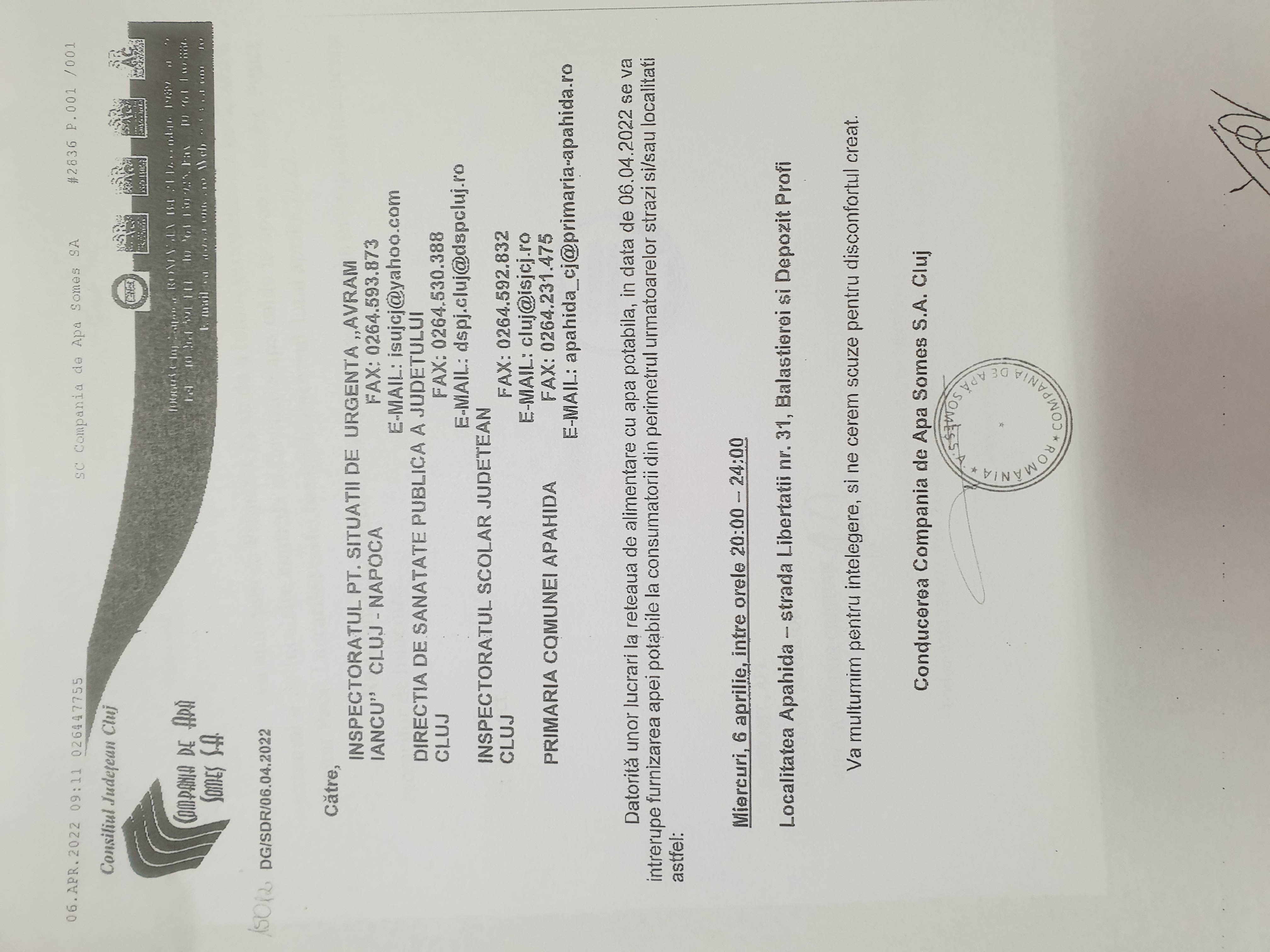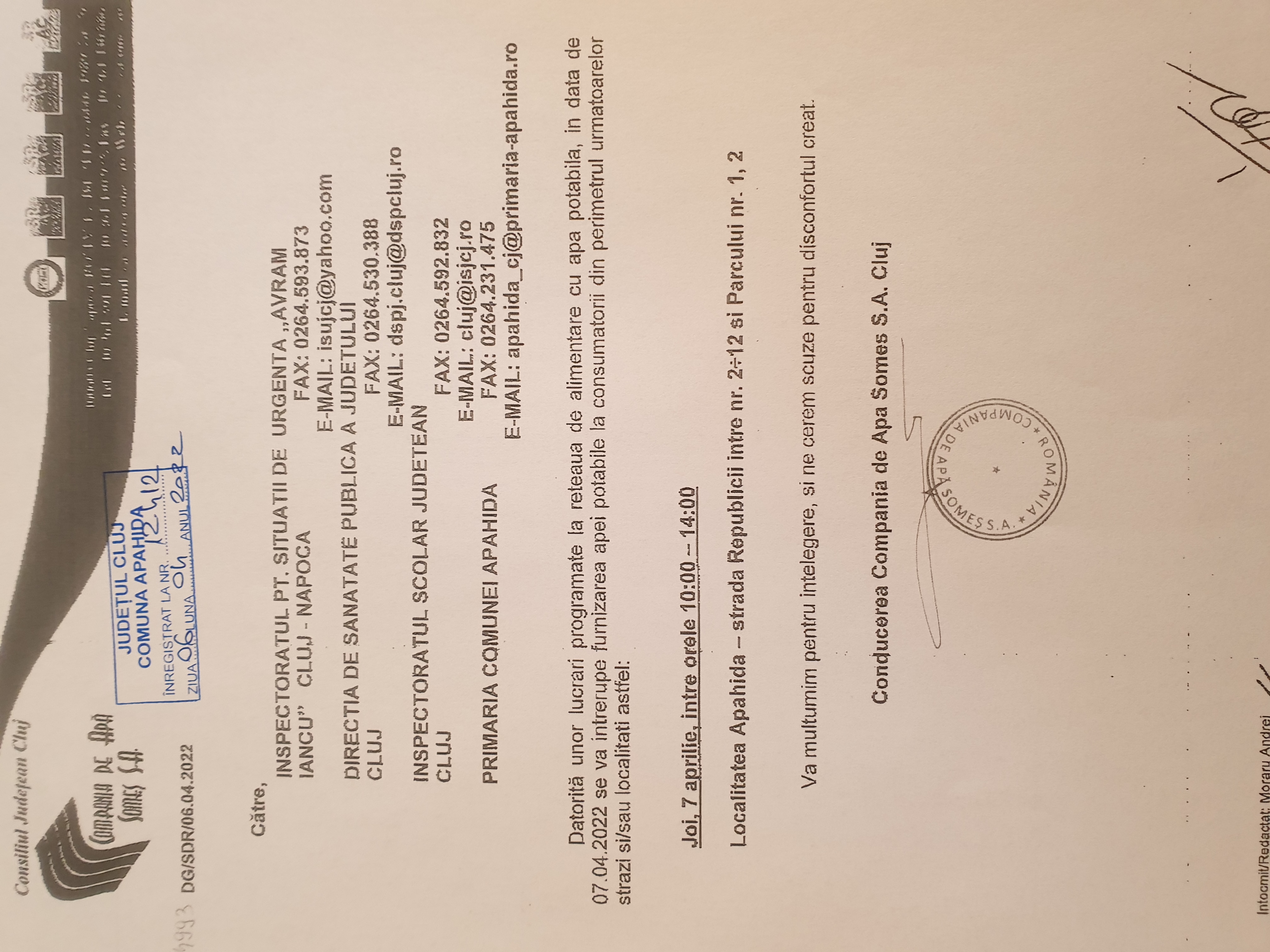 | 15.05.2025 | ANUNȚ IMPORTANT – SISTARE TEMPORARĂ A APEI POTABILE Stimați cetățeni, Vă informăm că, în perioada marți, 20 mai 2025 , ora 06:00 – vineri, 23 mai 2025, ora 20:00, furnizarea apei potabile va fi temporar întreruptă în comuna Apahida, ca urmare a unor lucrări de anvergură desfășurate de Compania de Apă Someș S.A.. Aceste lucrări fac parte dintr-un proiect regional major, care vizează modernizarea rețelelor de apă în zeci de comune din județul Cluj, inclusiv în municipiul Cluj-Napoca. Menționăm că proiectul este gestionat integral de Compania de Apă, care își asumă execuția lucrărilor, programul și eventualele întreruperi în furnizarea serviciului. În cazul în care apar modificări sau informații suplimentare din partea companiei, le vom comunica de îndată aici . Vă mulțumim pentru înțelegere și răbdare! Primăria Apahida |