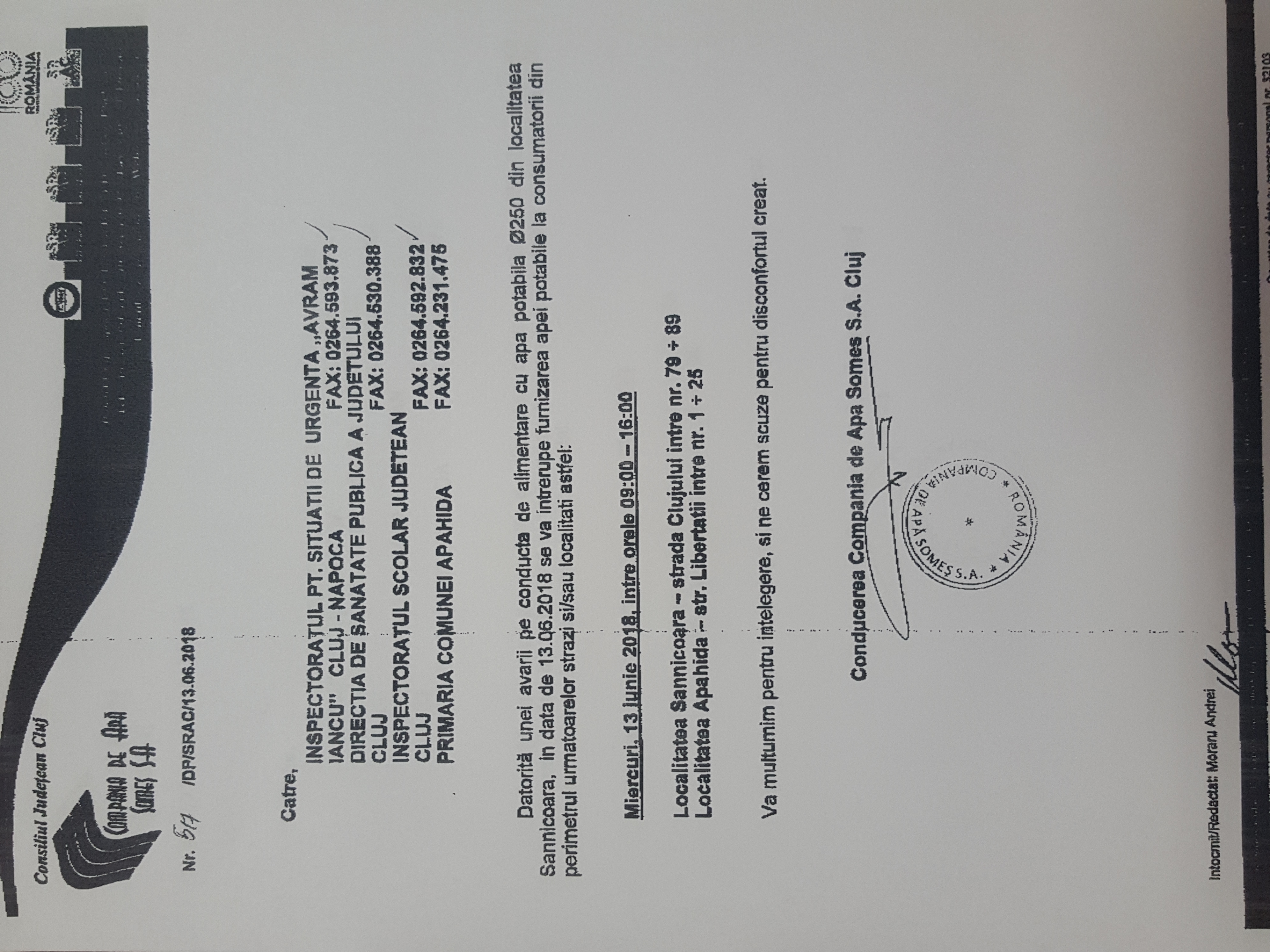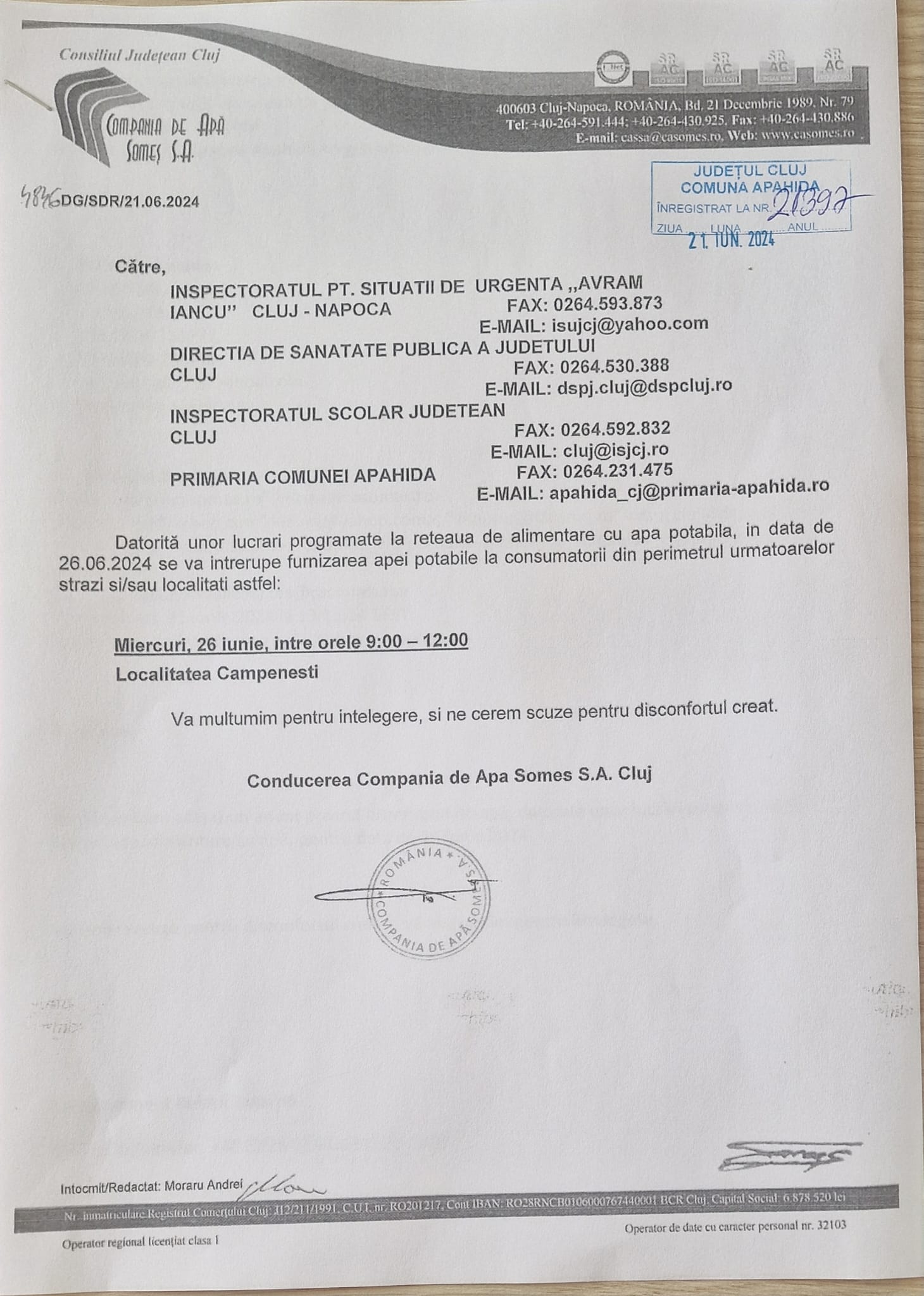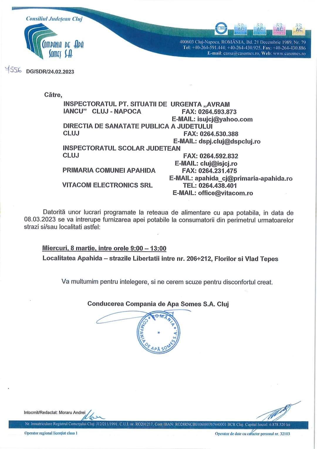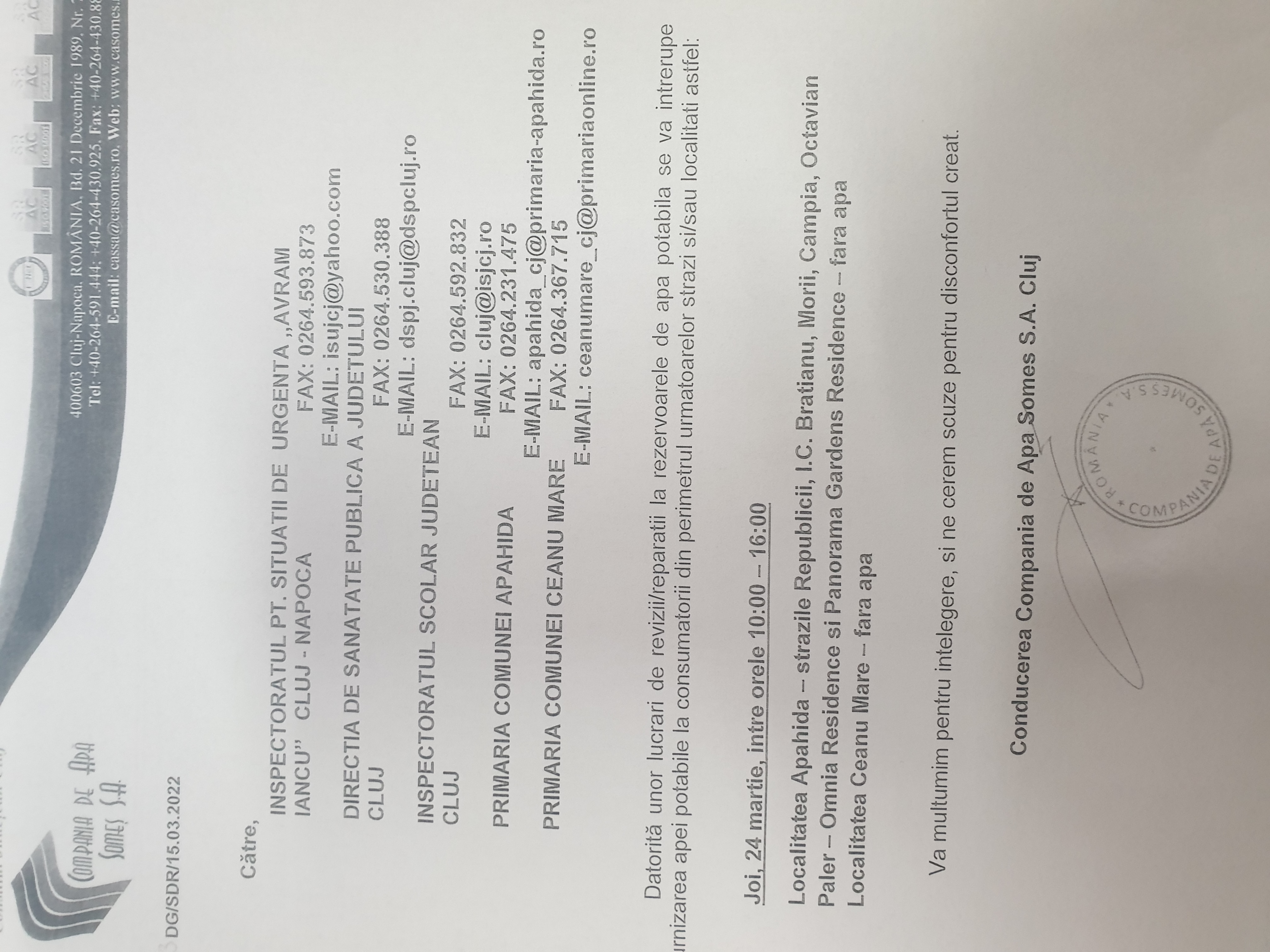 | 15.05.2025 | ANUNȚ IMPORTANT – SISTARE TEMPORARĂ A APEI POTABILE Stimați cetățeni, Vă informăm că, în perioada marți, 20 mai 2025 , ora 06:00 – vineri, 23 mai 2025, ora 20:00, furnizarea apei potabile va fi temporar întreruptă în comuna Apahida, ca urmare a unor lucrări de anvergură desfășurate de Compania de Apă Someș S.A.. Aceste lucrări fac parte dintr-un proiect regional major, care vizează modernizarea rețelelor de apă în zeci de comune din județul Cluj, inclusiv în municipiul Cluj-Napoca. Menționăm că proiectul este gestionat integral de Compania de Apă, care își asumă execuția lucrărilor, programul și eventualele întreruperi în furnizarea serviciului. În cazul în care apar modificări sau informații suplimentare din partea companiei, le vom comunica de îndată aici . Vă mulțumim pentru înțelegere și răbdare! Primăria Apahida |