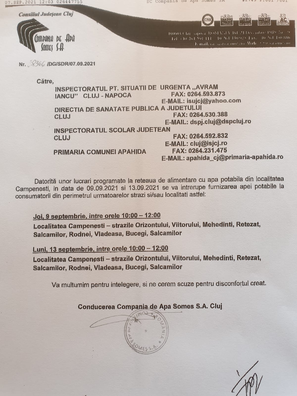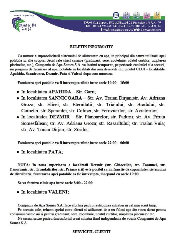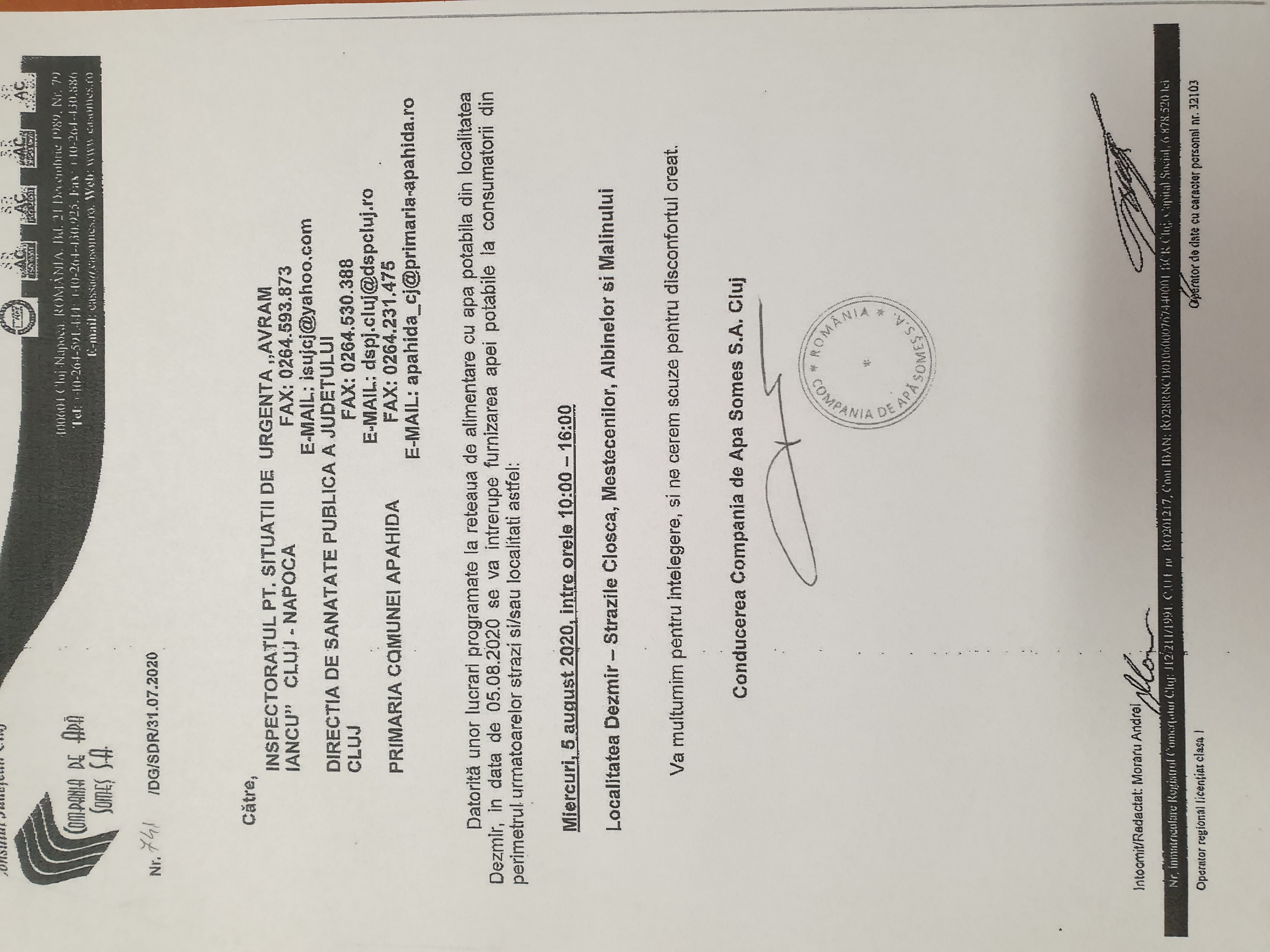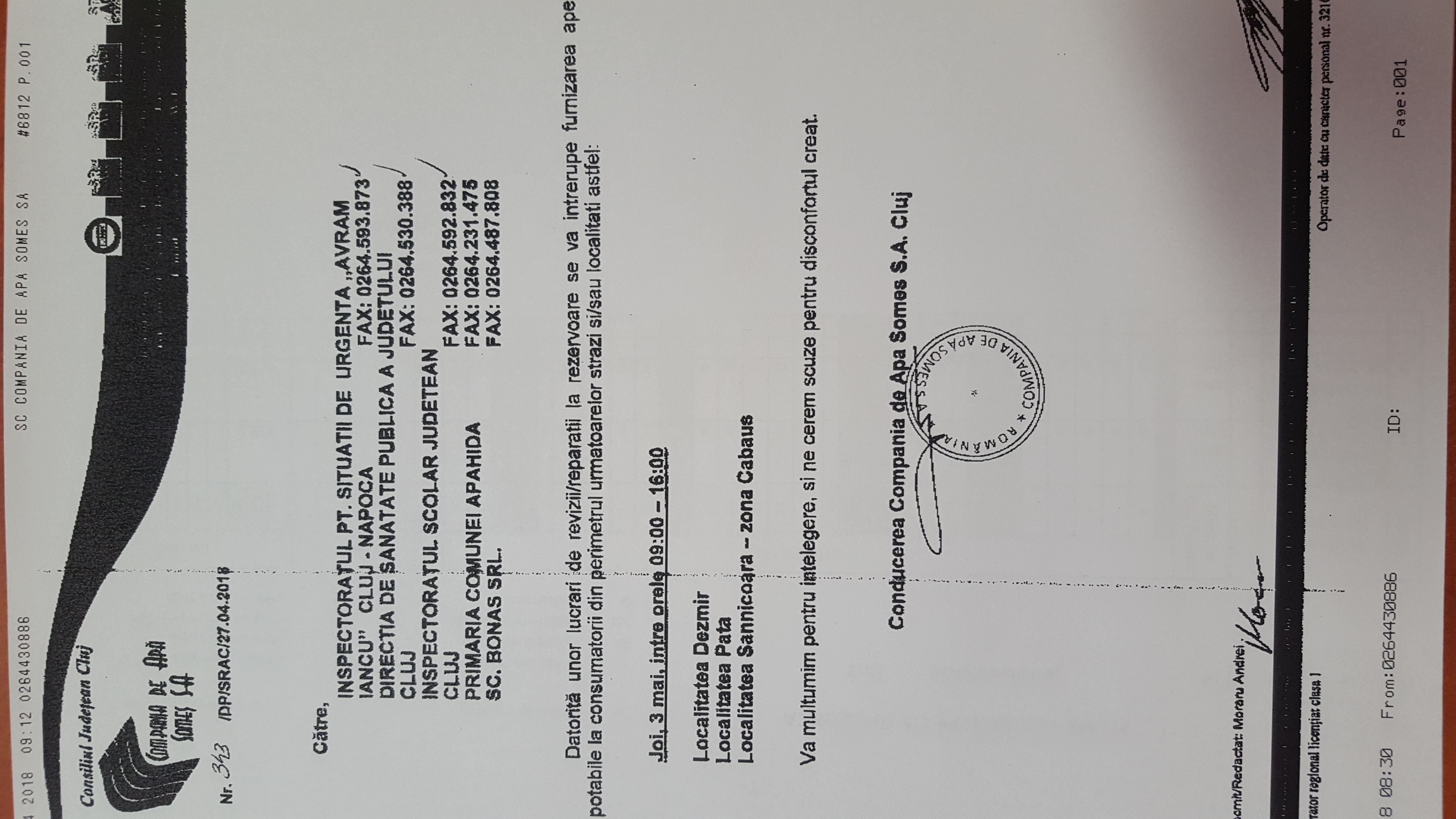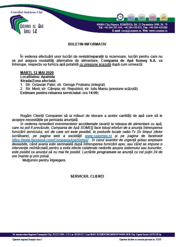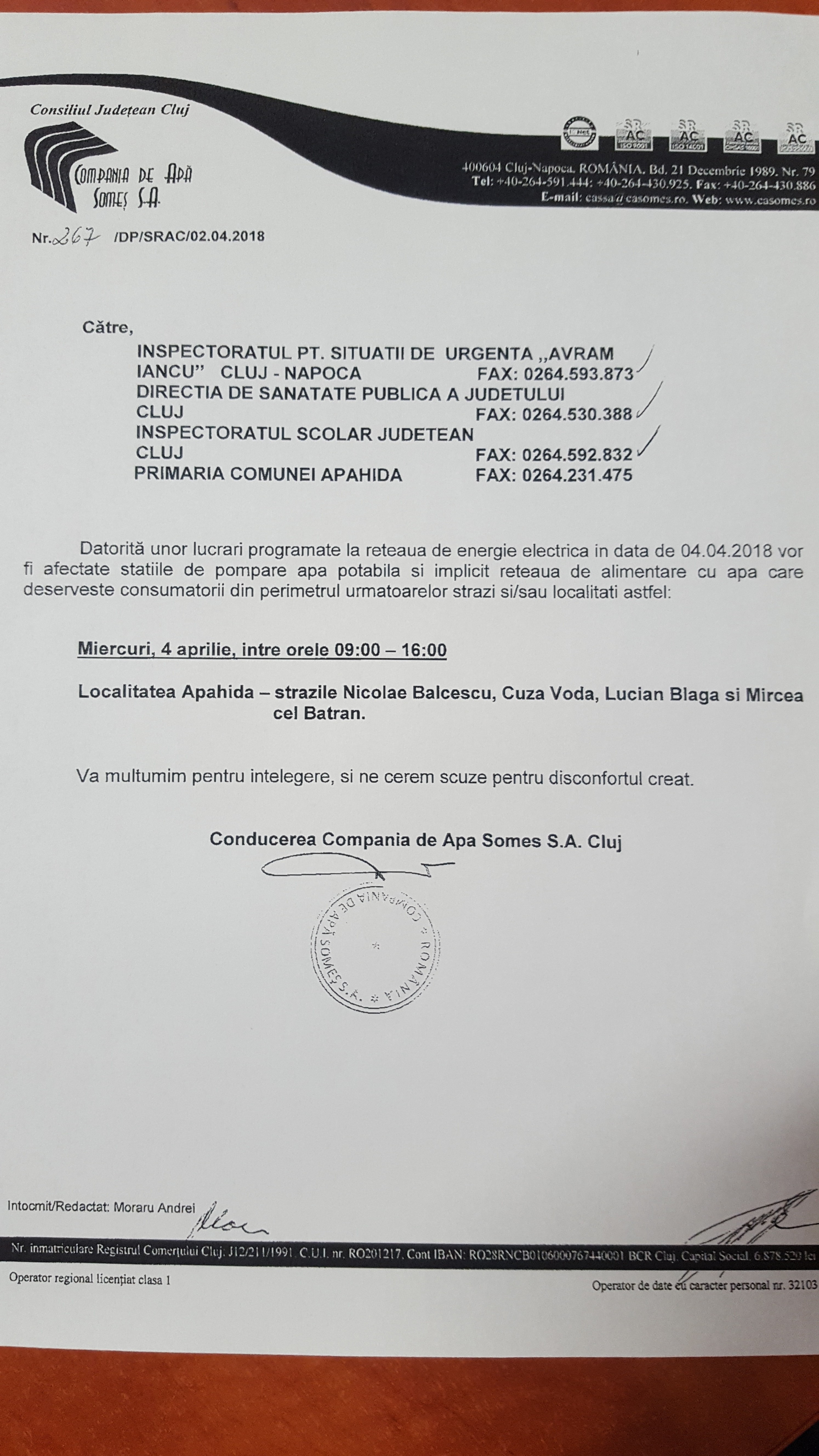 | 15.05.2025 | ANUNȚ IMPORTANT – SISTARE TEMPORARĂ A APEI POTABILE Stimați cetățeni, Vă informăm că, în perioada marți, 20 mai 2025 , ora 06:00 – vineri, 23 mai 2025, ora 20:00, furnizarea apei potabile va fi temporar întreruptă în comuna Apahida, ca urmare a unor lucrări de anvergură desfășurate de Compania de Apă Someș S.A.. Aceste lucrări fac parte dintr-un proiect regional major, care vizează modernizarea rețelelor de apă în zeci de comune din județul Cluj, inclusiv în municipiul Cluj-Napoca. Menționăm că proiectul este gestionat integral de Compania de Apă, care își asumă execuția lucrărilor, programul și eventualele întreruperi în furnizarea serviciului. În cazul în care apar modificări sau informații suplimentare din partea companiei, le vom comunica de îndată aici . Vă mulțumim pentru înțelegere și răbdare! Primăria Apahida |