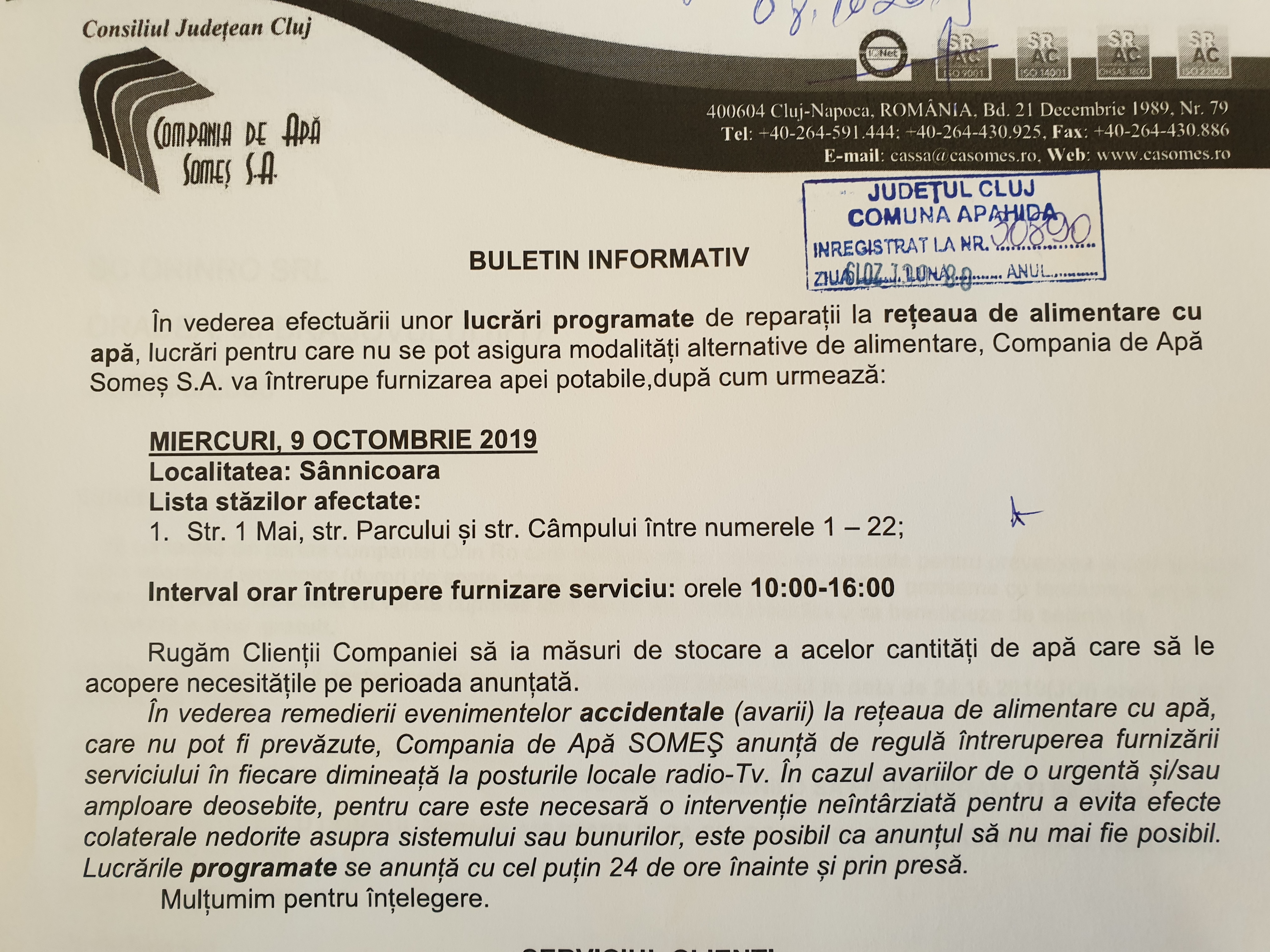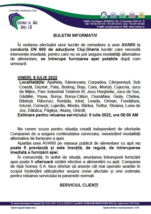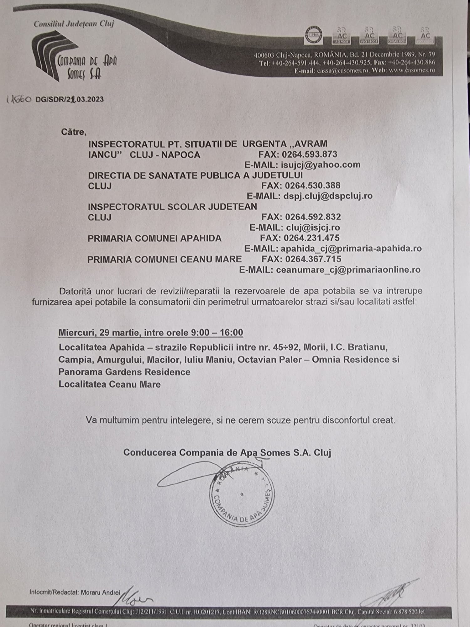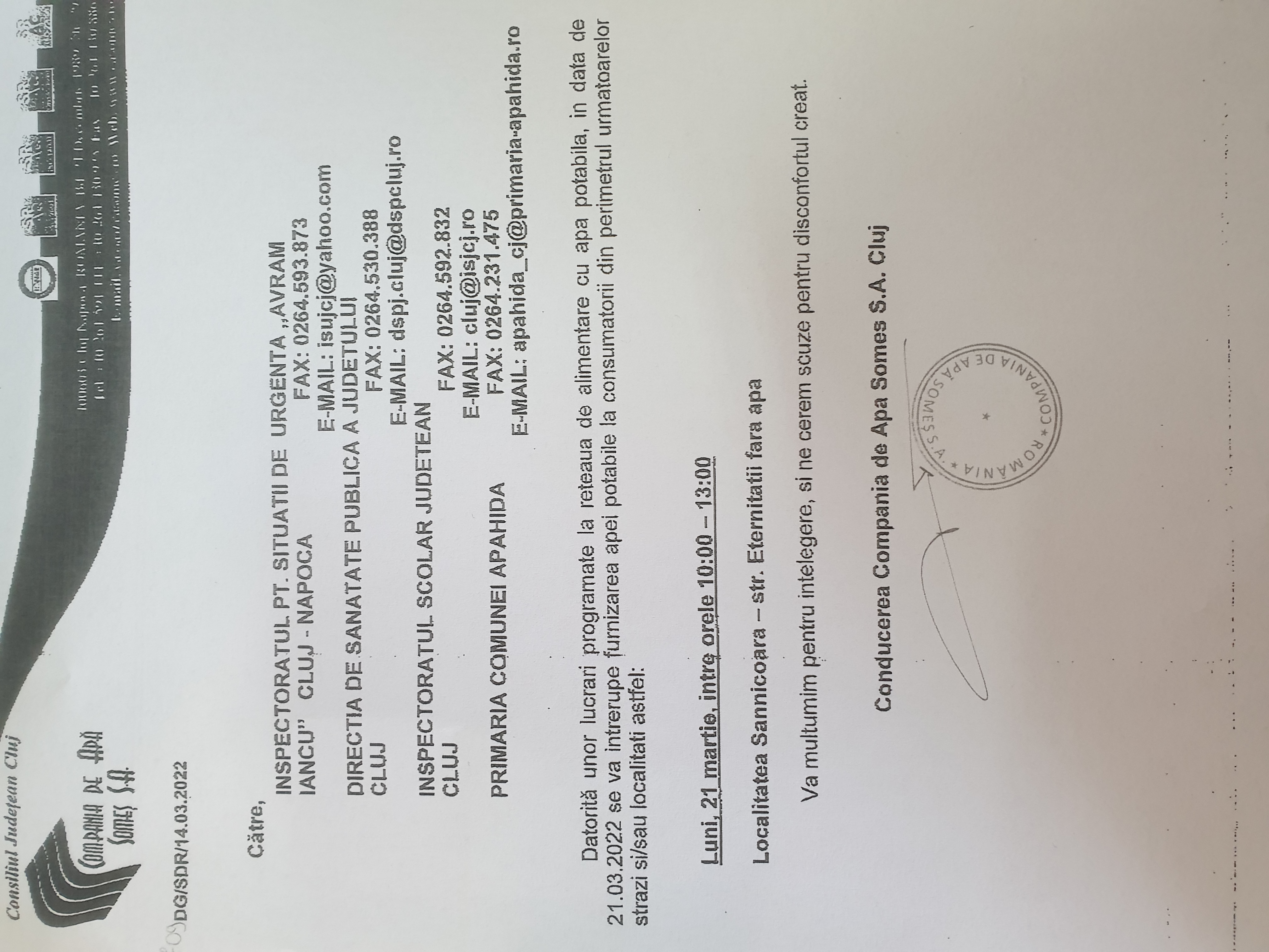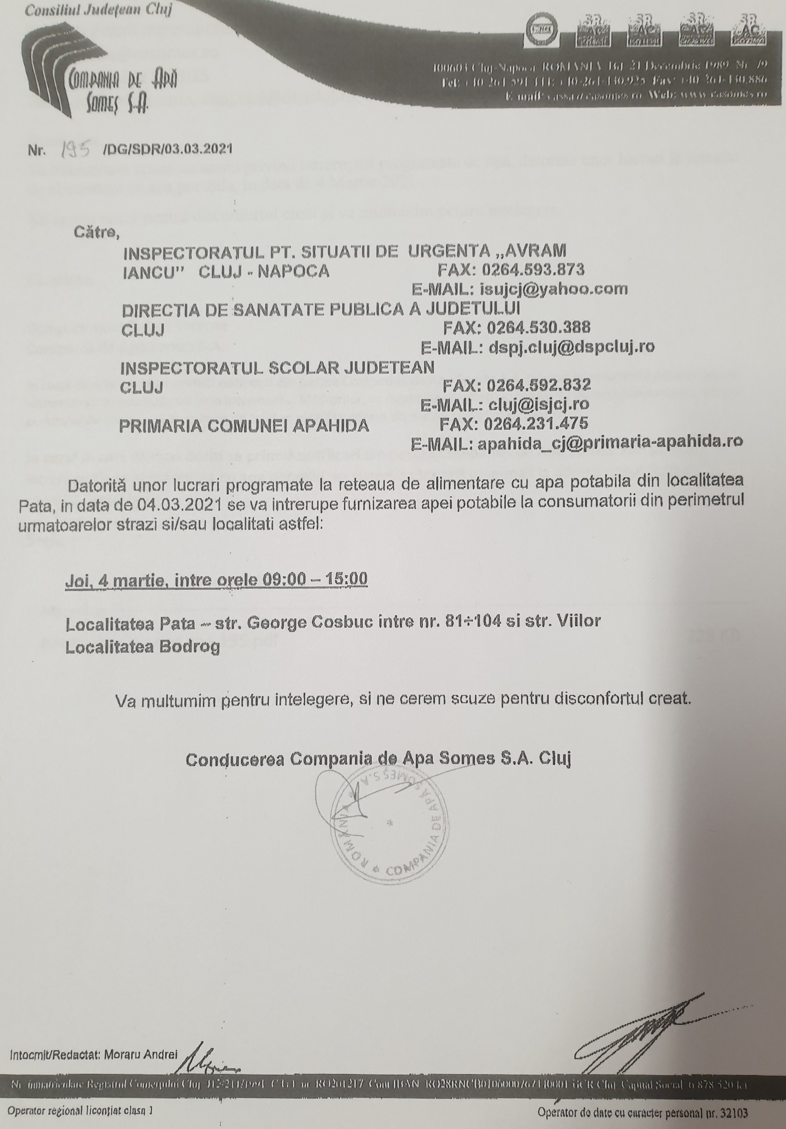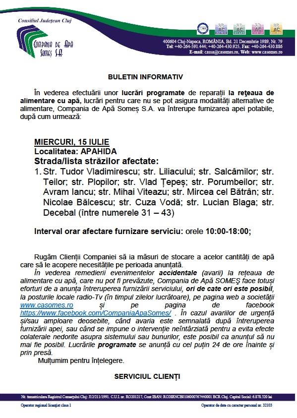 | 15.05.2025 | ANUNȚ IMPORTANT – SISTARE TEMPORARĂ A APEI POTABILE Stimați cetățeni, Vă informăm că, în perioada marți, 20 mai 2025 , ora 06:00 – vineri, 23 mai 2025, ora 20:00, furnizarea apei potabile va fi temporar întreruptă în comuna Apahida, ca urmare a unor lucrări de anvergură desfășurate de Compania de Apă Someș S.A.. Aceste lucrări fac parte dintr-un proiect regional major, care vizează modernizarea rețelelor de apă în zeci de comune din județul Cluj, inclusiv în municipiul Cluj-Napoca. Menționăm că proiectul este gestionat integral de Compania de Apă, care își asumă execuția lucrărilor, programul și eventualele întreruperi în furnizarea serviciului. În cazul în care apar modificări sau informații suplimentare din partea companiei, le vom comunica de îndată aici . Vă mulțumim pentru înțelegere și răbdare! Primăria Apahida |