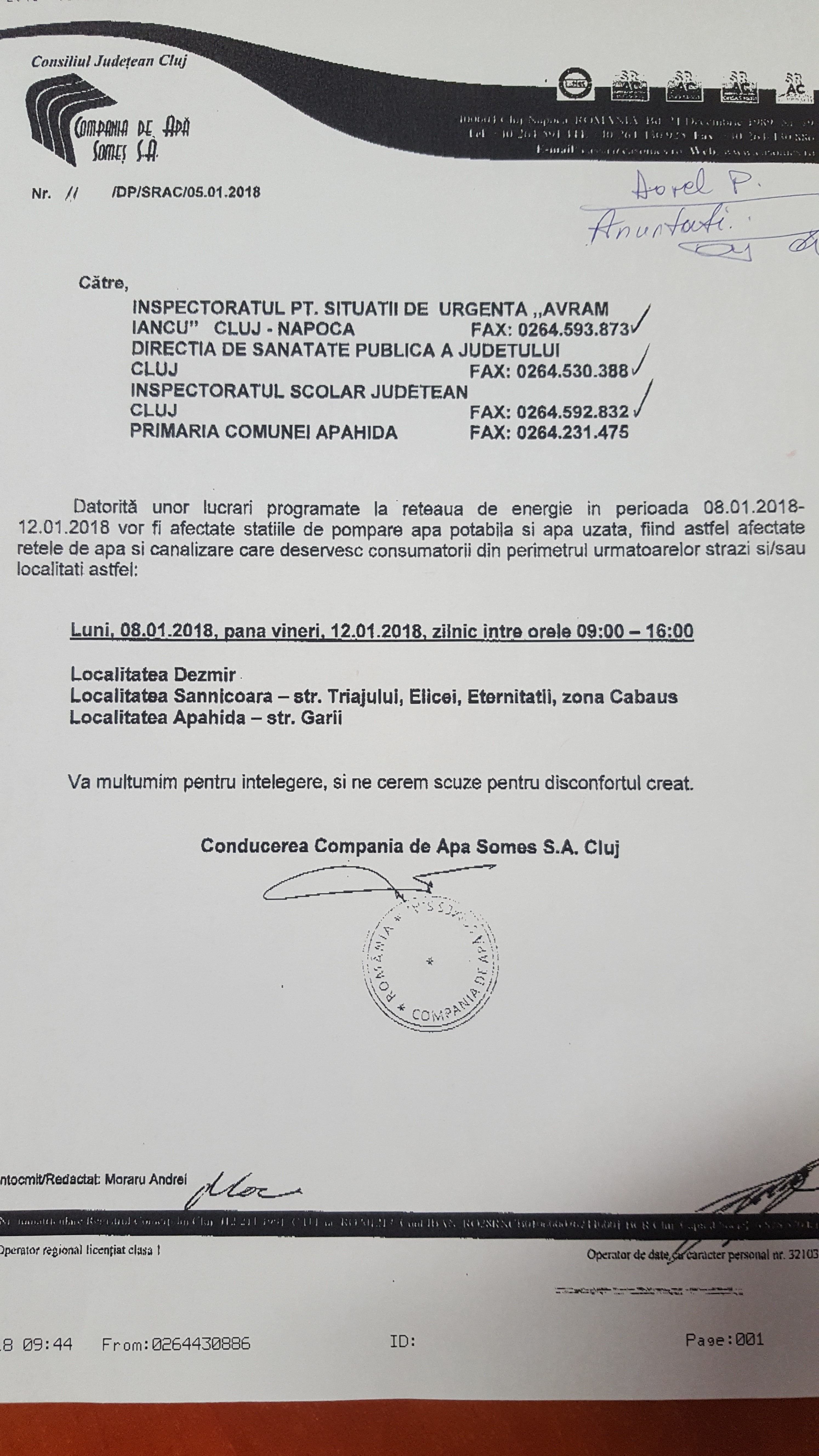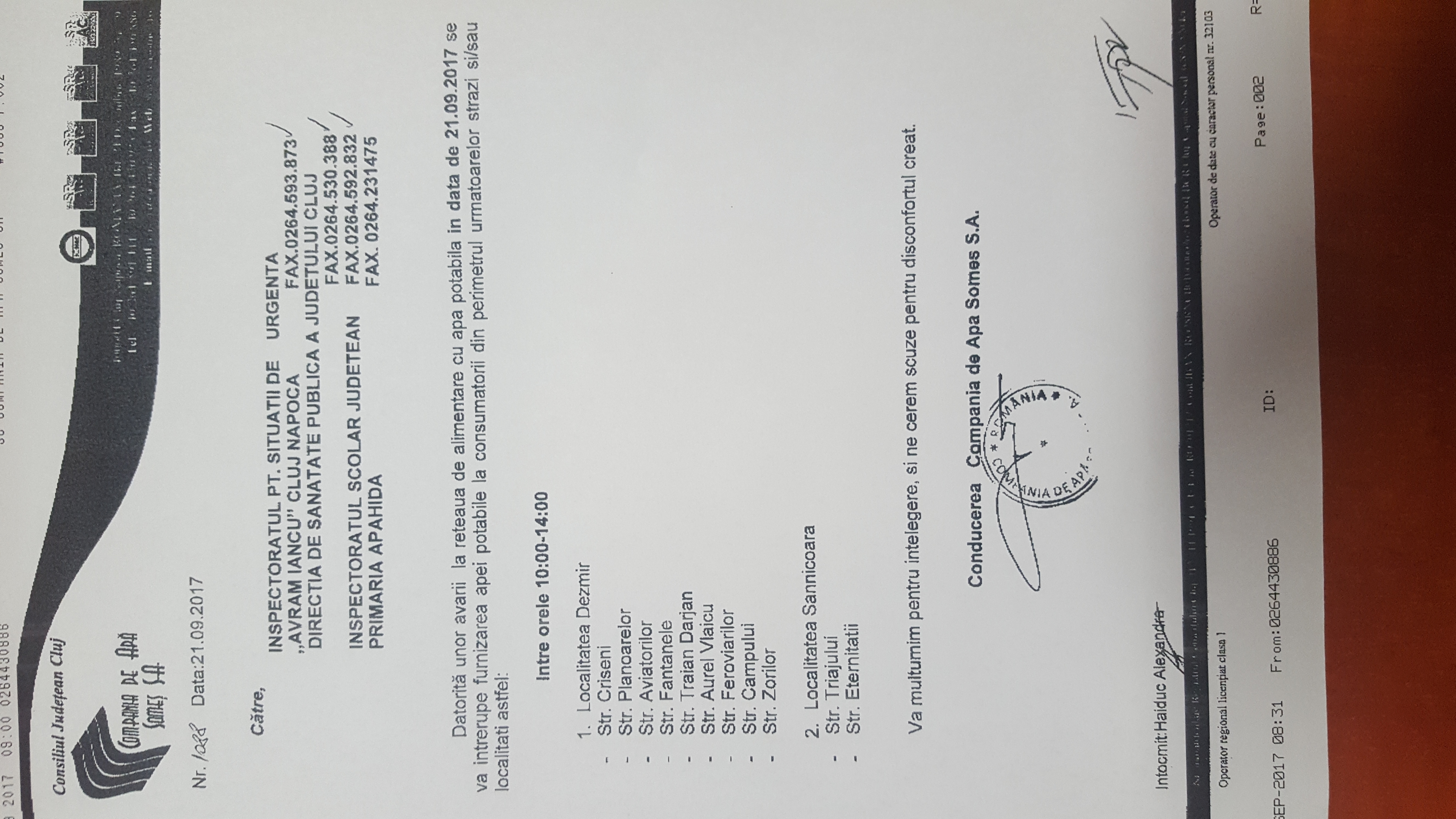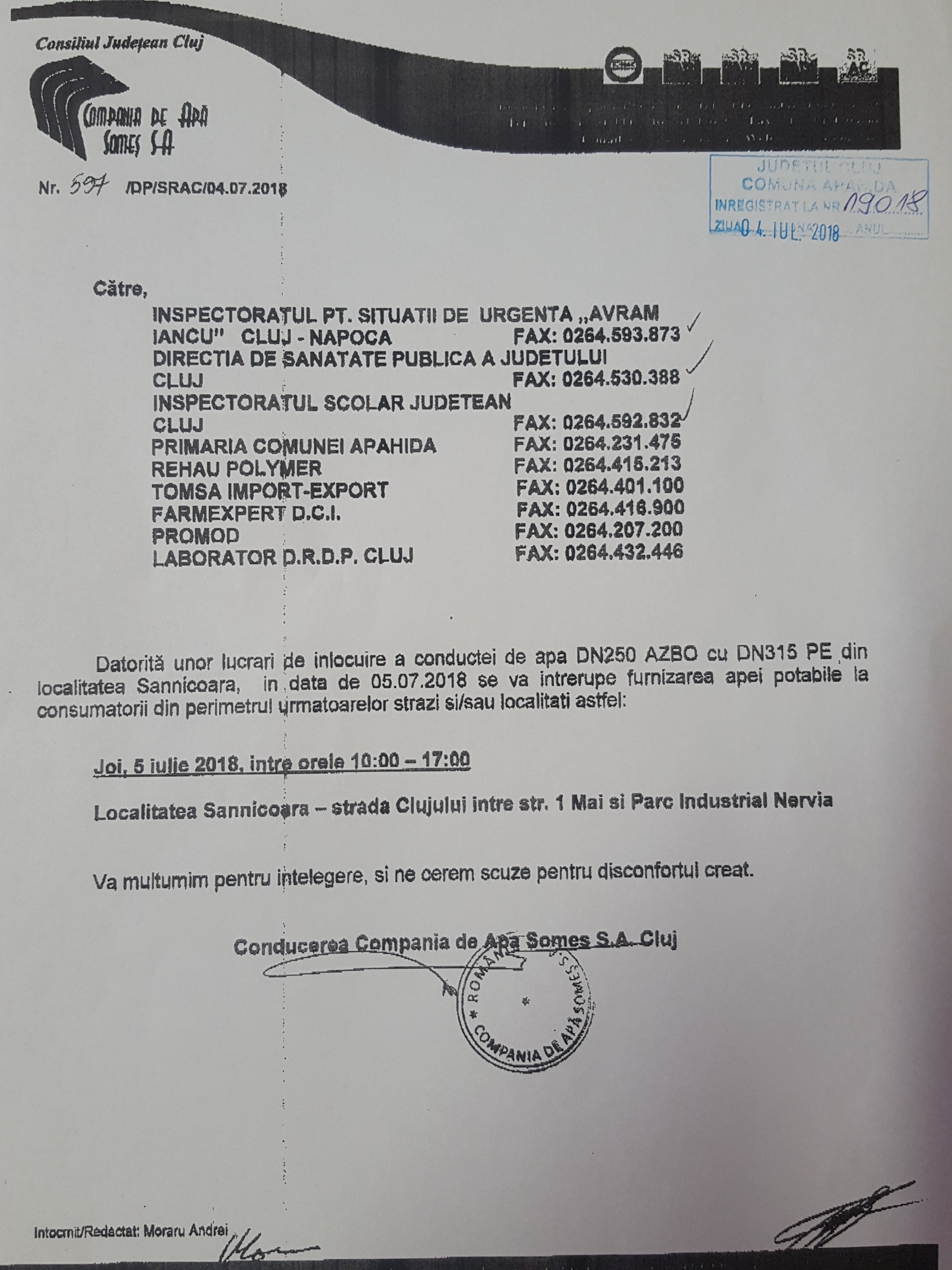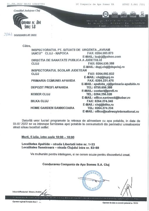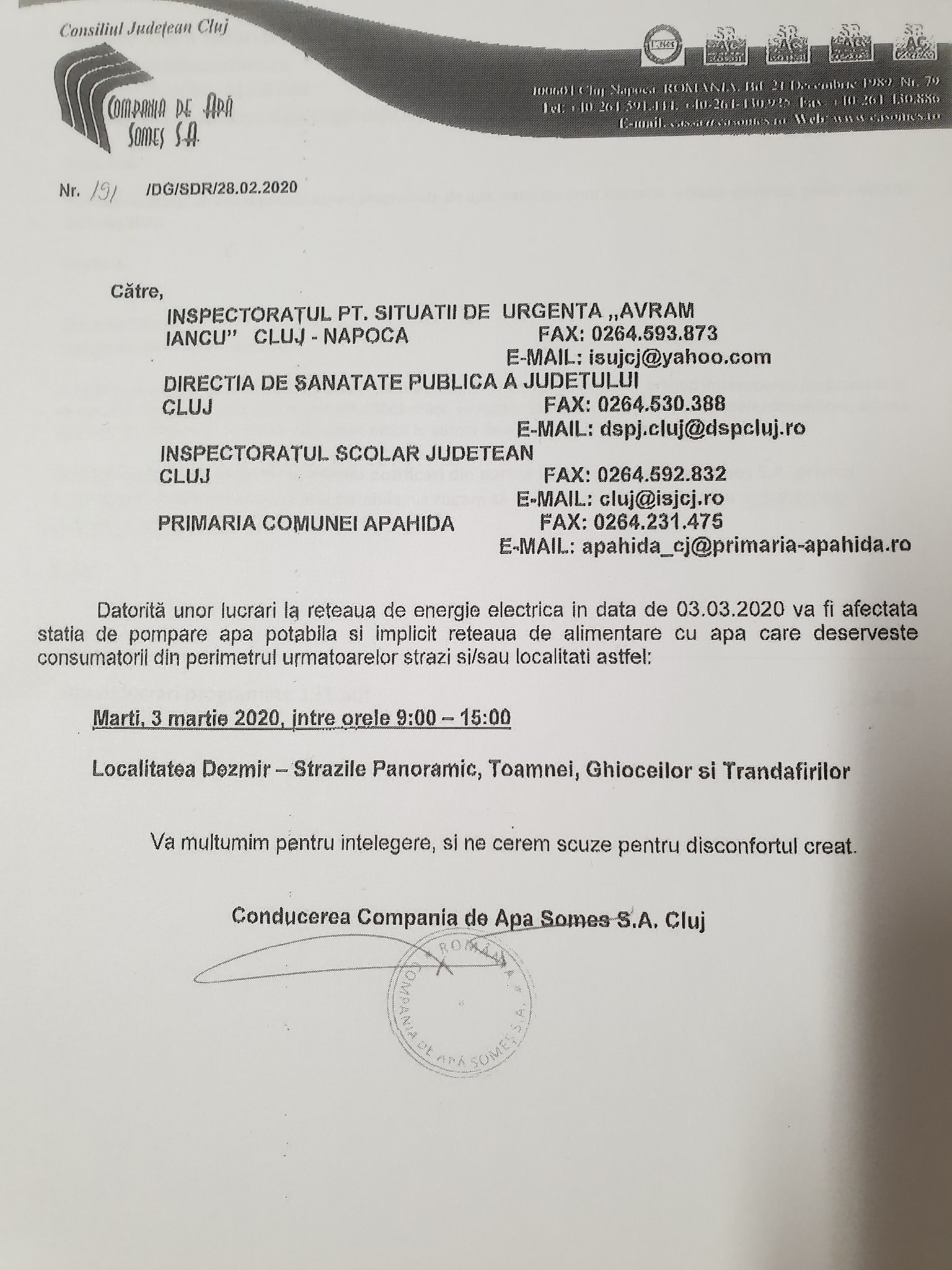 | 15.05.2025 | ANUNȚ IMPORTANT – SISTARE TEMPORARĂ A APEI POTABILE Stimați cetățeni, Vă informăm că, în perioada marți, 20 mai 2025 , ora 06:00 – vineri, 23 mai 2025, ora 20:00, furnizarea apei potabile va fi temporar întreruptă în comuna Apahida, ca urmare a unor lucrări de anvergură desfășurate de Compania de Apă Someș S.A.. Aceste lucrări fac parte dintr-un proiect regional major, care vizează modernizarea rețelelor de apă în zeci de comune din județul Cluj, inclusiv în municipiul Cluj-Napoca. Menționăm că proiectul este gestionat integral de Compania de Apă, care își asumă execuția lucrărilor, programul și eventualele întreruperi în furnizarea serviciului. În cazul în care apar modificări sau informații suplimentare din partea companiei, le vom comunica de îndată aici . Vă mulțumim pentru înțelegere și răbdare! Primăria Apahida |
