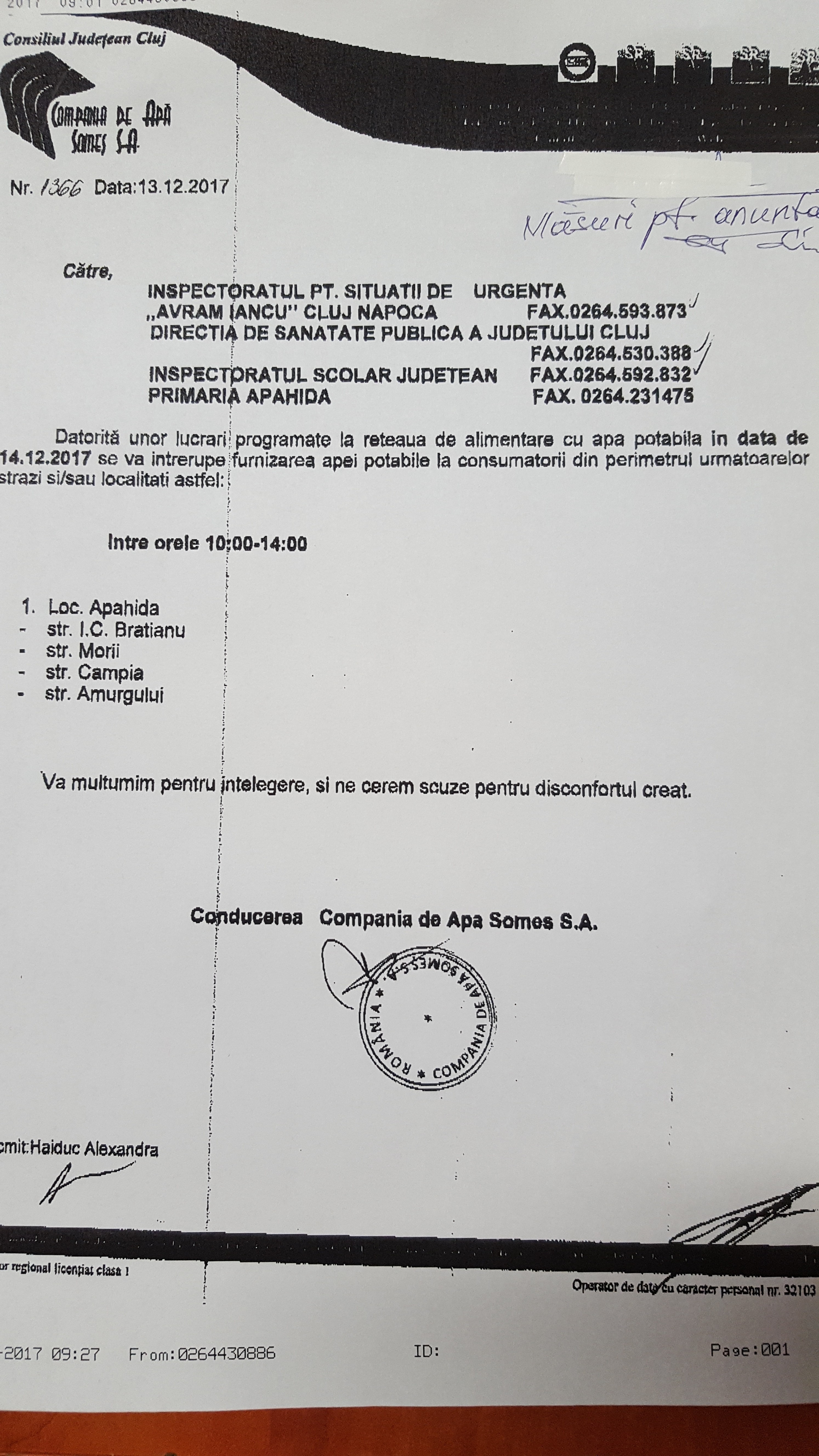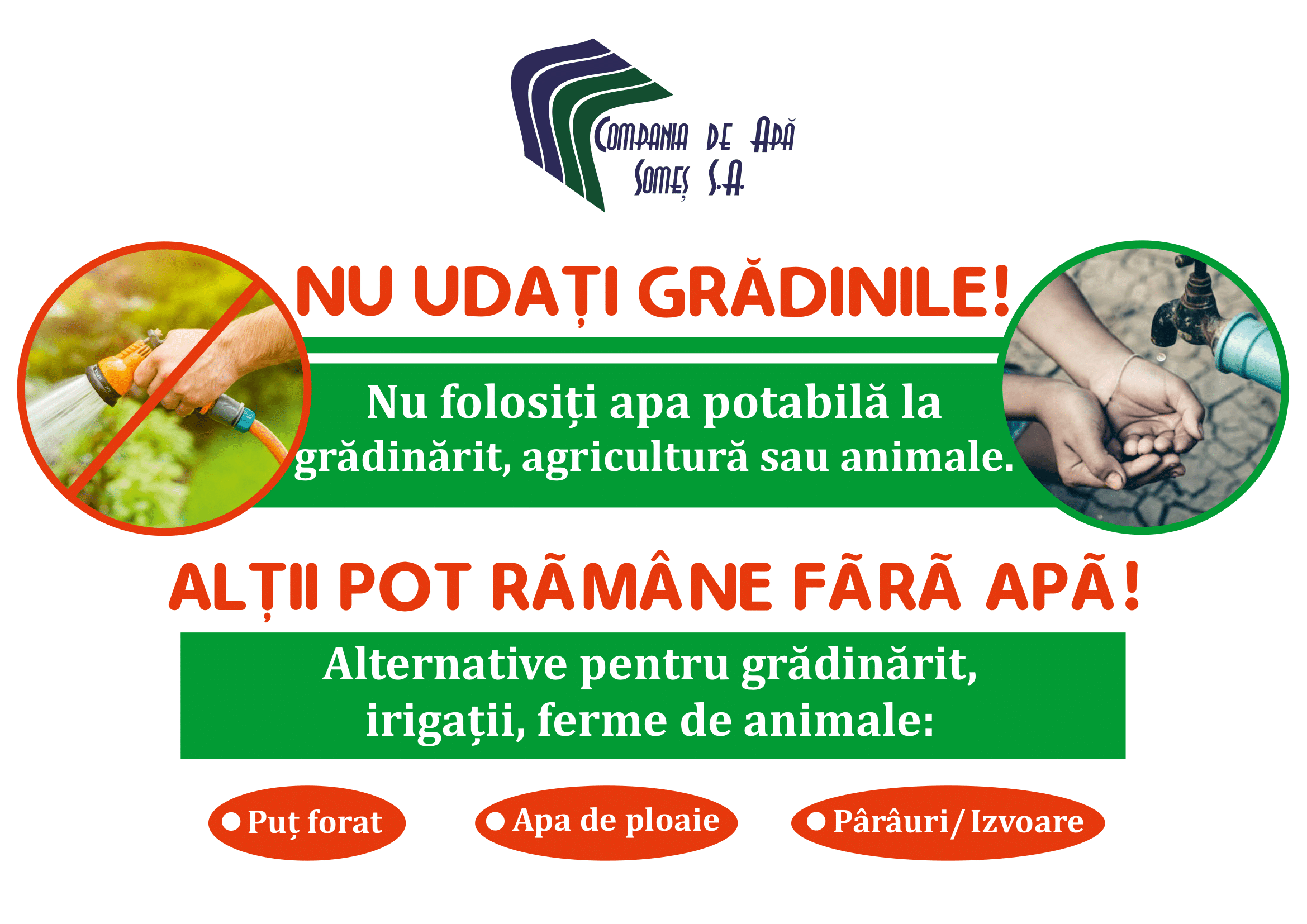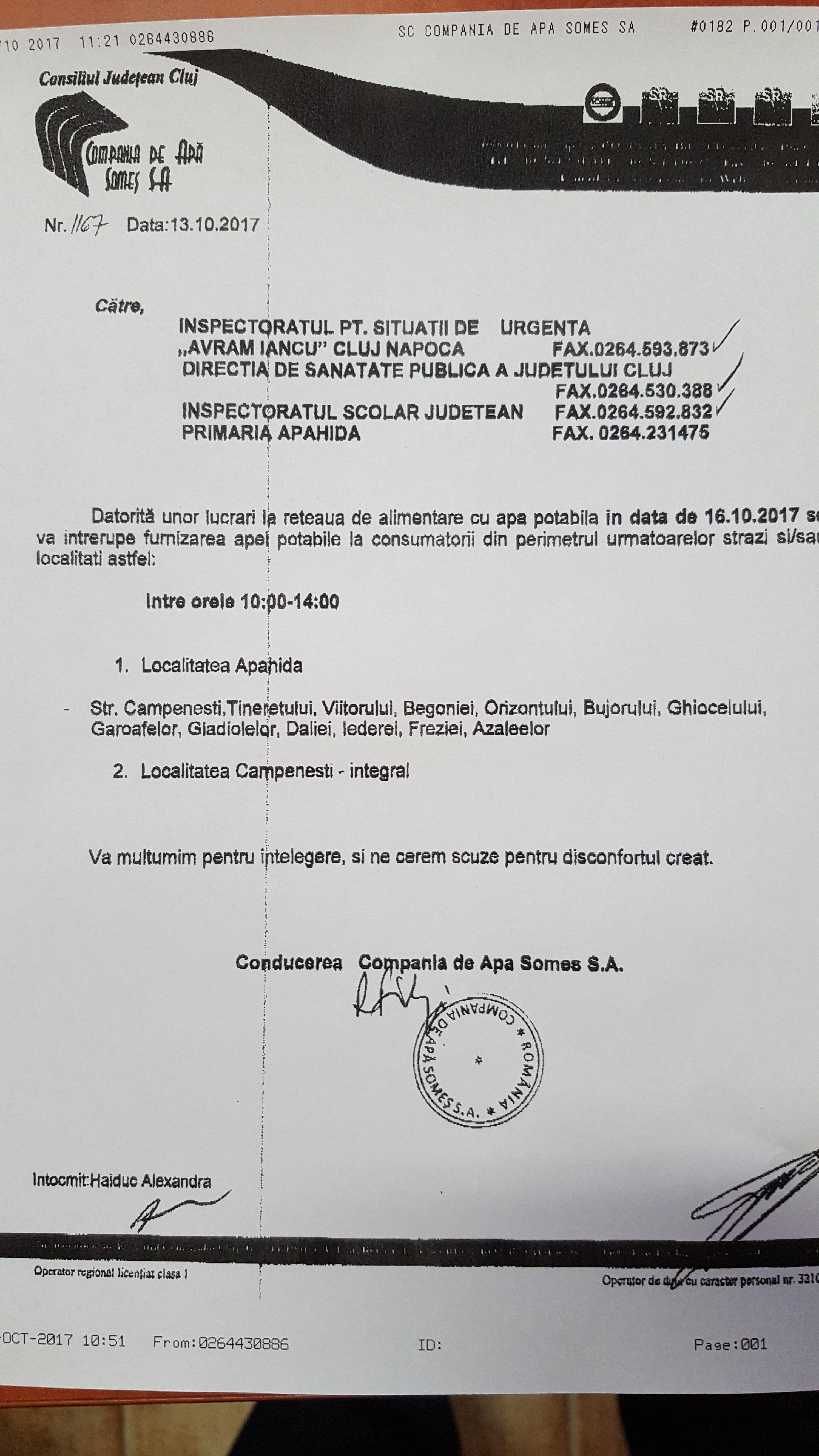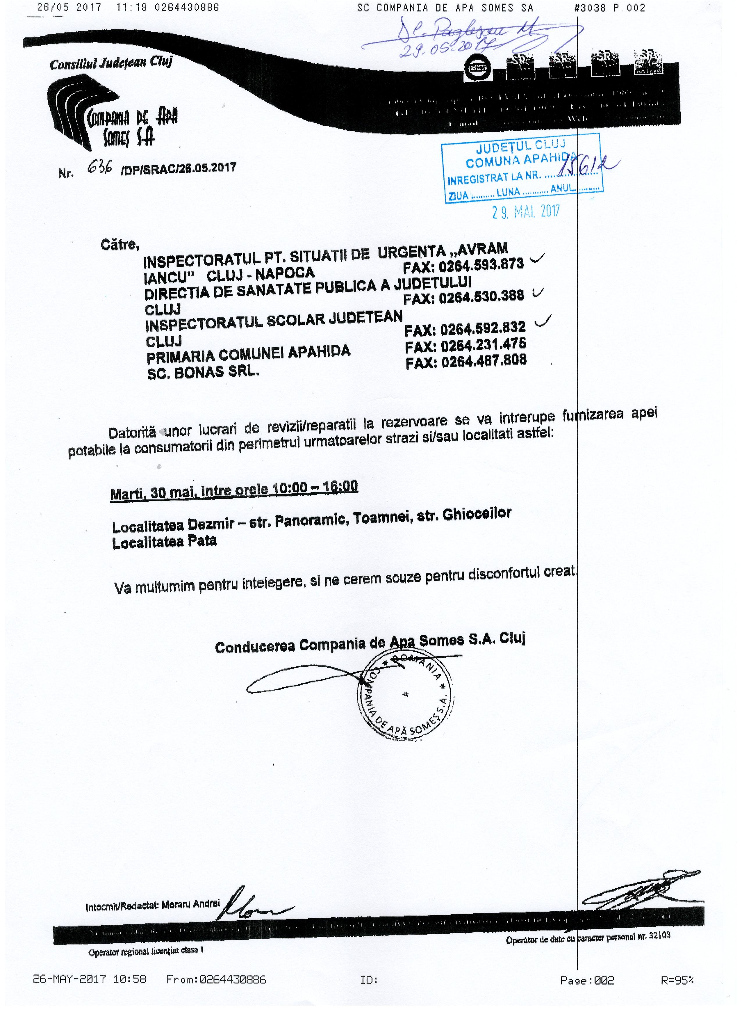 | 15.05.2025 | ANUNȚ IMPORTANT – SISTARE TEMPORARĂ A APEI POTABILE Stimați cetățeni, Vă informăm că, în perioada marți, 20 mai 2025 , ora 06:00 – vineri, 23 mai 2025, ora 20:00, furnizarea apei potabile va fi temporar întreruptă în comuna Apahida, ca urmare a unor lucrări de anvergură desfășurate de Compania de Apă Someș S.A.. Aceste lucrări fac parte dintr-un proiect regional major, care vizează modernizarea rețelelor de apă în zeci de comune din județul Cluj, inclusiv în municipiul Cluj-Napoca. Menționăm că proiectul este gestionat integral de Compania de Apă, care își asumă execuția lucrărilor, programul și eventualele întreruperi în furnizarea serviciului. În cazul în care apar modificări sau informații suplimentare din partea companiei, le vom comunica de îndată aici . Vă mulțumim pentru înțelegere și răbdare! Primăria Apahida |
