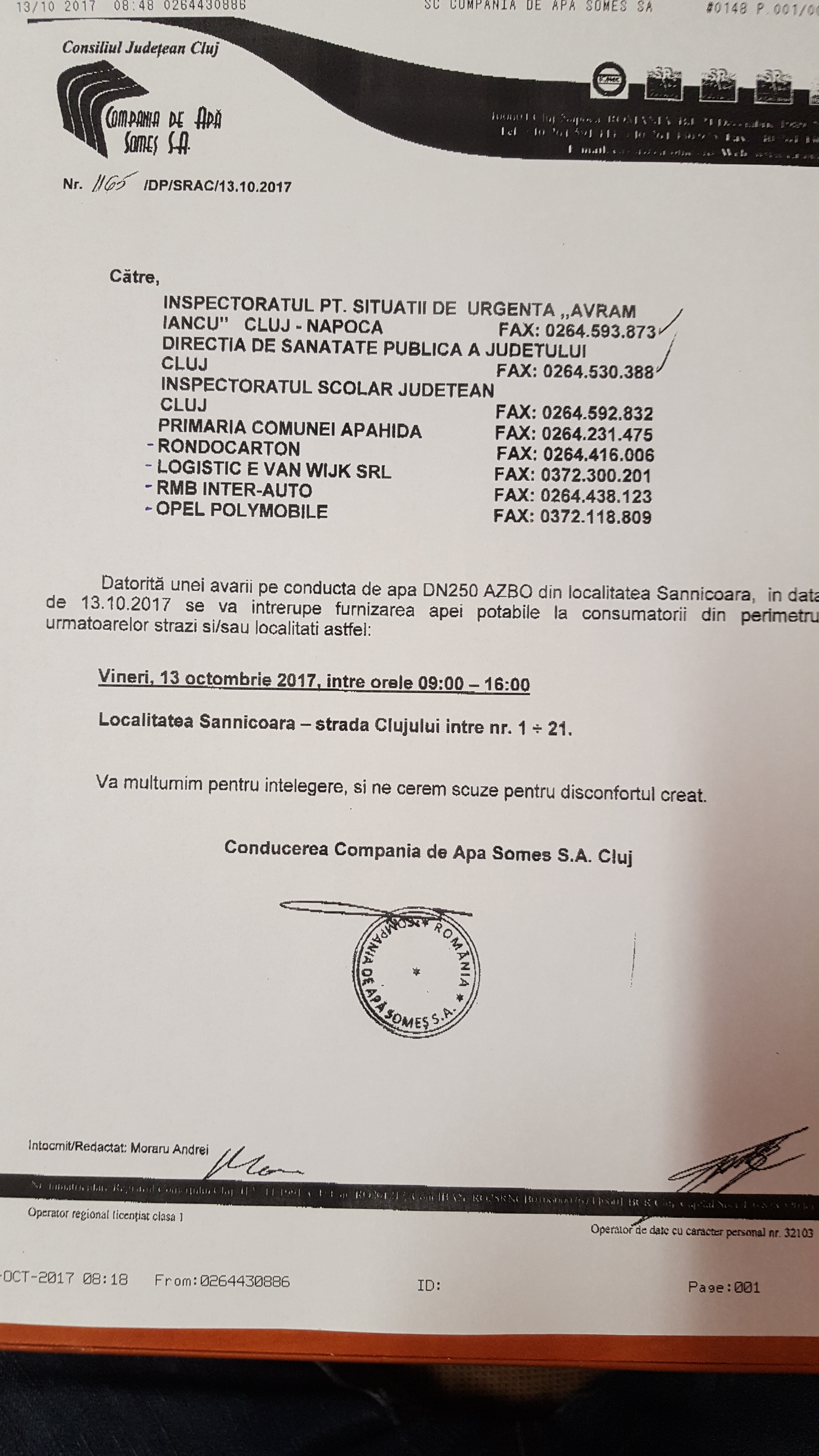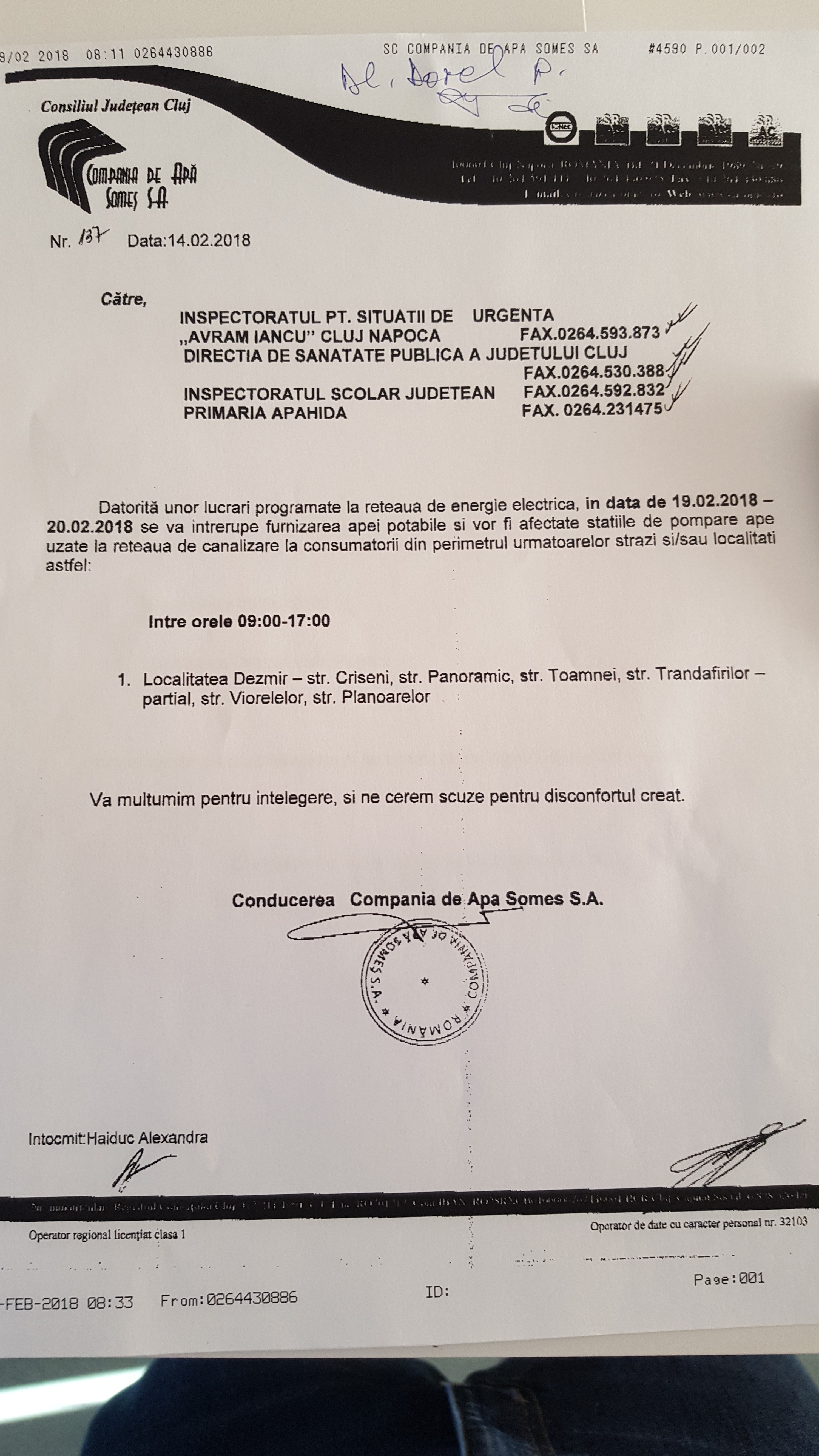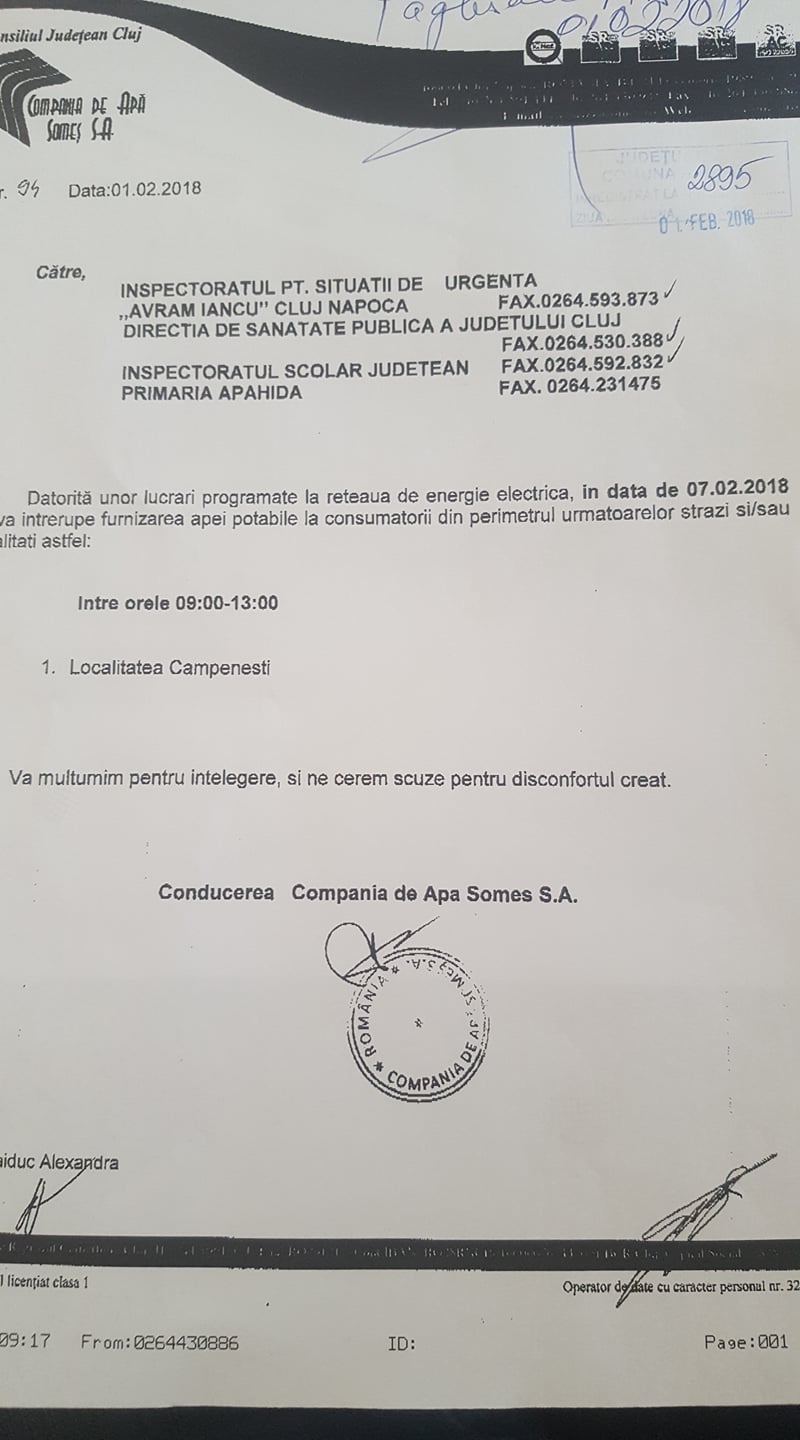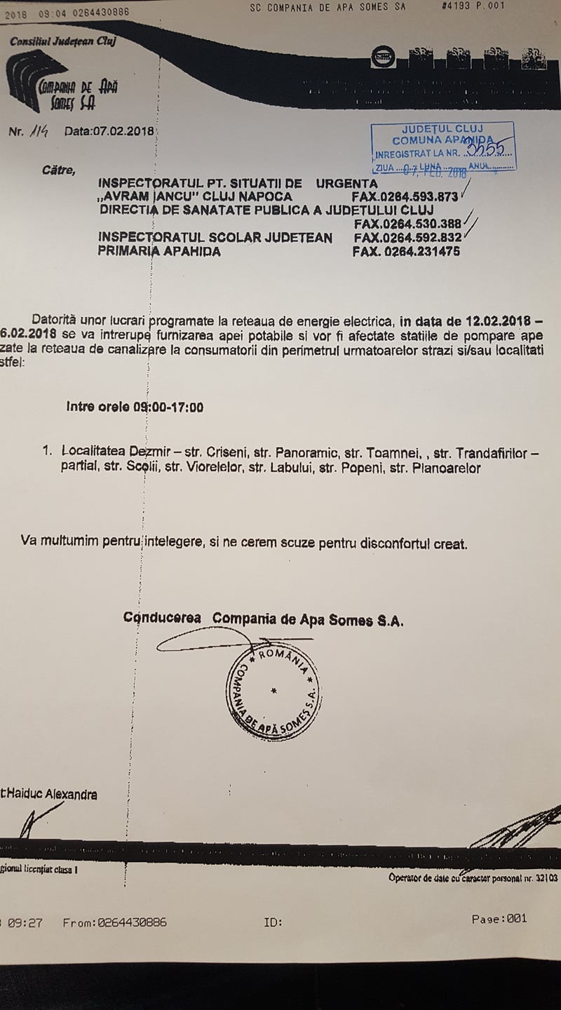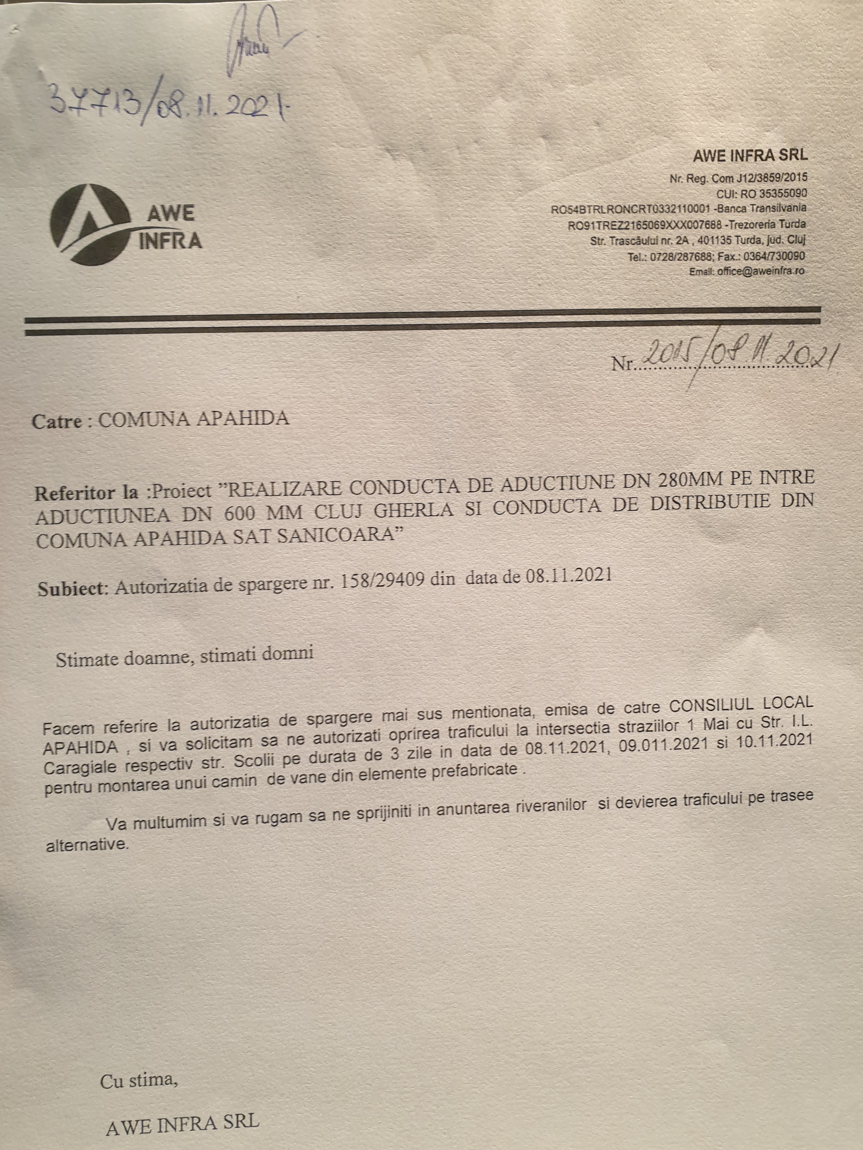 | 15.05.2025 | ANUNȚ IMPORTANT – SISTARE TEMPORARĂ A APEI POTABILE Stimați cetățeni, Vă informăm că, în perioada marți, 20 mai 2025 , ora 06:00 – vineri, 23 mai 2025, ora 20:00, furnizarea apei potabile va fi temporar întreruptă în comuna Apahida, ca urmare a unor lucrări de anvergură desfășurate de Compania de Apă Someș S.A.. Aceste lucrări fac parte dintr-un proiect regional major, care vizează modernizarea rețelelor de apă în zeci de comune din județul Cluj, inclusiv în municipiul Cluj-Napoca. Menționăm că proiectul este gestionat integral de Compania de Apă, care își asumă execuția lucrărilor, programul și eventualele întreruperi în furnizarea serviciului. În cazul în care apar modificări sau informații suplimentare din partea companiei, le vom comunica de îndată aici . Vă mulțumim pentru înțelegere și răbdare! Primăria Apahida |