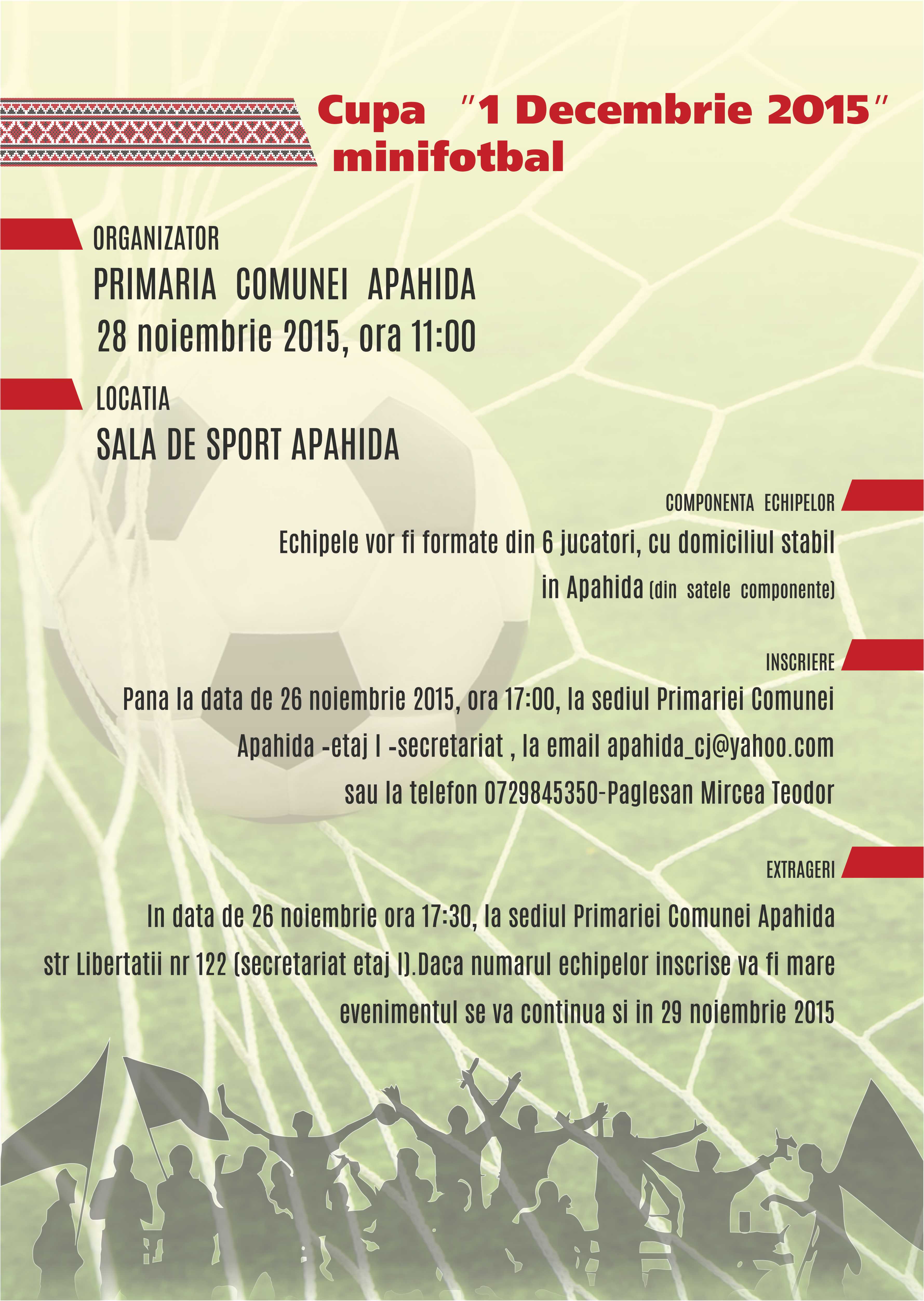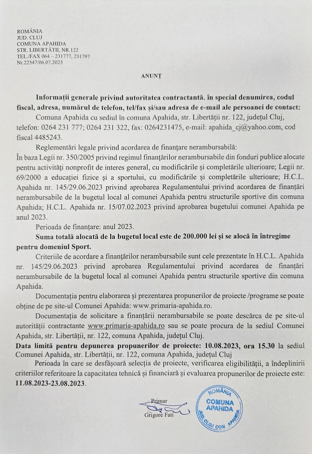 | 12.06.2025 | Anunt privind acordarea de finantari nerambursabile de la bugetul local pentru structurile sportive din comuna Apahida -vezi anunț |