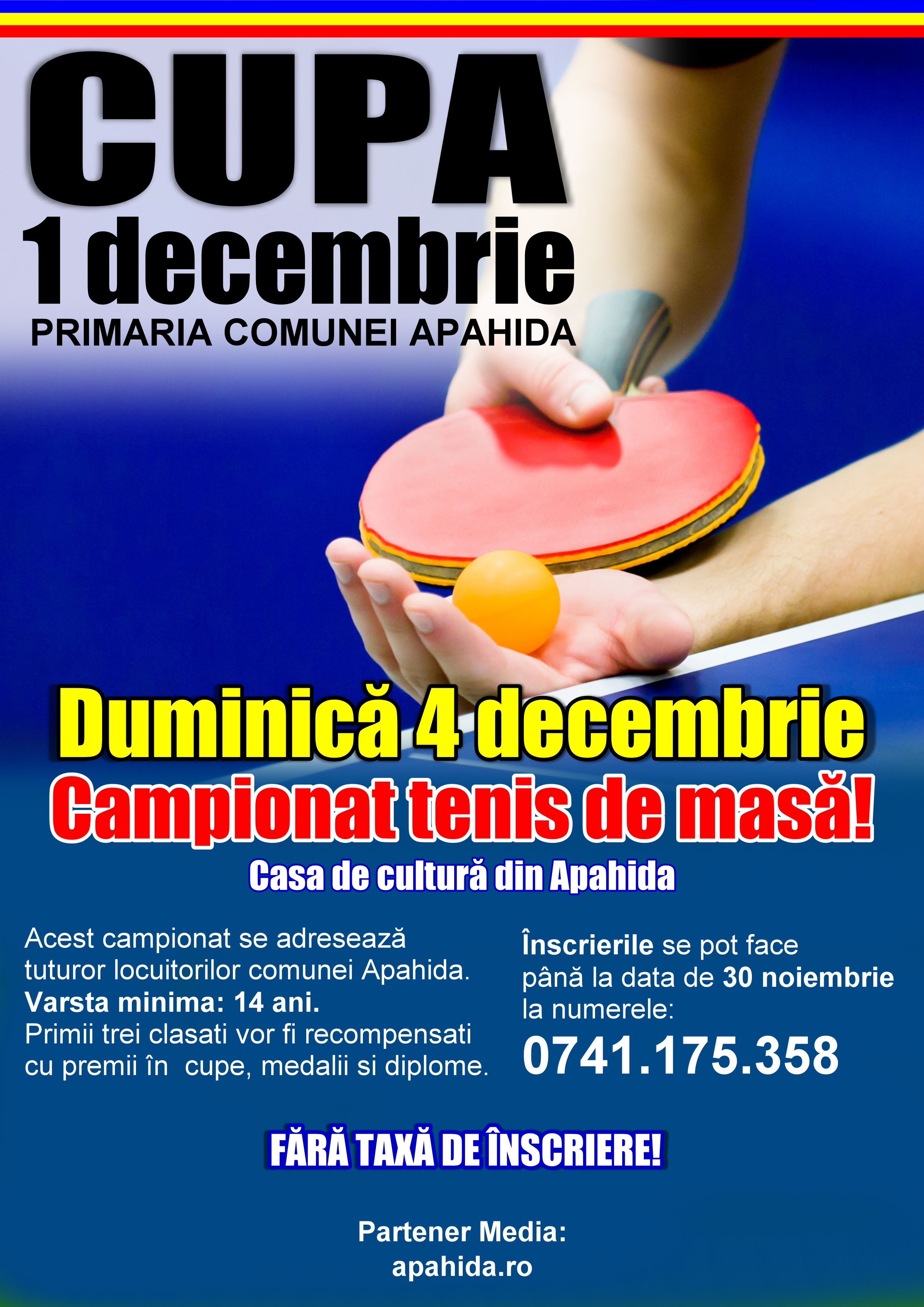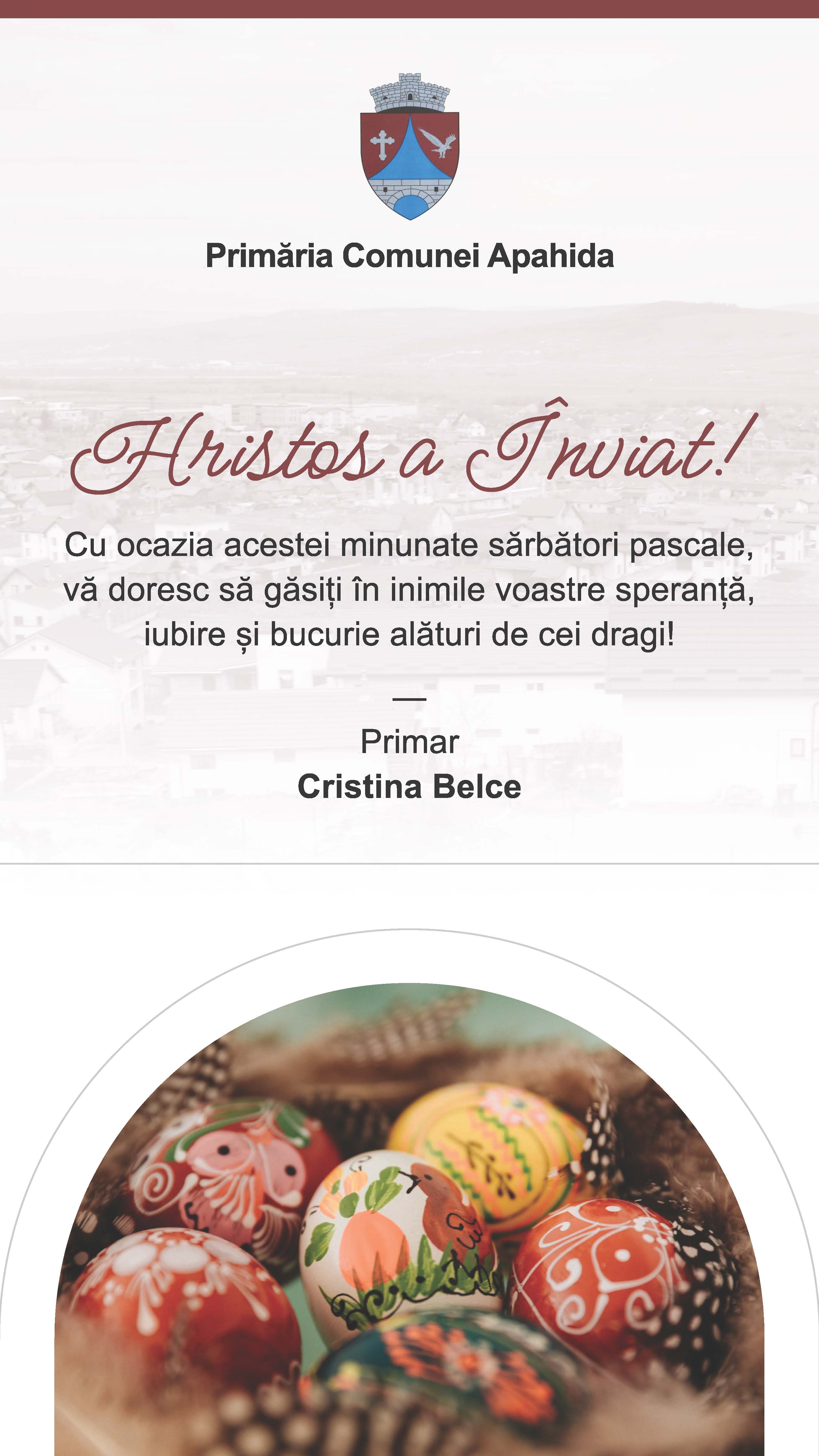 | 24.06.2016 | IMPORTANTIn data de 24.06.2016, ora 10:00 in Sala mare a Casei de Cultura a comunei Apahida, va avea loc sedinta de constituire a Consiliului Local al comunei Apahida, depunerea juramantului de catre primarul comunei Apahida de catre dl. Fati Grigore si depunerea juramantului de catre viceprimarul comunei Apahida.