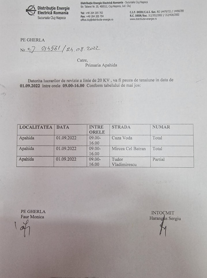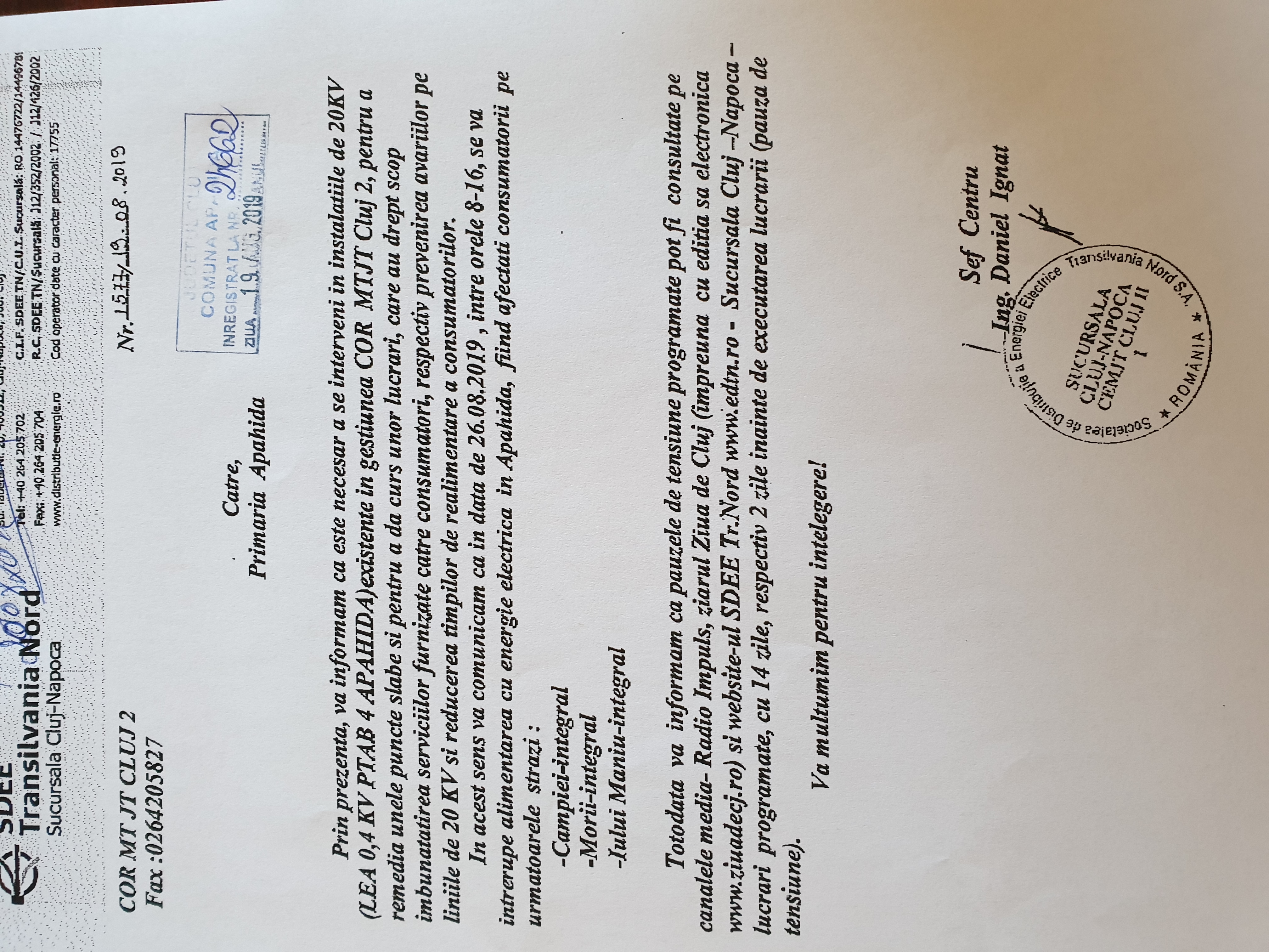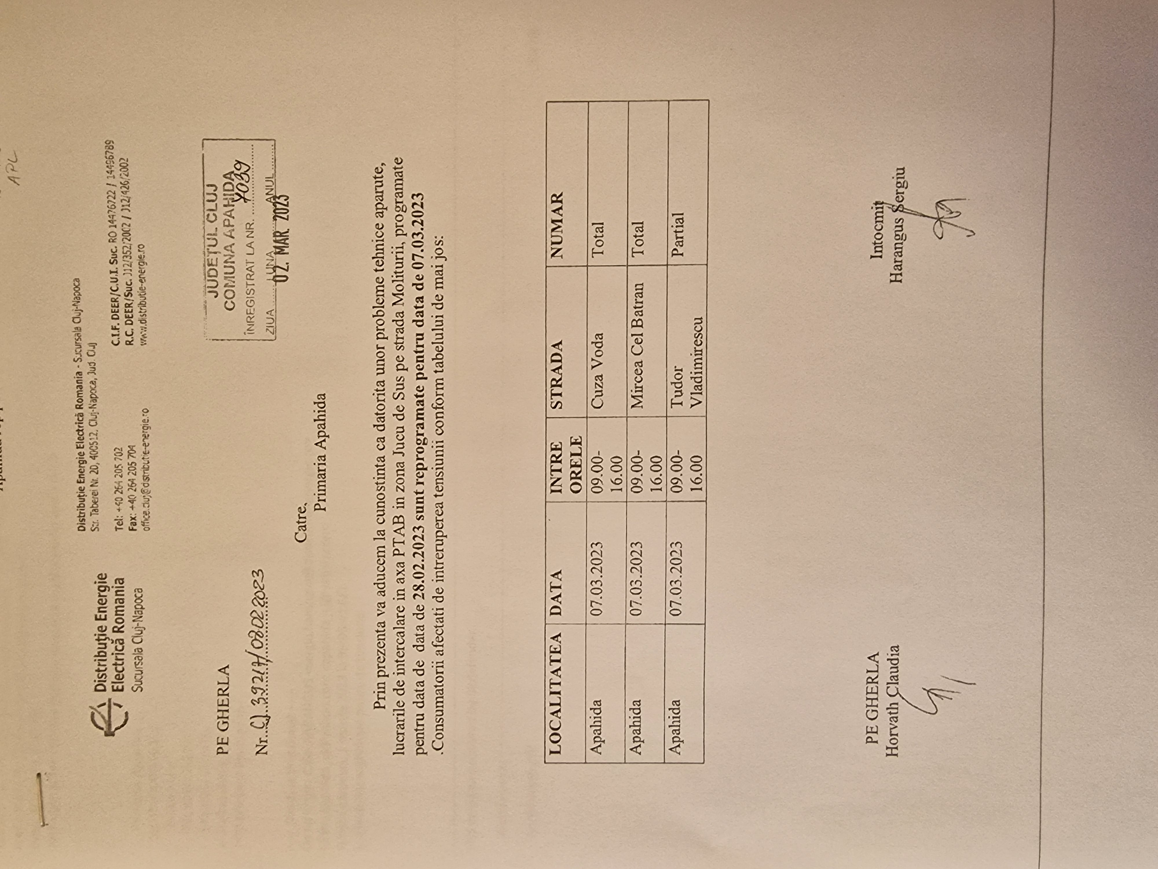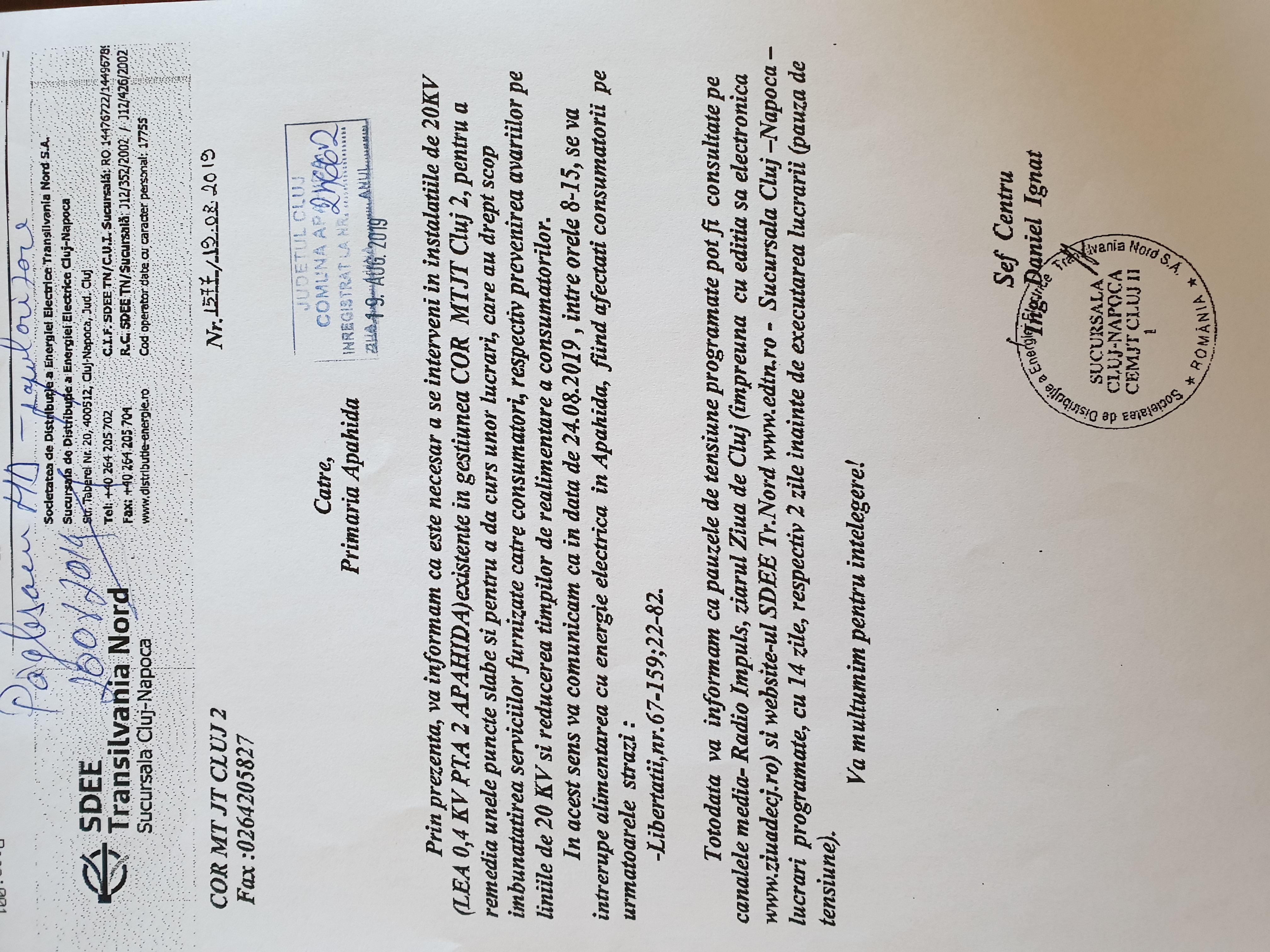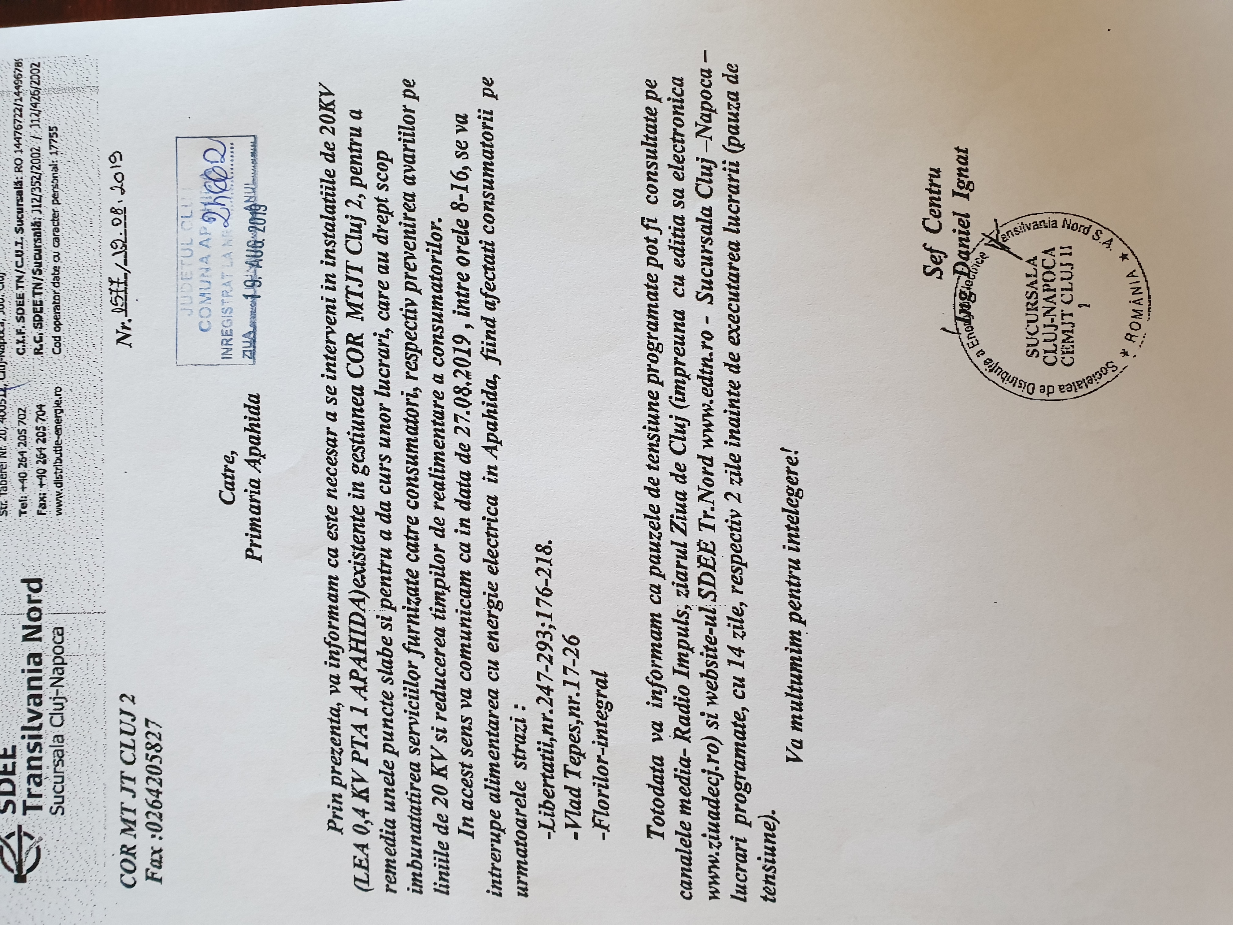 - strada Horea , strada Decebal intre numerele 29-33, inclusiv Primaria Comunei Apahida . Lucrare de montare circuite electrice cu conductoare torsadate pe stalpii LEA 0,4 kv. In data de 8 iulie 2016 intre orele 9:00-15:00 se intrerupe alimentarea cu energie electrica in urmatorul mod: