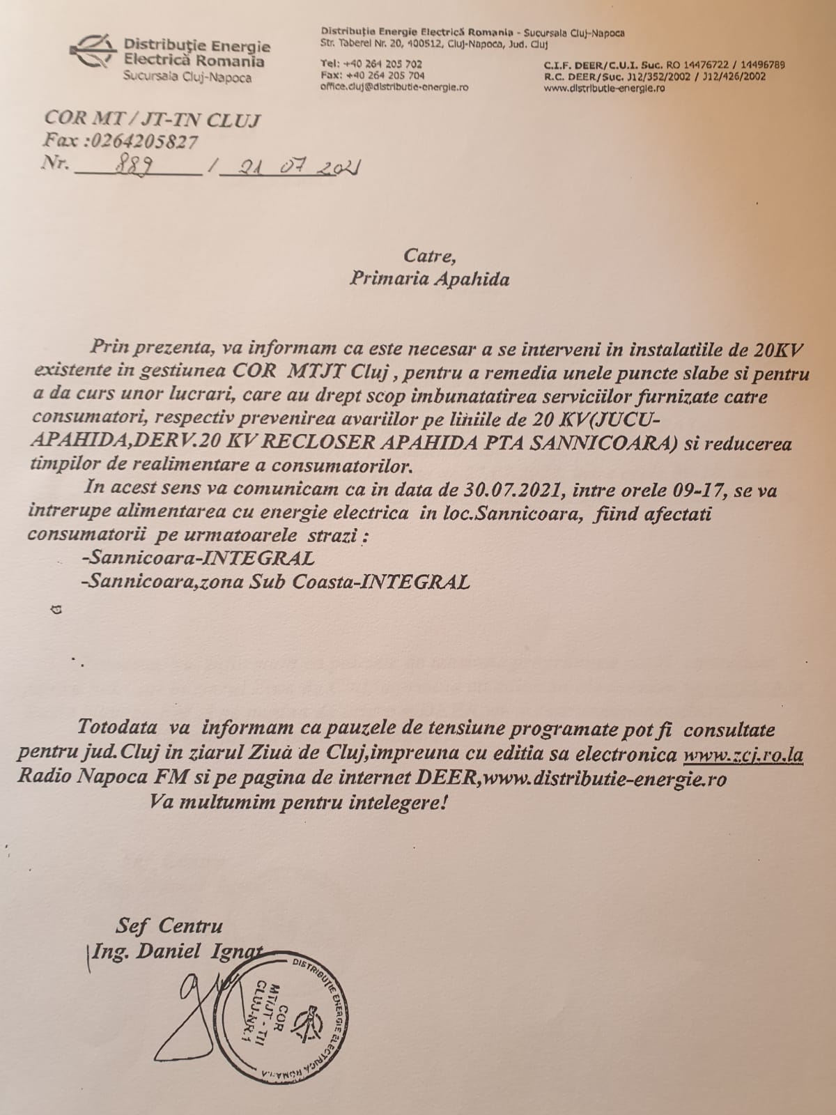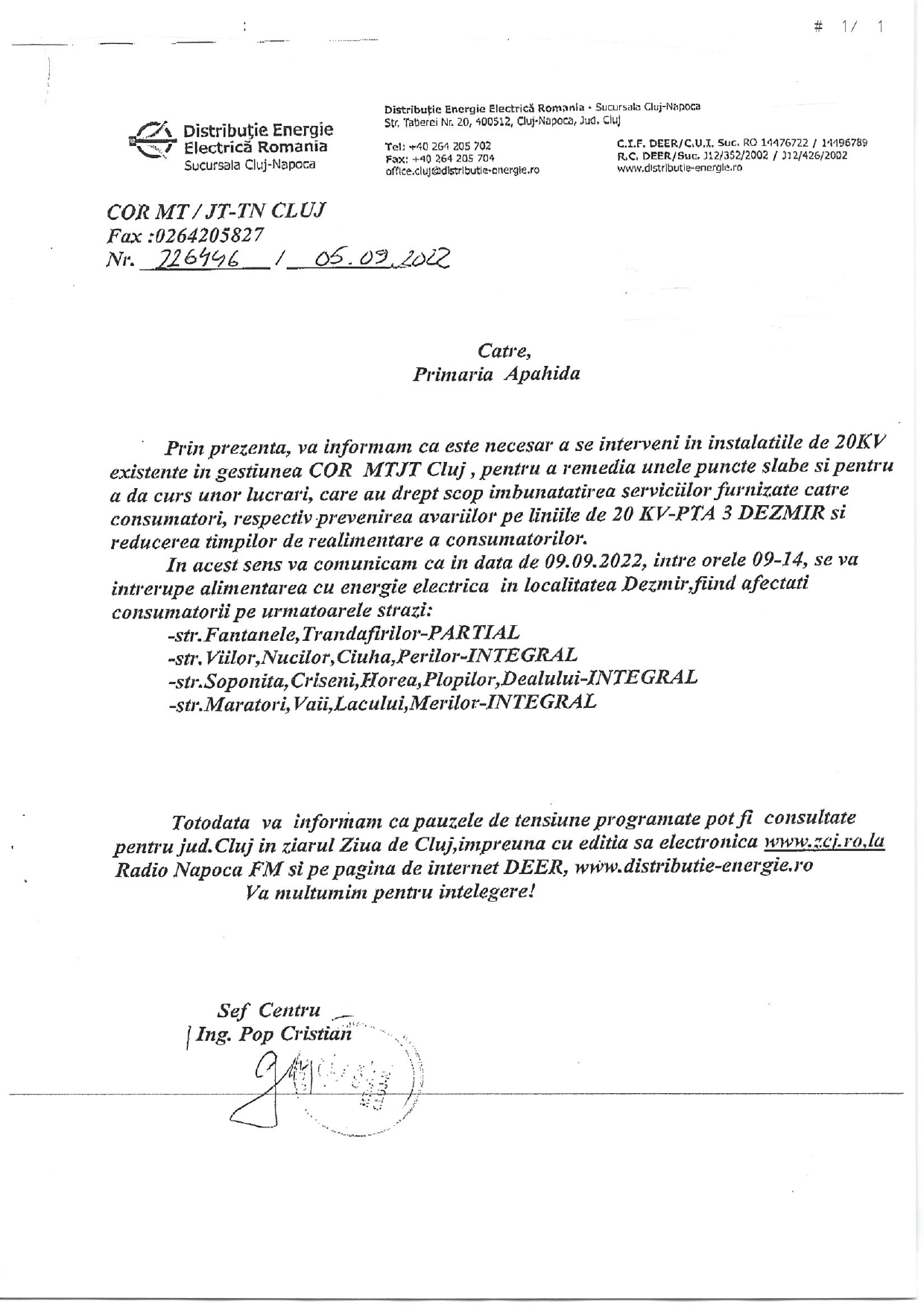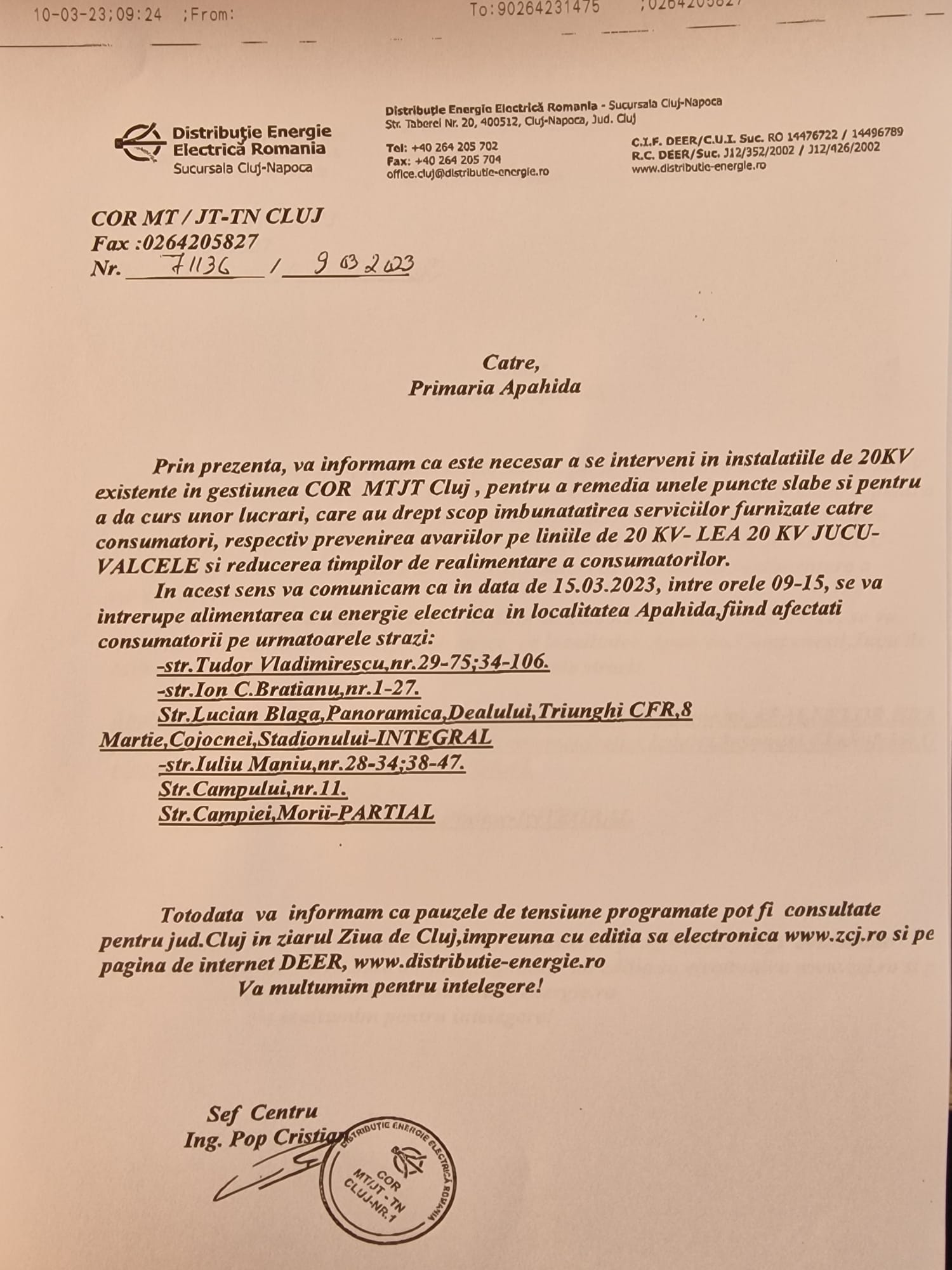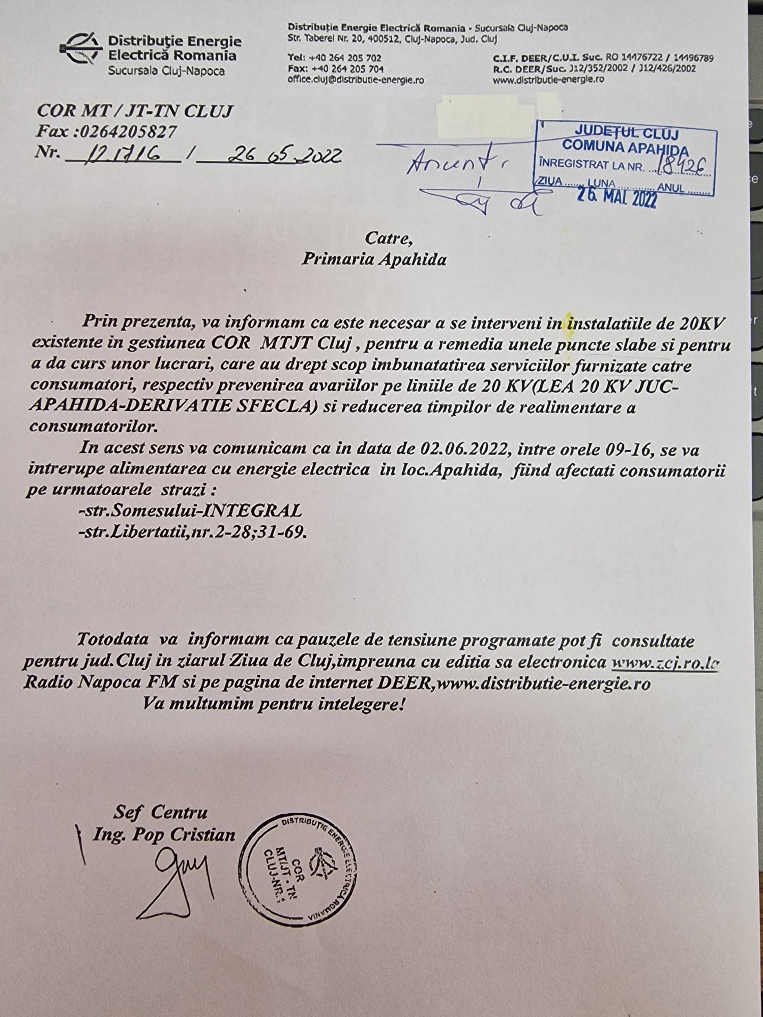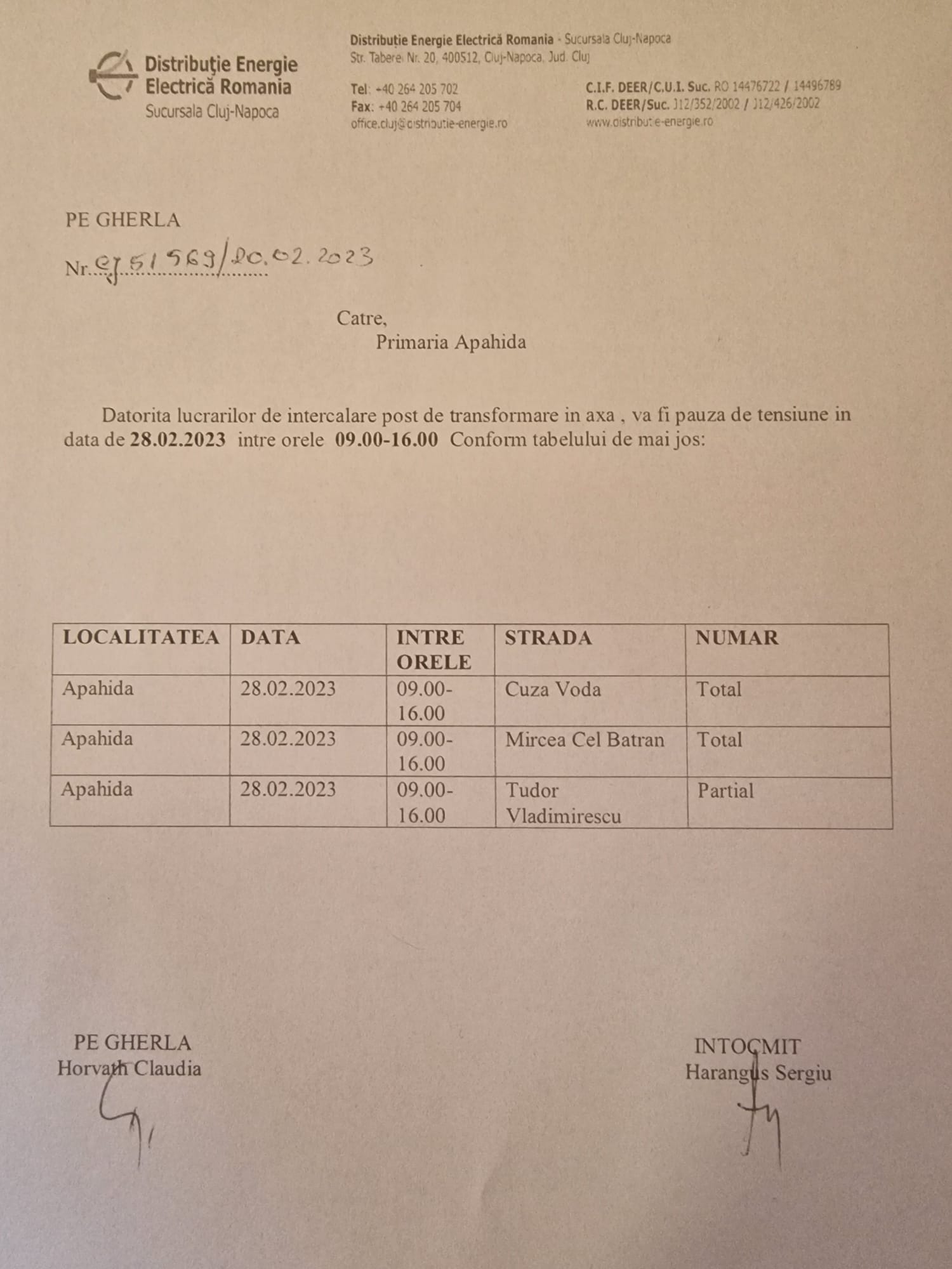 - strada Horea , strada Decebal intre numerele 29-33, inclusiv Primaria Comunei Apahida . Lucrare de montare circuite electrice cu conductoare torsadate pe stalpii LEA 0,4 kv. In data de 8 iulie 2016 intre orele 9:00-15:00 se intrerupe alimentarea cu energie electrica in urmatorul mod: