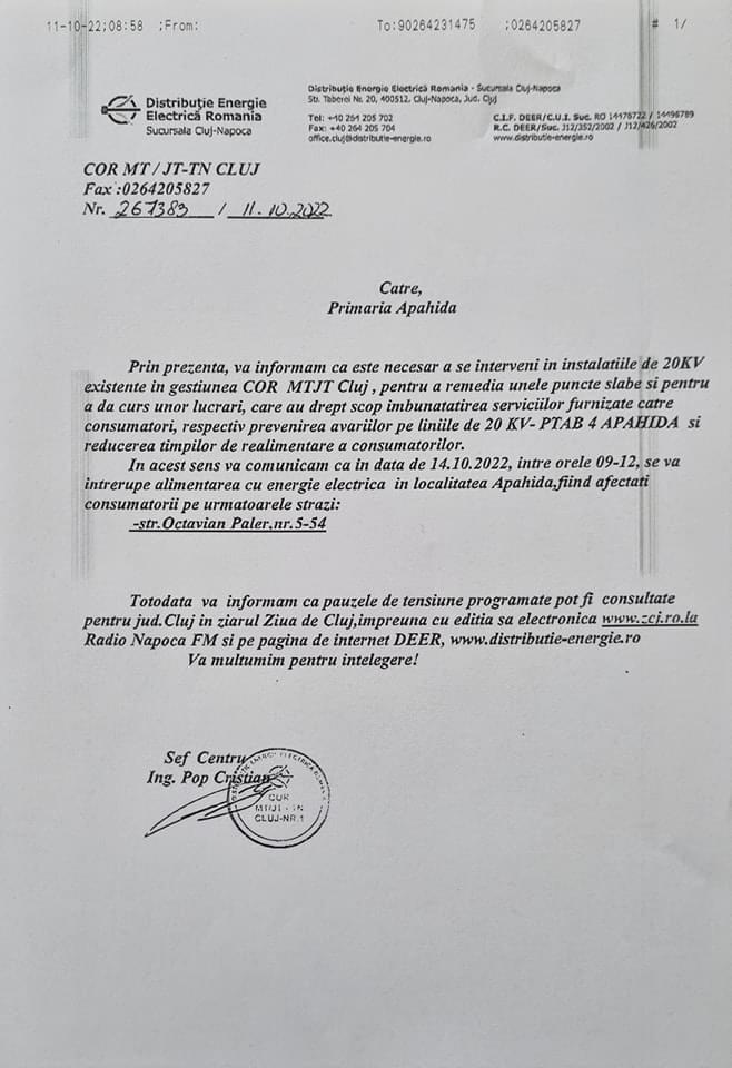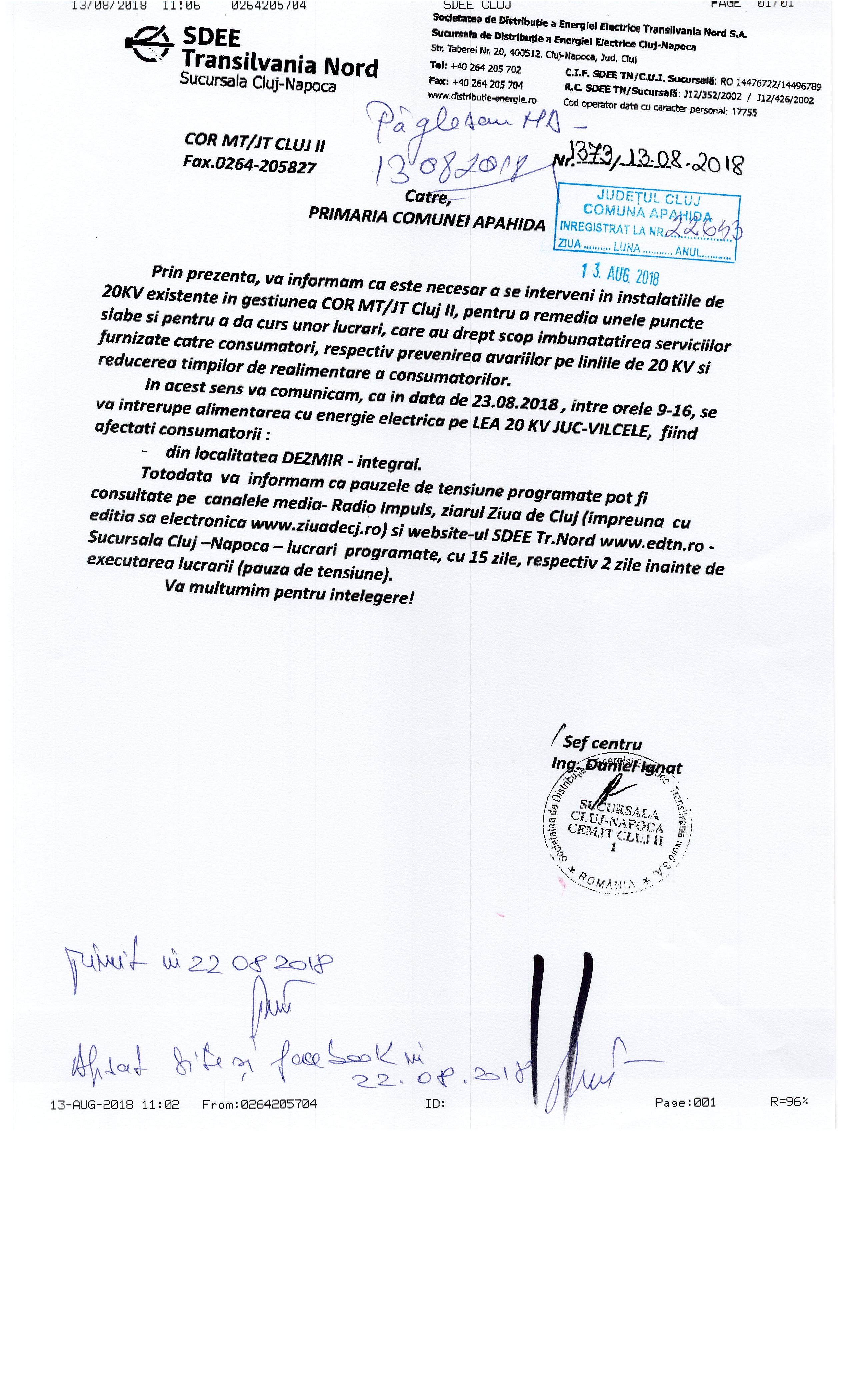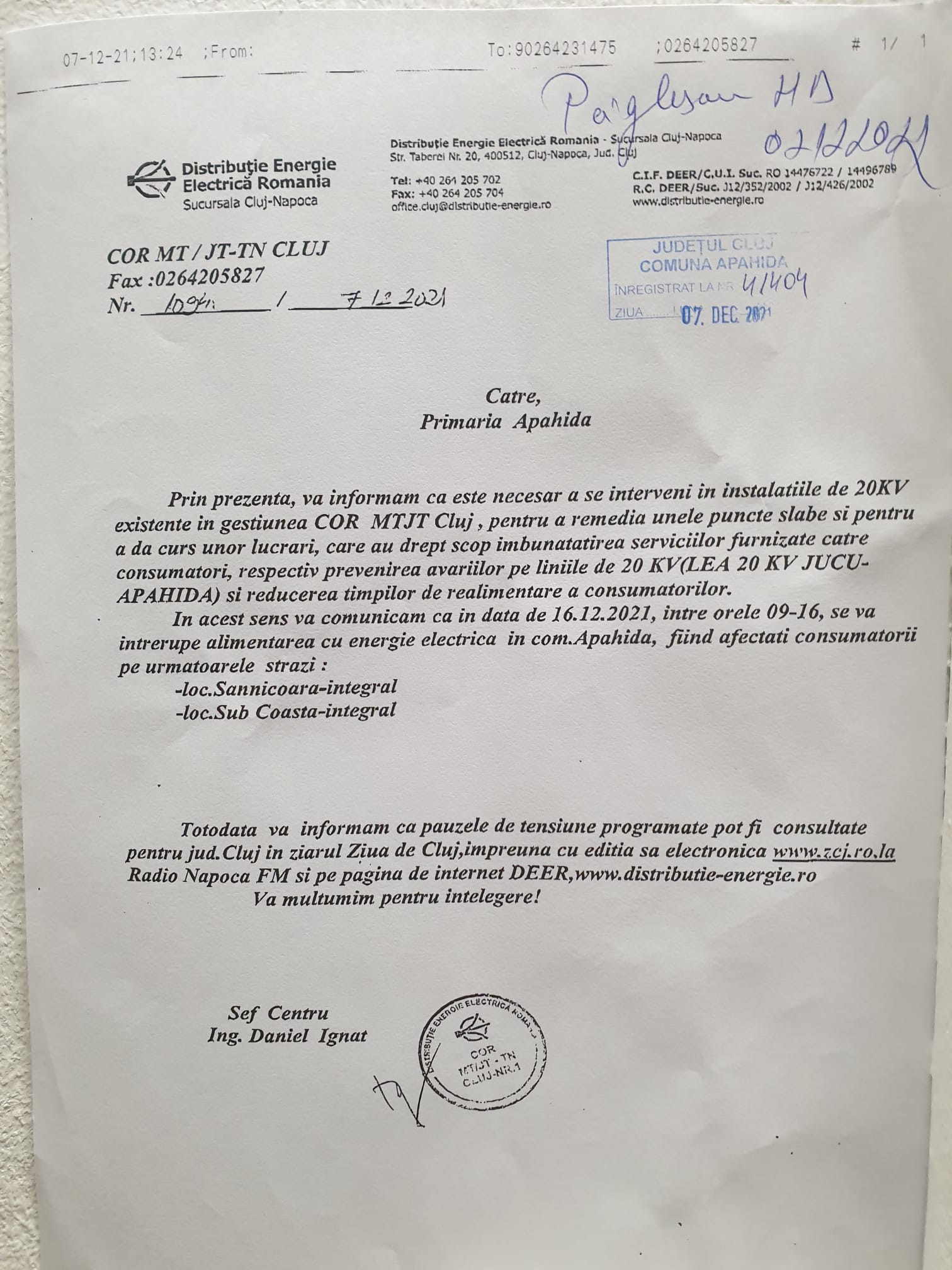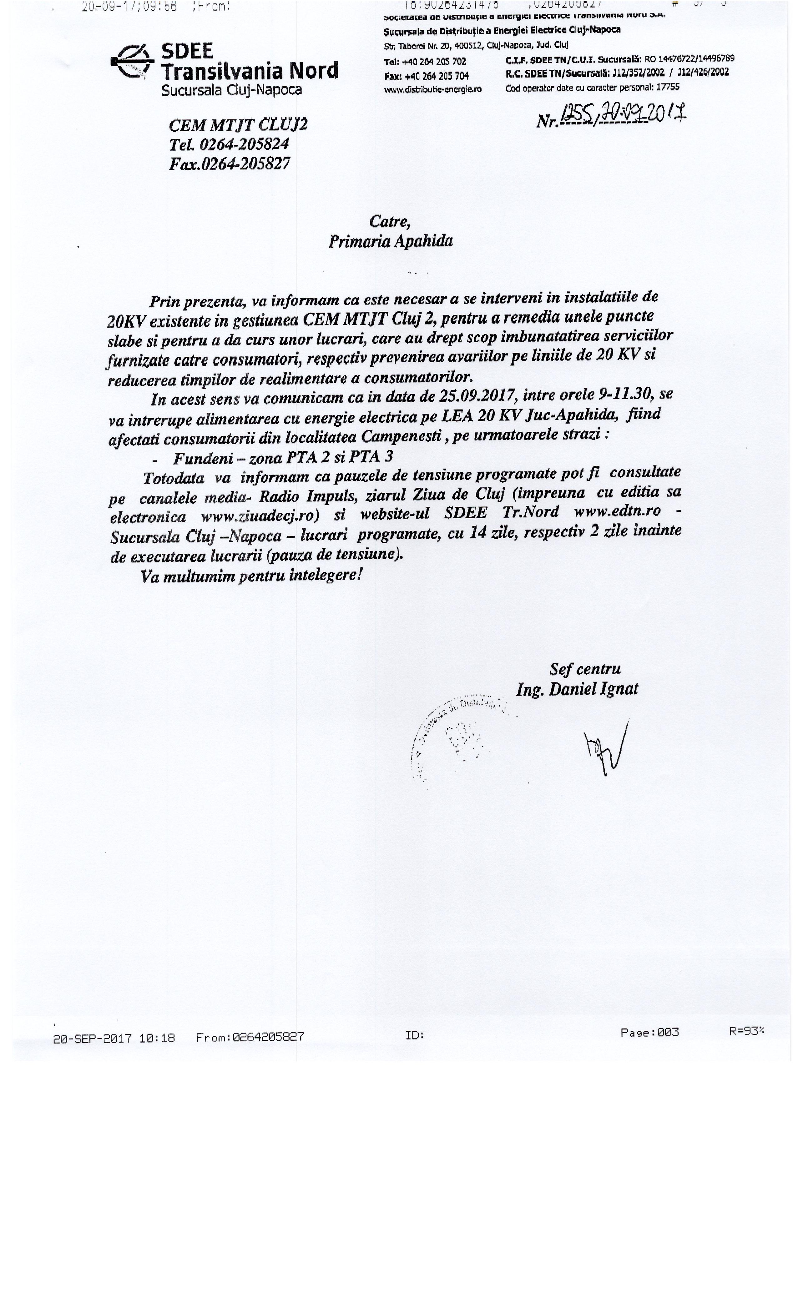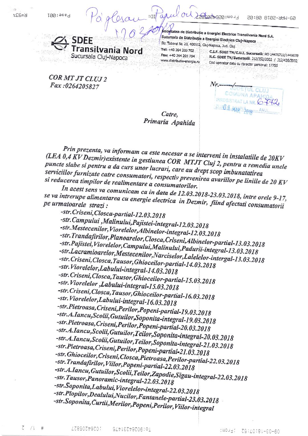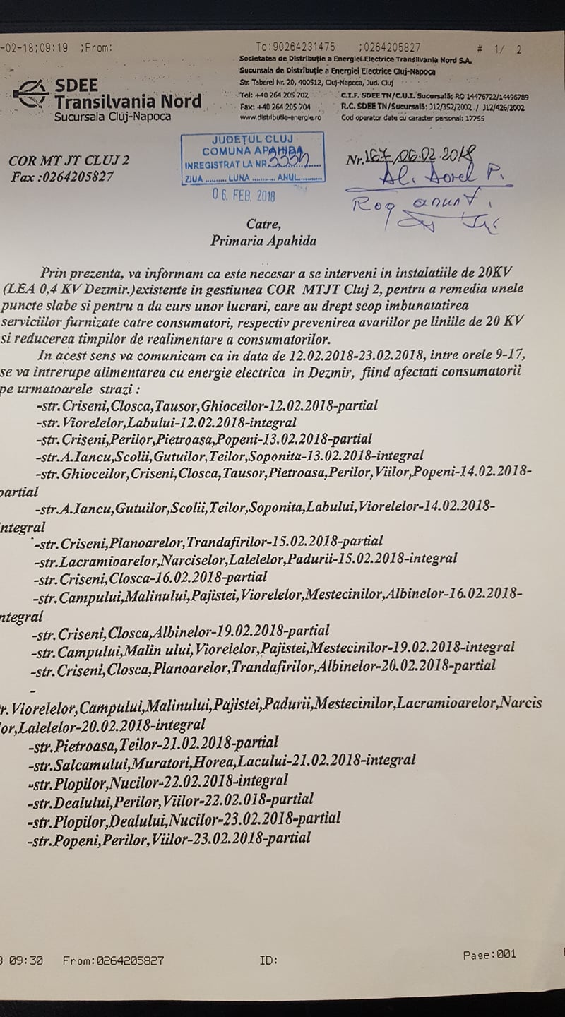 - strada Horea , strada Decebal intre numerele 29-33, inclusiv Primaria Comunei Apahida . Lucrare de montare circuite electrice cu conductoare torsadate pe stalpii LEA 0,4 kv. In data de 8 iulie 2016 intre orele 9:00-15:00 se intrerupe alimentarea cu energie electrica in urmatorul mod: