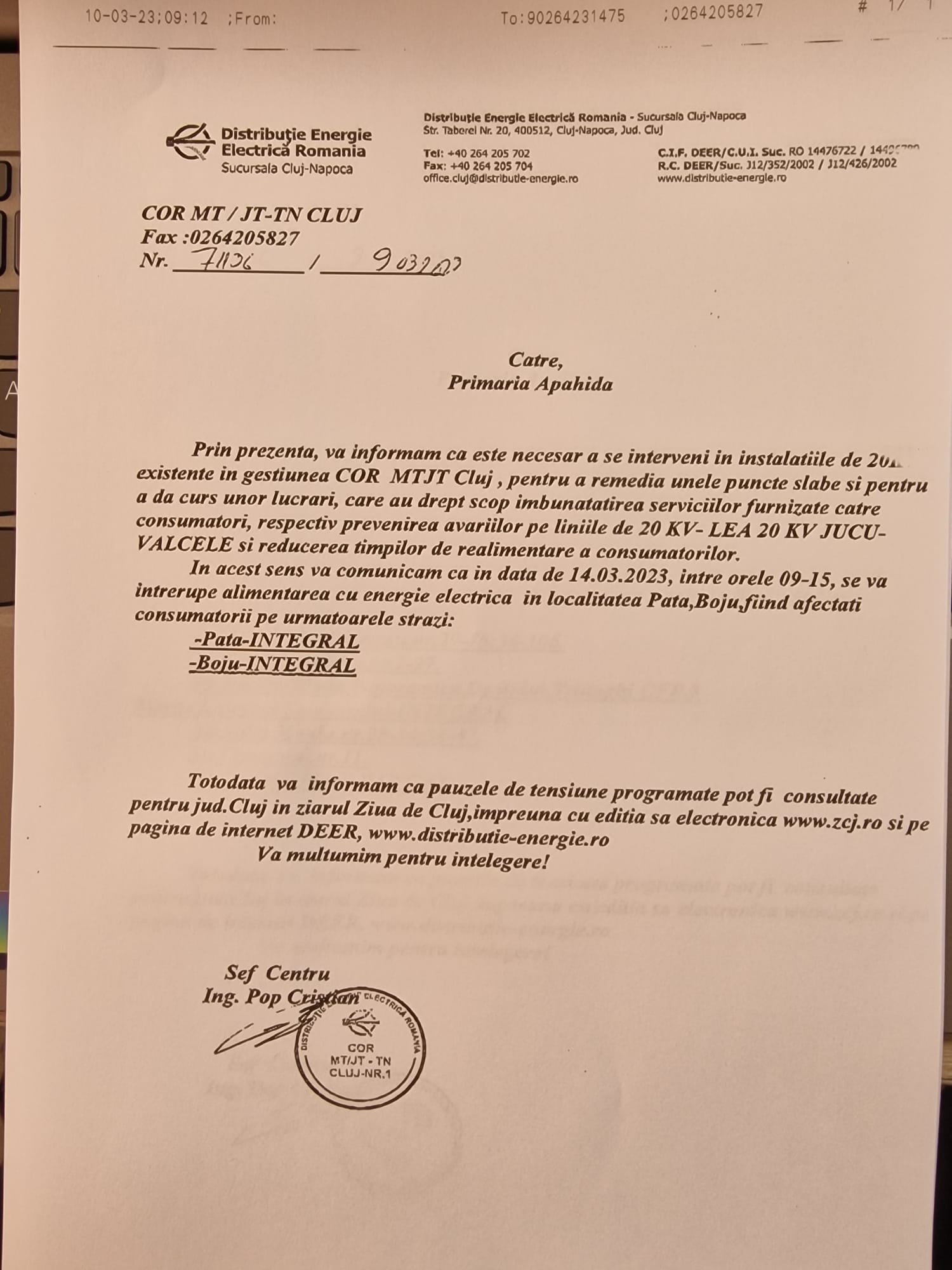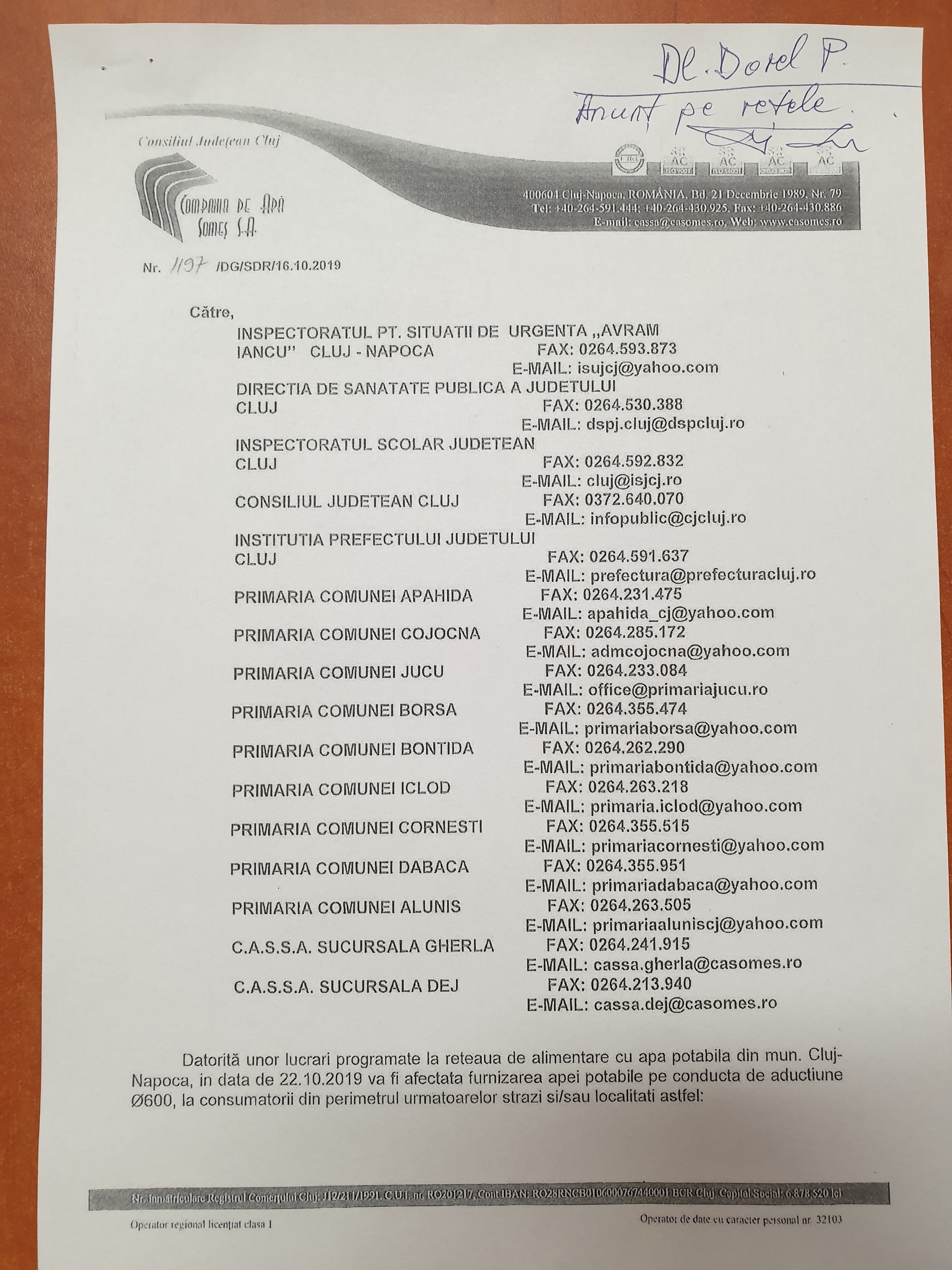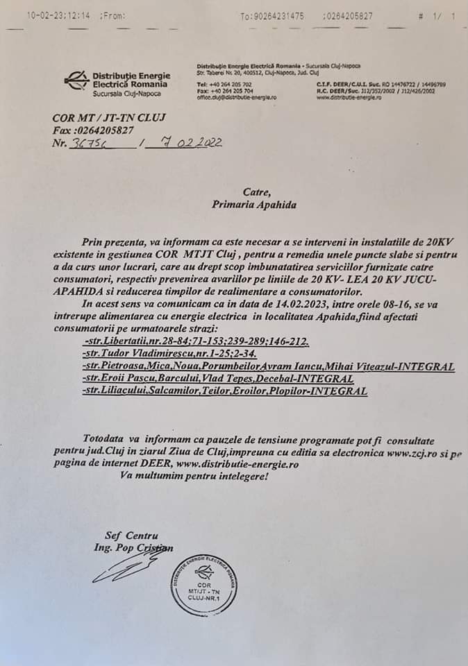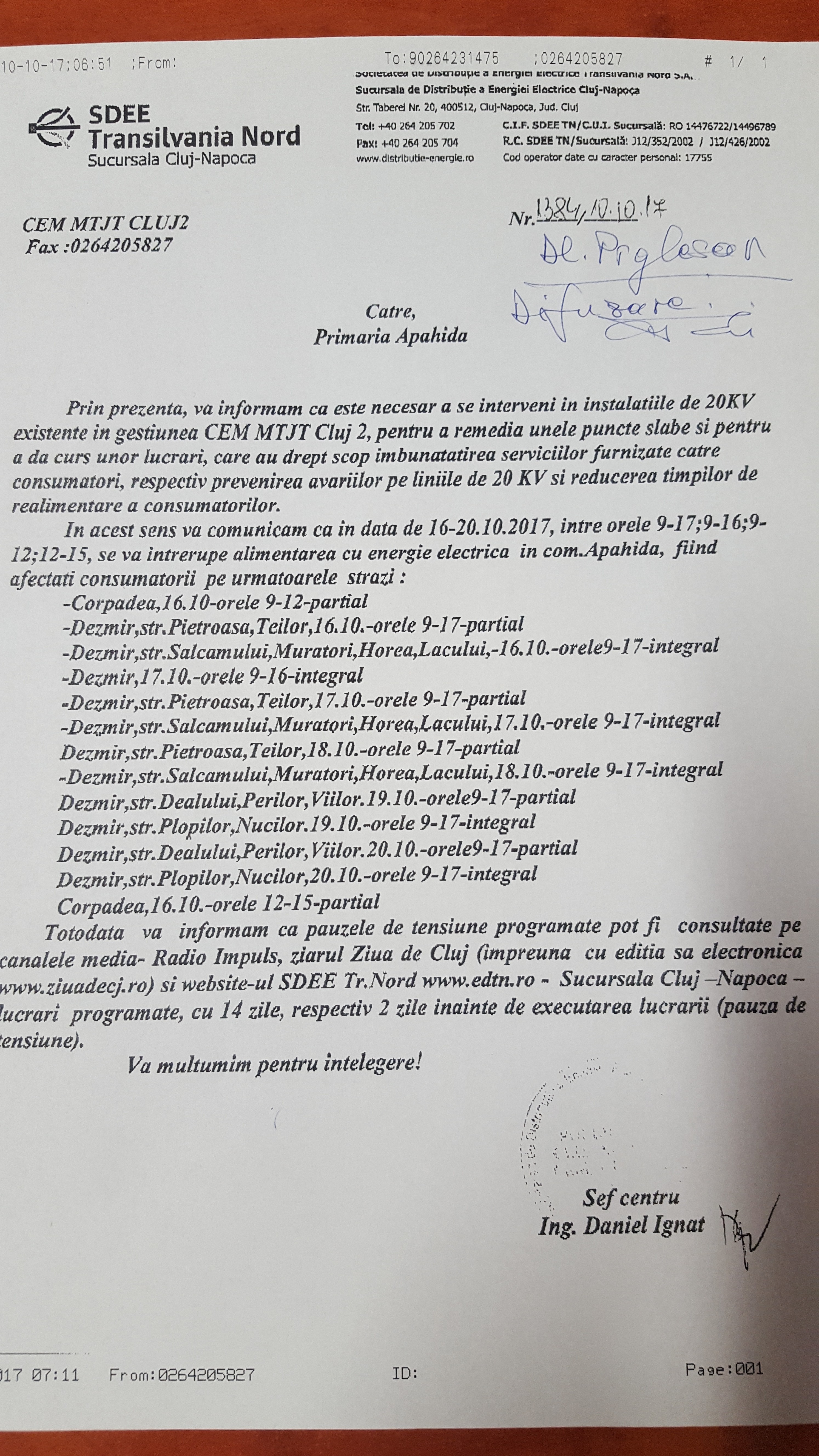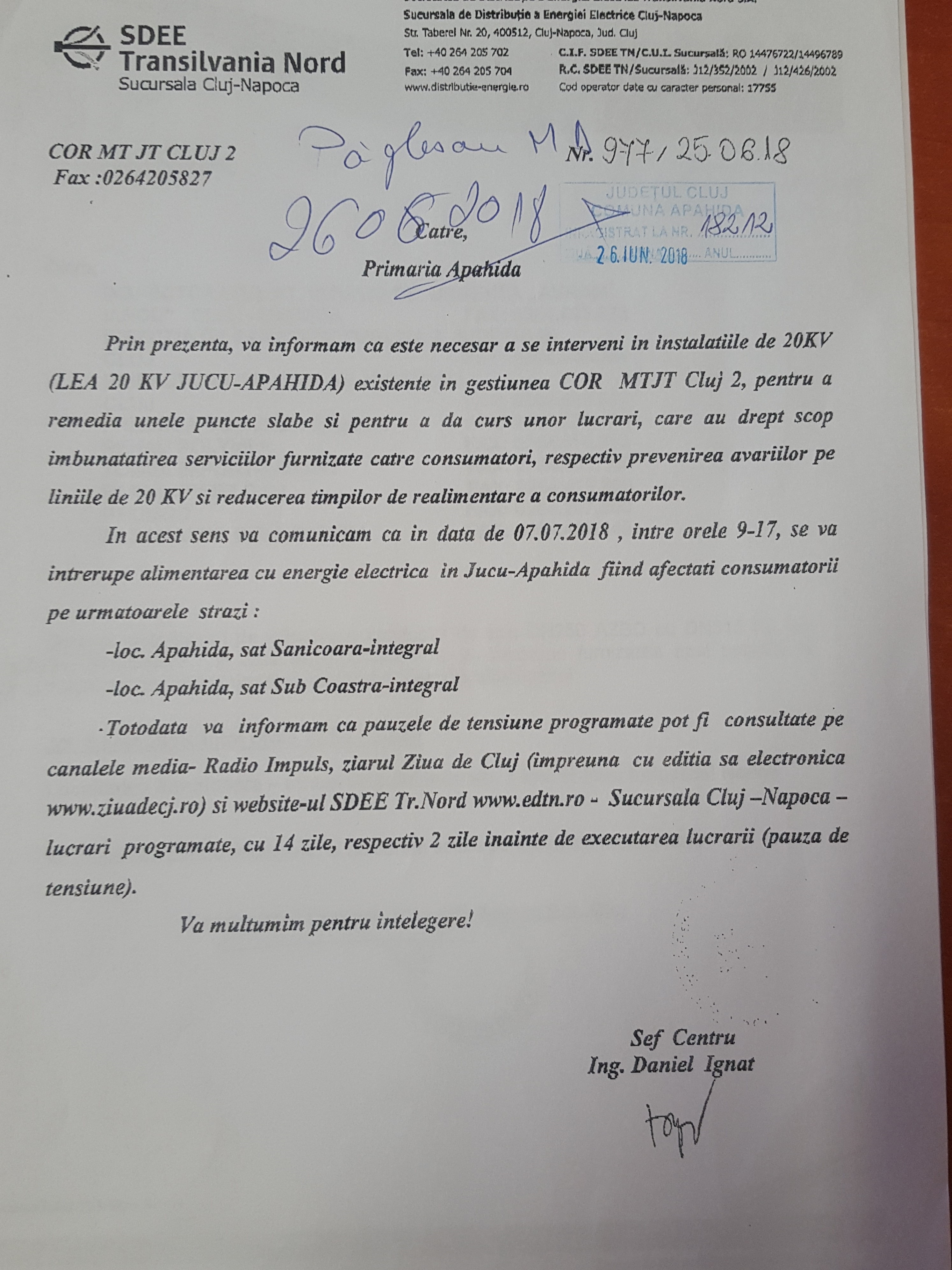 Prin prezenta va informam ca este necesar a se interveni in instalatiile de 20 kv existente in gestiunea CEMJT Cluj 2, pentru a remedia unele puncte slabe si pentru a da curs unor lucrari programate , care au drept scop imbunatatirea serviciilor furnizate catre consumatori ,respectiv prevenirea avariilor pe retelele de 0,4 kv si reducerea timpilor de realimentare a consumatorilor.