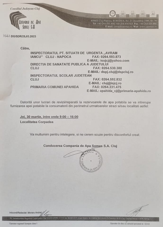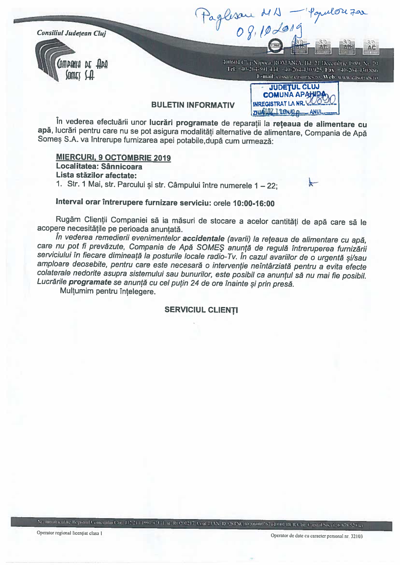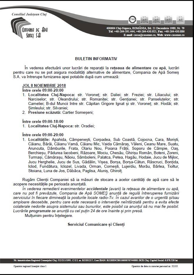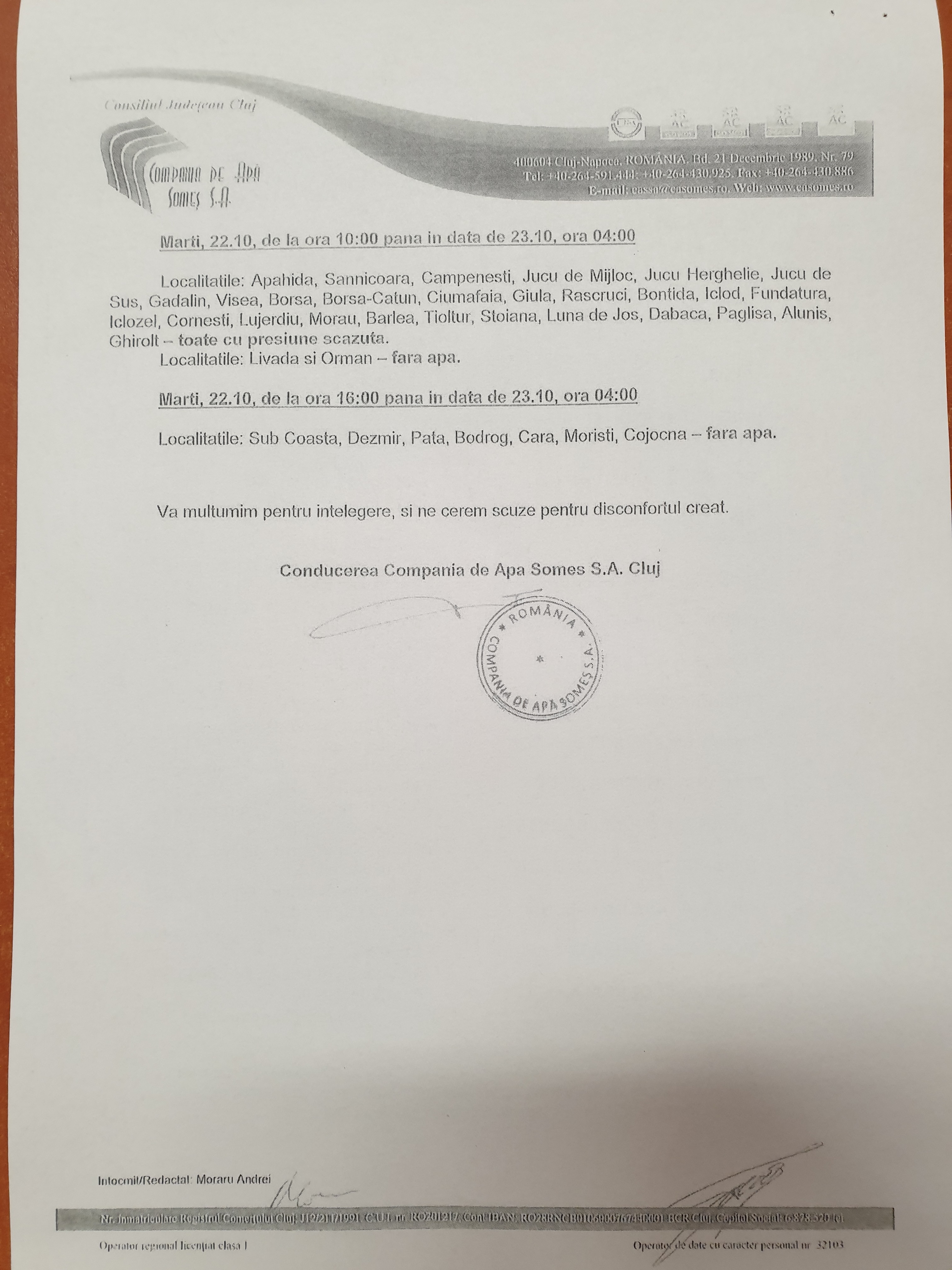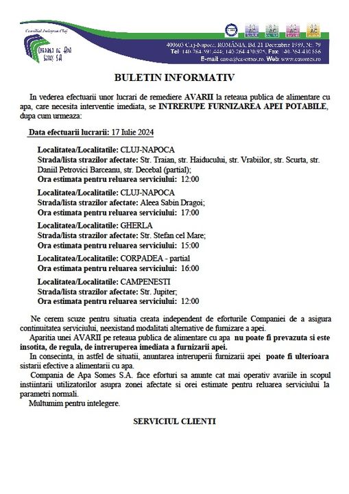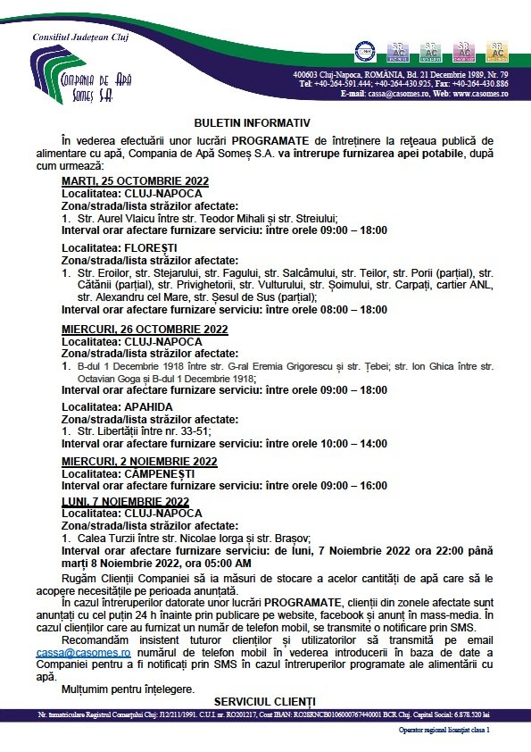 | 21.10.2025 | ANUNT, societati autorizate de catre Compania de Apa Somes S.A. , privind serviciile de vidanjare . - vezi anunț |