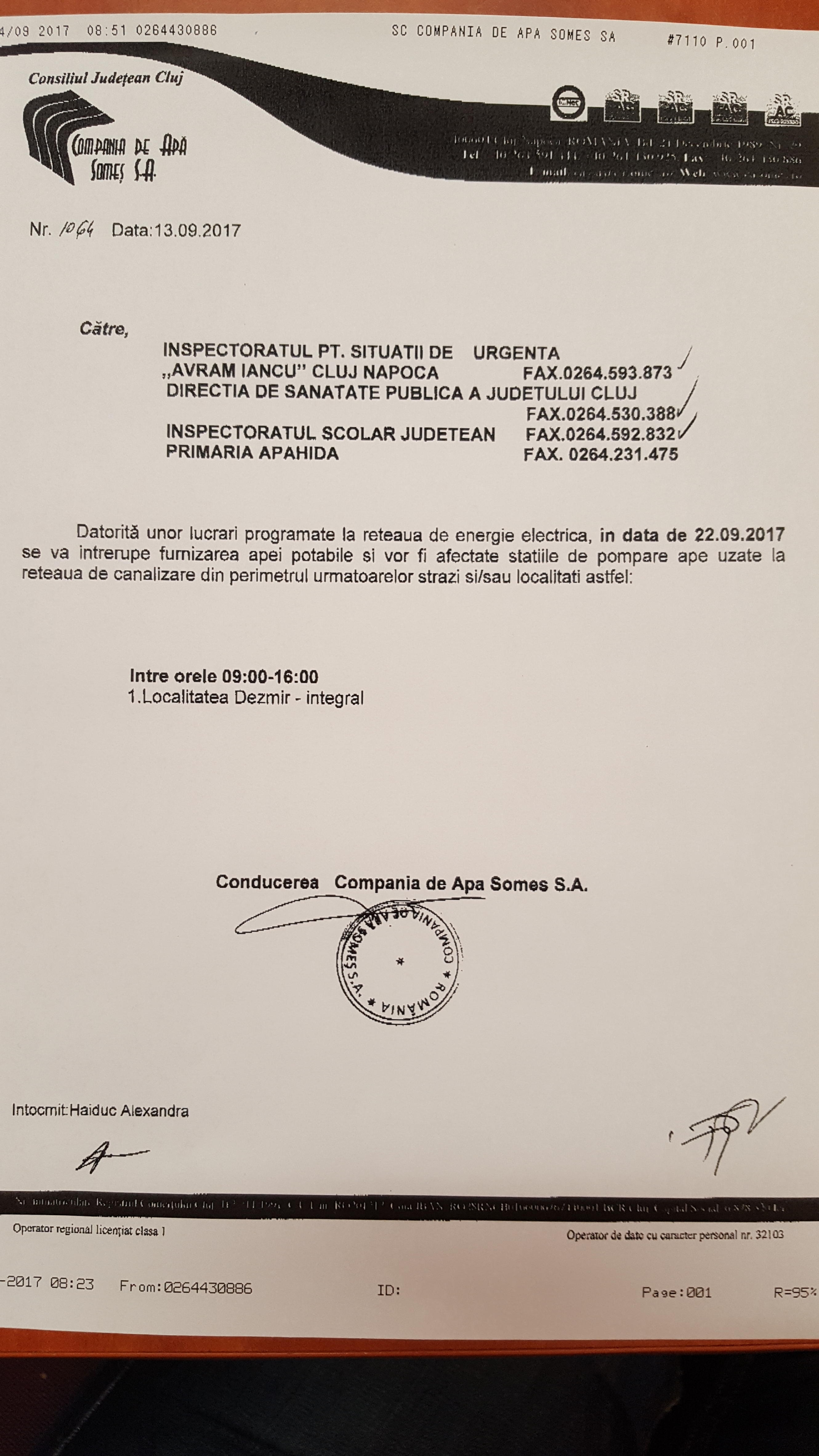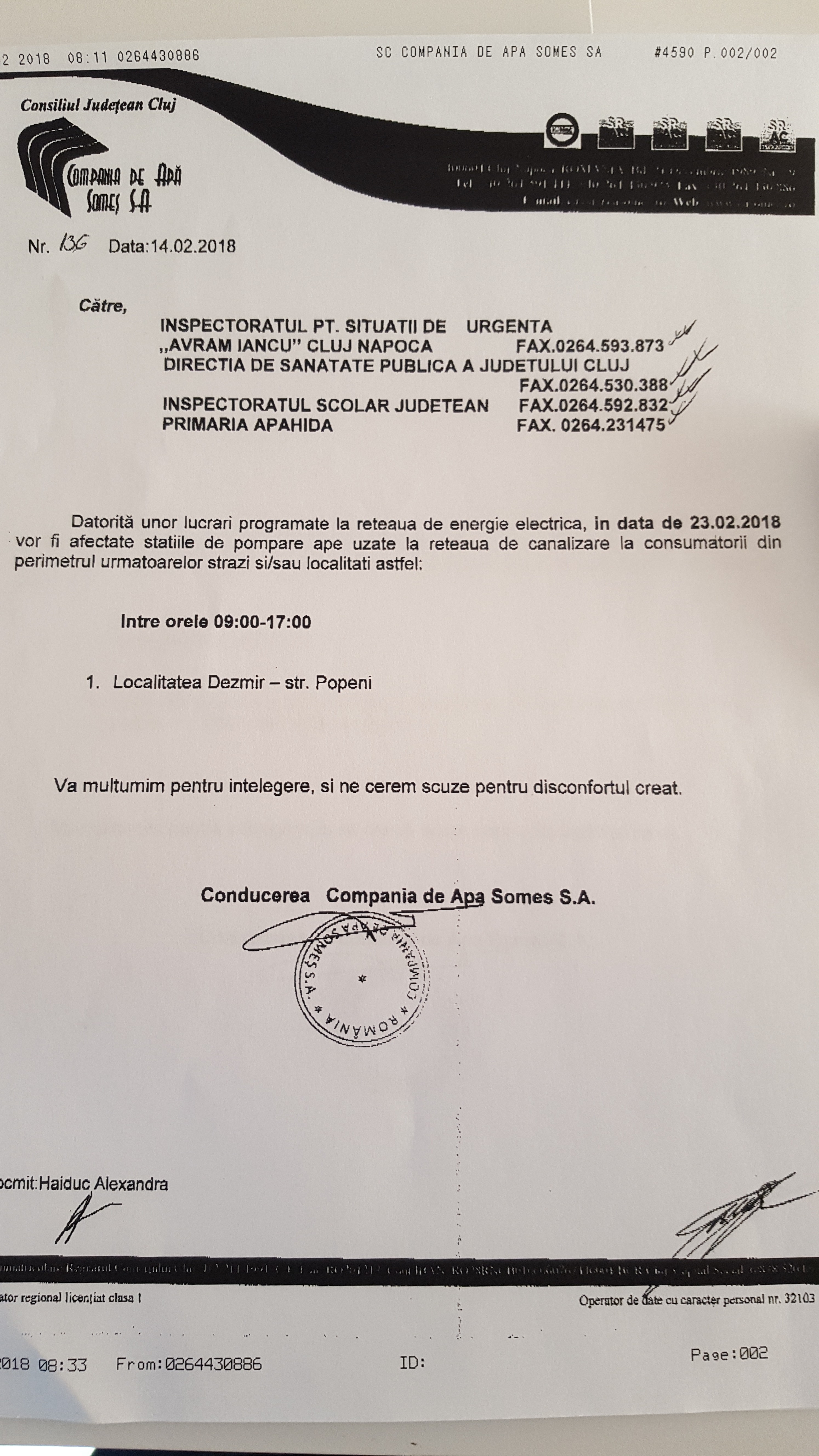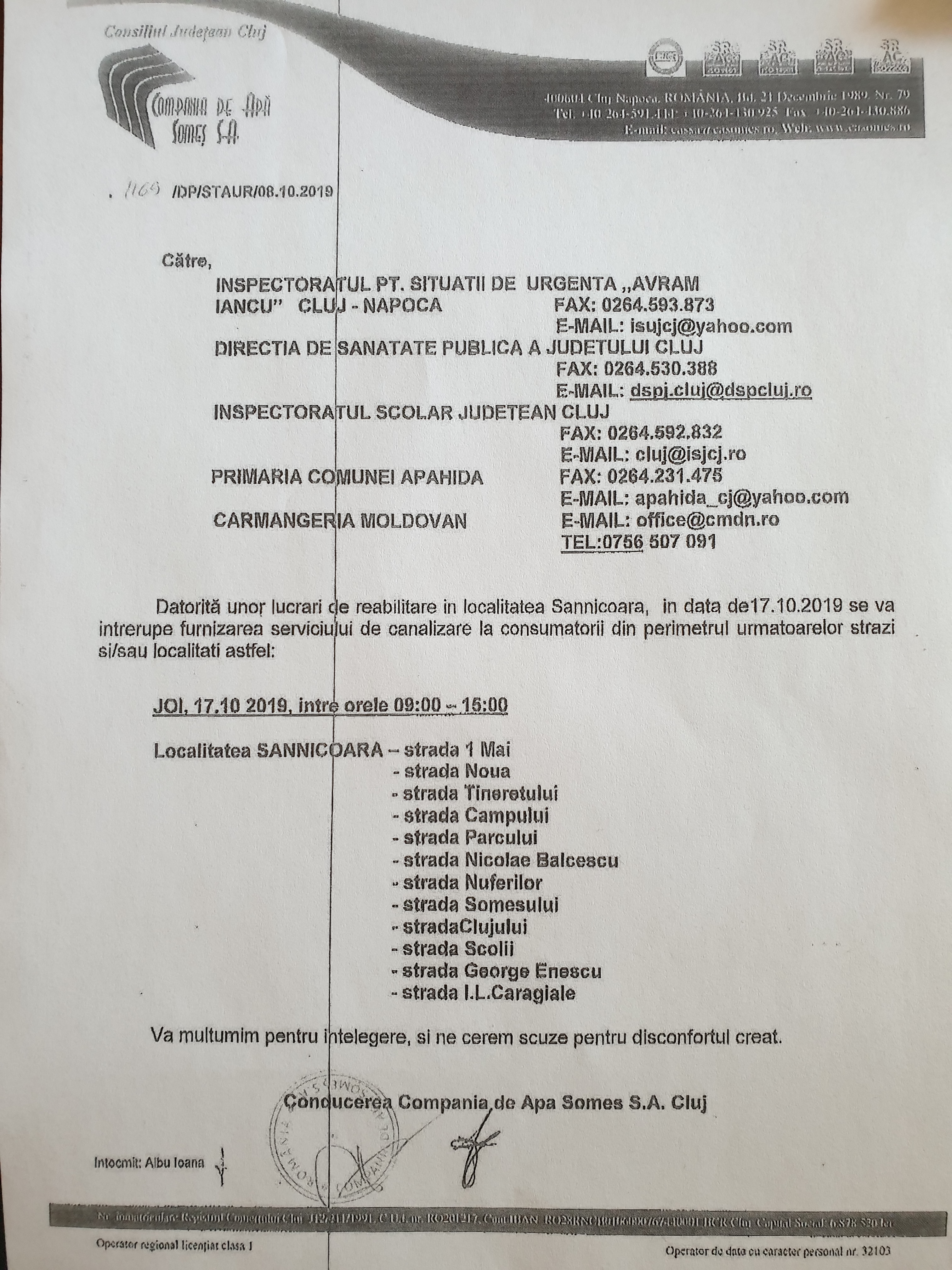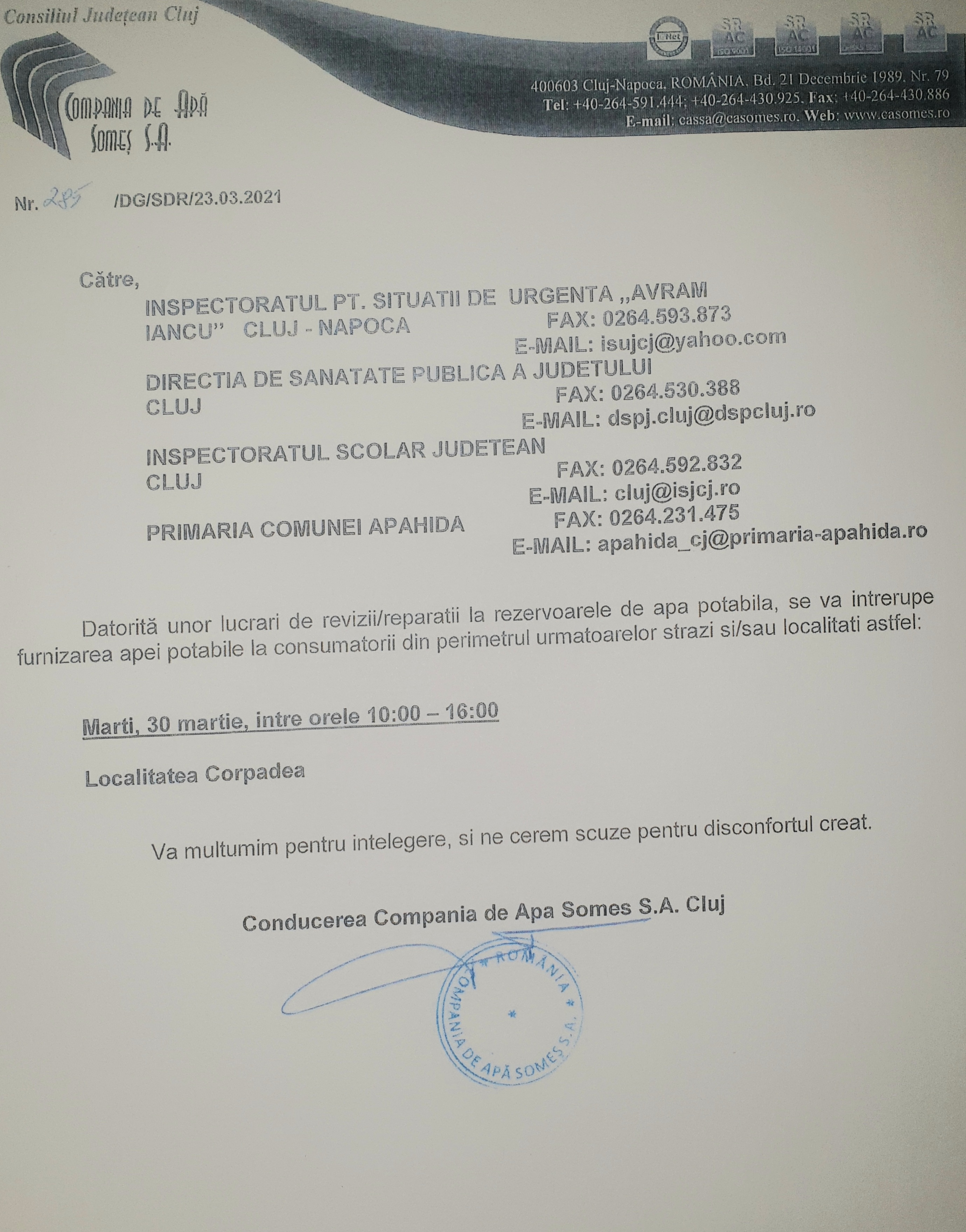| 21.10.2025 | ANUNT, societati autorizate de catre Compania de Apa Somes S.A. , privind serviciile de vidanjare . - vezi anunț |