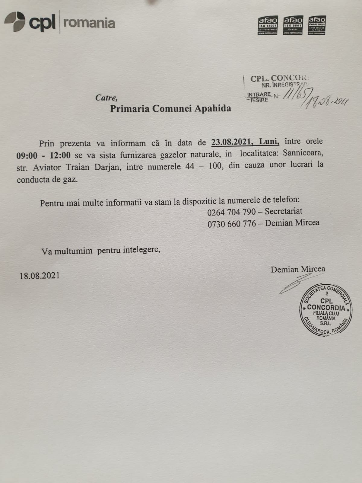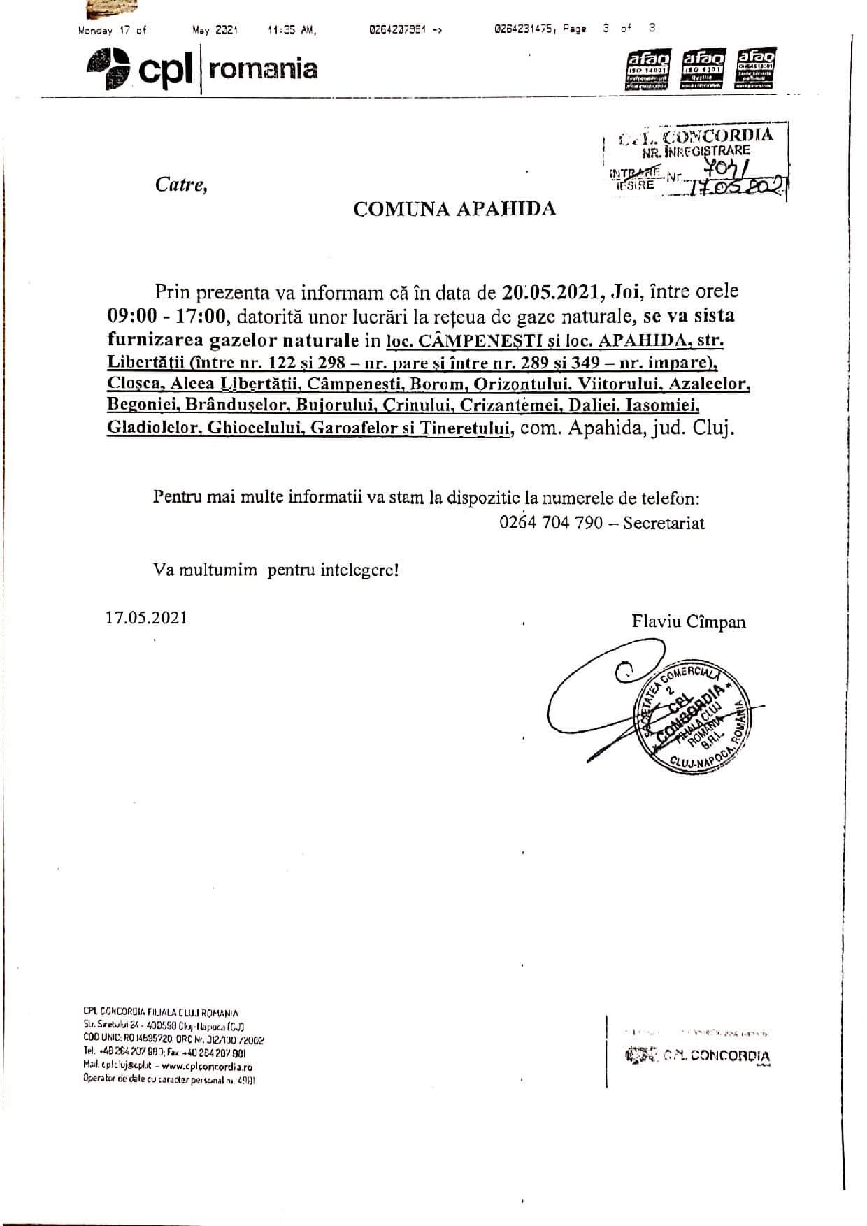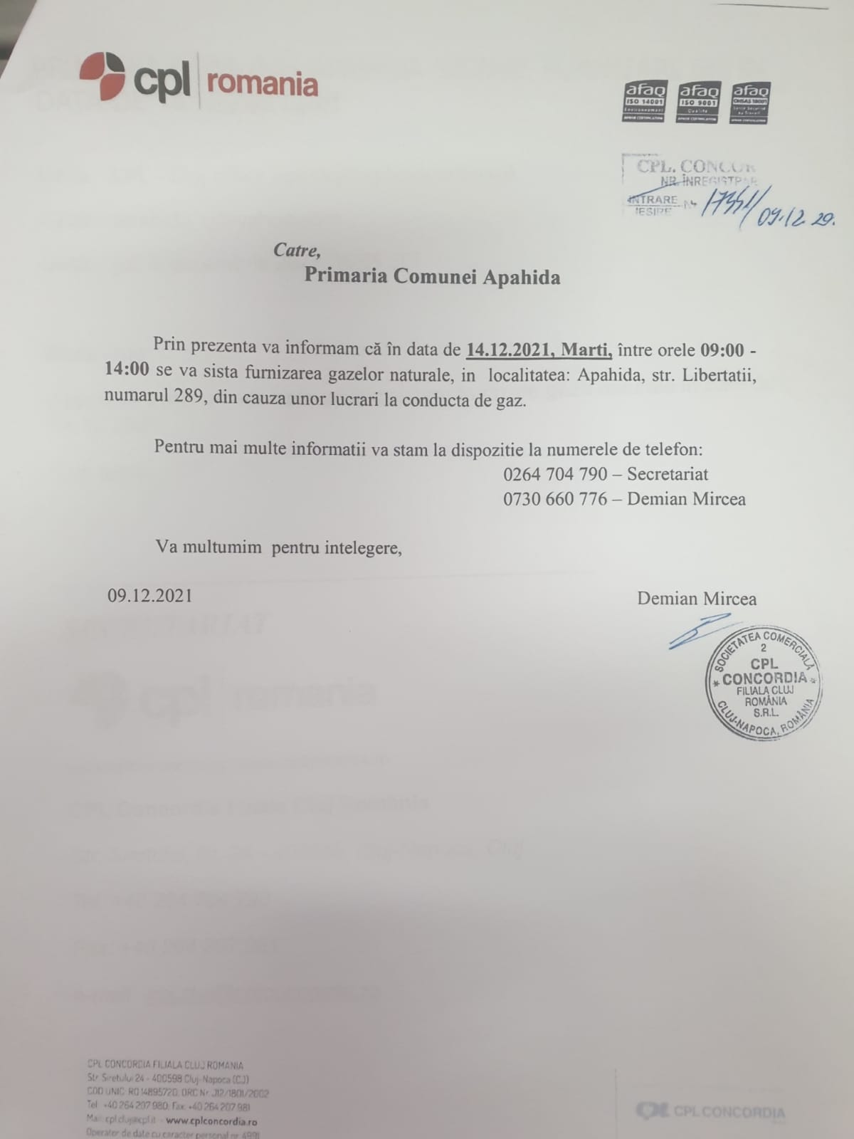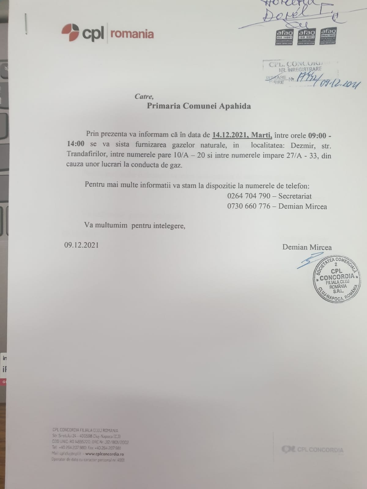 COMUNA APAHIDA ( TOATE SATELE COMPONENTE ) ESTE AFECTATA IN PROPORTIE DE 100%, GAZELE NATURALE VOR FI INTRERUPTE IN TOTALITATE PE O PERIOADA CARE NU POATE FI PRECIZATA ACUM. VA VOM TINE LA CURENT CU EVOLUTIA SITUATIEI> ANUNT CPL CONCORDIA APAHIDA