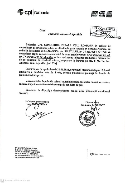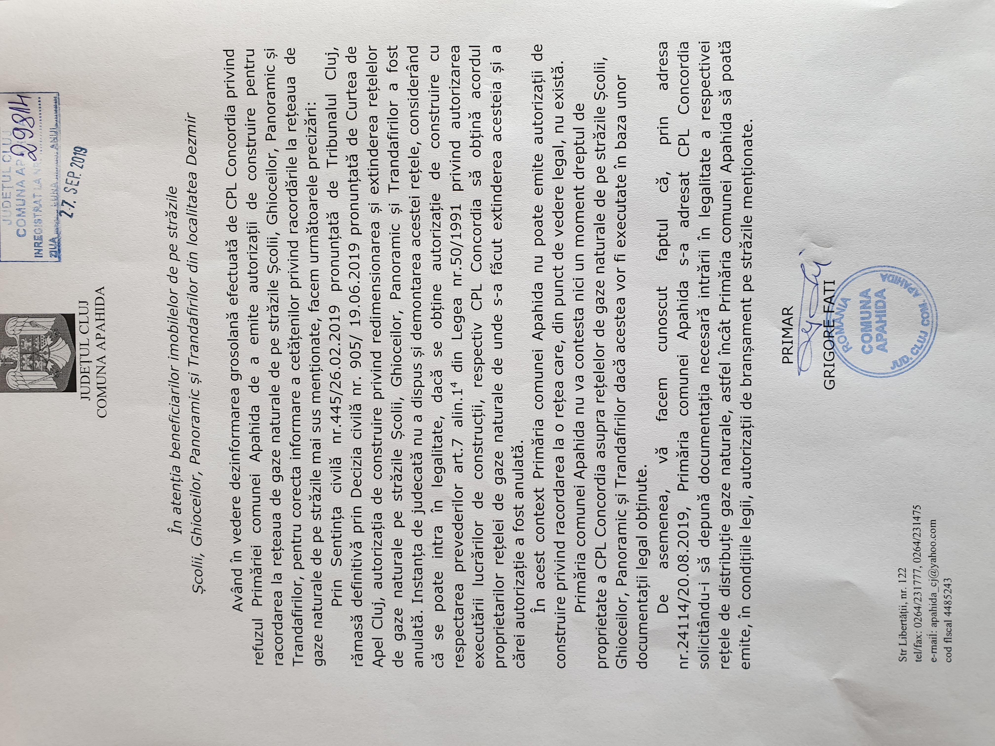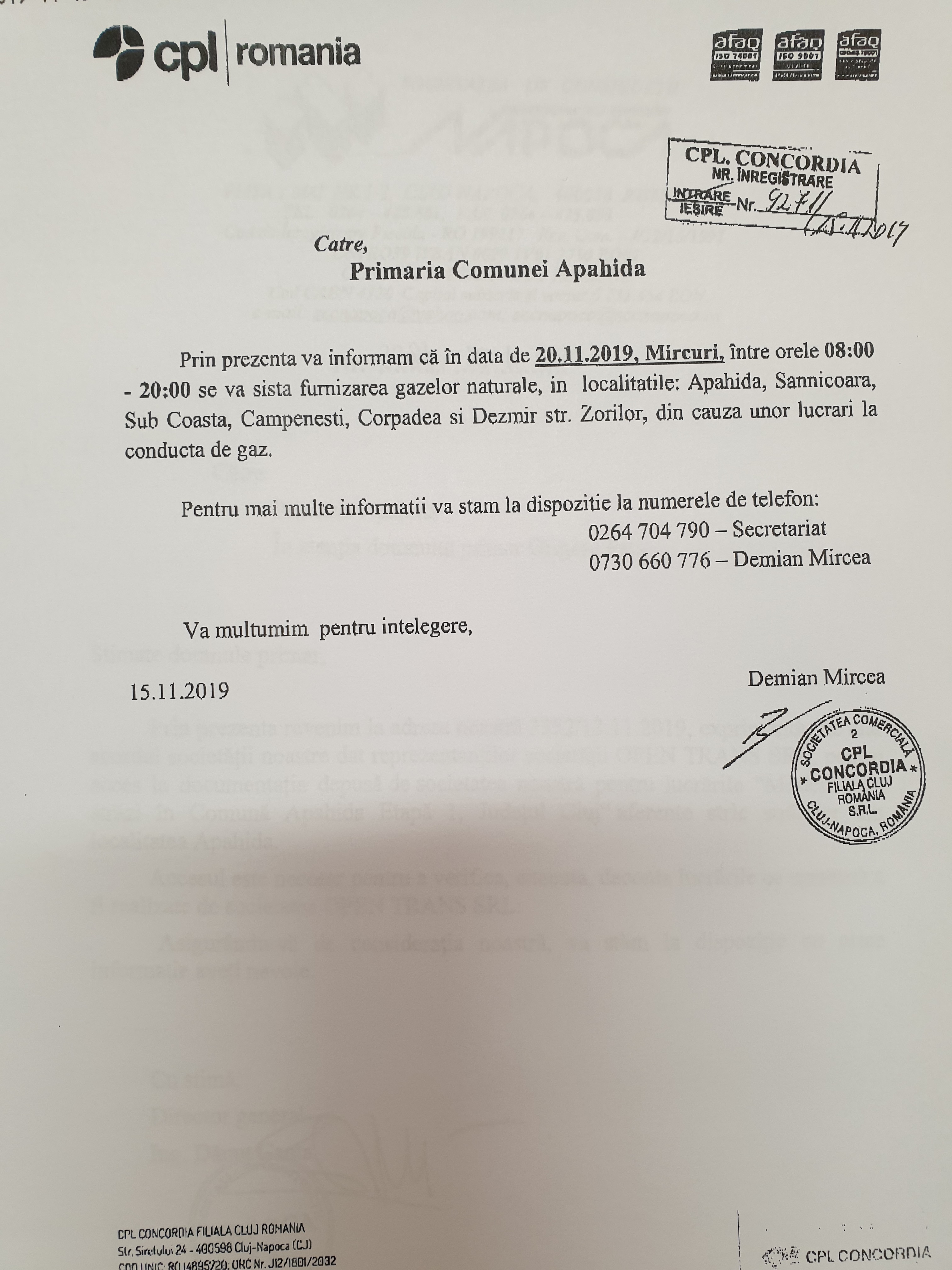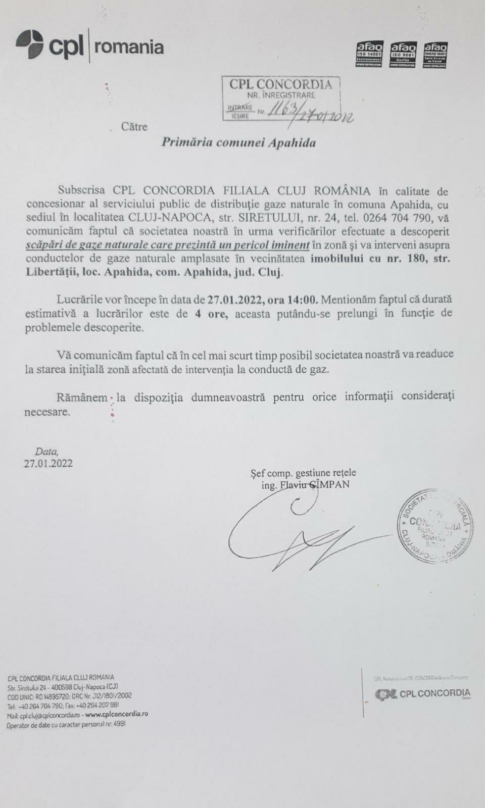 COMUNA APAHIDA ( TOATE SATELE COMPONENTE ) ESTE AFECTATA IN PROPORTIE DE 100%, GAZELE NATURALE VOR FI INTRERUPTE IN TOTALITATE PE O PERIOADA CARE NU POATE FI PRECIZATA ACUM. VA VOM TINE LA CURENT CU EVOLUTIA SITUATIEI> ANUNT CPL CONCORDIA APAHIDA