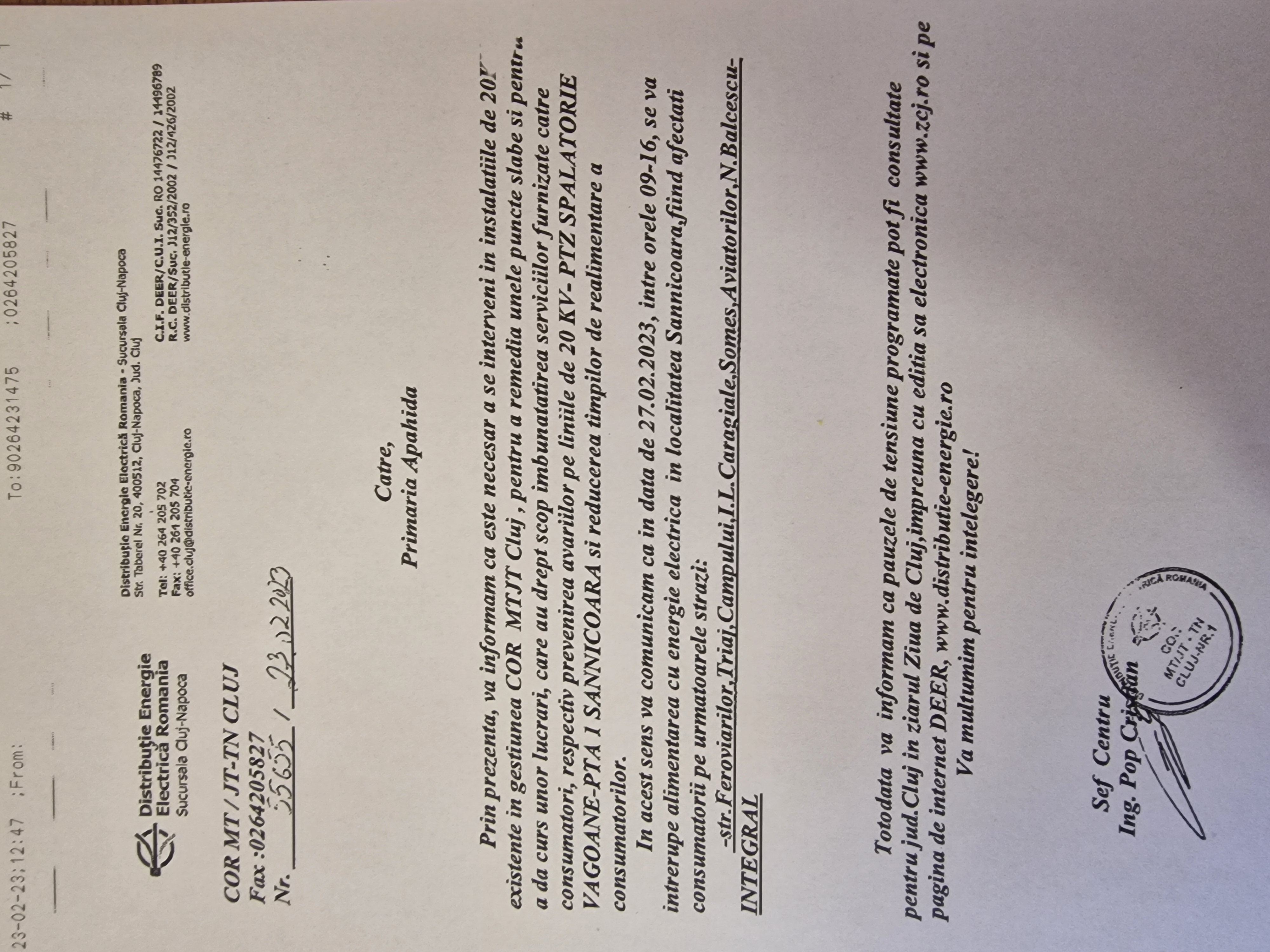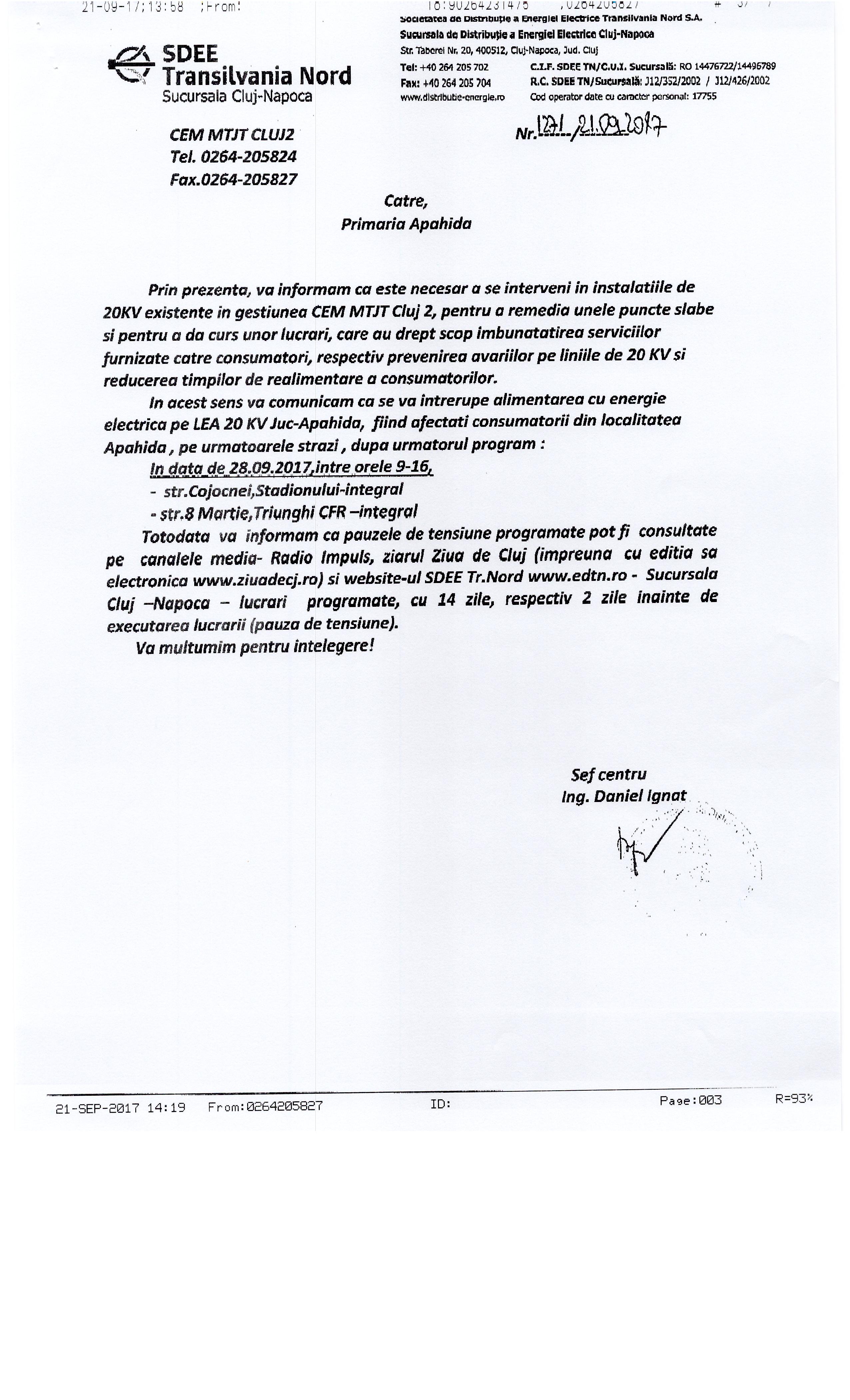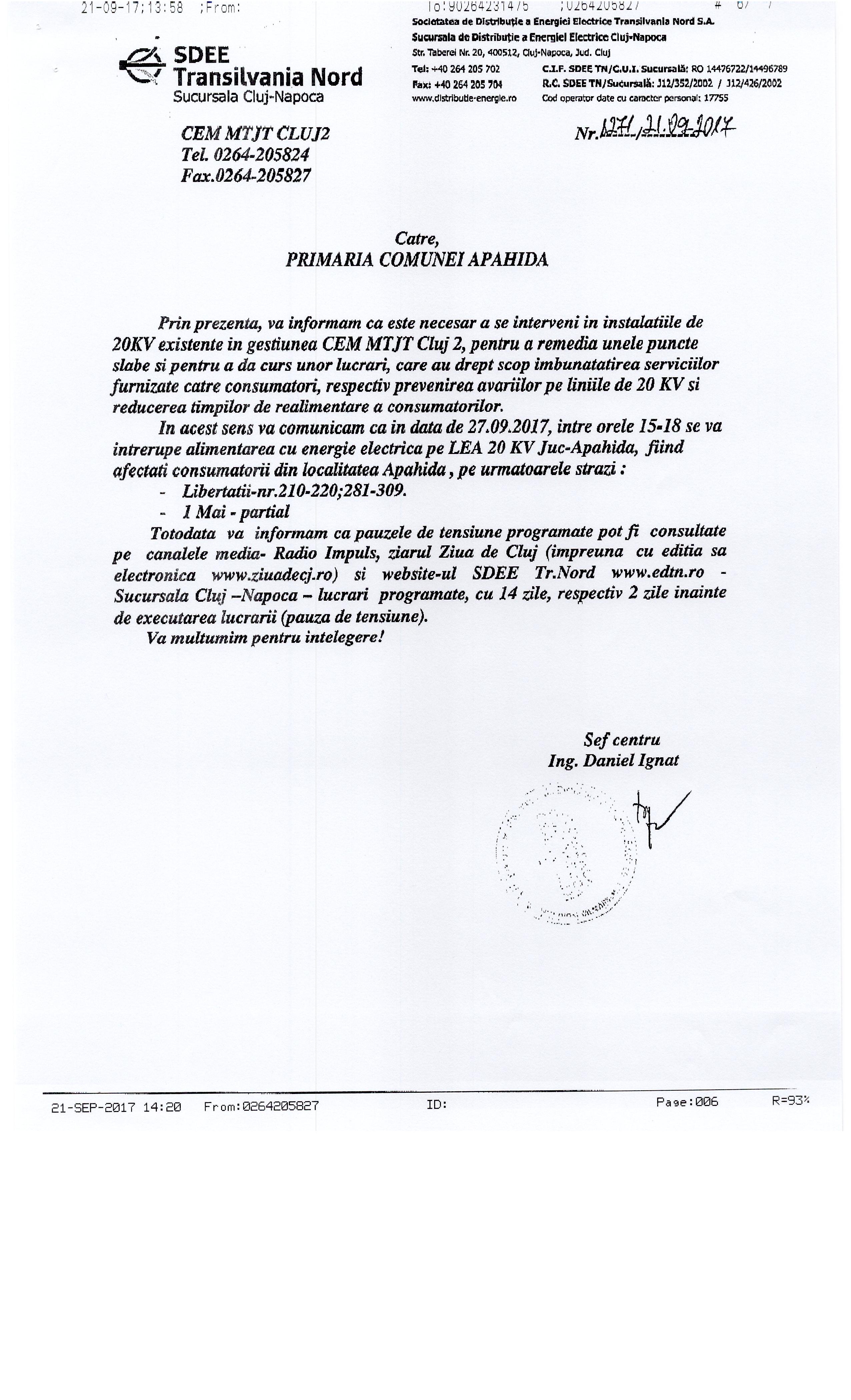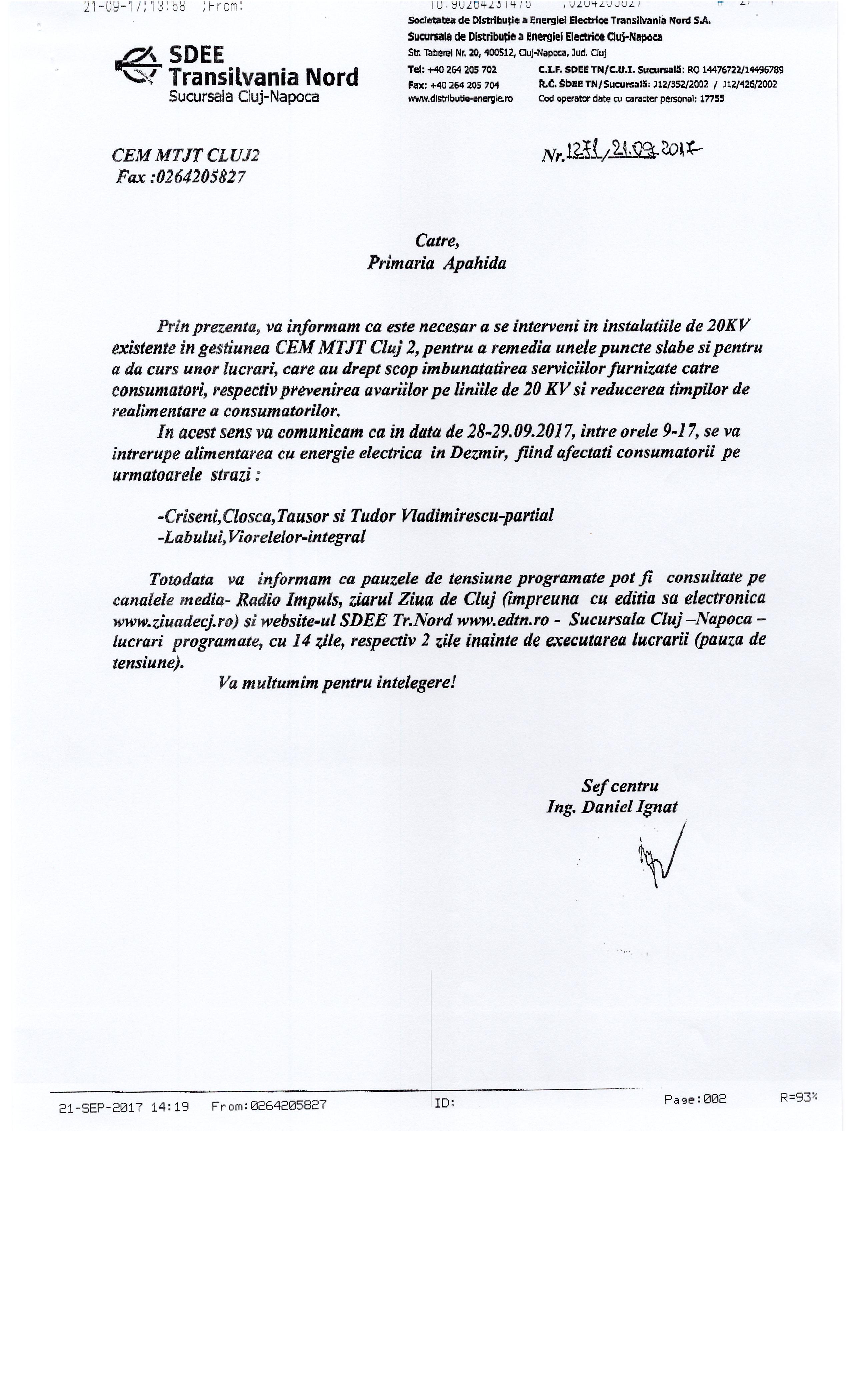 | 06.07.2016 | ANUNT ELECTRICA ( CEMJT CLUJ 2 )