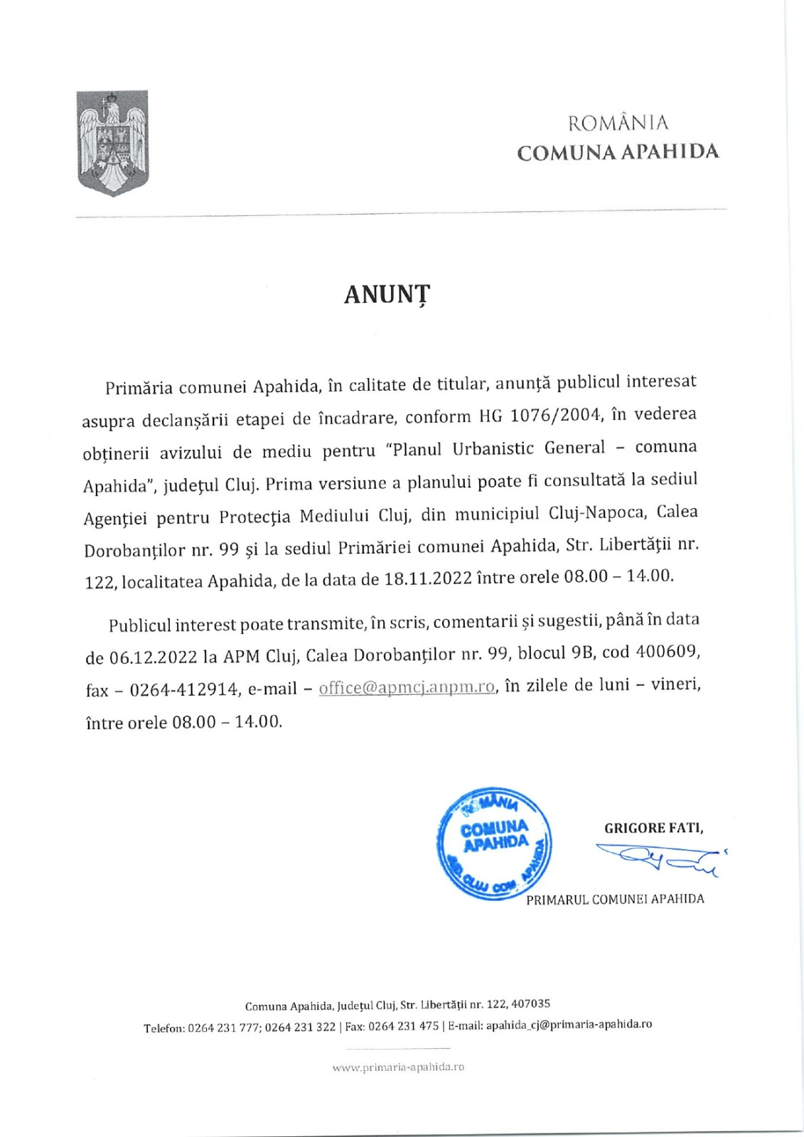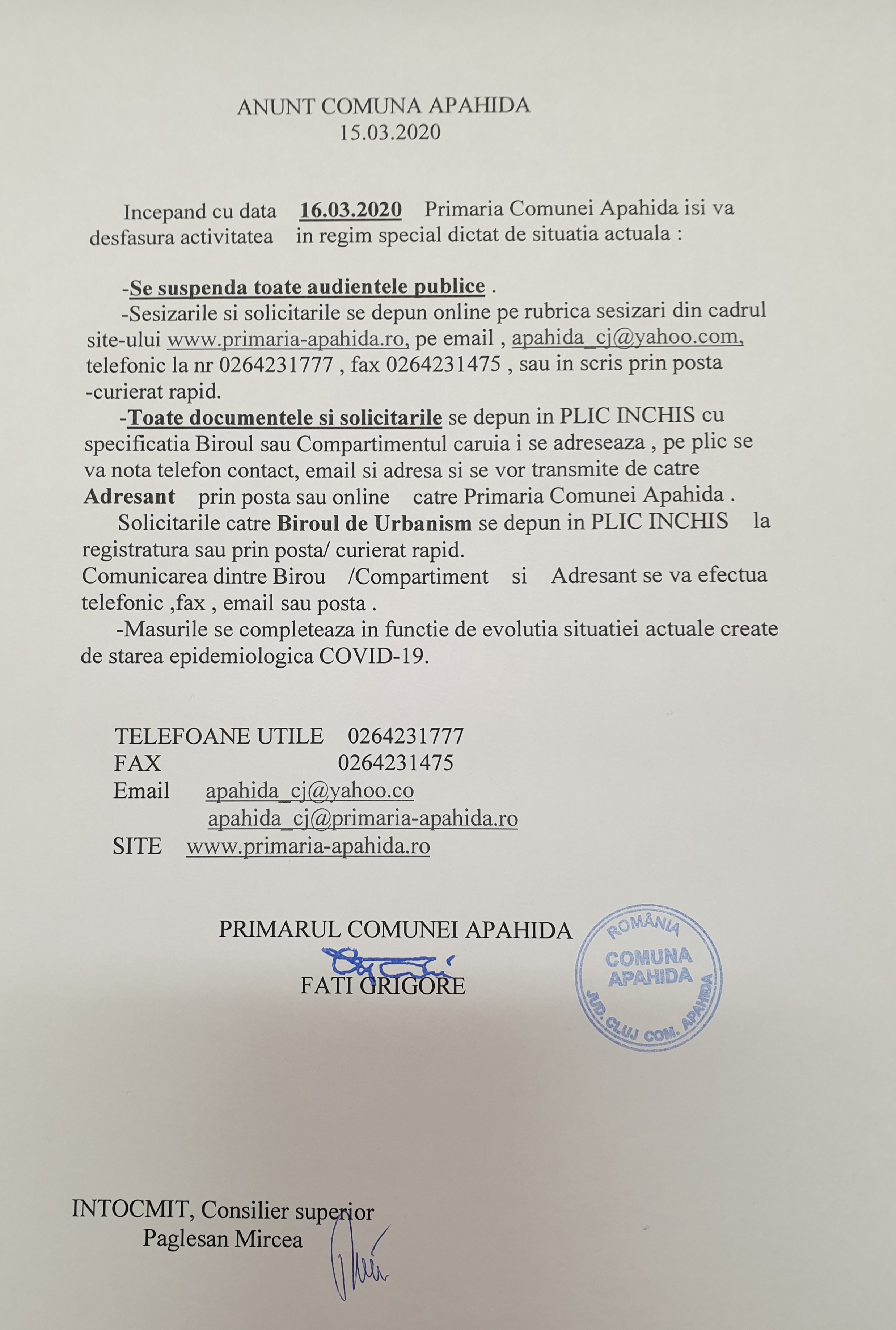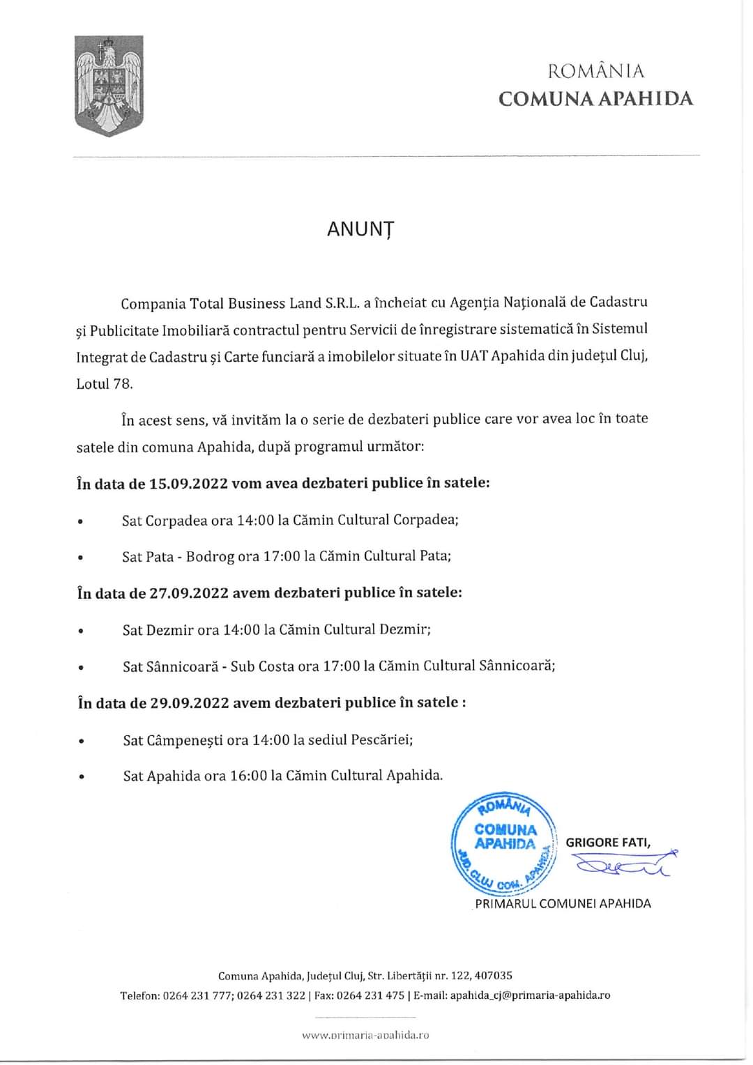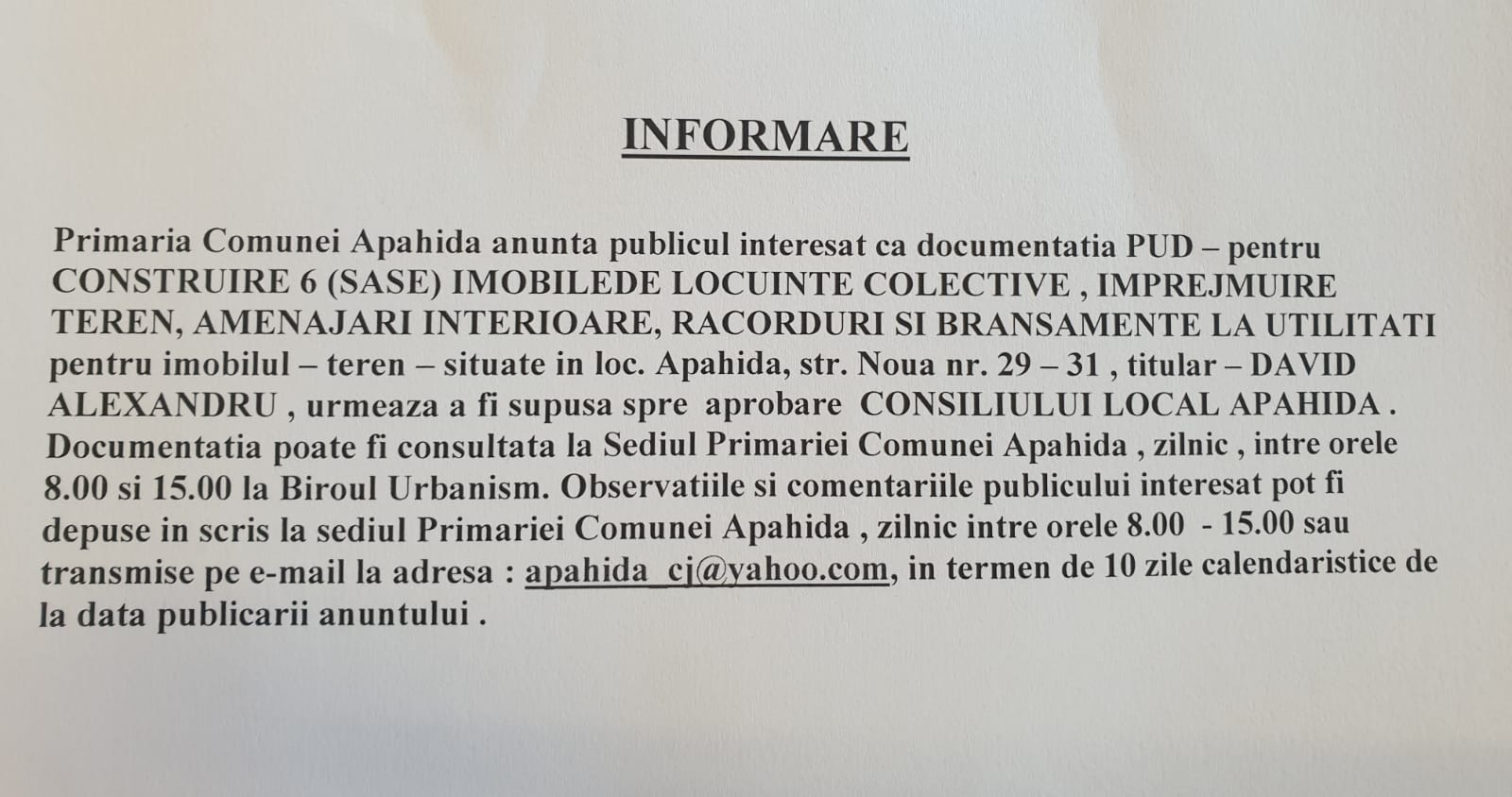 | 18.07.2016 | ANUNTPRIMARIA COMUNEI APAHIDA ANUNTA PUBLICUL INTERESAT CA ESTE IN CURS DE DESFASURARE O CONSULTARE PUBLICA PRIVIND DOCUMENTATIA "PLAN URBANISTIC GENERAL AL COMUNEI APAHIDA". DOCUMENTATIA POATE FI CONSULTATA LA SEDIUL PRIMARIEI COMUNEI APAHIDA, SERVICIUL URBANISM, DE LUNI PANA VINERI, INTRE ORELE 8.00 - 14.00 SAU PE SITE-UL COMUNEI APAHIDA EVENTUALE PROPUNERI SI OBSERVATII SE VOR PREZENTA IN SCRIS, LA SEDINTELE PUBLICE PROGRAMATE LA SEDIUL PRIMARIEI APAHIDA DUPA CUM URMEAZA: