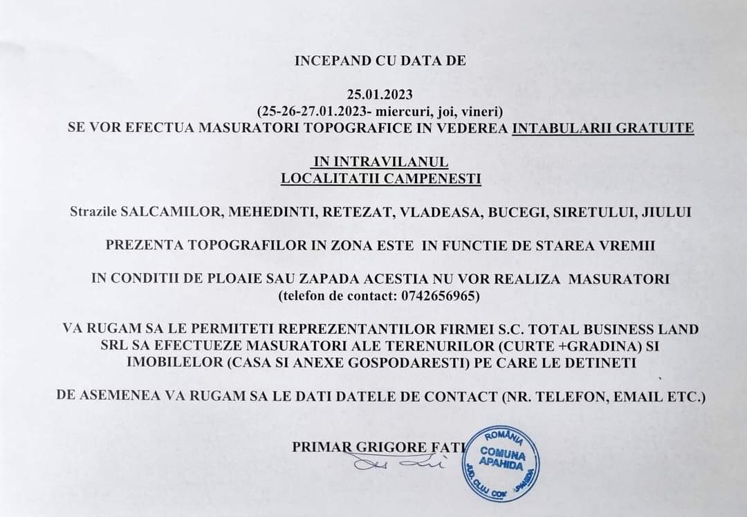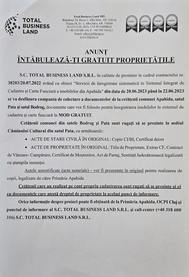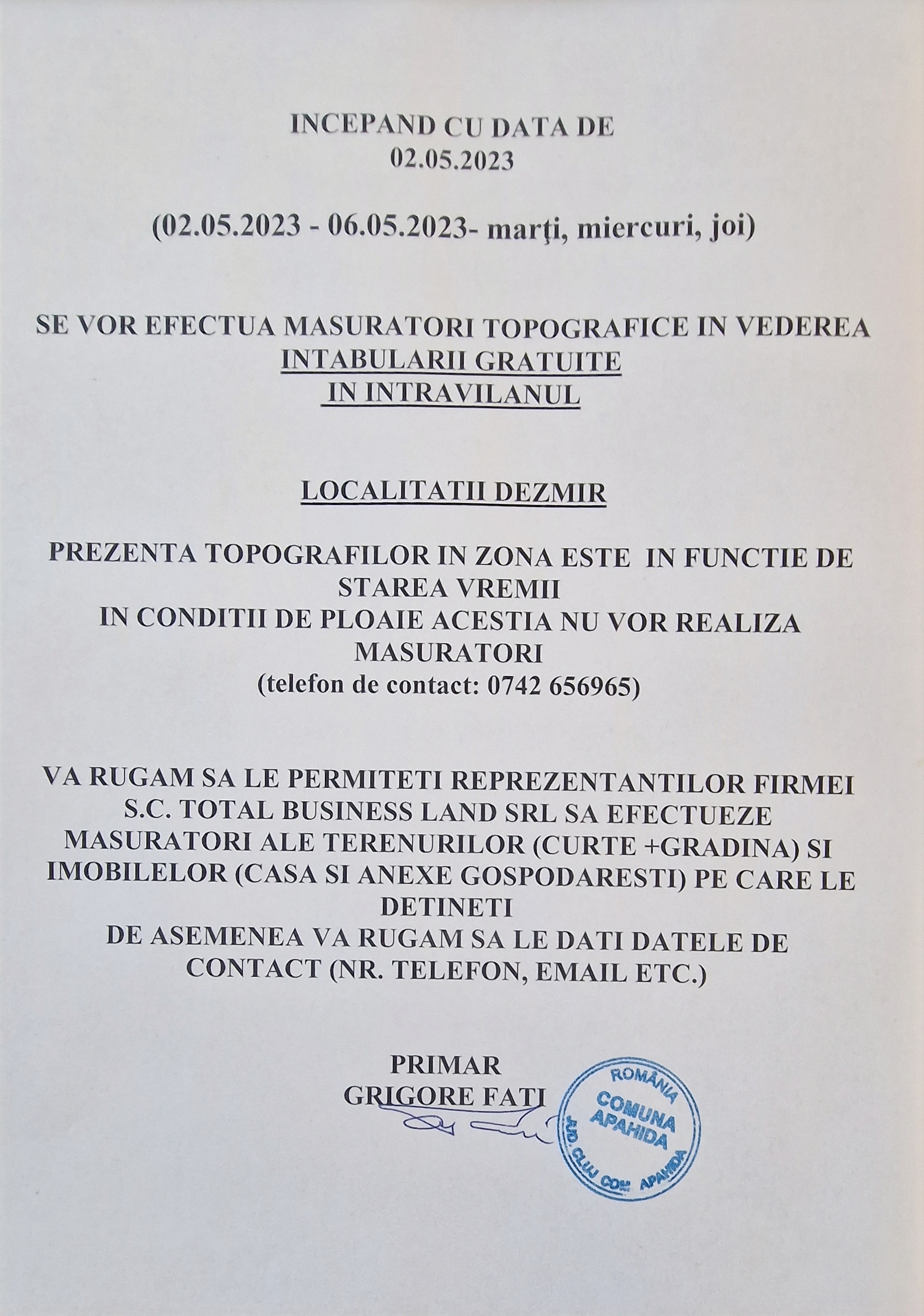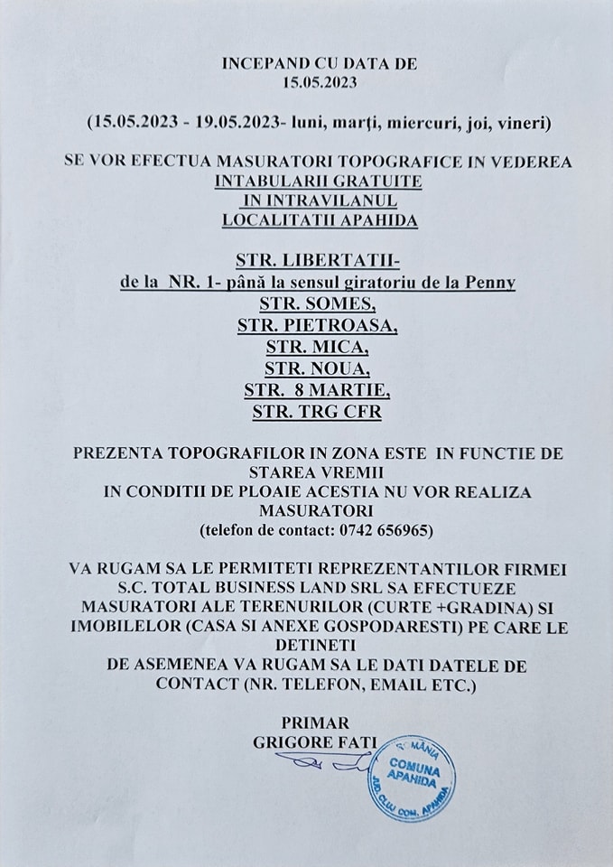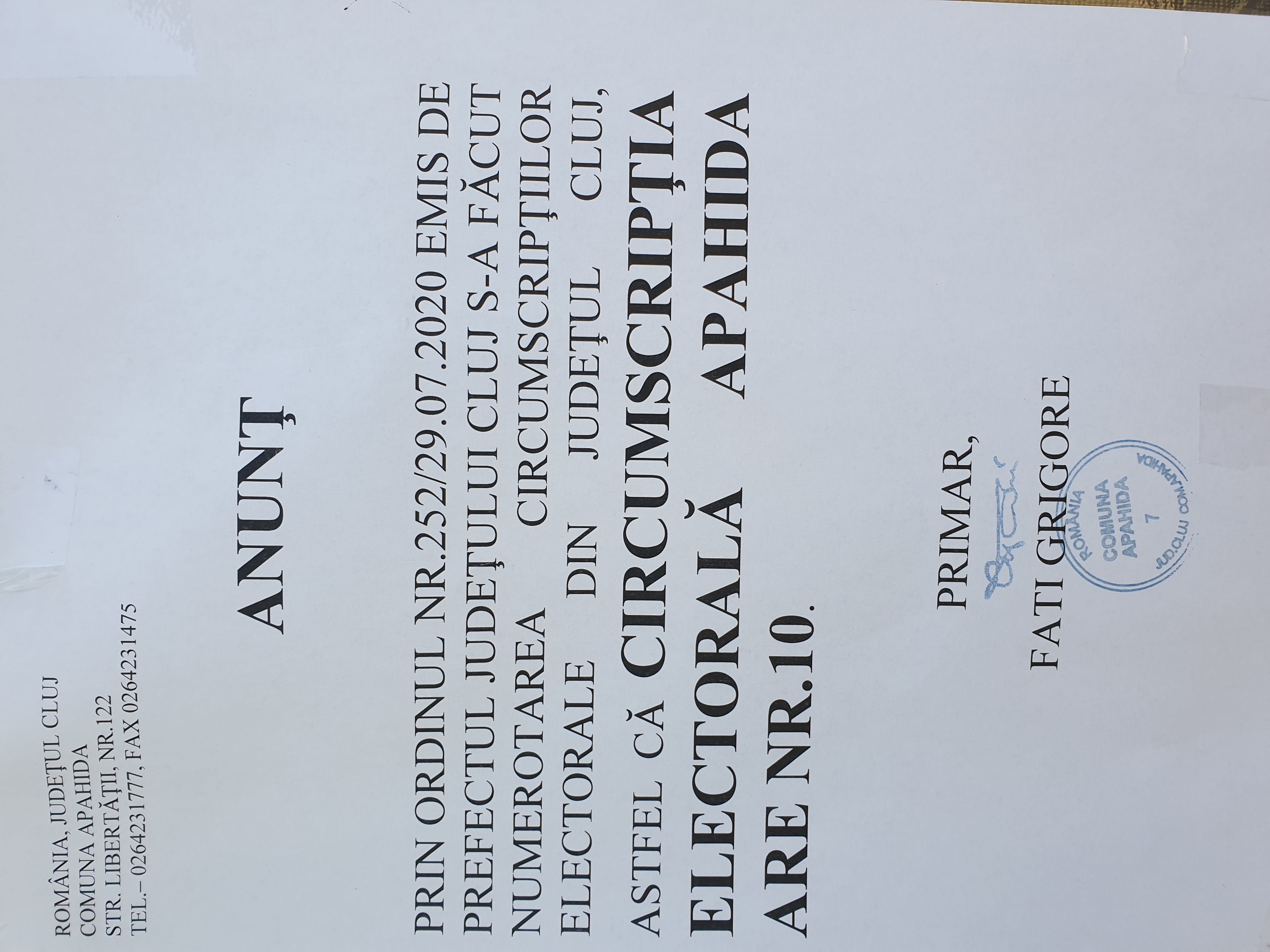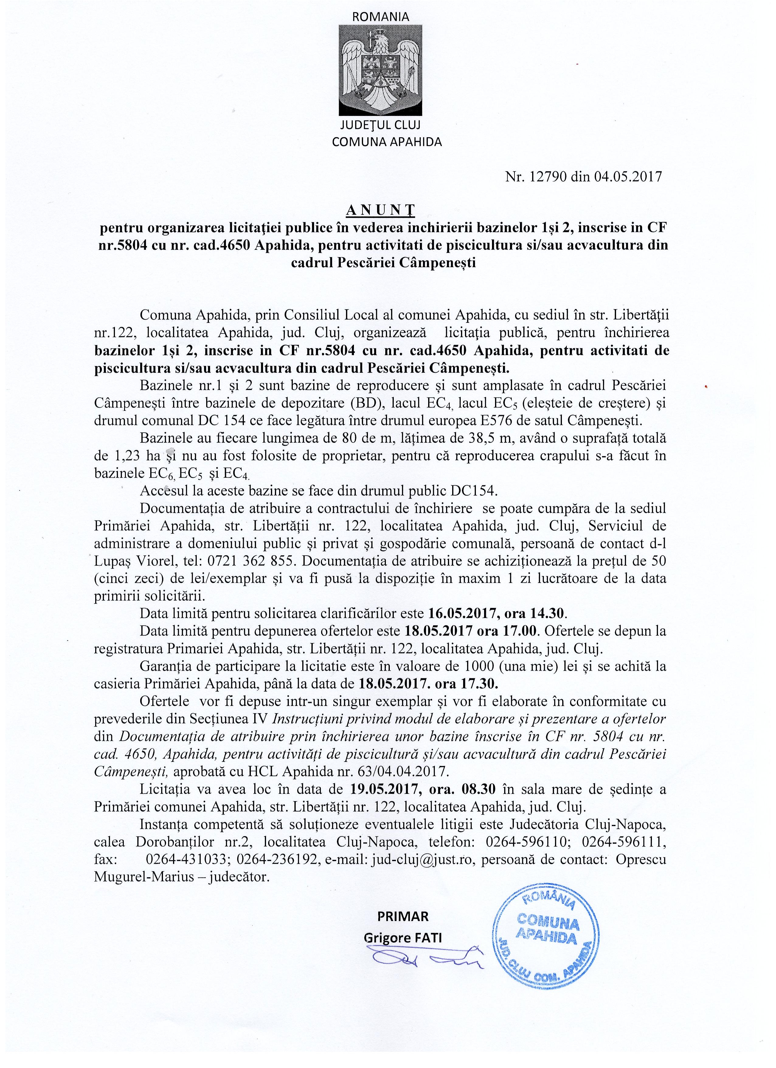 | 18.07.2016 | ANUNTPRIMARIA COMUNEI APAHIDA ANUNTA PUBLICUL INTERESAT CA ESTE IN CURS DE DESFASURARE O CONSULTARE PUBLICA PRIVIND DOCUMENTATIA "PLAN URBANISTIC GENERAL AL COMUNEI APAHIDA". DOCUMENTATIA POATE FI CONSULTATA LA SEDIUL PRIMARIEI COMUNEI APAHIDA, SERVICIUL URBANISM, DE LUNI PANA VINERI, INTRE ORELE 8.00 - 14.00 SAU PE SITE-UL COMUNEI APAHIDA EVENTUALE PROPUNERI SI OBSERVATII SE VOR PREZENTA IN SCRIS, LA SEDINTELE PUBLICE PROGRAMATE LA SEDIUL PRIMARIEI APAHIDA DUPA CUM URMEAZA: