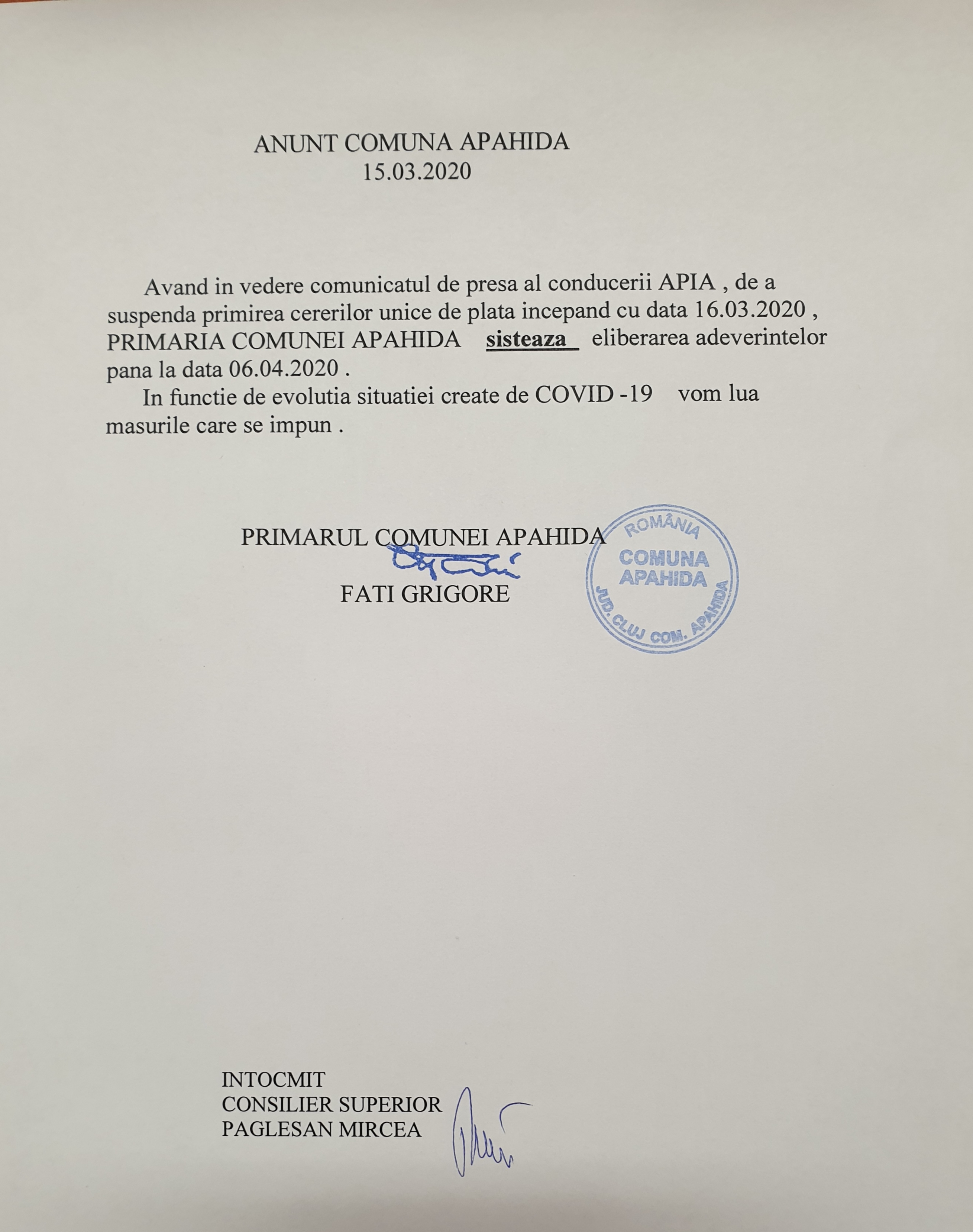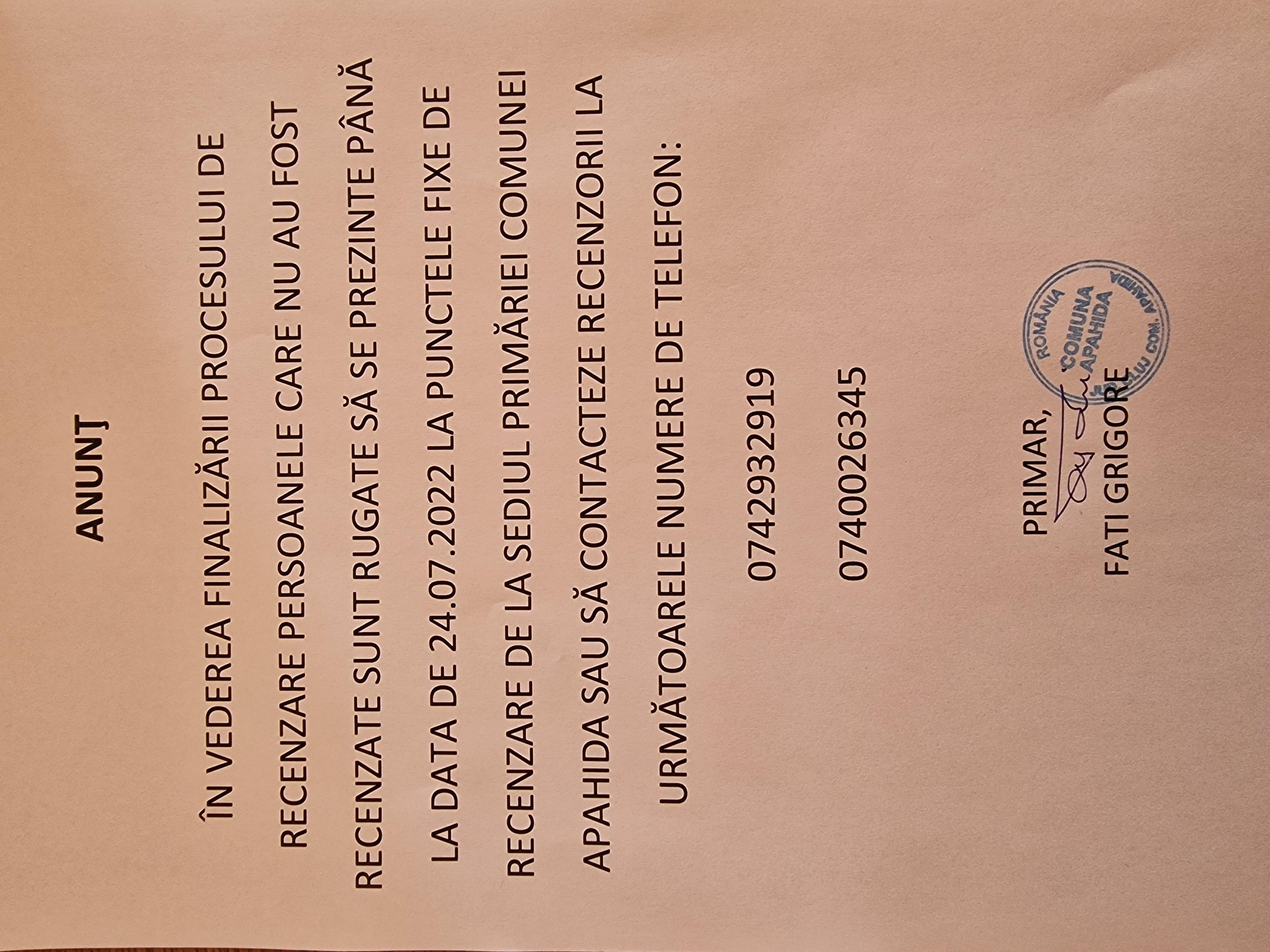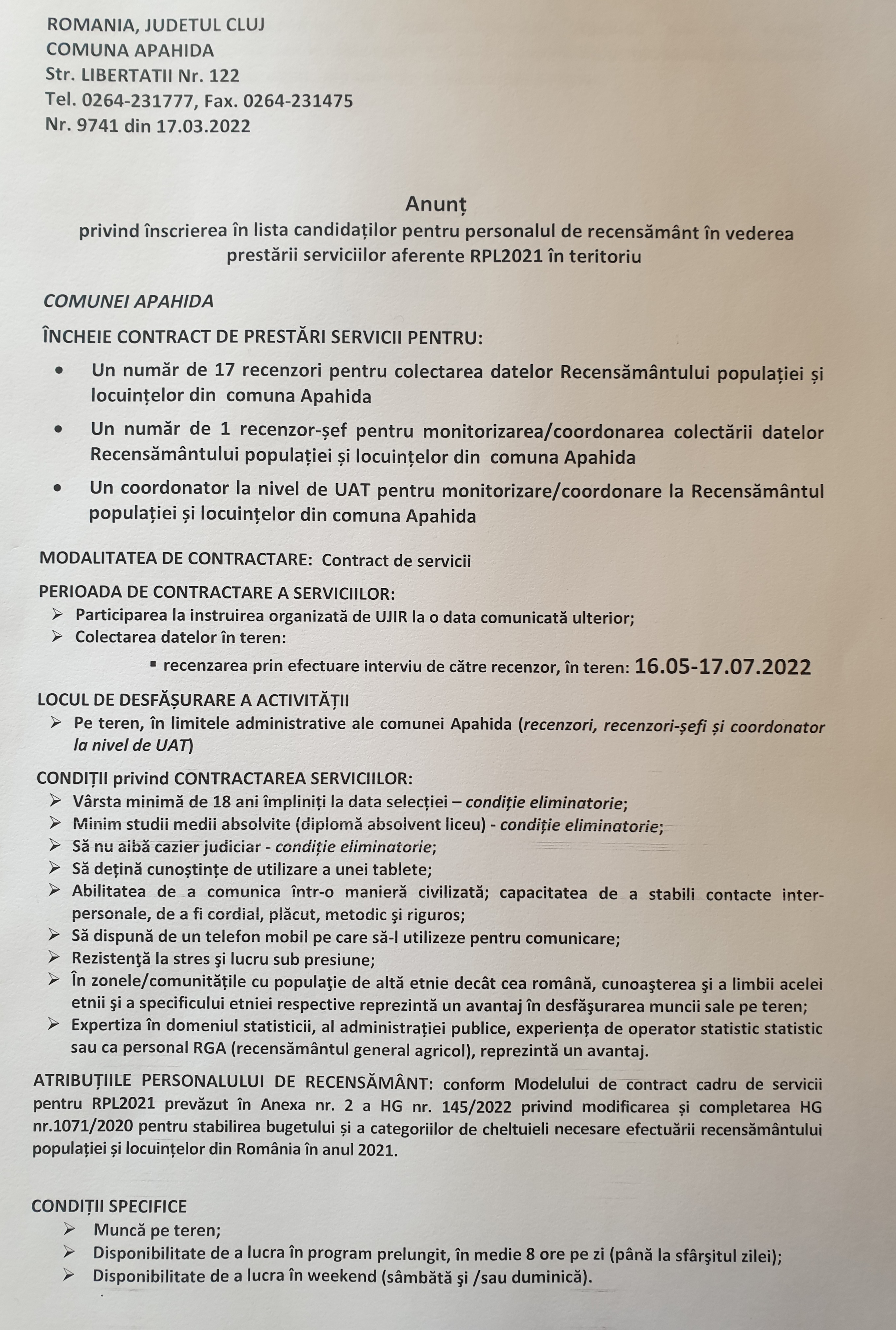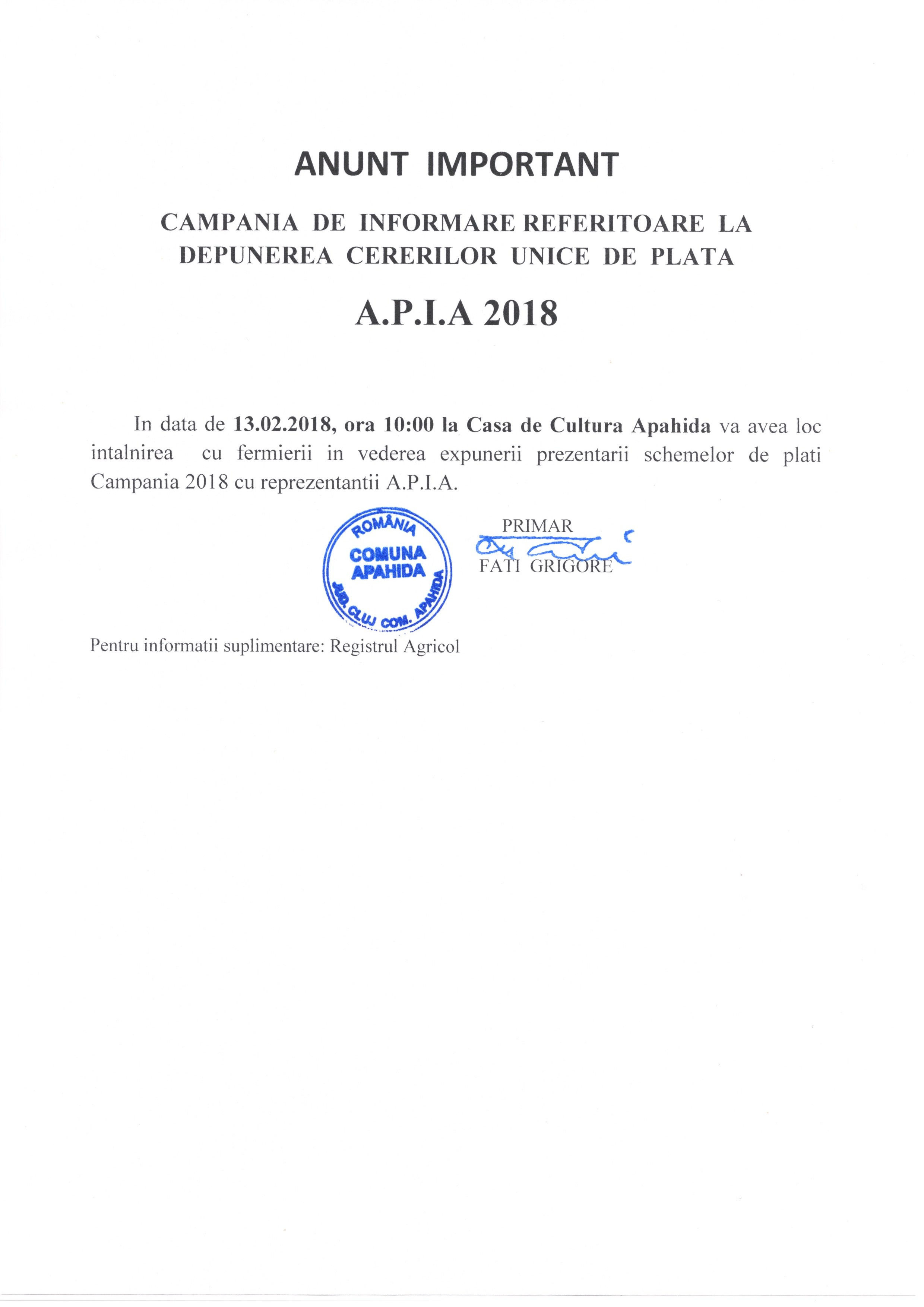 | 18.07.2016 | ANUNTPRIMARIA COMUNEI APAHIDA ANUNTA PUBLICUL INTERESAT CA ESTE IN CURS DE DESFASURARE O CONSULTARE PUBLICA PRIVIND DOCUMENTATIA "PLAN URBANISTIC GENERAL AL COMUNEI APAHIDA". DOCUMENTATIA POATE FI CONSULTATA LA SEDIUL PRIMARIEI COMUNEI APAHIDA, SERVICIUL URBANISM, DE LUNI PANA VINERI, INTRE ORELE 8.00 - 14.00 SAU PE SITE-UL COMUNEI APAHIDA EVENTUALE PROPUNERI SI OBSERVATII SE VOR PREZENTA IN SCRIS, LA SEDINTELE PUBLICE PROGRAMATE LA SEDIUL PRIMARIEI APAHIDA DUPA CUM URMEAZA: