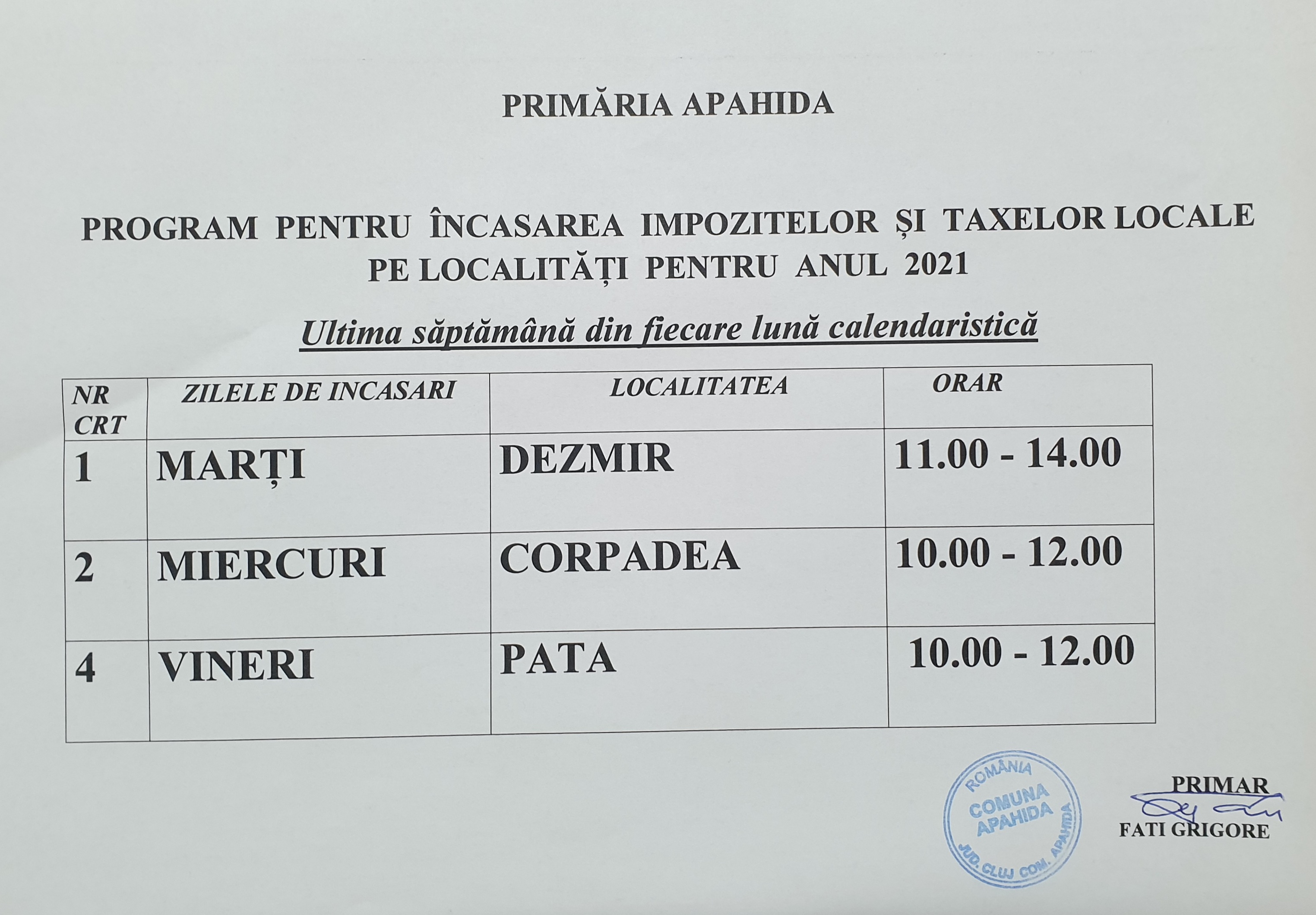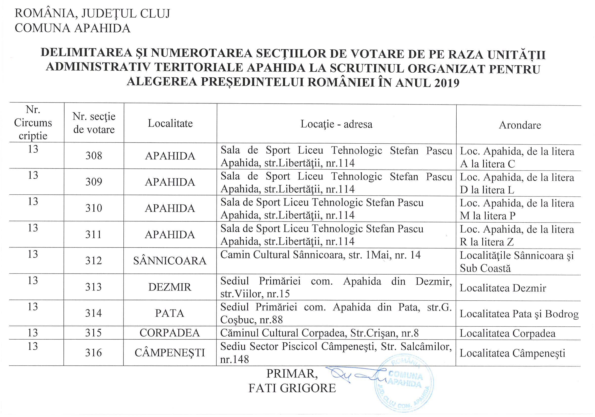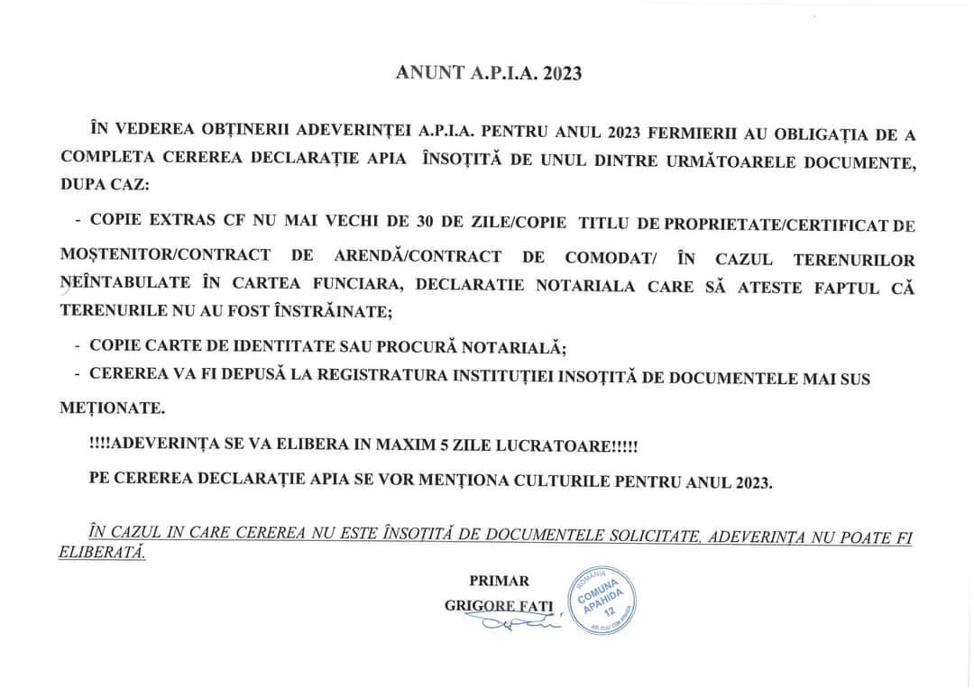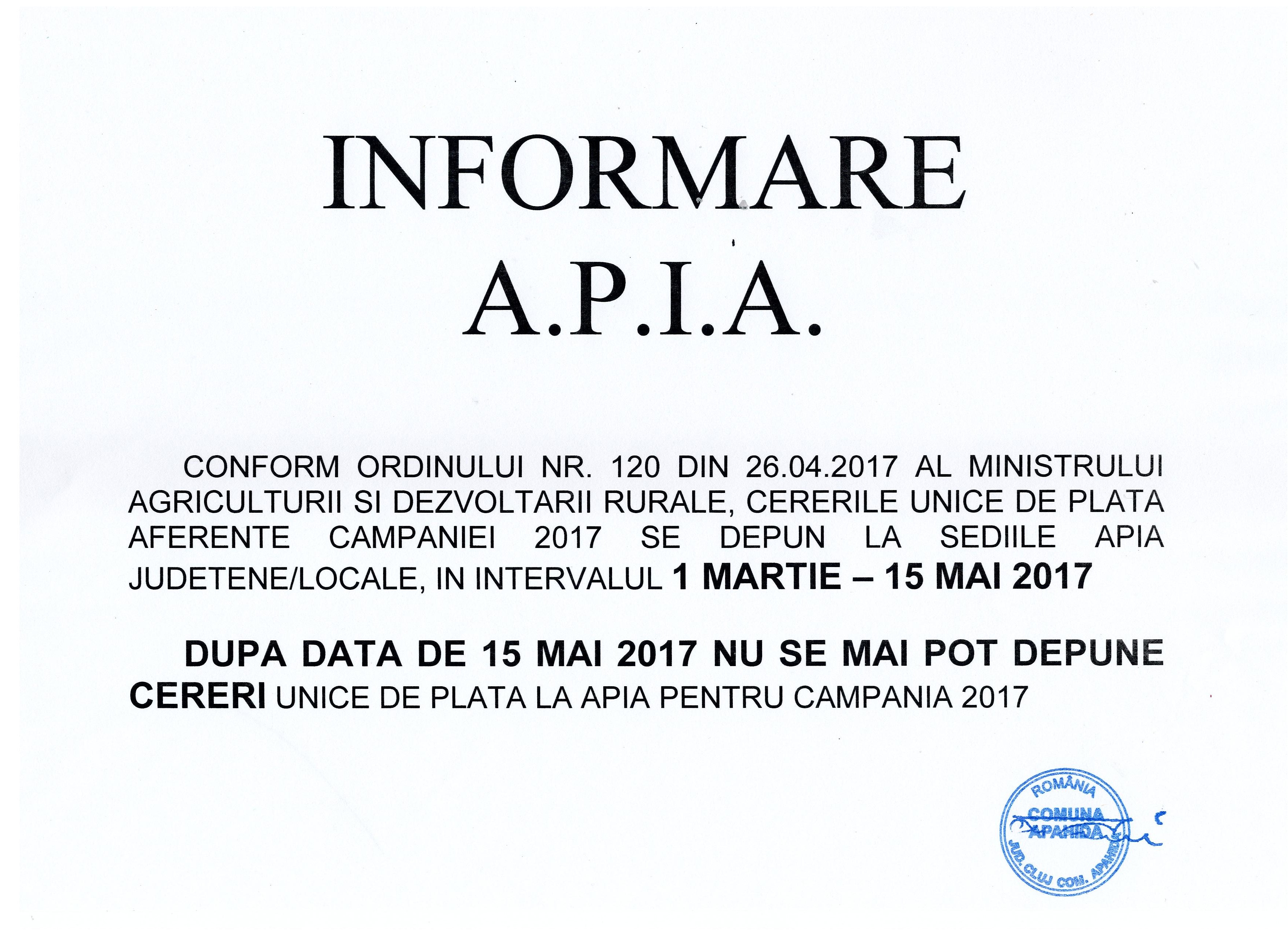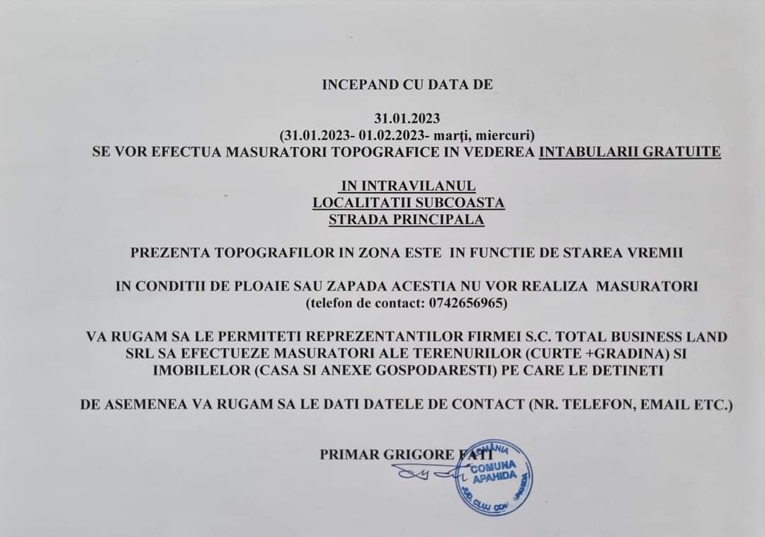 | 18.07.2016 | ANUNTPRIMARIA COMUNEI APAHIDA ANUNTA PUBLICUL INTERESAT CA ESTE IN CURS DE DESFASURARE O CONSULTARE PUBLICA PRIVIND DOCUMENTATIA "PLAN URBANISTIC GENERAL AL COMUNEI APAHIDA". DOCUMENTATIA POATE FI CONSULTATA LA SEDIUL PRIMARIEI COMUNEI APAHIDA, SERVICIUL URBANISM, DE LUNI PANA VINERI, INTRE ORELE 8.00 - 14.00 SAU PE SITE-UL COMUNEI APAHIDA EVENTUALE PROPUNERI SI OBSERVATII SE VOR PREZENTA IN SCRIS, LA SEDINTELE PUBLICE PROGRAMATE LA SEDIUL PRIMARIEI APAHIDA DUPA CUM URMEAZA: