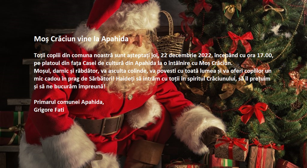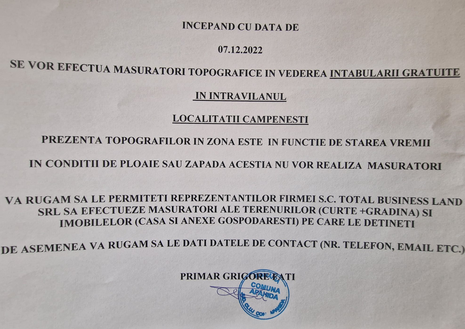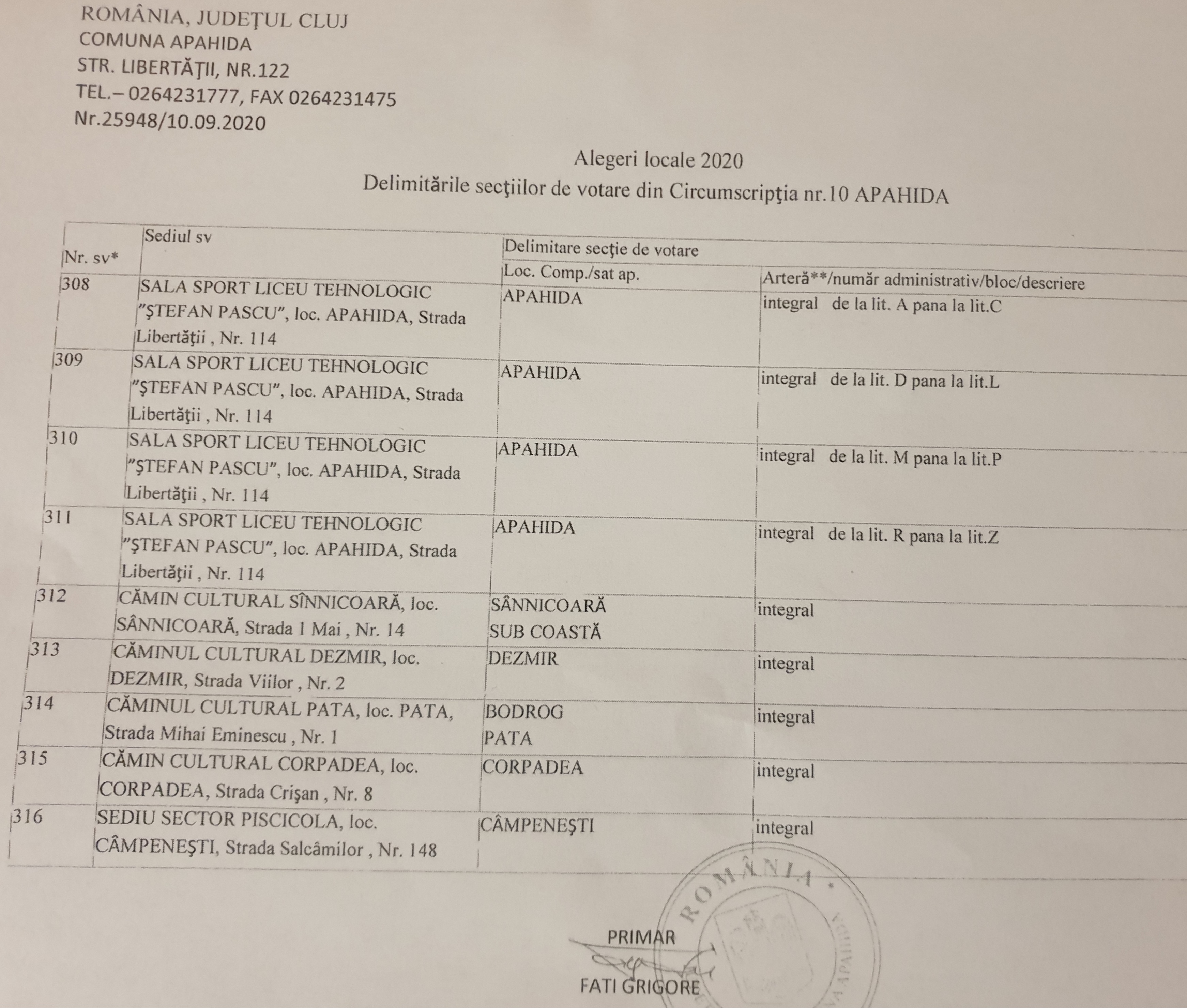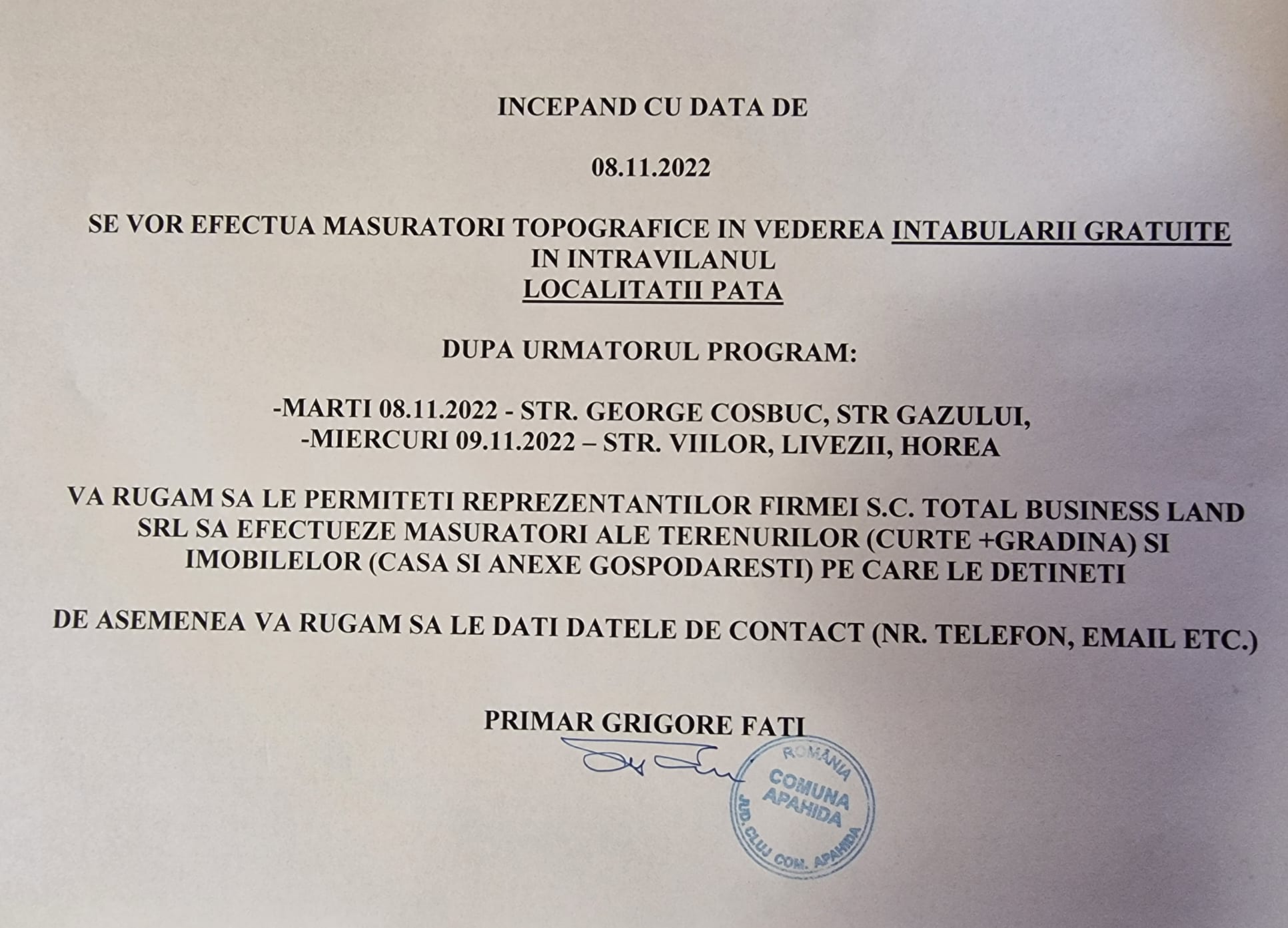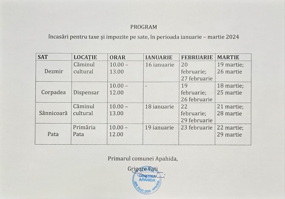 | 18.07.2016 | ANUNTPRIMARIA COMUNEI APAHIDA ANUNTA PUBLICUL INTERESAT CA ESTE IN CURS DE DESFASURARE O CONSULTARE PUBLICA PRIVIND DOCUMENTATIA "PLAN URBANISTIC GENERAL AL COMUNEI APAHIDA". DOCUMENTATIA POATE FI CONSULTATA LA SEDIUL PRIMARIEI COMUNEI APAHIDA, SERVICIUL URBANISM, DE LUNI PANA VINERI, INTRE ORELE 8.00 - 14.00 SAU PE SITE-UL COMUNEI APAHIDA EVENTUALE PROPUNERI SI OBSERVATII SE VOR PREZENTA IN SCRIS, LA SEDINTELE PUBLICE PROGRAMATE LA SEDIUL PRIMARIEI APAHIDA DUPA CUM URMEAZA: