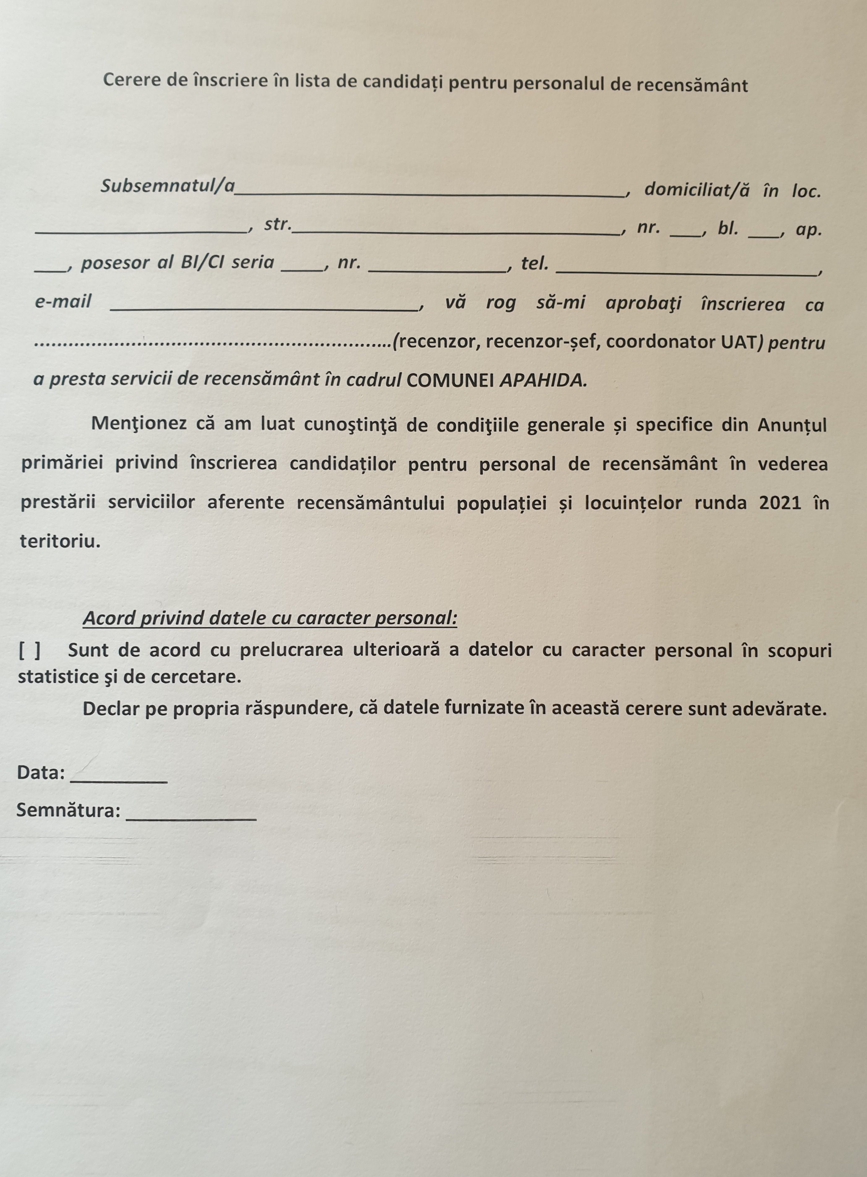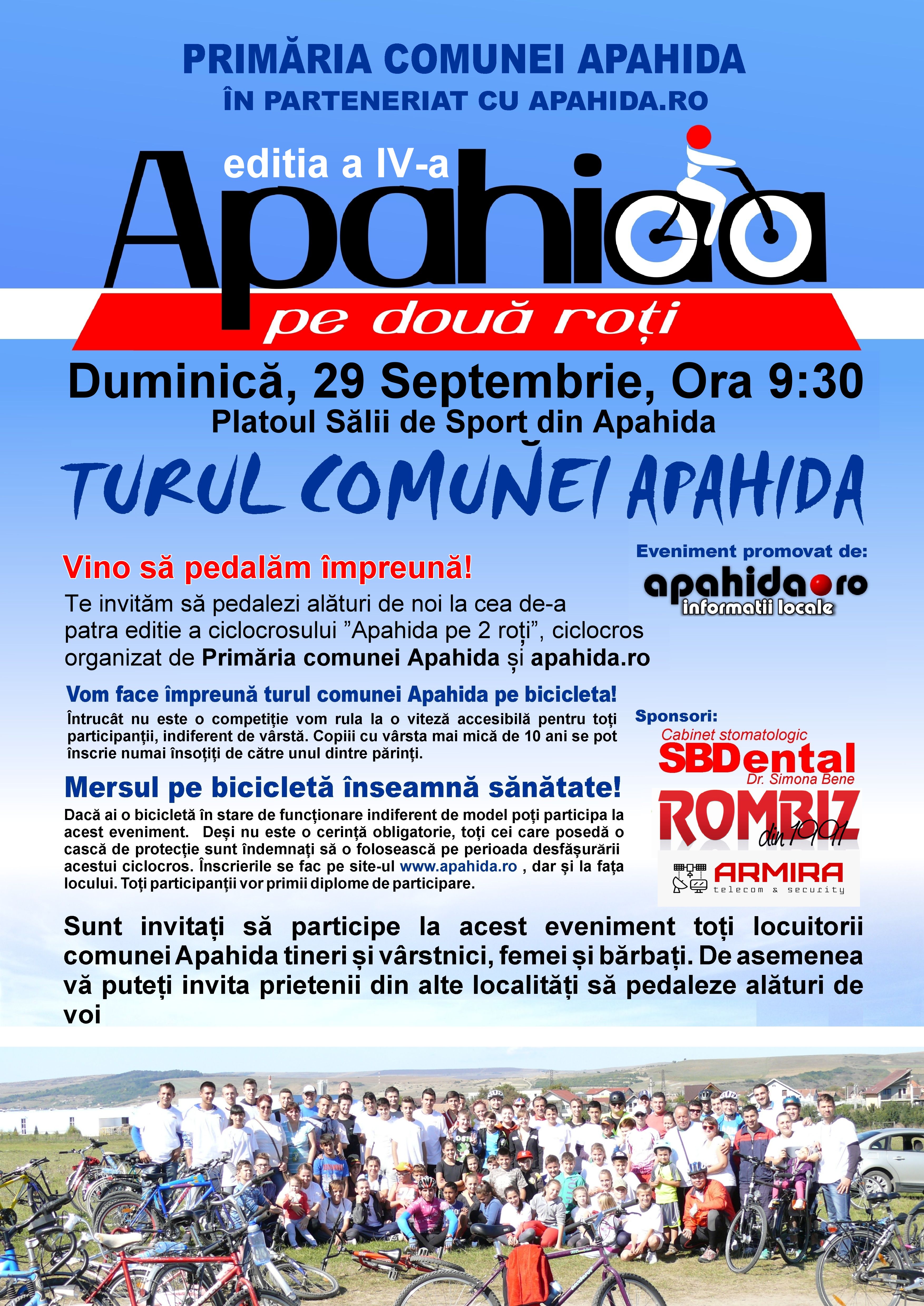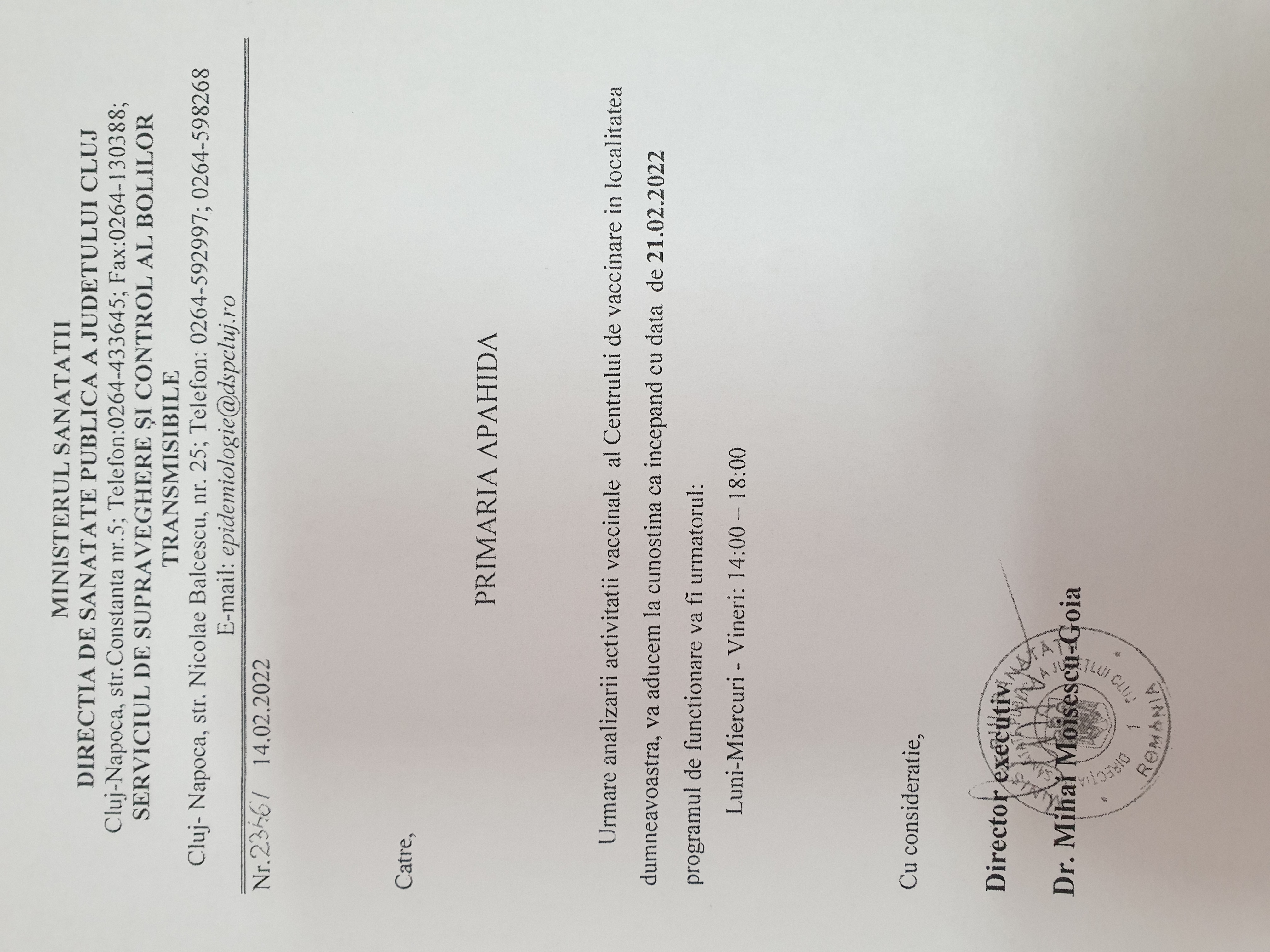 | 22.09.2015 | STATIA MOBILA PENTRU ELIBERAREA CARTILOR DE IDENTITATE - APAHIDA 30 SEPTEMBRIE 2015, DE LA ORA 9:00, LA PRIMARIA COMUNEI APAHIDA , STR LIBERTATII NR. 122. Procedura si documente necesare (vezi link) |