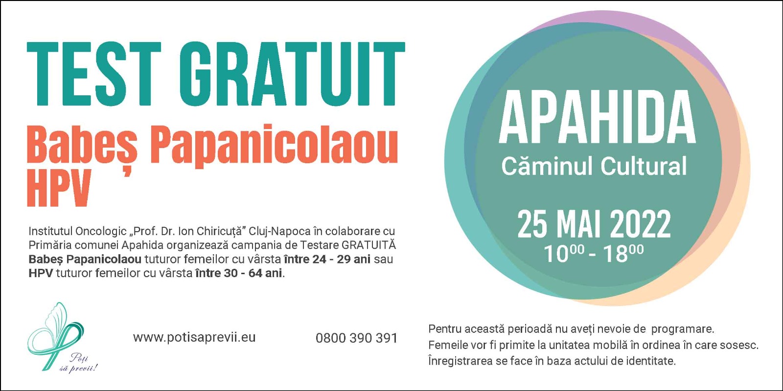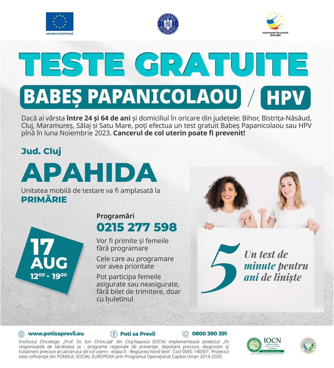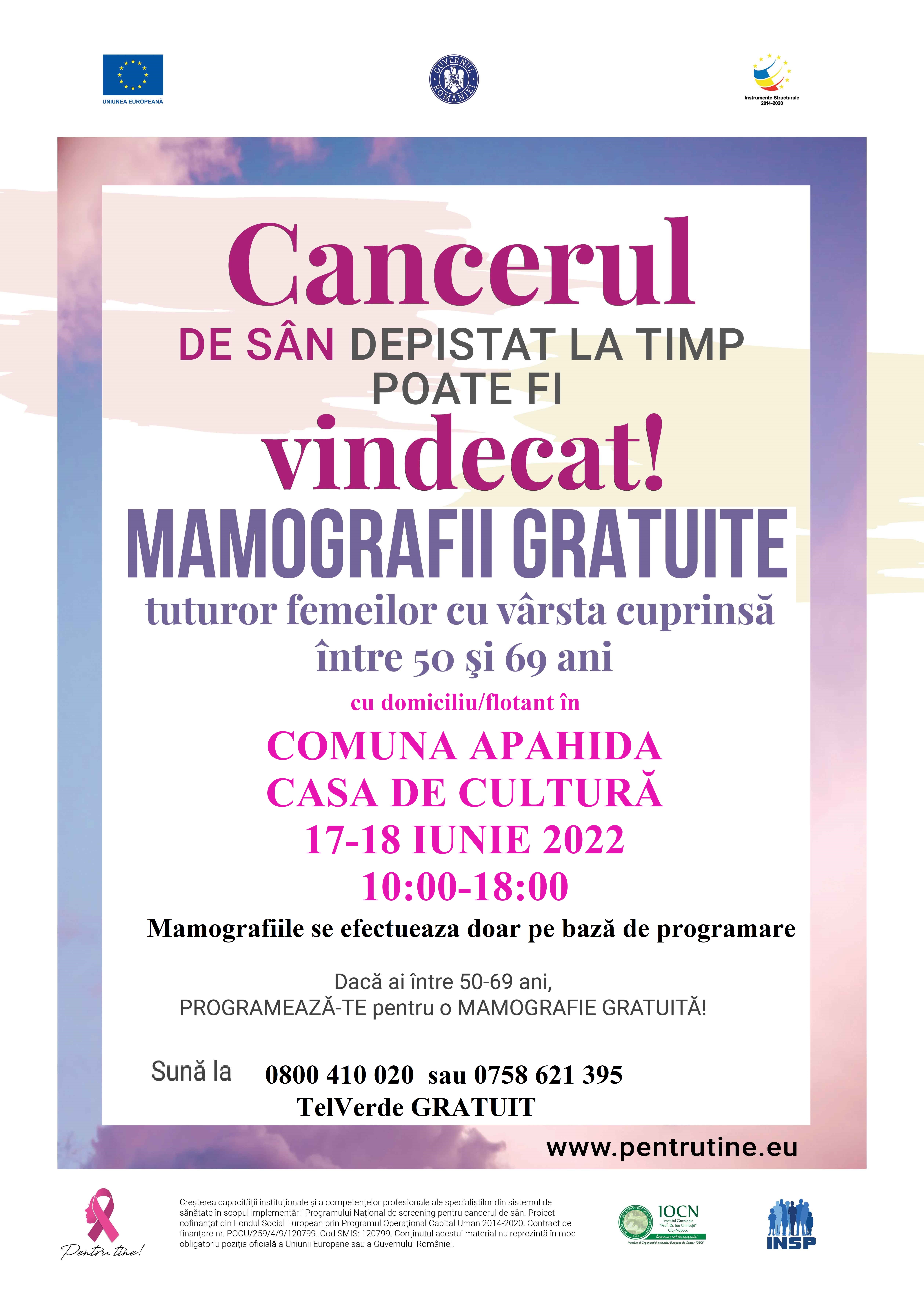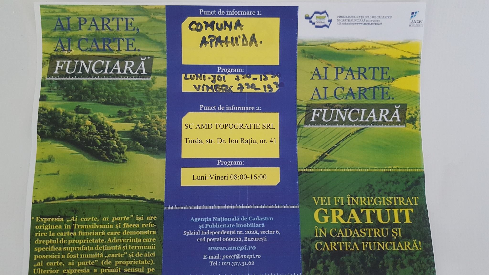 | 22.09.2015 | STATIA MOBILA PENTRU ELIBERAREA CARTILOR DE IDENTITATE - APAHIDA 30 SEPTEMBRIE 2015, DE LA ORA 9:00, LA PRIMARIA COMUNEI APAHIDA , STR LIBERTATII NR. 122. Procedura si documente necesare (vezi link) |