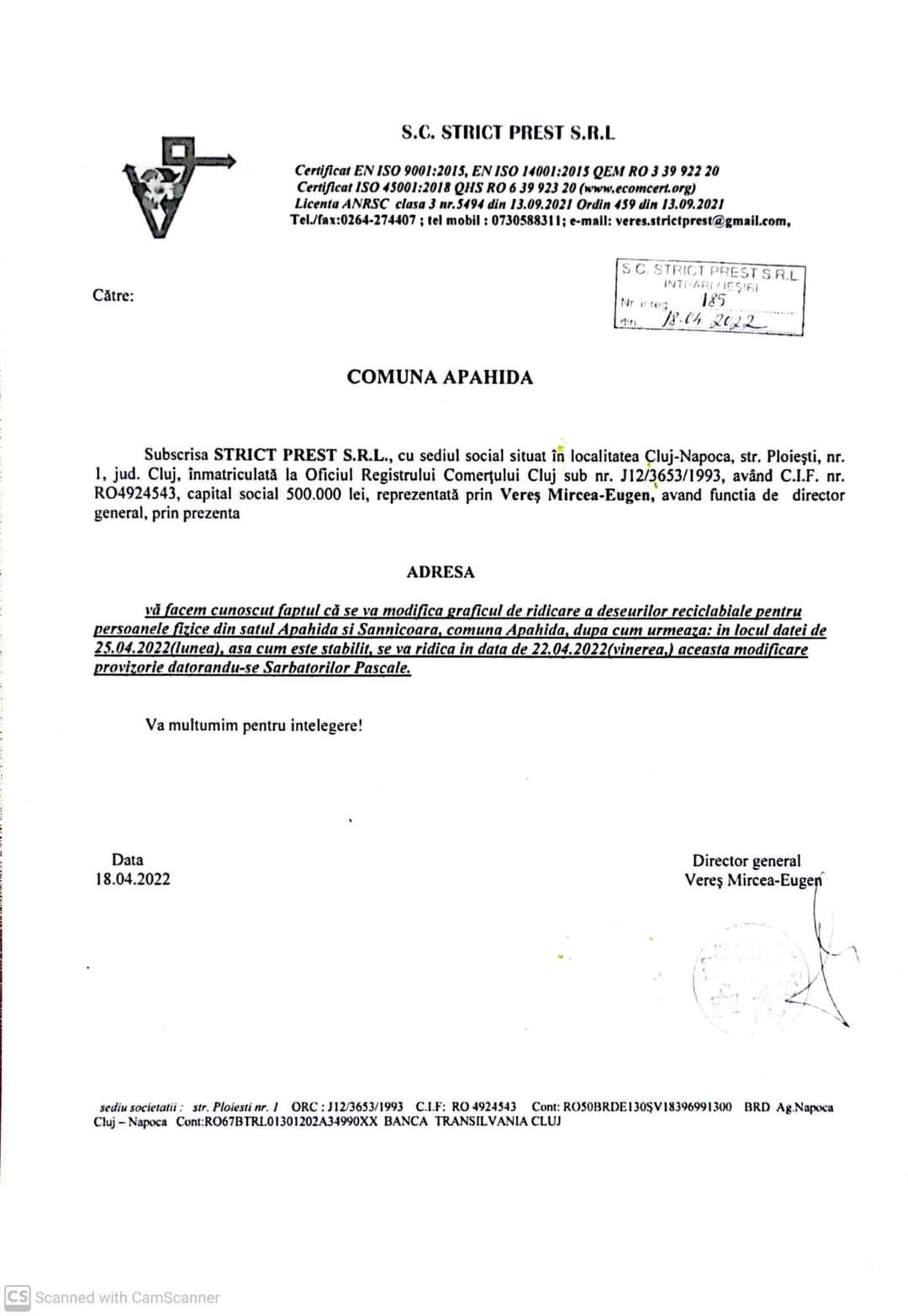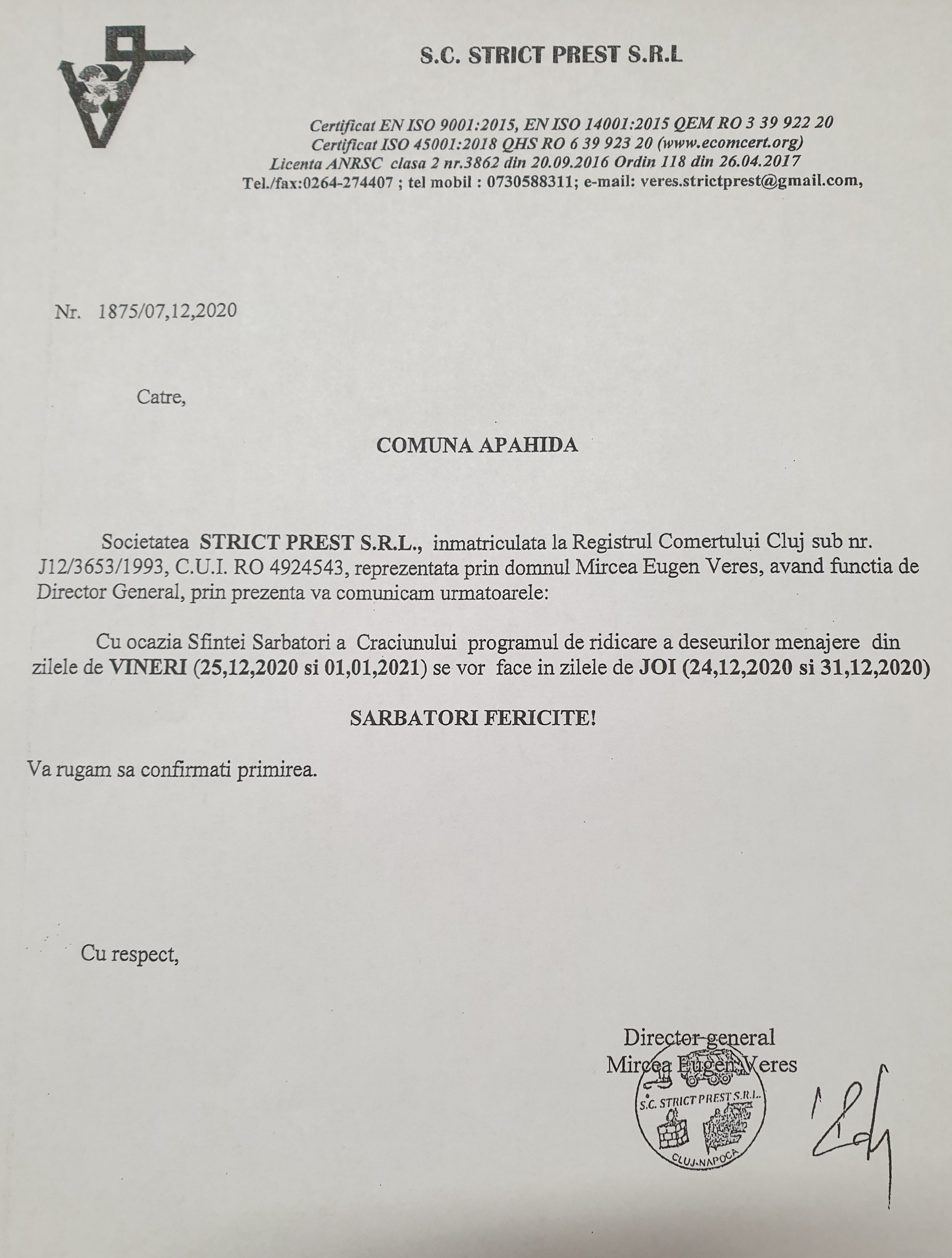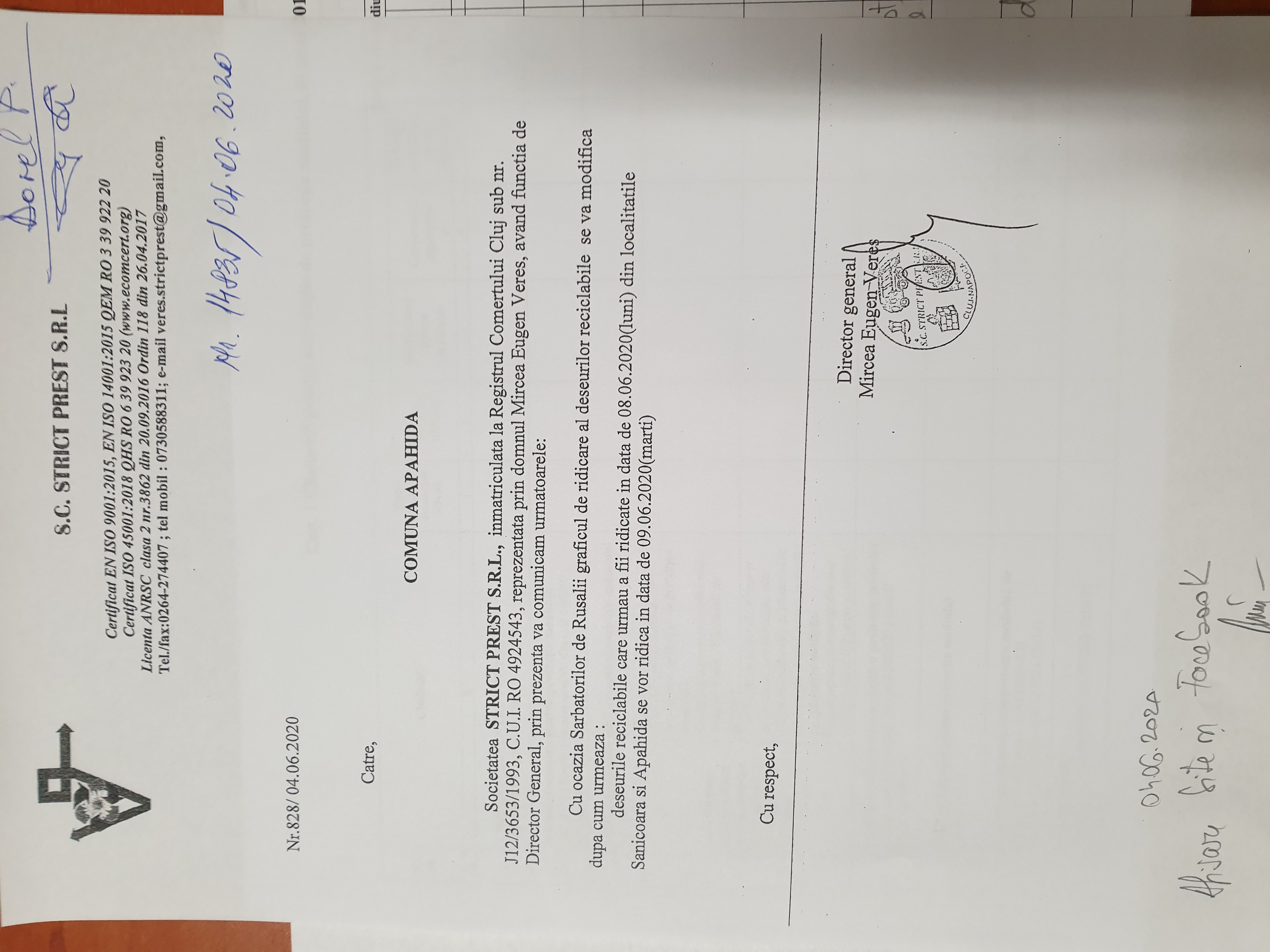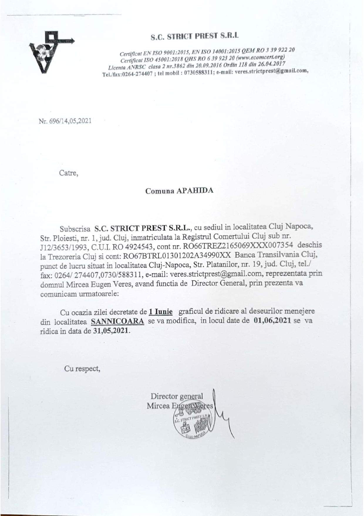 | 14.04.2016 | Incepand cu data de 12.04.2016, S.C. STRICTPREST S.R.L. intocmeste contracte de ridicare a deseului menajer pe raza Comunei Apahida, in urmatoarele locatii :