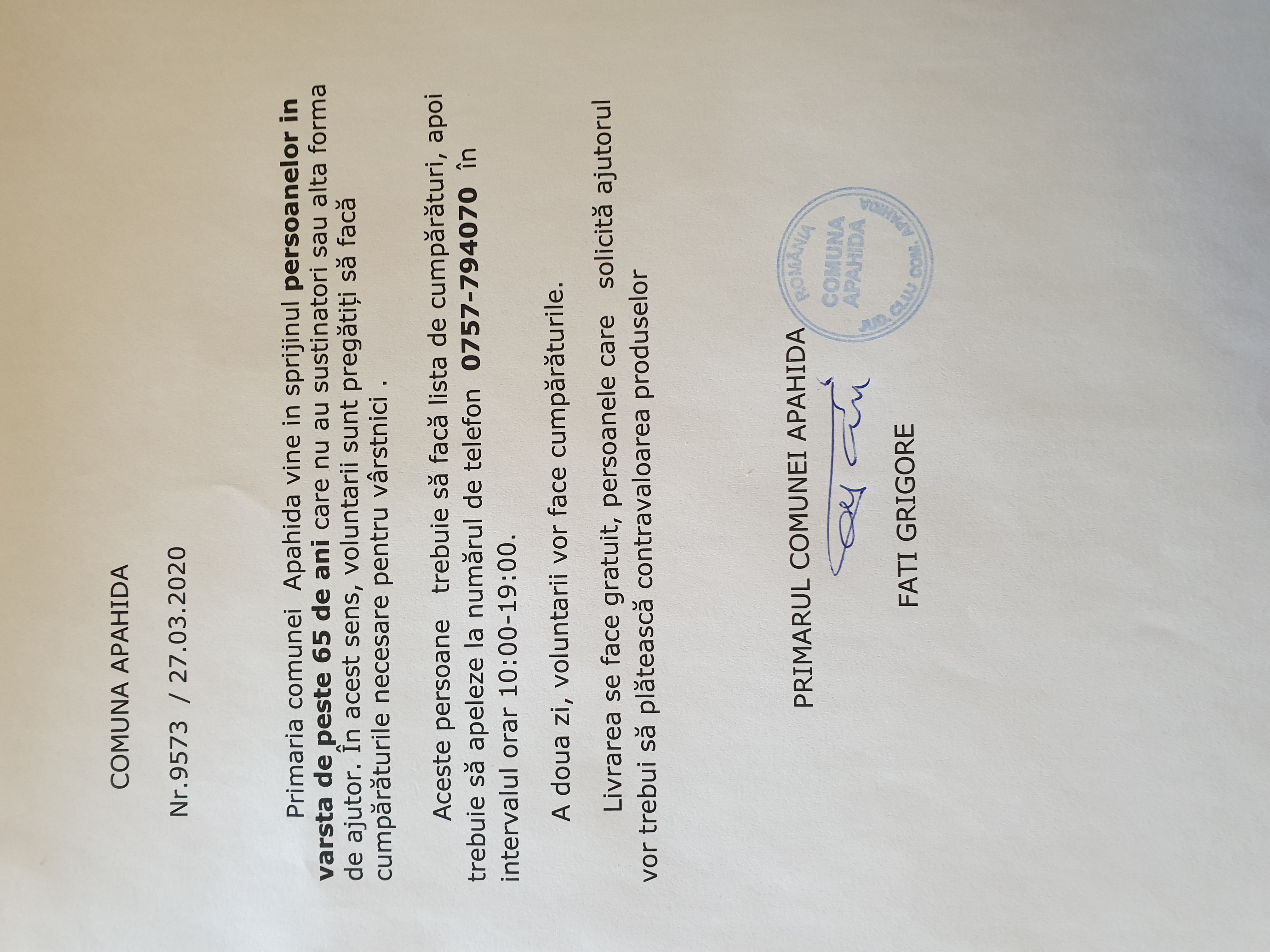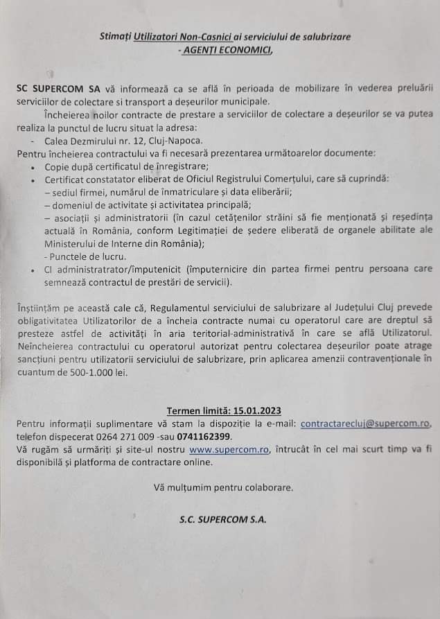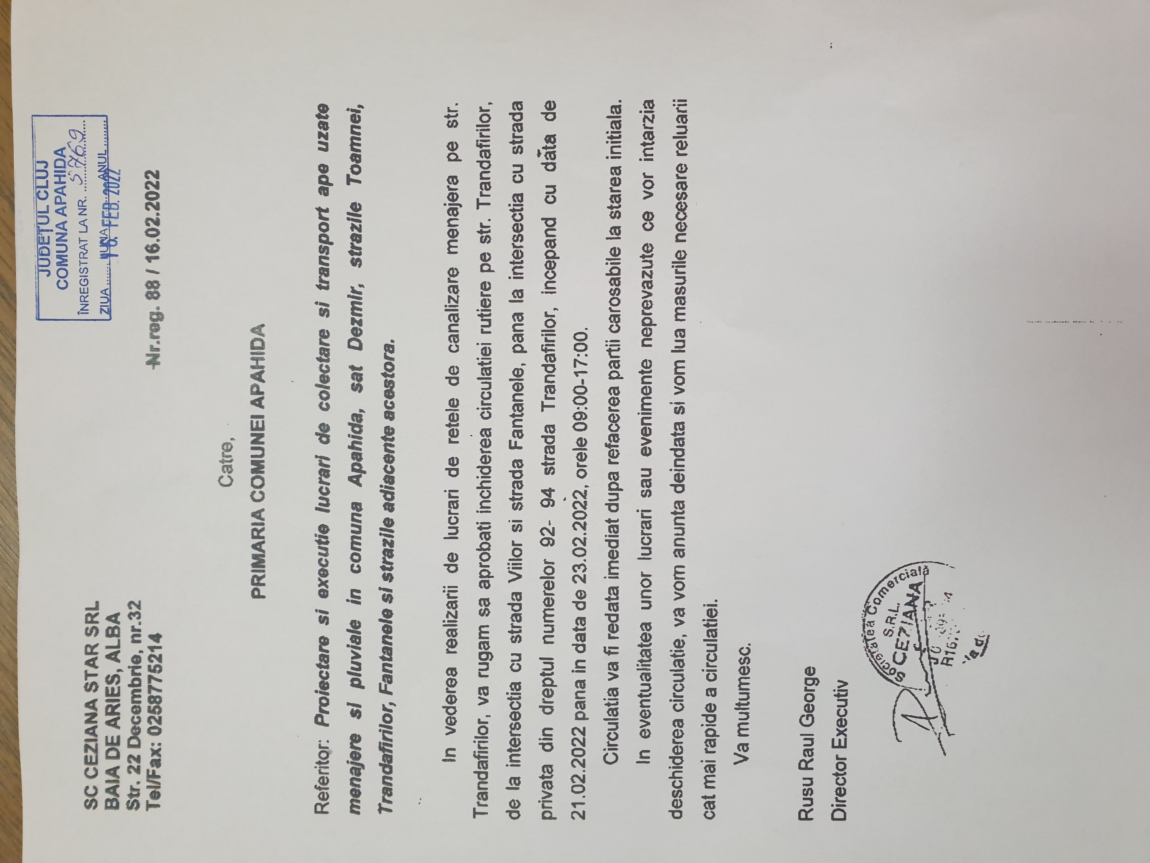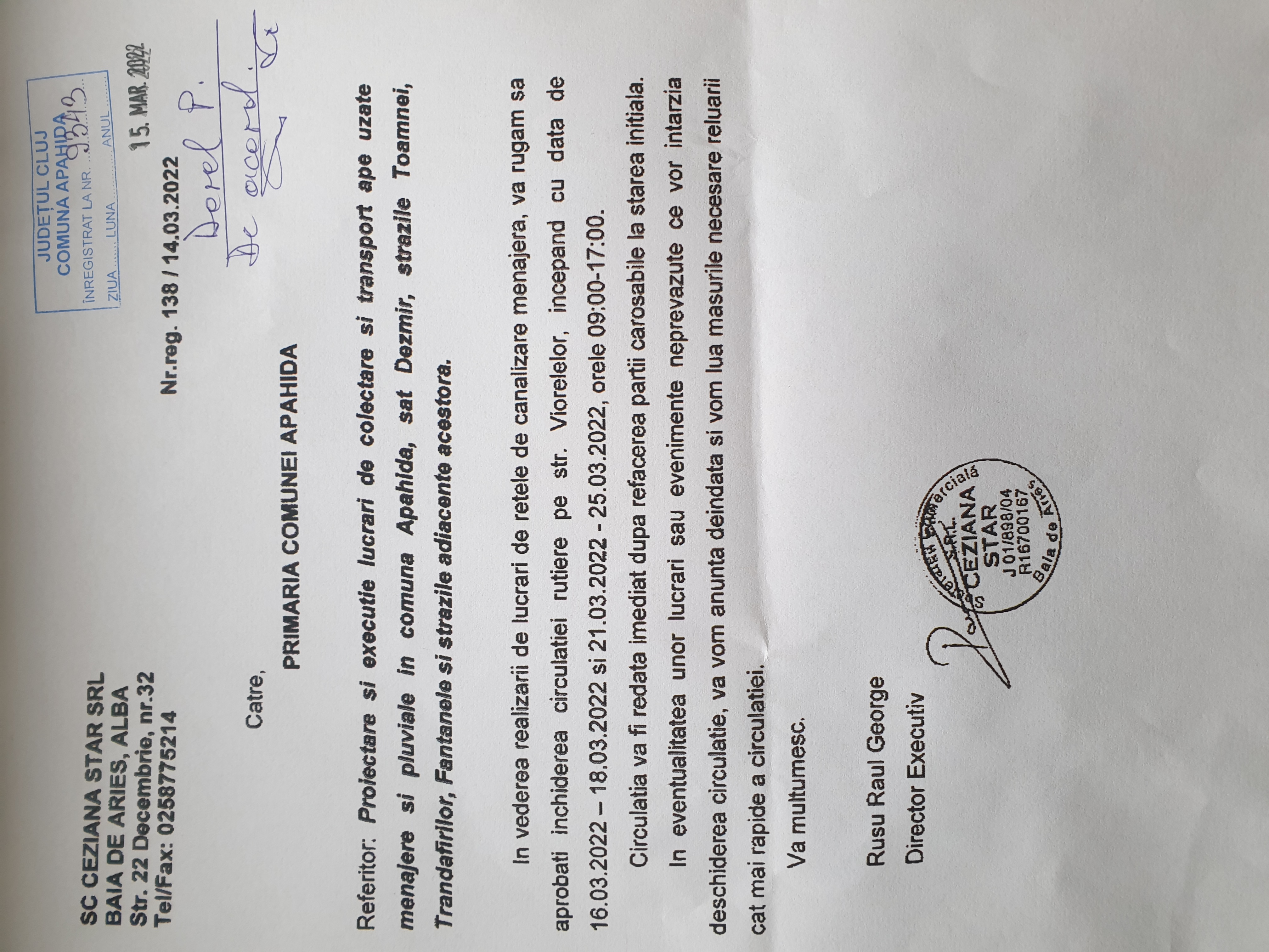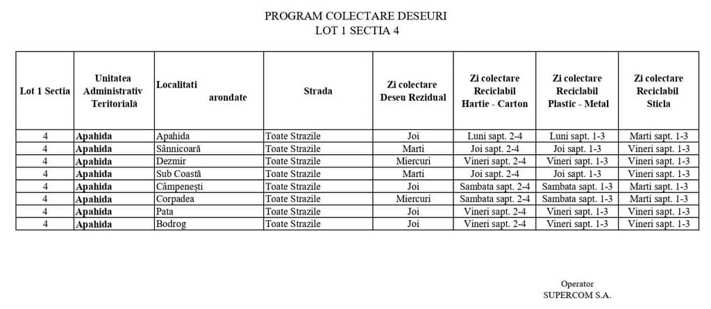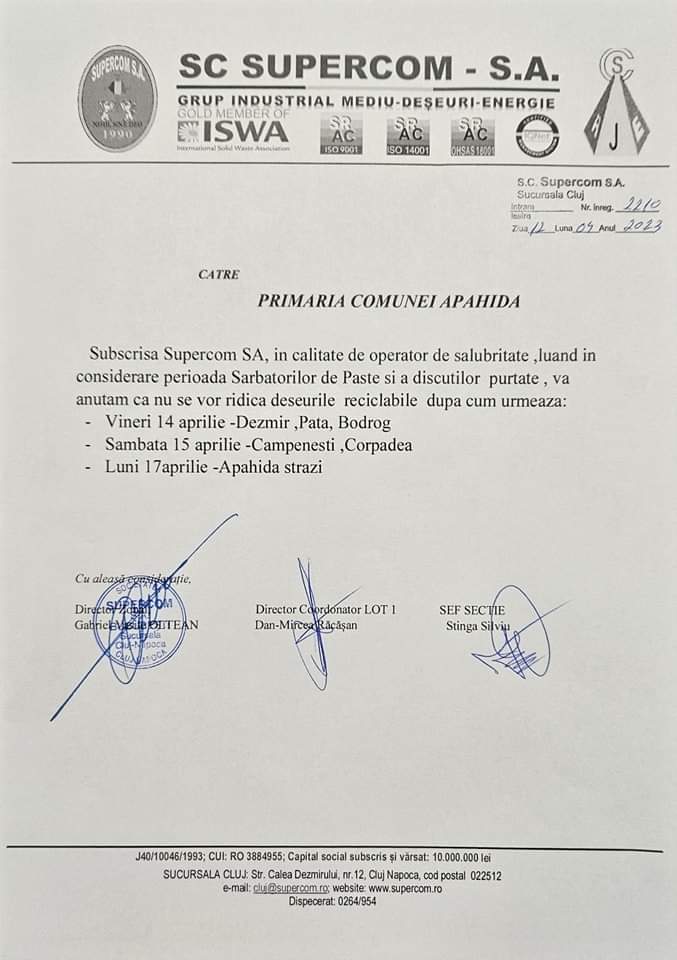 | 14.04.2016 | Incepand cu data de 12.04.2016, S.C. STRICTPREST S.R.L. intocmeste contracte de ridicare a deseului menajer pe raza Comunei Apahida, in urmatoarele locatii :