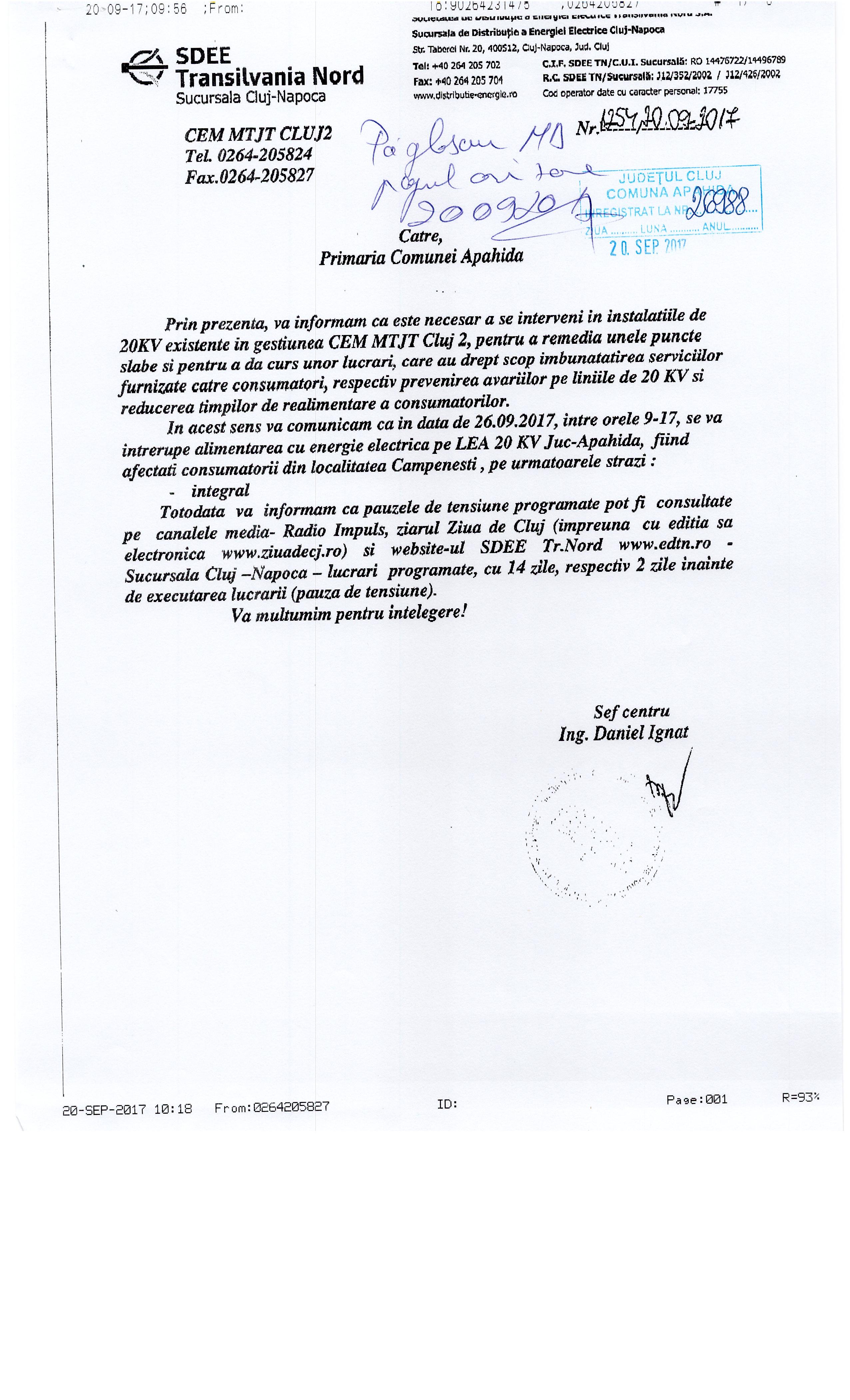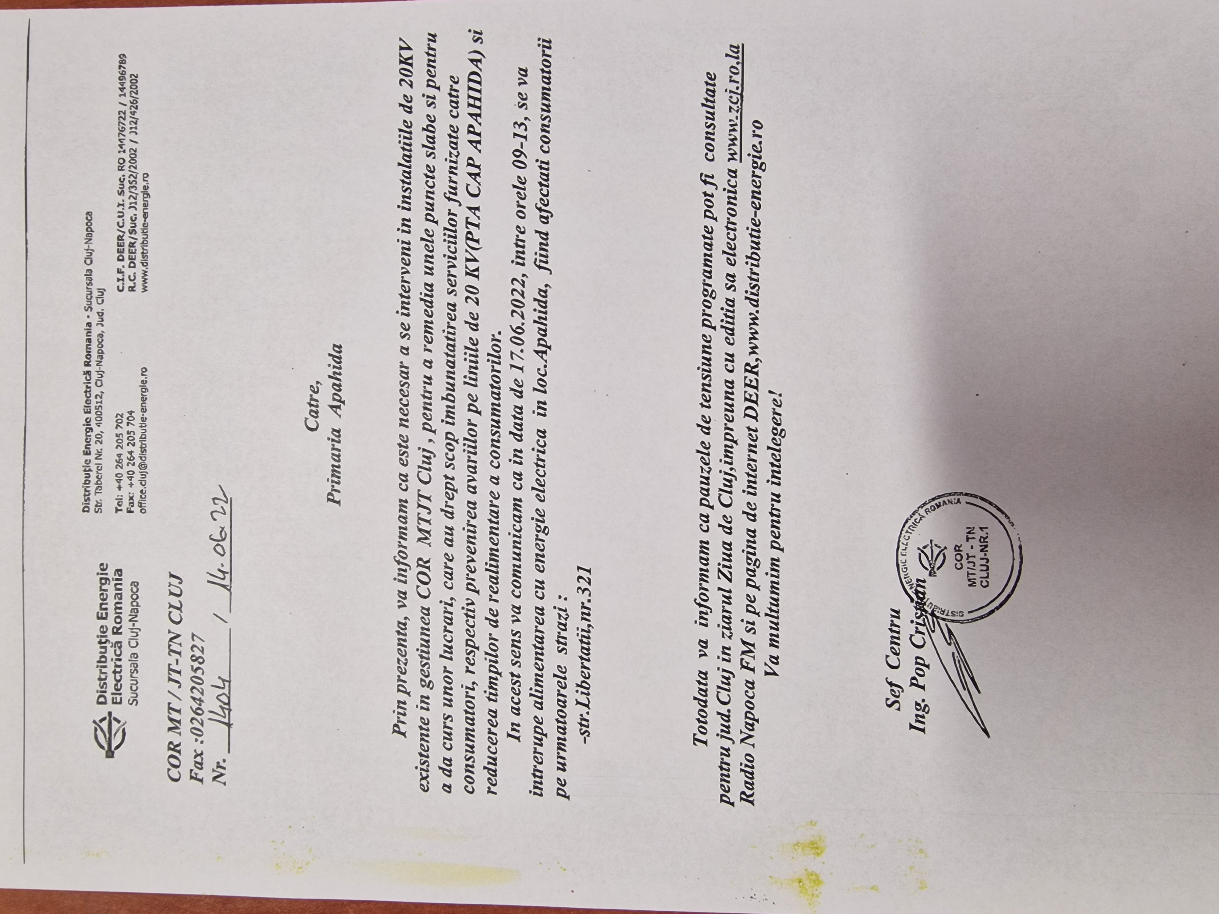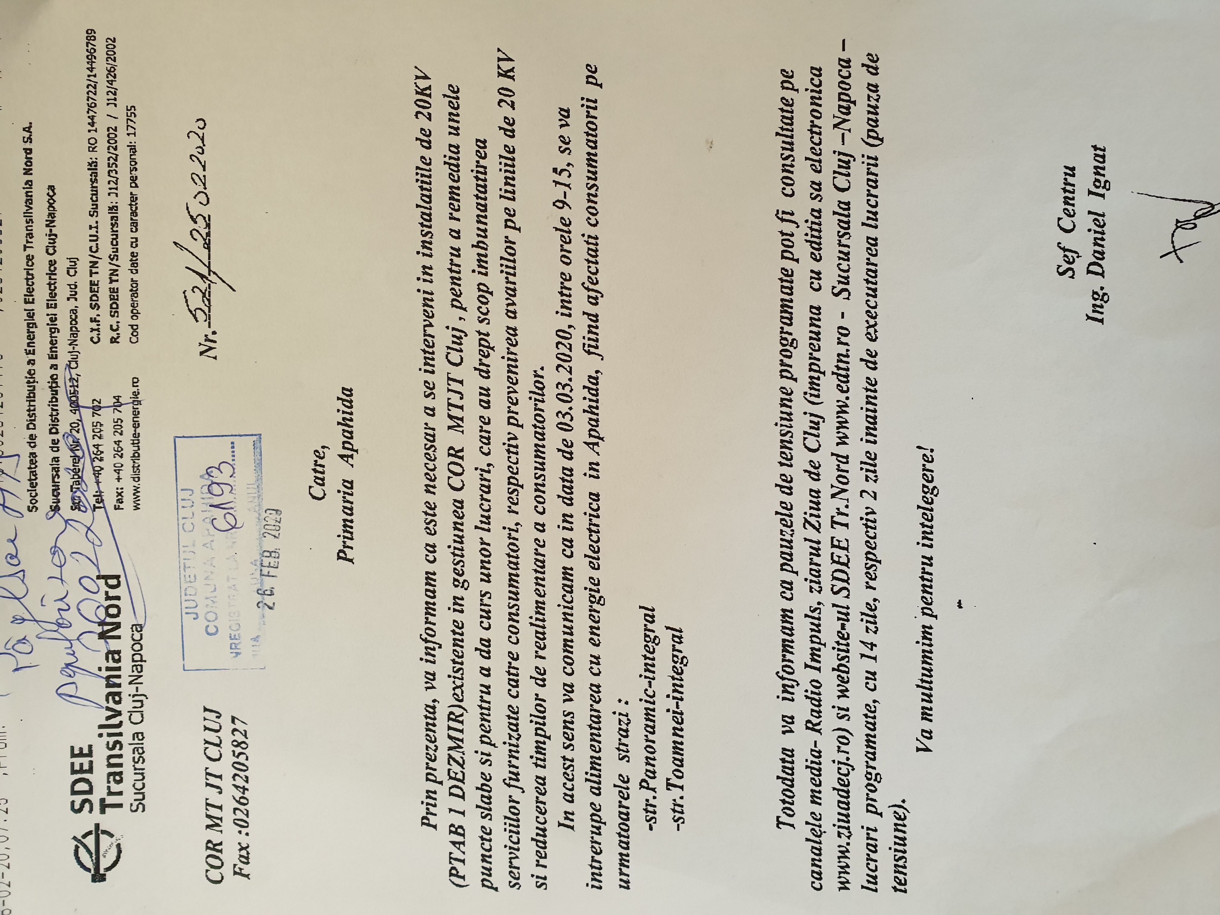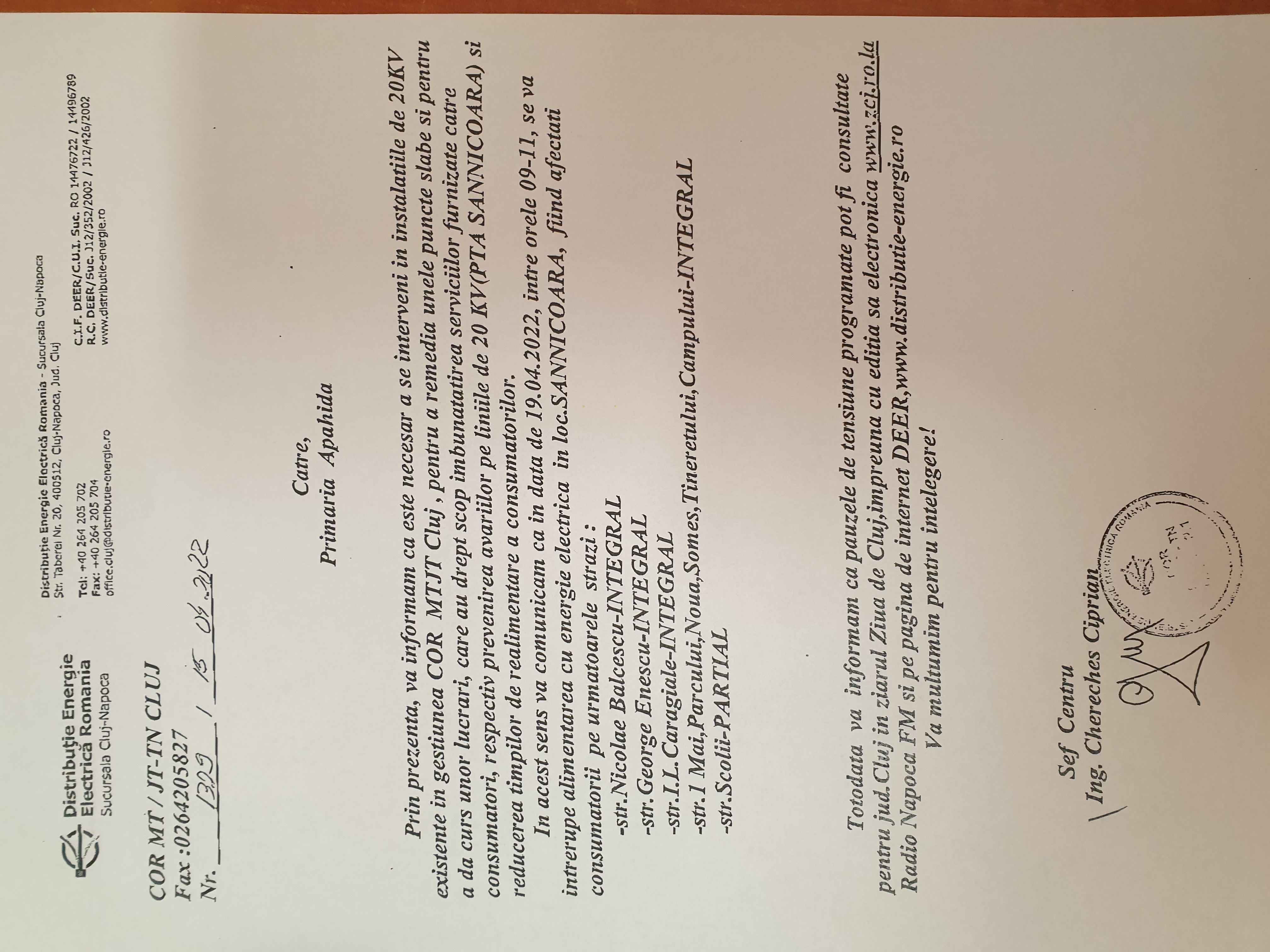 | 18.04.2016 | ANUNT PAUZA DE ENERGIE 20.04.2016, intre orele 9:00-17:00, pe urmatoarele strazi din Sat Apahida :
