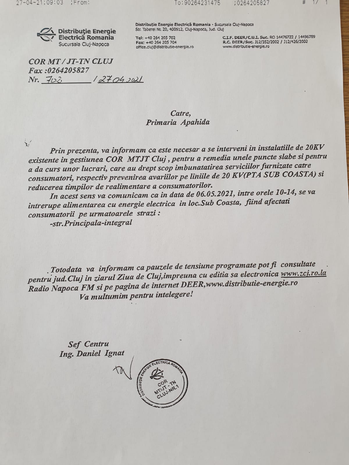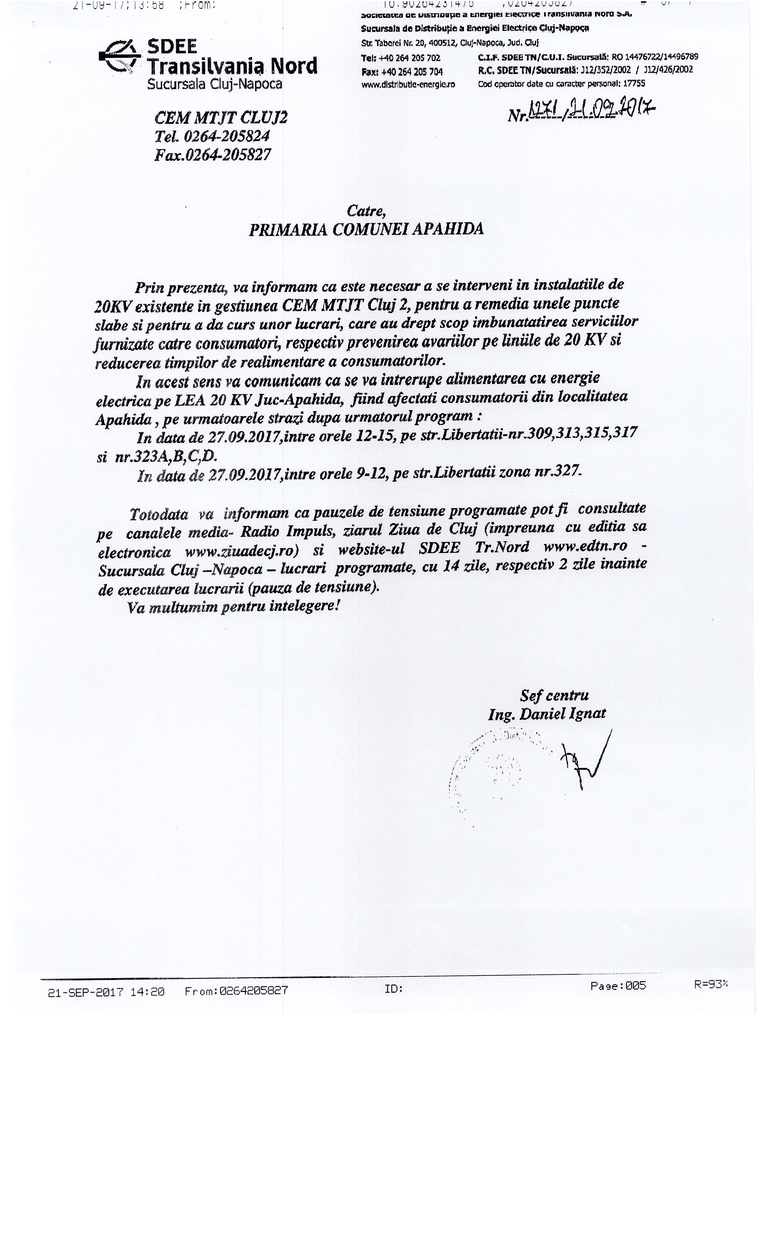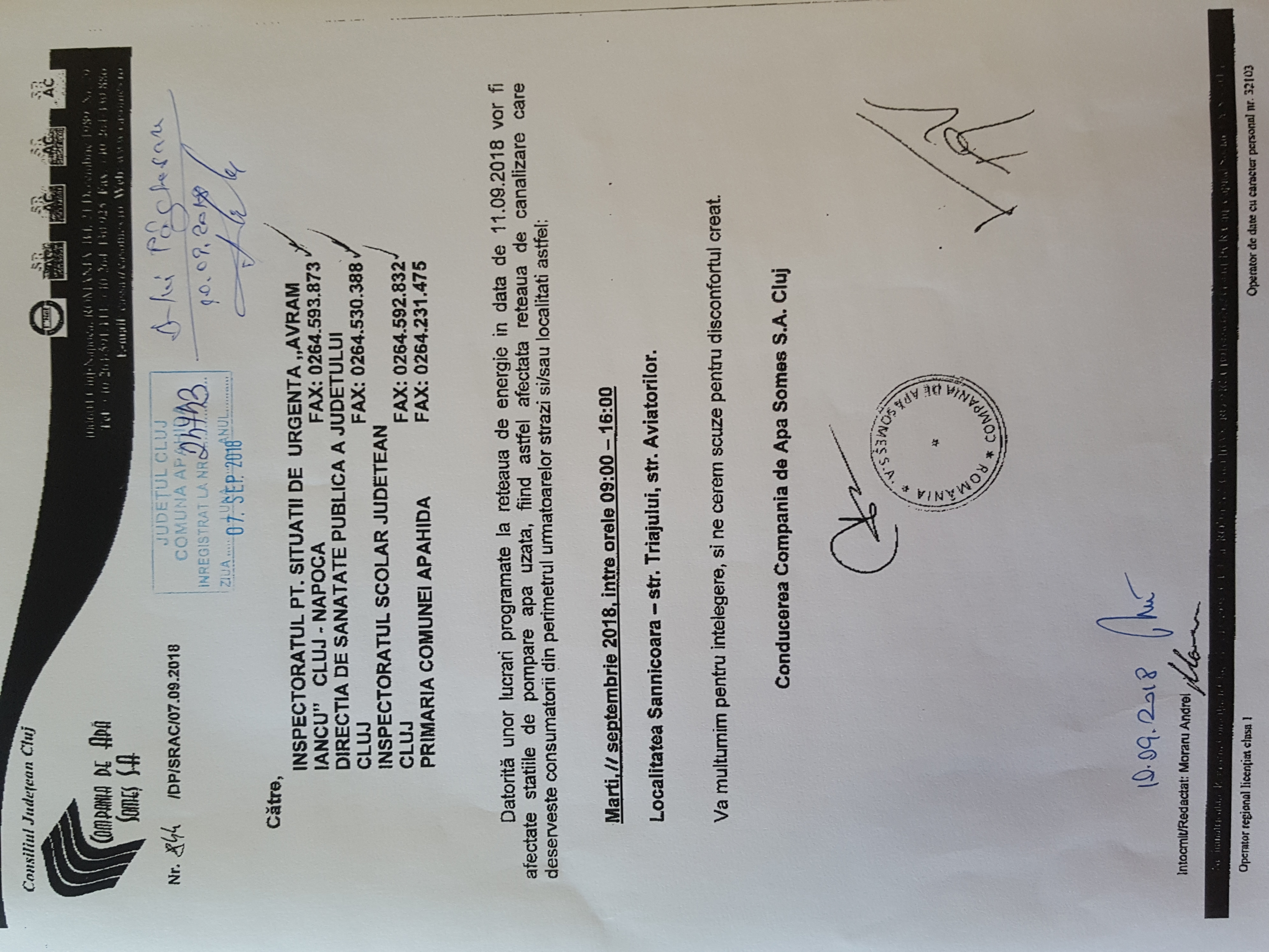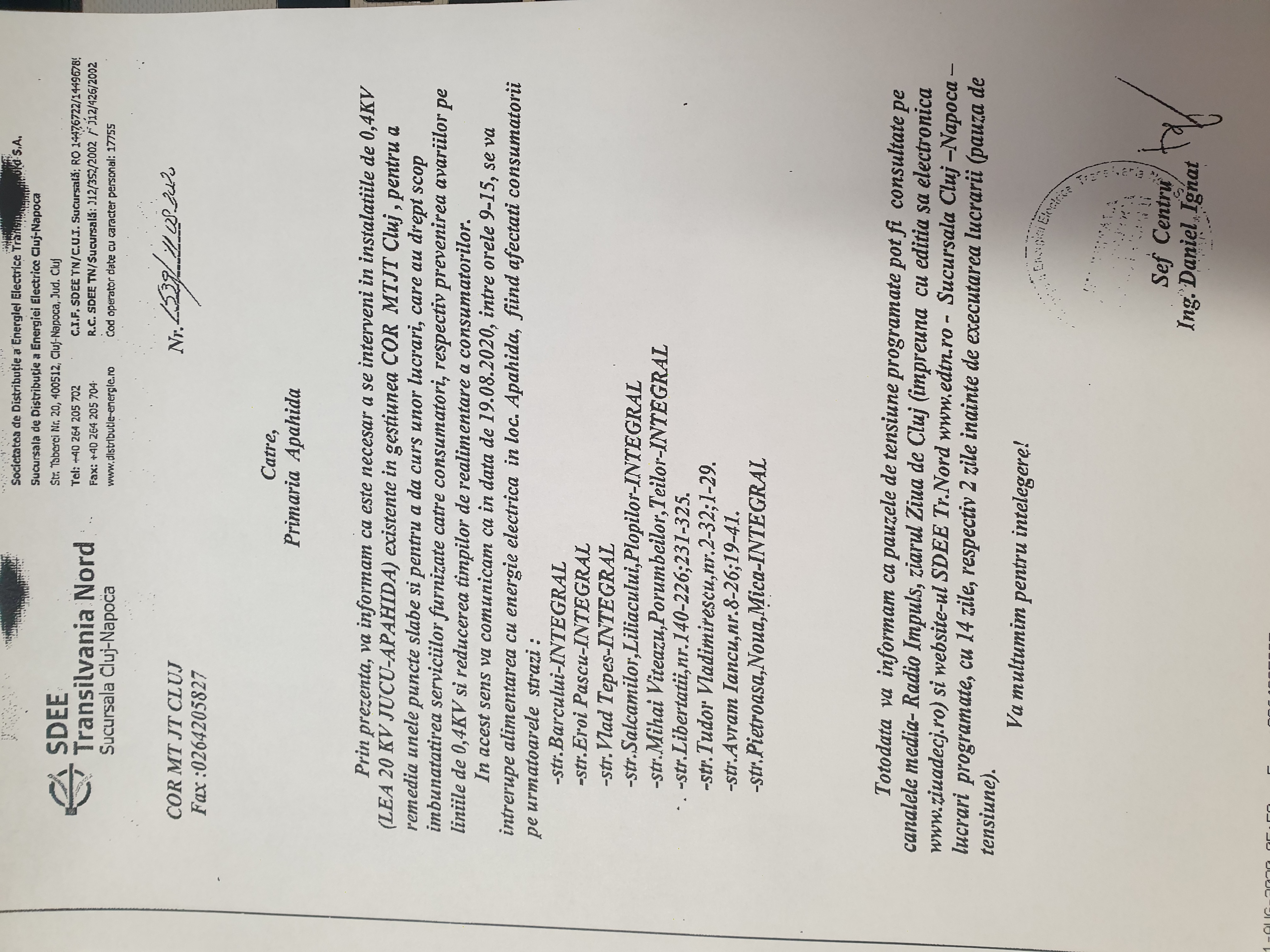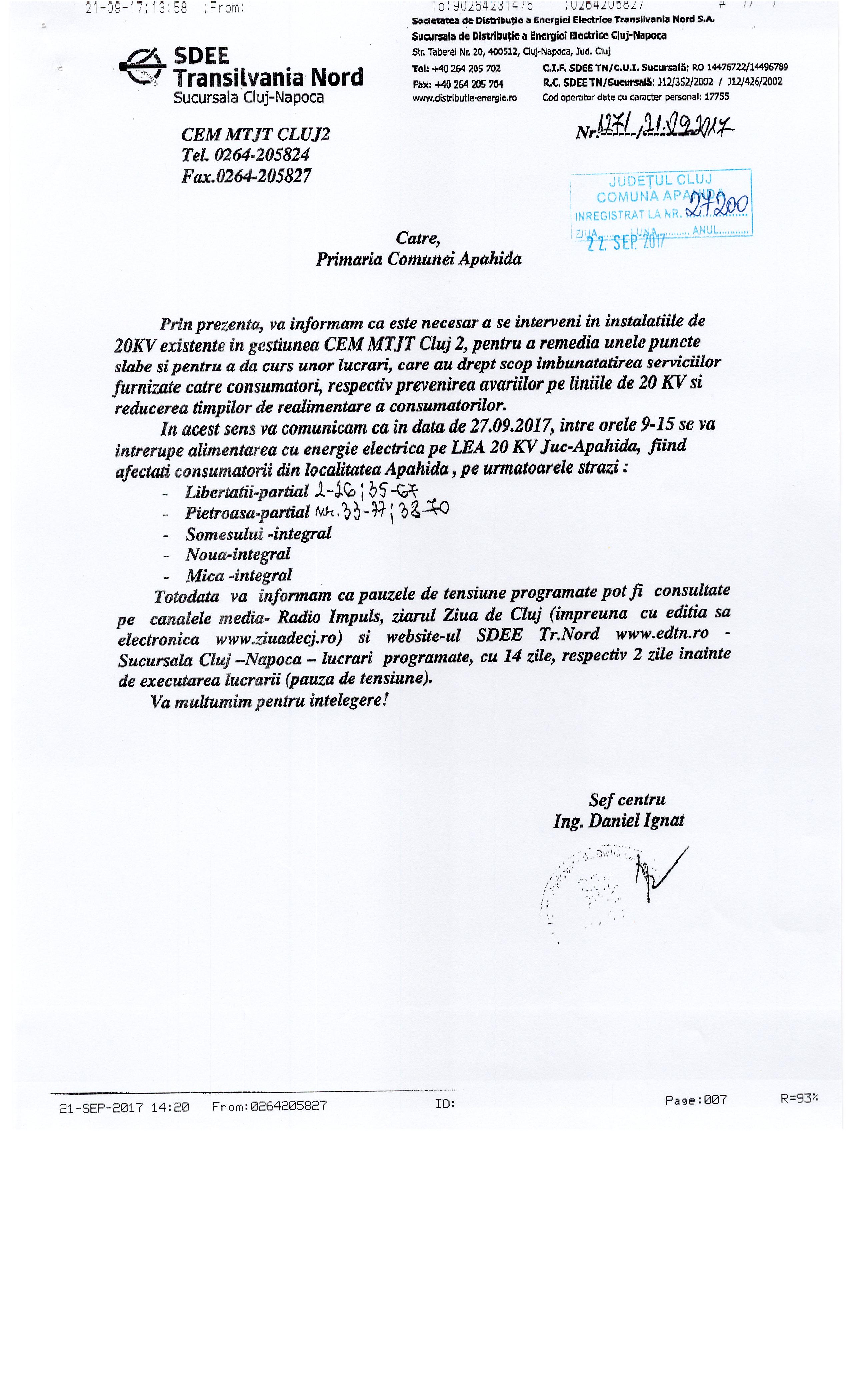 | 18.04.2016 | ANUNT PAUZA DE ENERGIE 20.04.2016, intre orele 9:00-17:00, pe urmatoarele strazi din Sat Apahida :