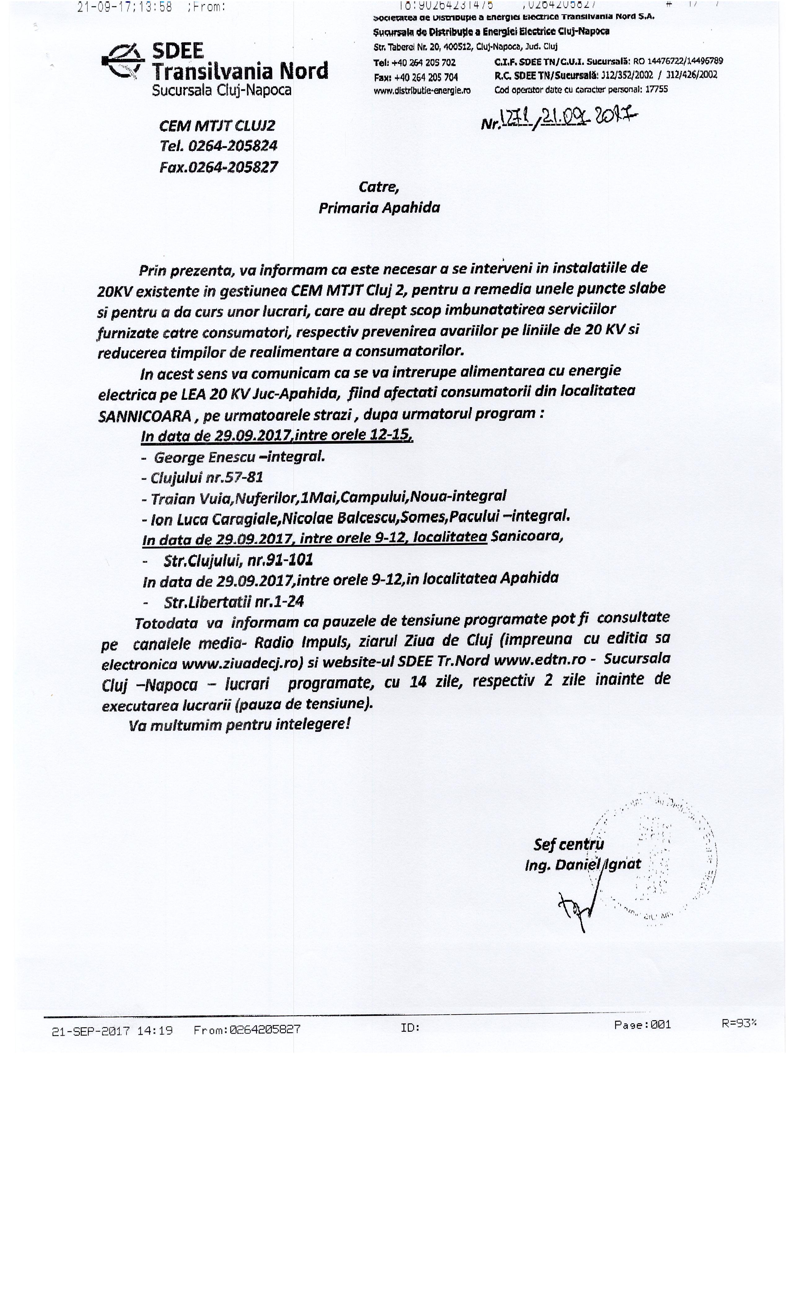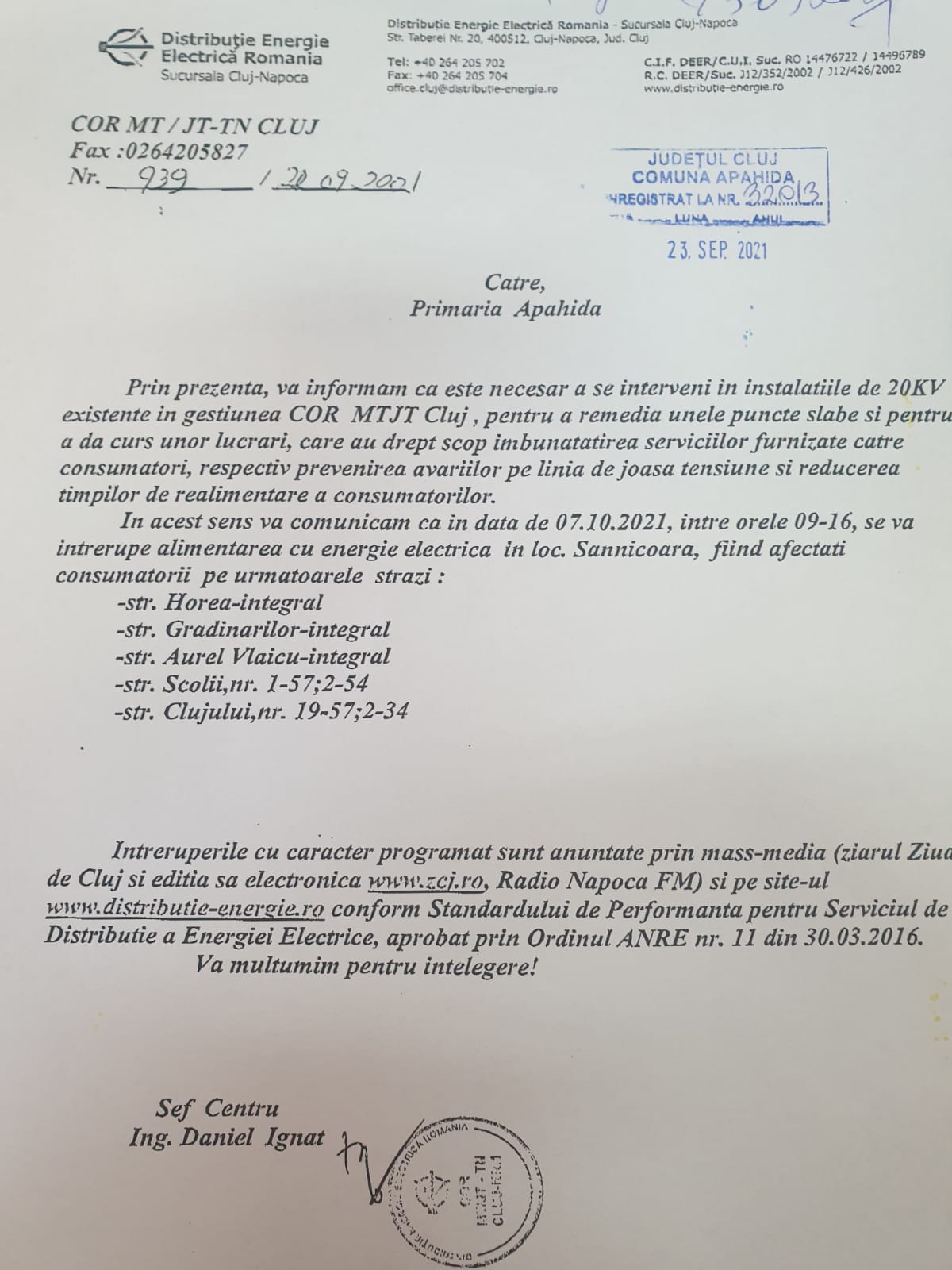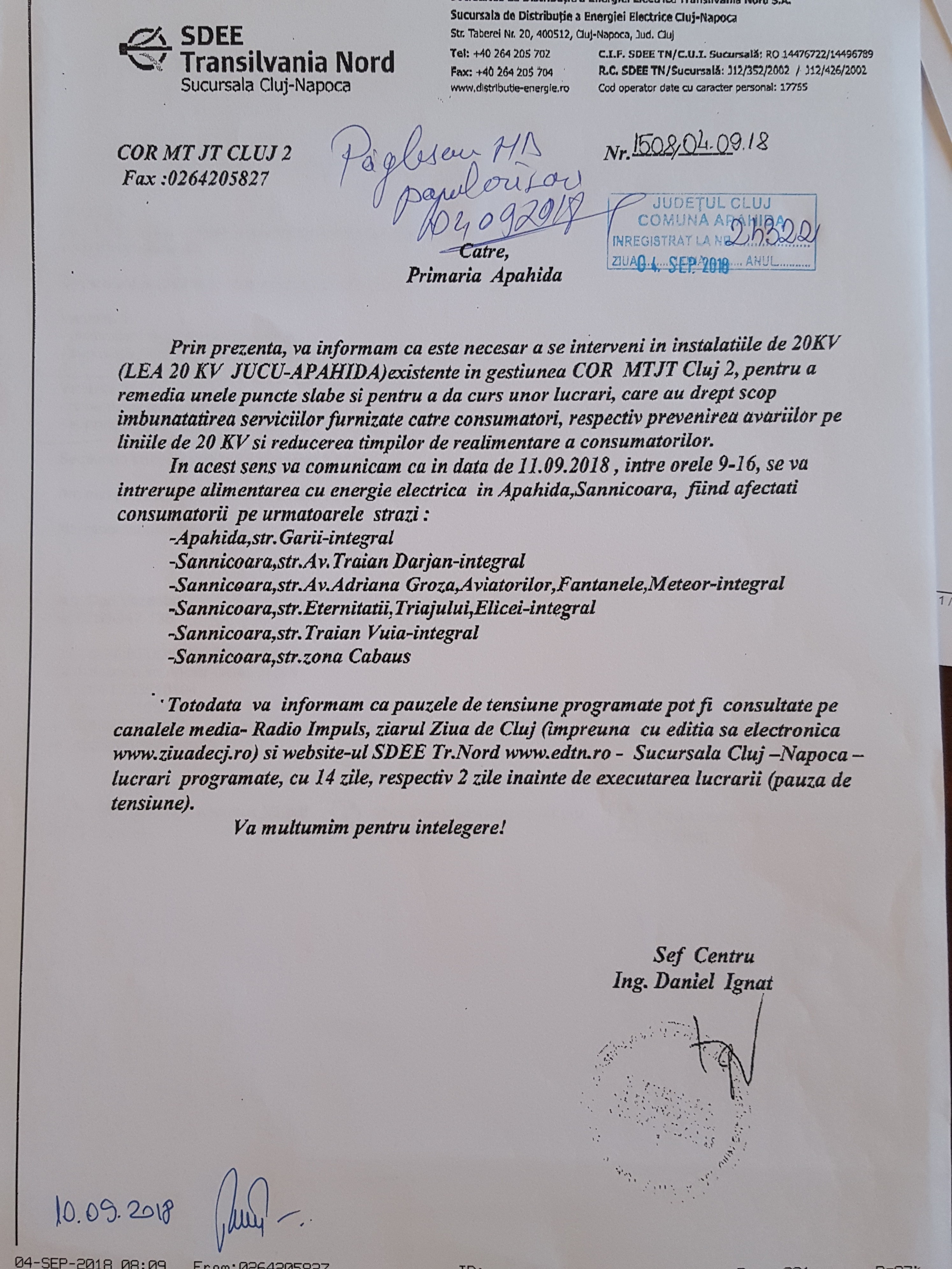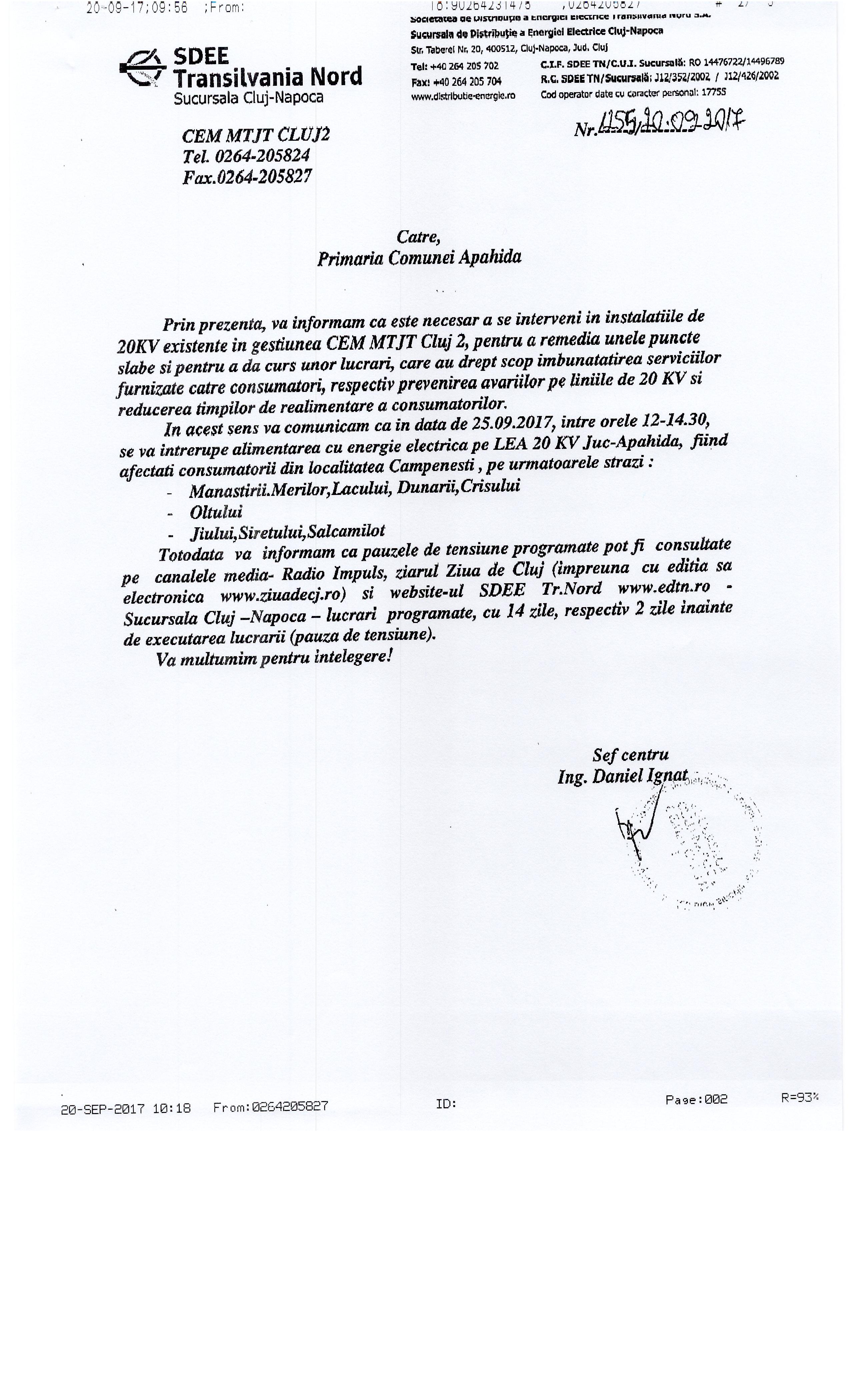 | 18.04.2016 | ANUNT PAUZA DE ENERGIE 20.04.2016, intre orele 9:00-17:00, pe urmatoarele strazi din Sat Apahida :