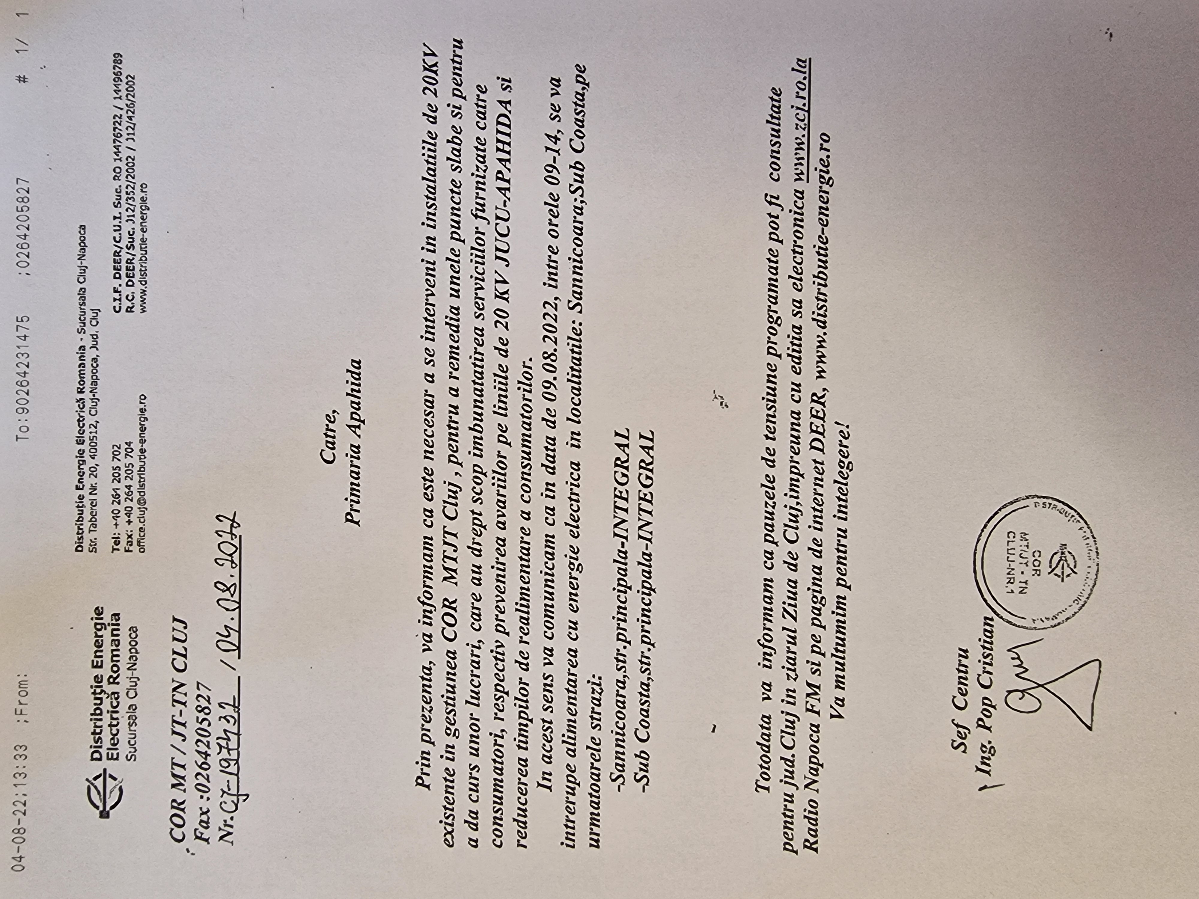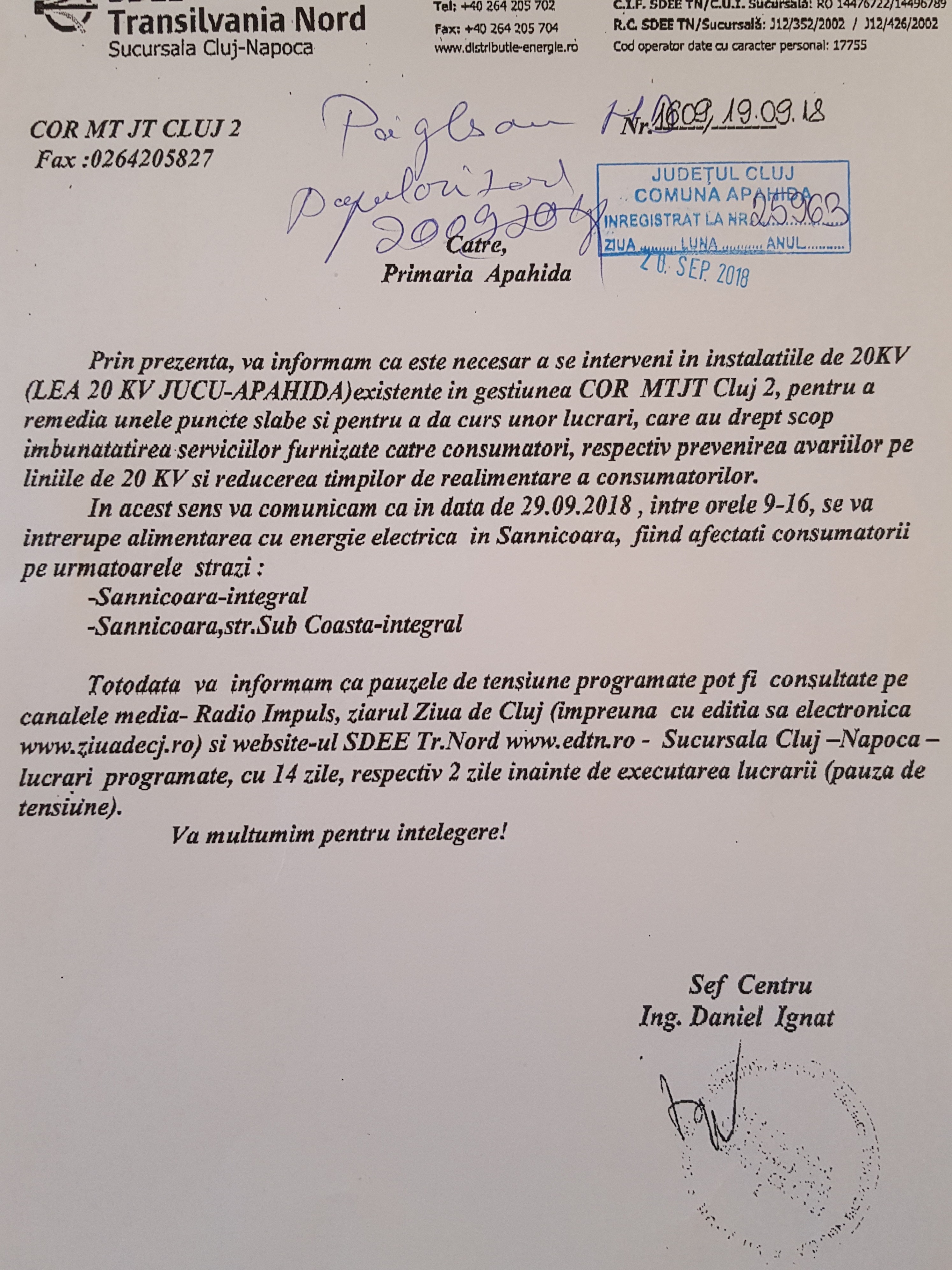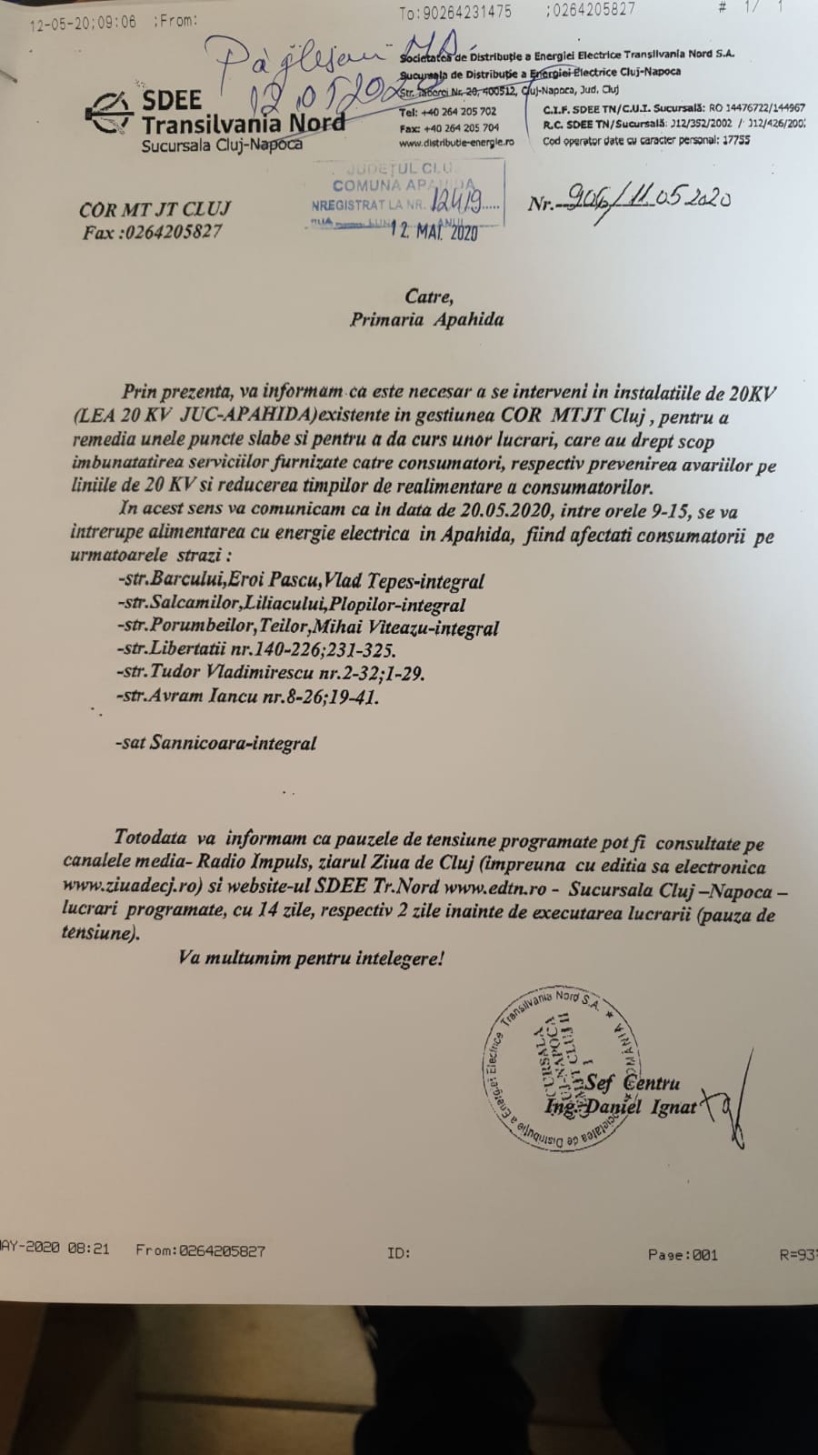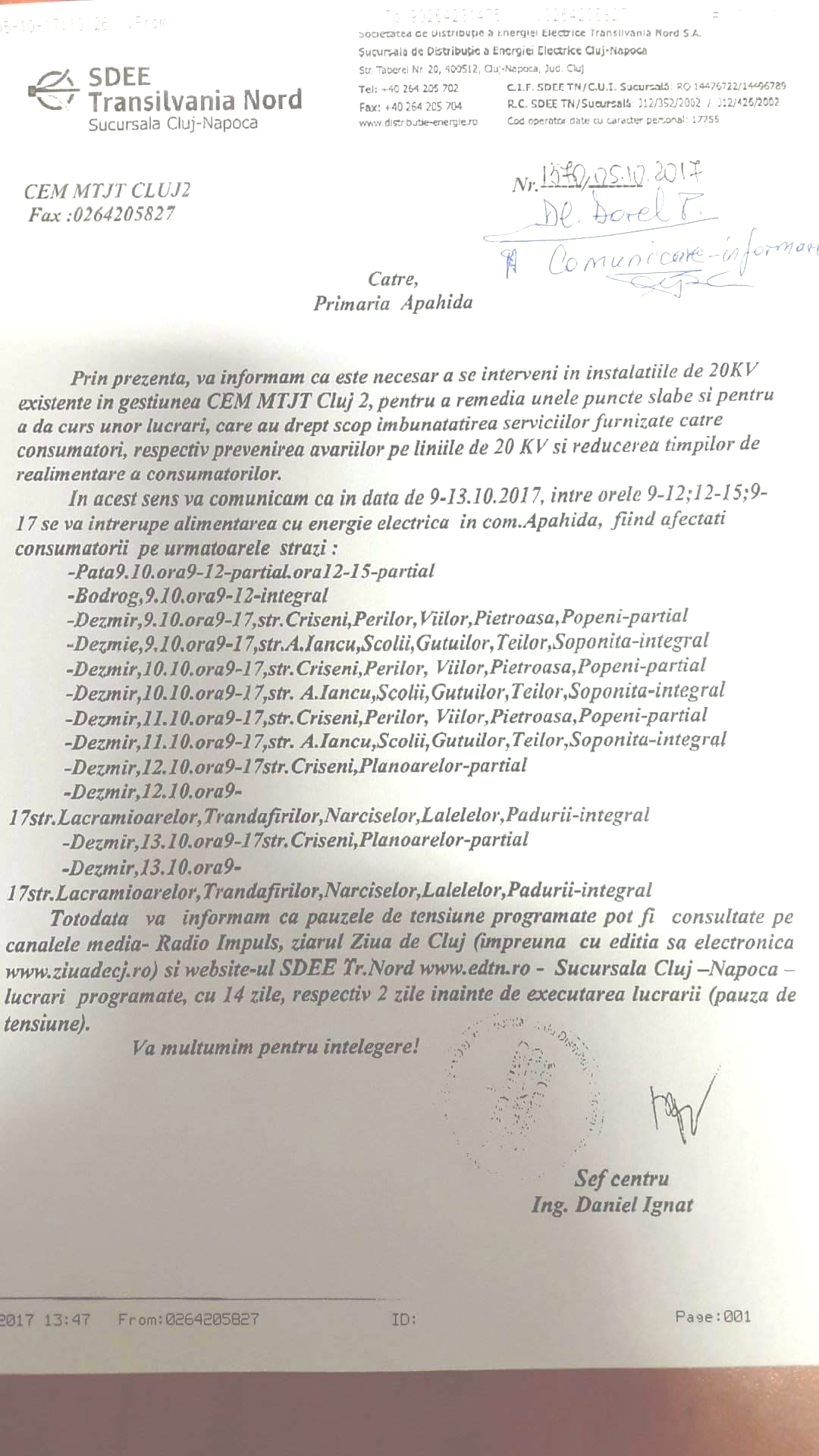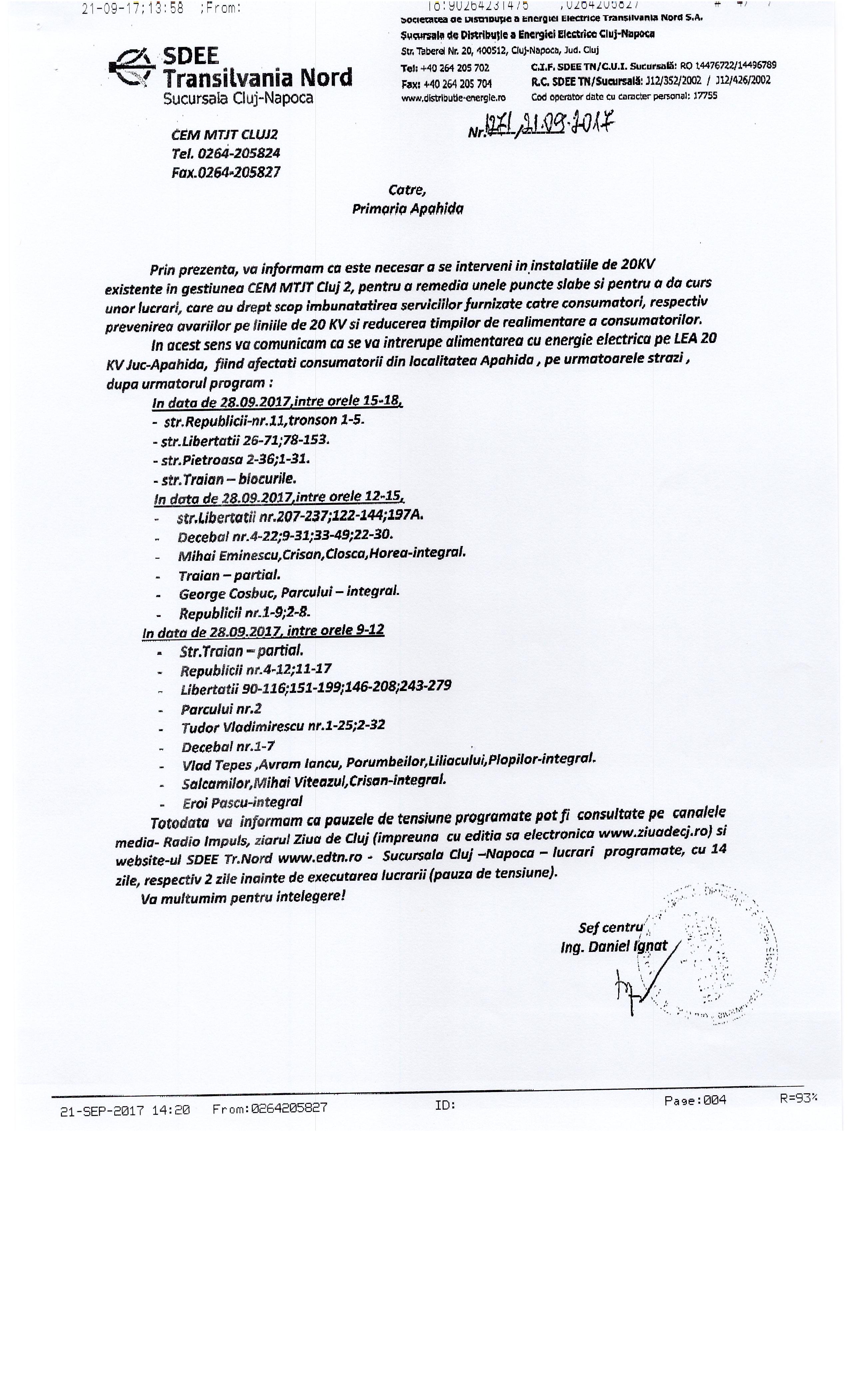 | 18.04.2016 | ANUNT PAUZA DE ENERGIE 20.04.2016, intre orele 9:00-17:00, pe urmatoarele strazi din Sat Apahida :