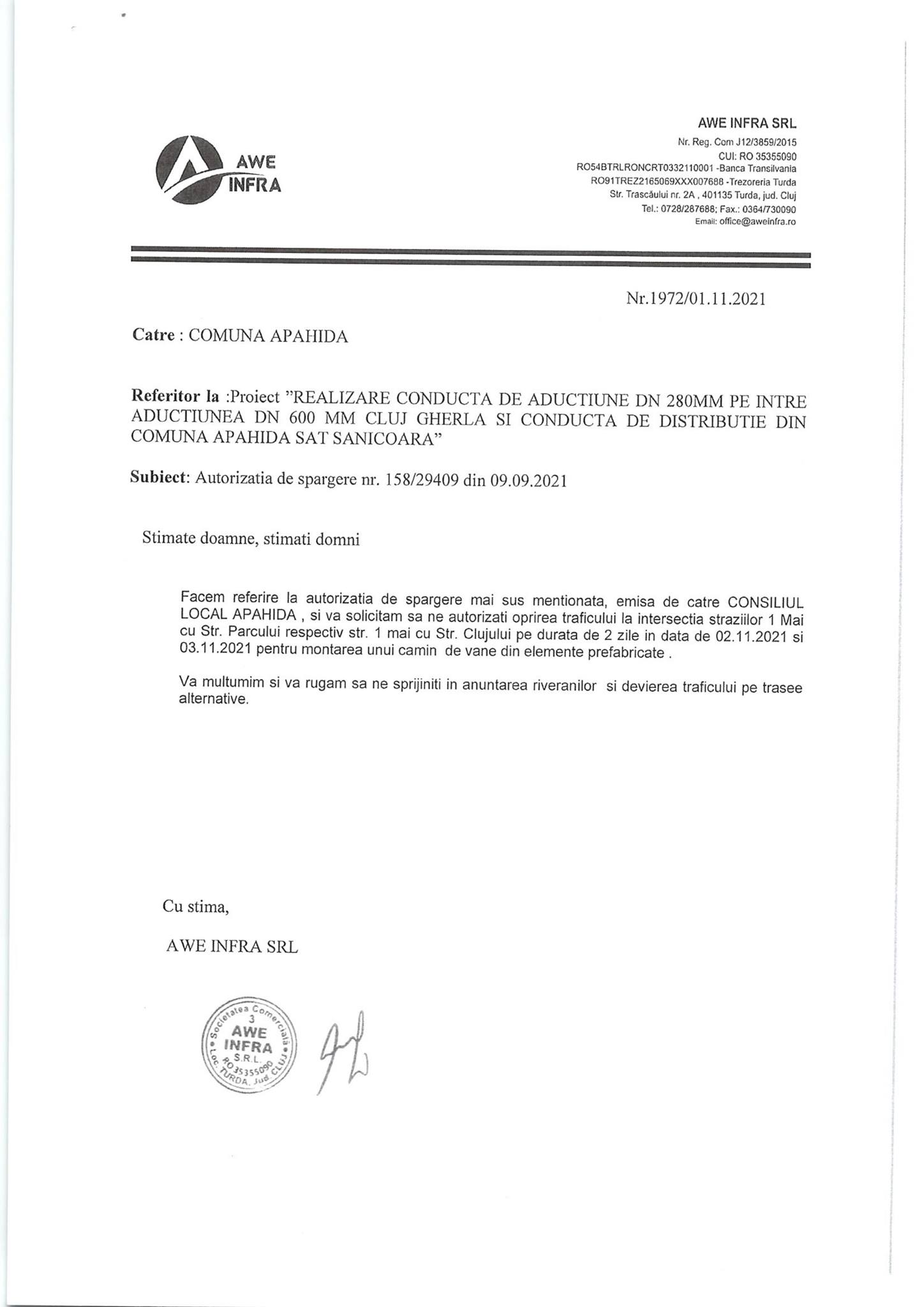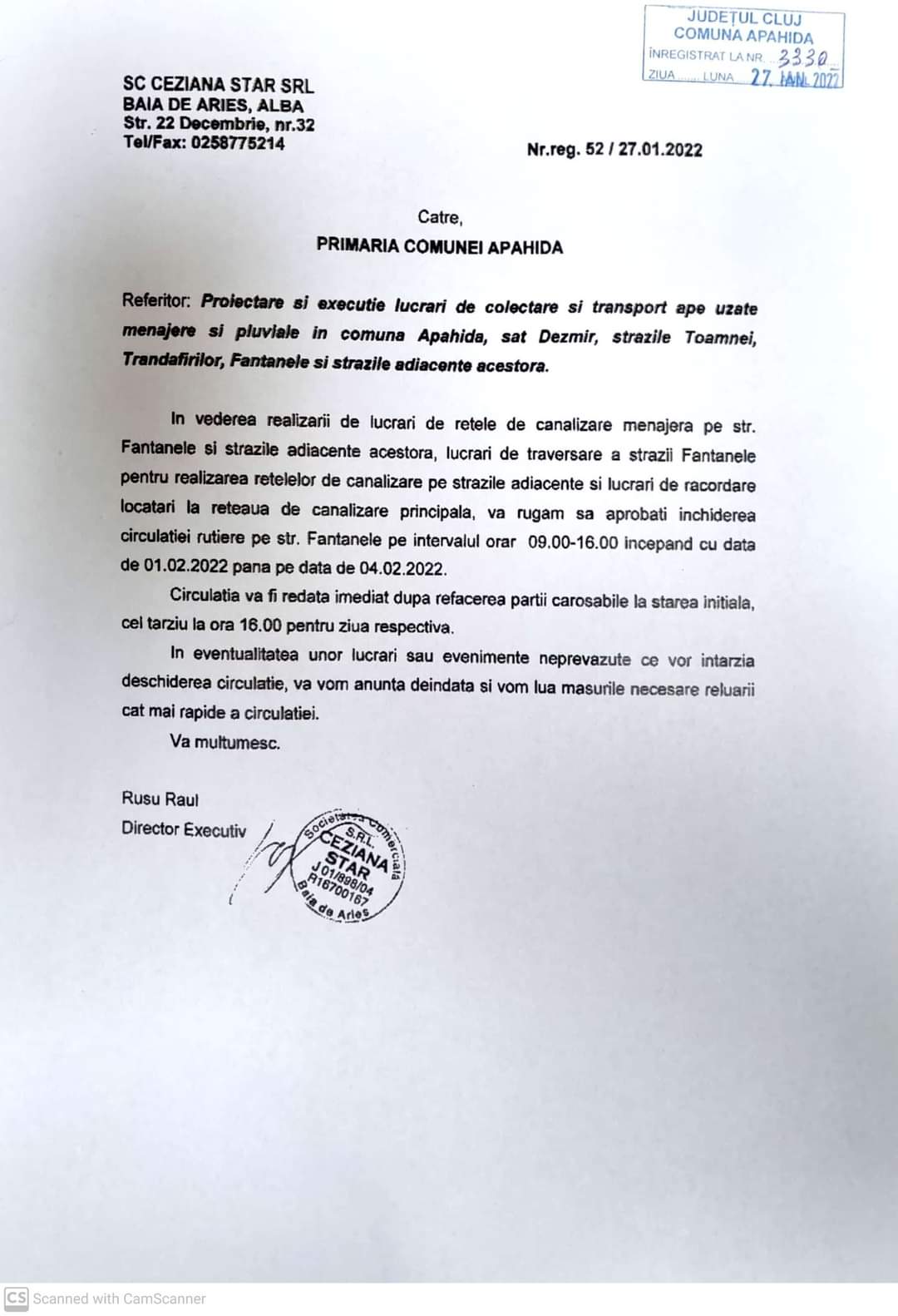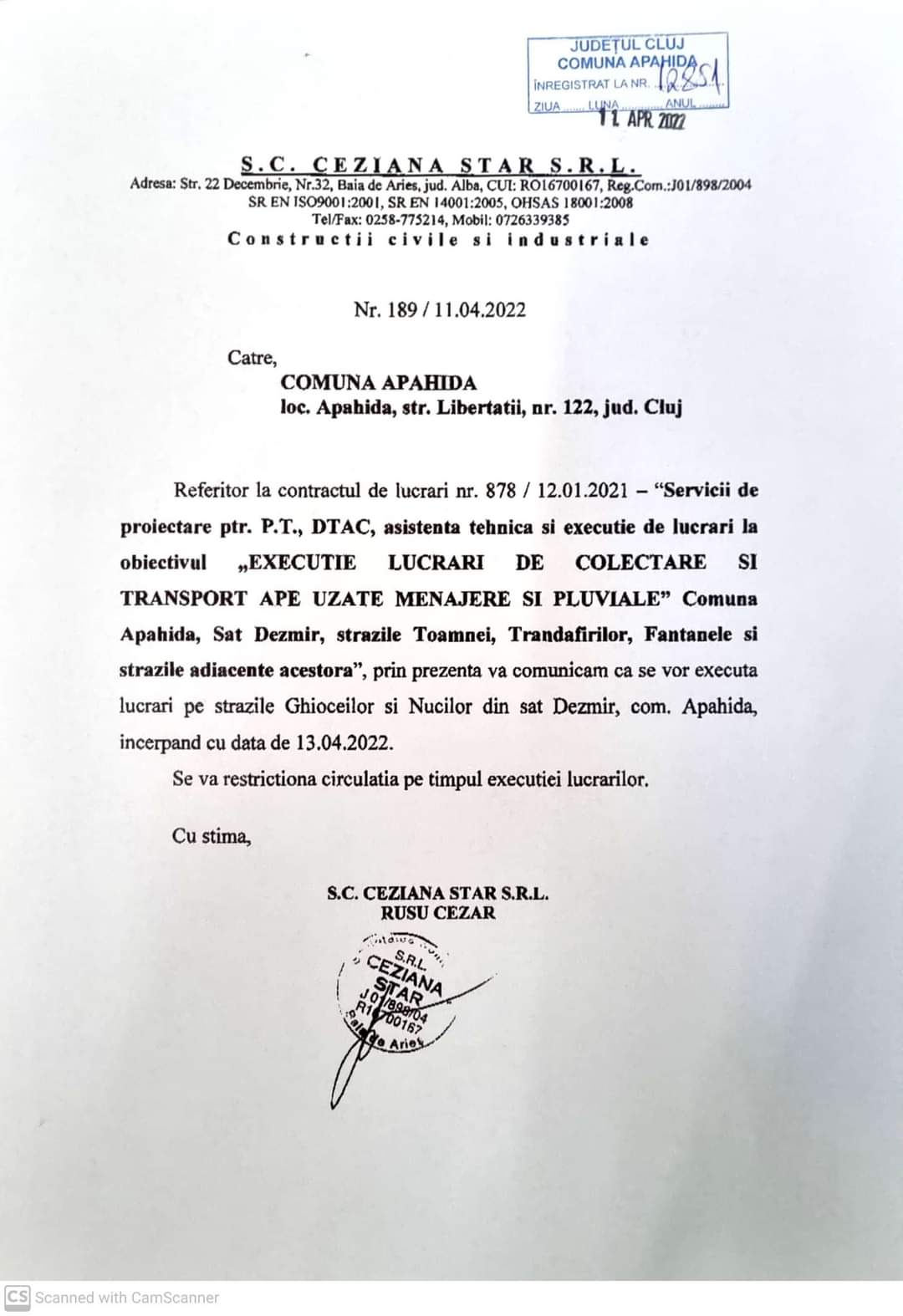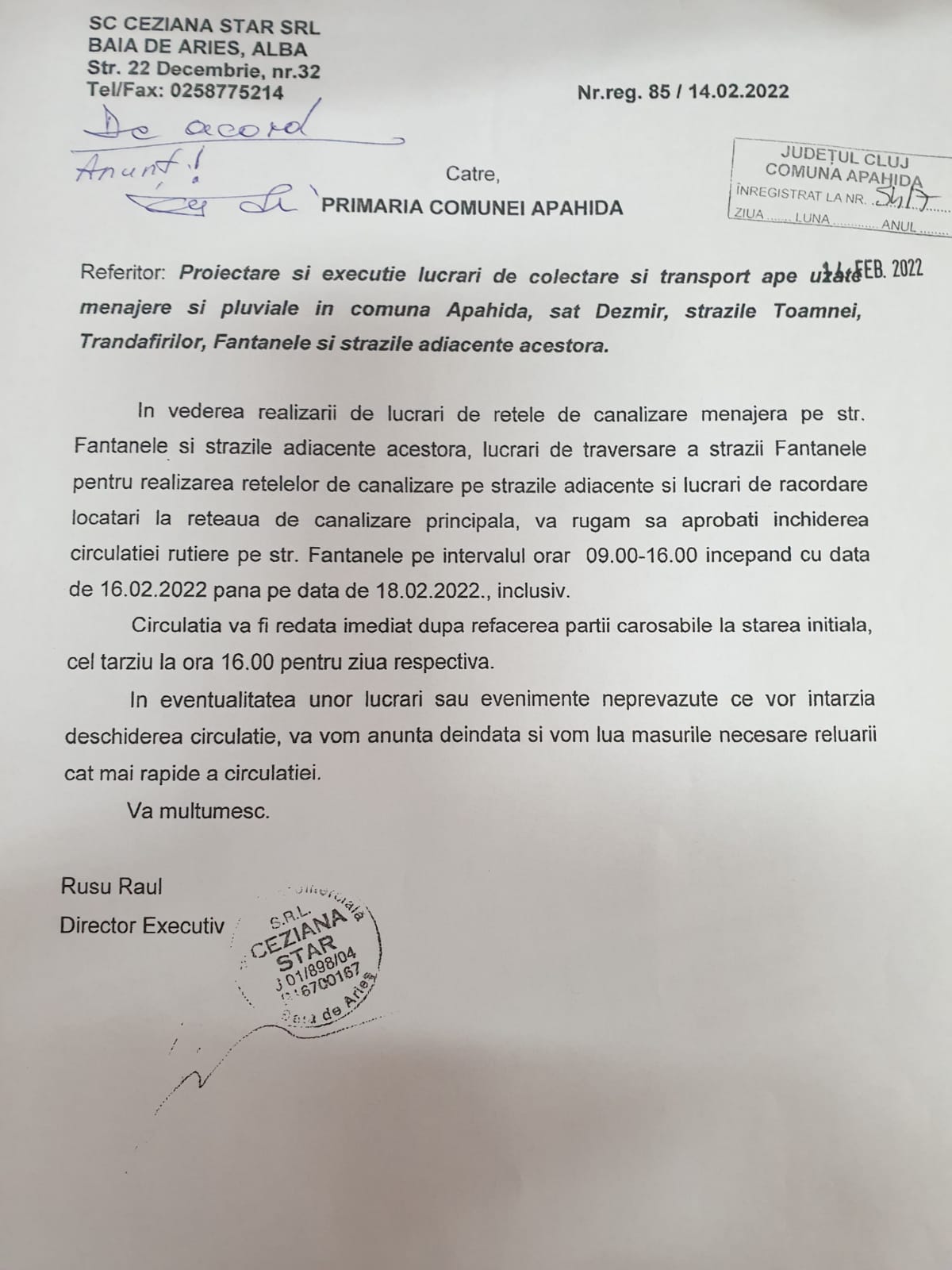 | 09.10.2015 | Infiintare retea canaIizare menajera in satul Dezmir si partial in satele Sannicoara si Apahida judetul CIuj Prin prezenta dorim sa va instiintam ca din data de 09.10.2015 vor incepe lucrarile de executie pe strada Triajului si strada I. L. Caragiale, din localitatea Sannicoara judetul CIuj. |