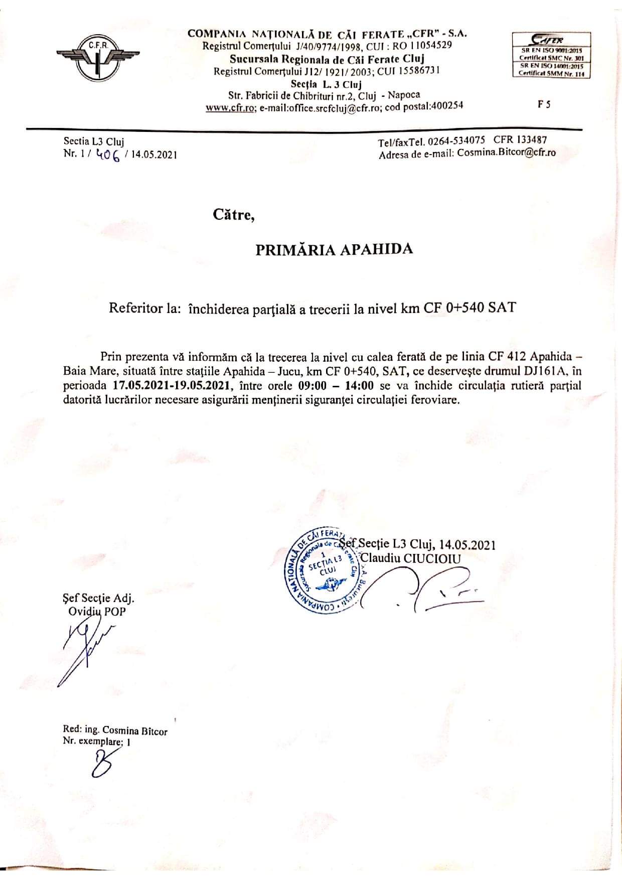 | 01.11.2016 | ANUNT Proiectul privind "Constructia de statii calatori, semnalizare si semaforizare pe traseul DN1 C si infiintare treceri de pietoni in localitatea Apahida, judetul Cluj", a fost atasat din nou pe e-licitatie.ro ( SEAP), anunt de participare simplificat 394813 in data de 27.10.2016 cu termen de valabilitate pana la data de 17.11.2016.