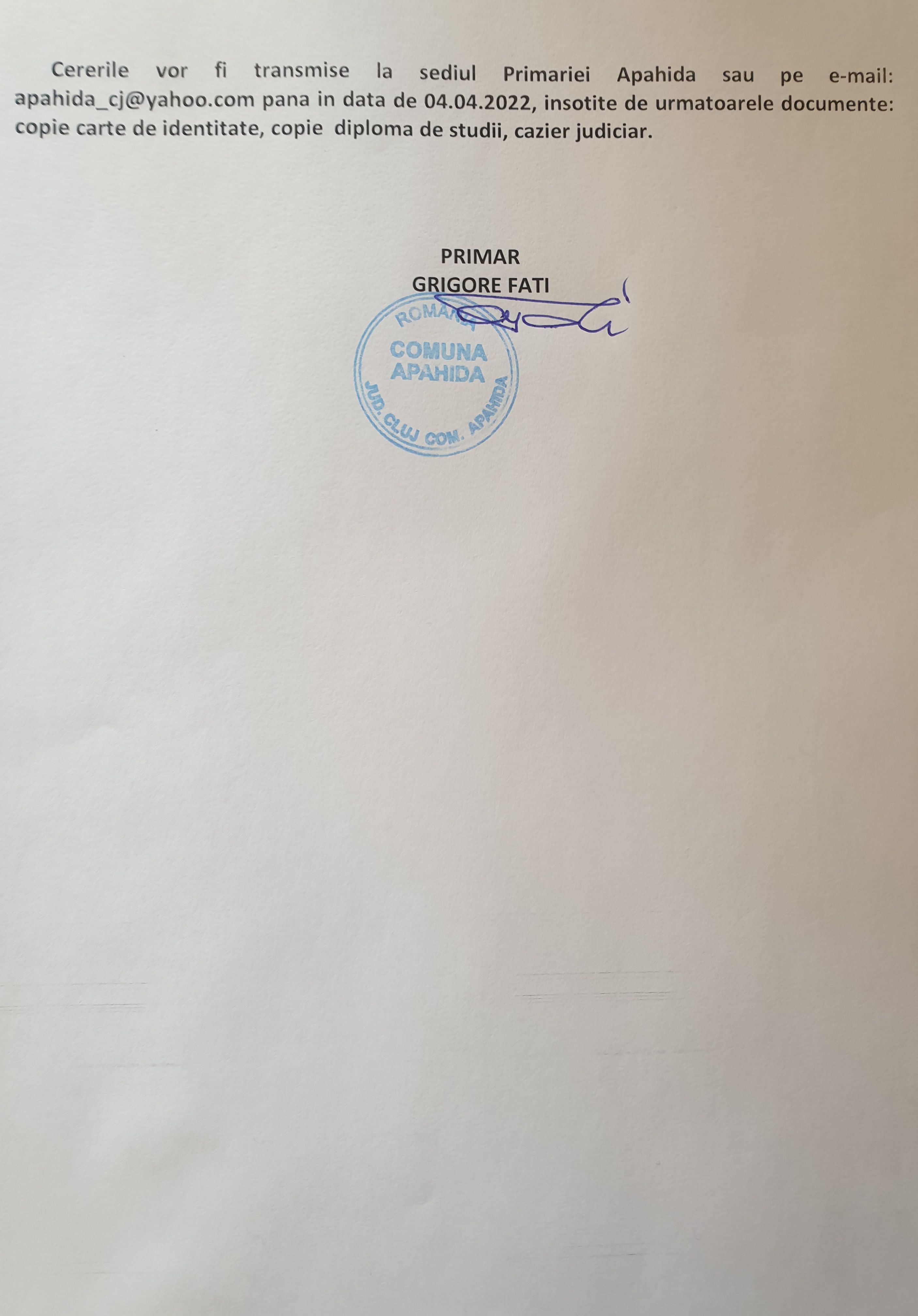 | 15.04.2025 | Raportul final al concursului de promovare in functia publica de conducere Secretar General al UAT Apahida. - vezi anunt |