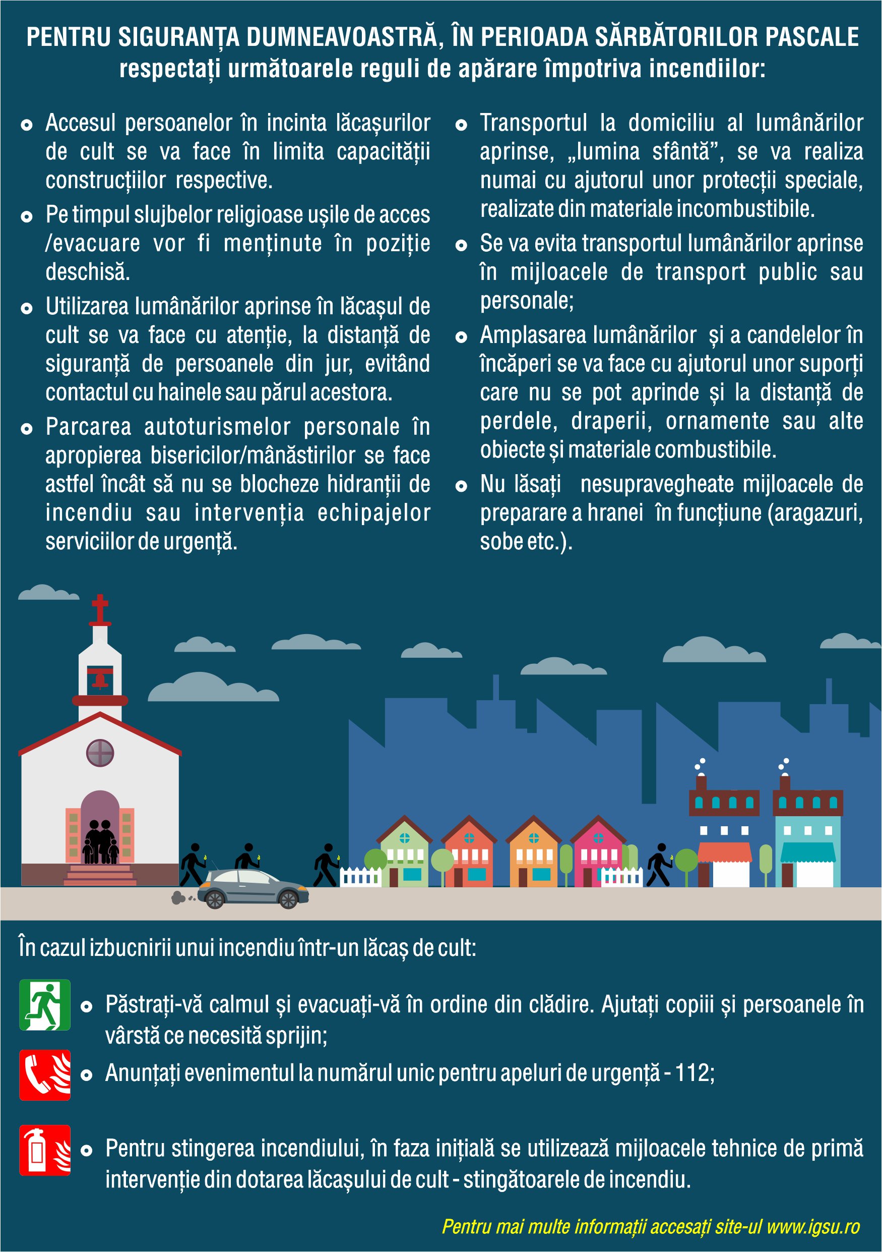 | 26.04.2016 | Masuri privind apararea impotriva incendiilor ce se impun pentru desfasurarea in conditii de securitate a Sarbatorilor Pascale - 2016 - vezi anexa Masuri privind apararea impotriva incendiilor ce se impun pentru desfasurarea in conditii de securitate a Zilei Internationale a Muncii -1 Mai si Zilei Internationale a Tineretului- 2 Mai - vezi anexa Sarbatori fericite! |