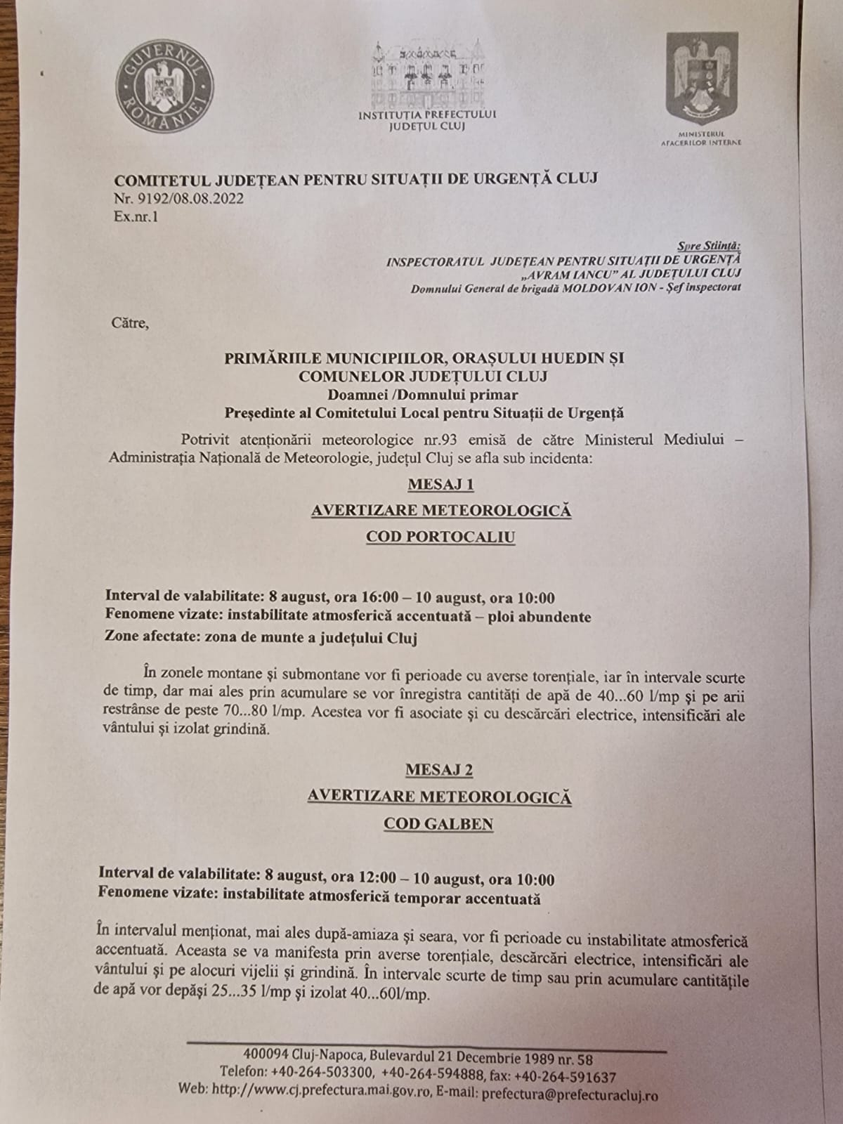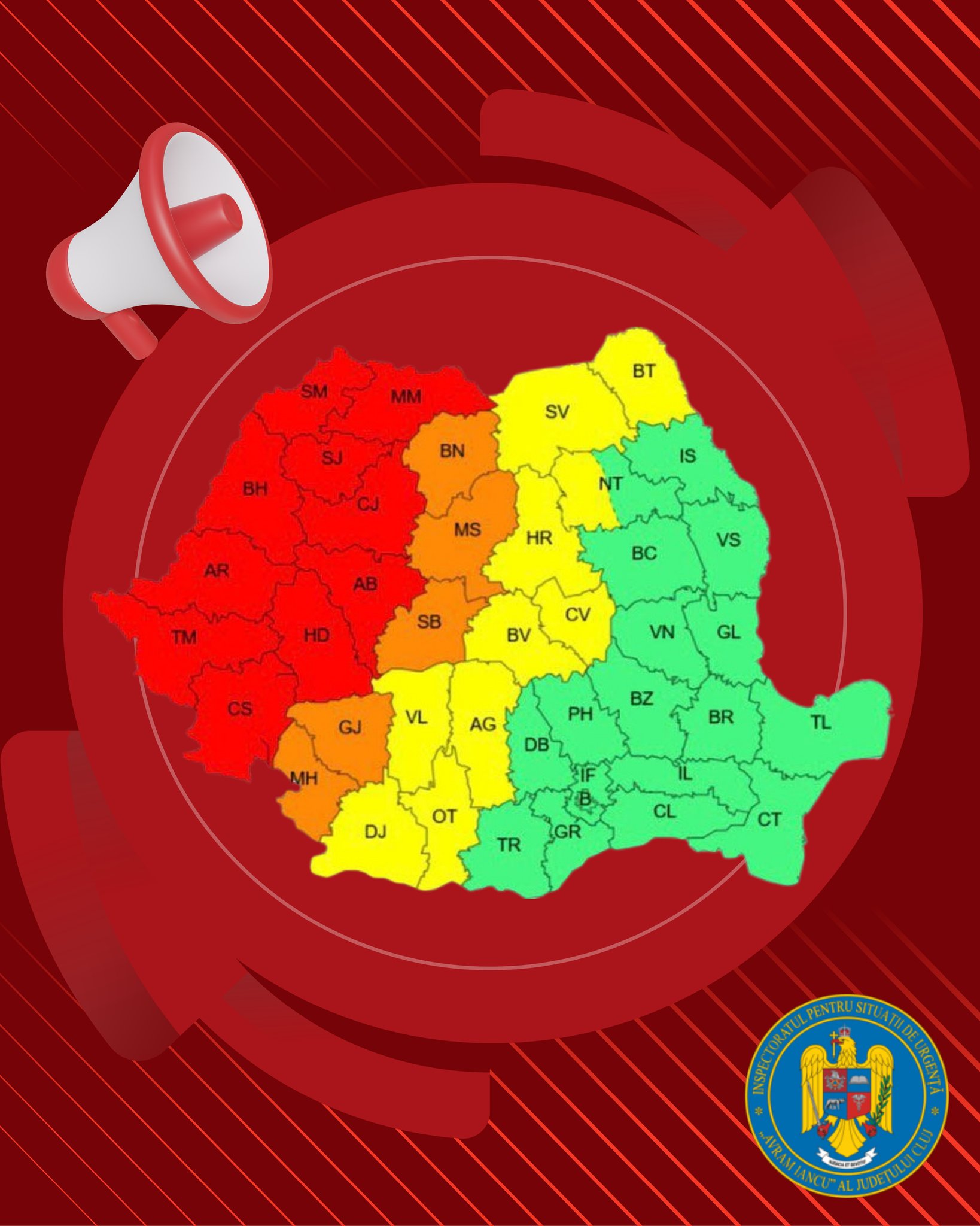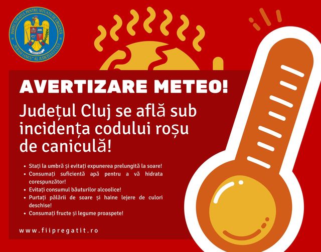| 08.07.2025 | COD ROȘU la nivelul județului Cluj!Interval de valabilitate: 8 iulie, ora 15.00 – 8 iulie, ora 21.00