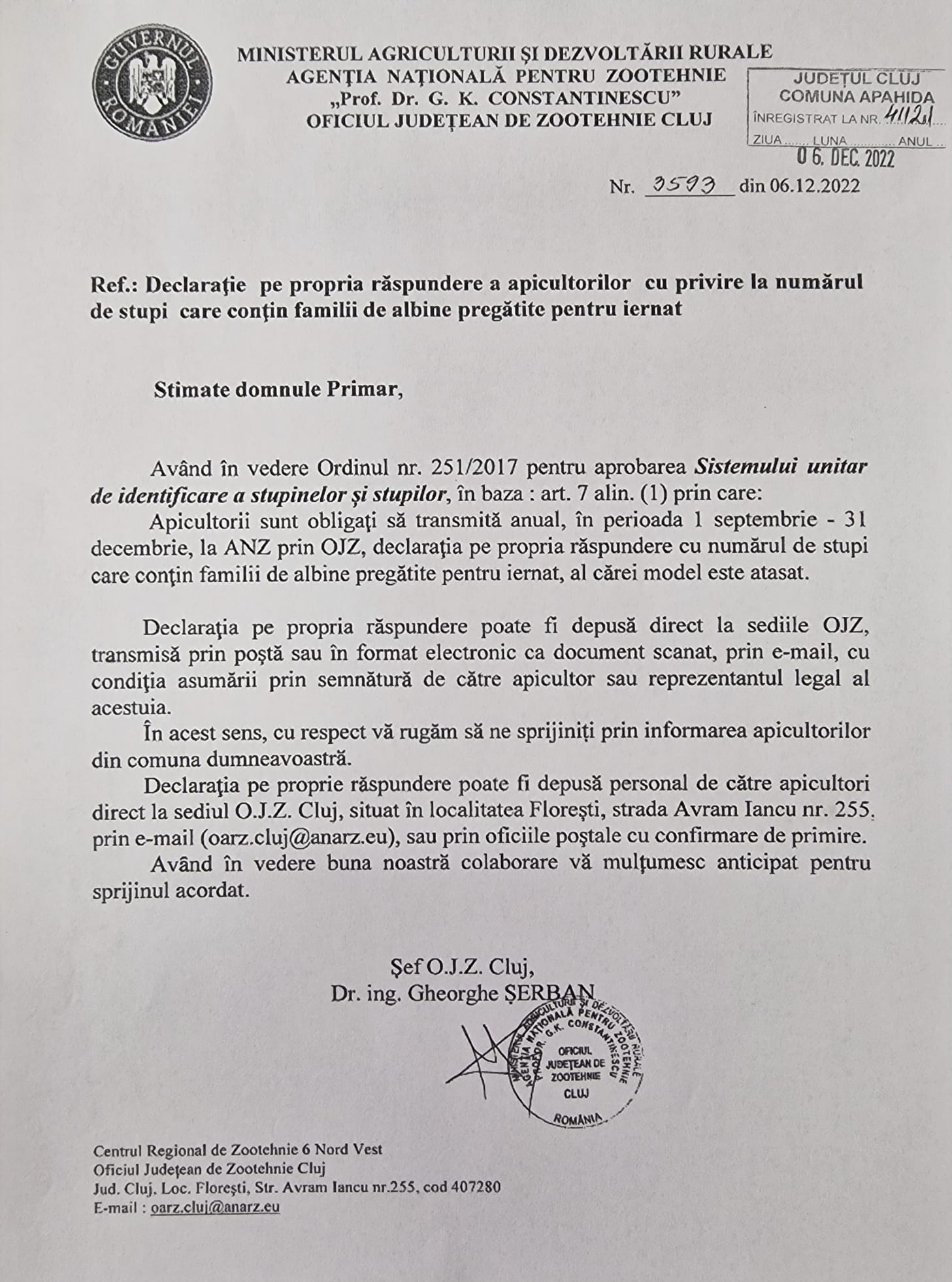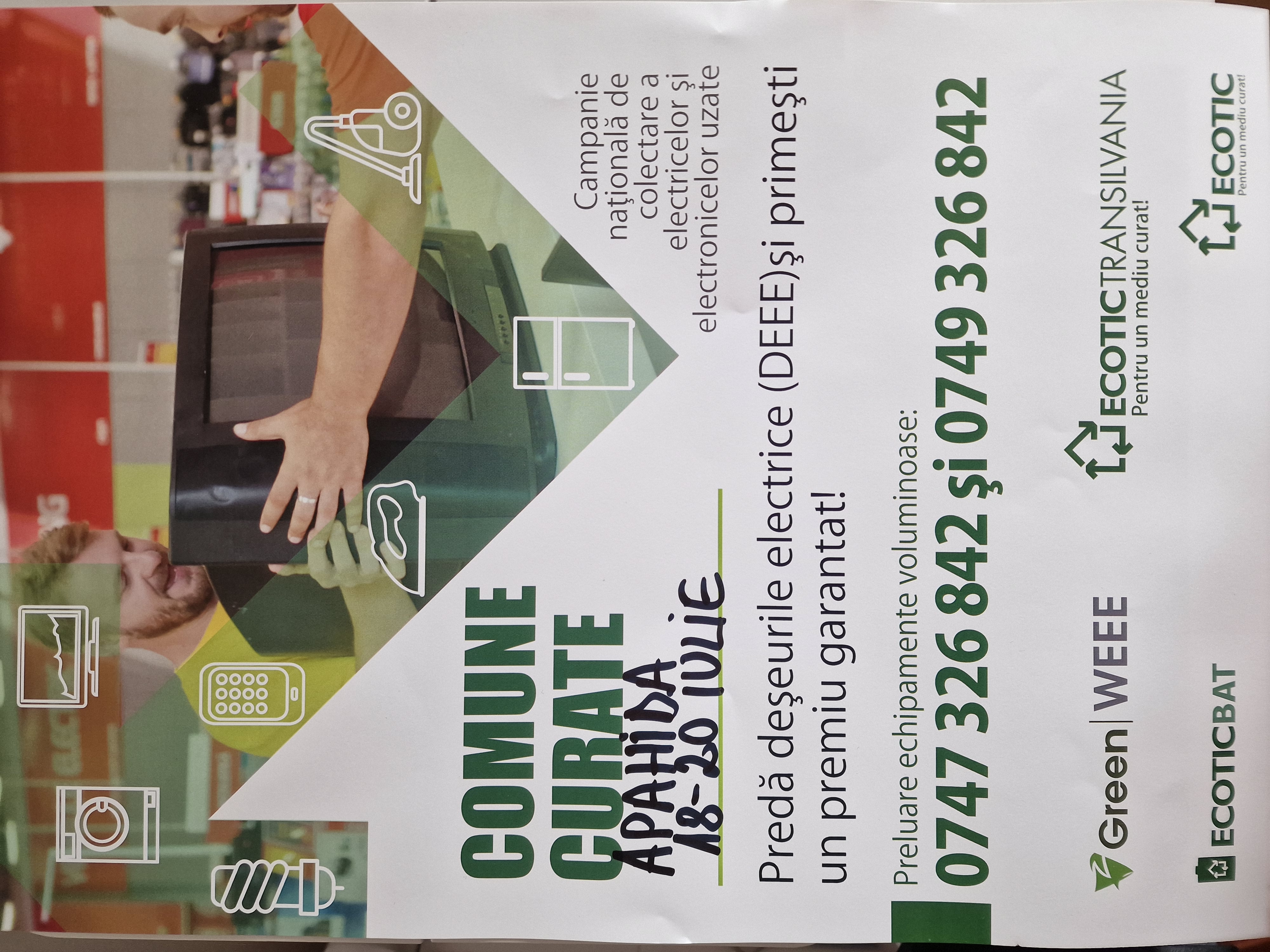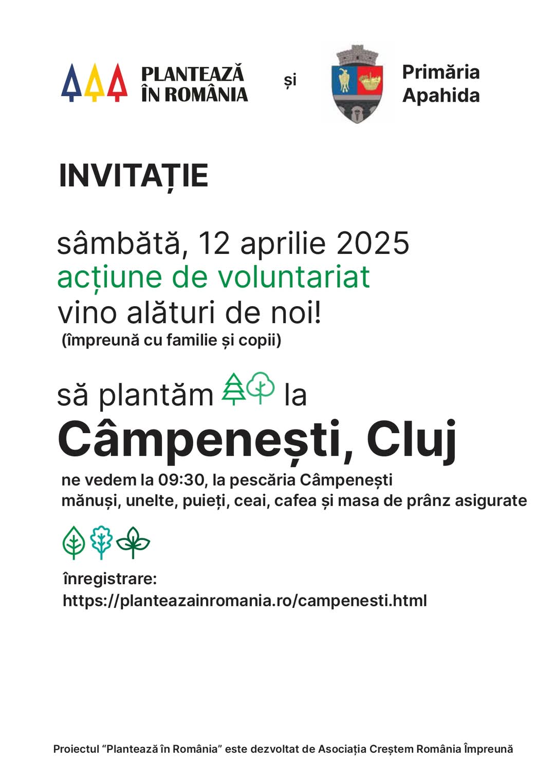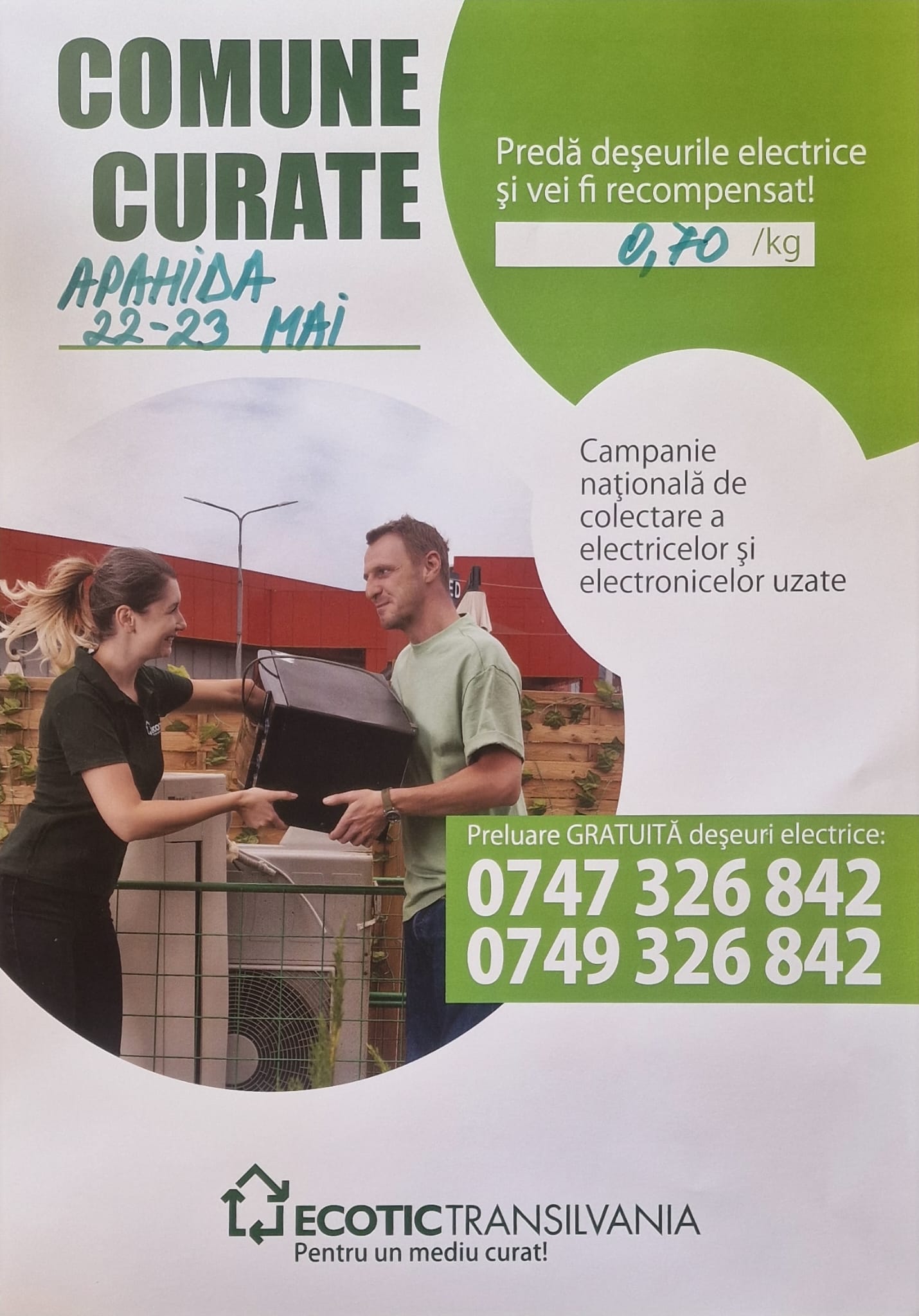 | 15.06.2016 | ANUNT IMPORTANT In data de 16 - 17 iunie 2016, orele 22 incepe dezinsectia ( combaterea tantarilor, mustelor si capuselor ) in urmatoarele locatii : parcuri si locuri de joaca din Apahida-blocuri Avicola, Pata, Cimpenesti, Corpadea.