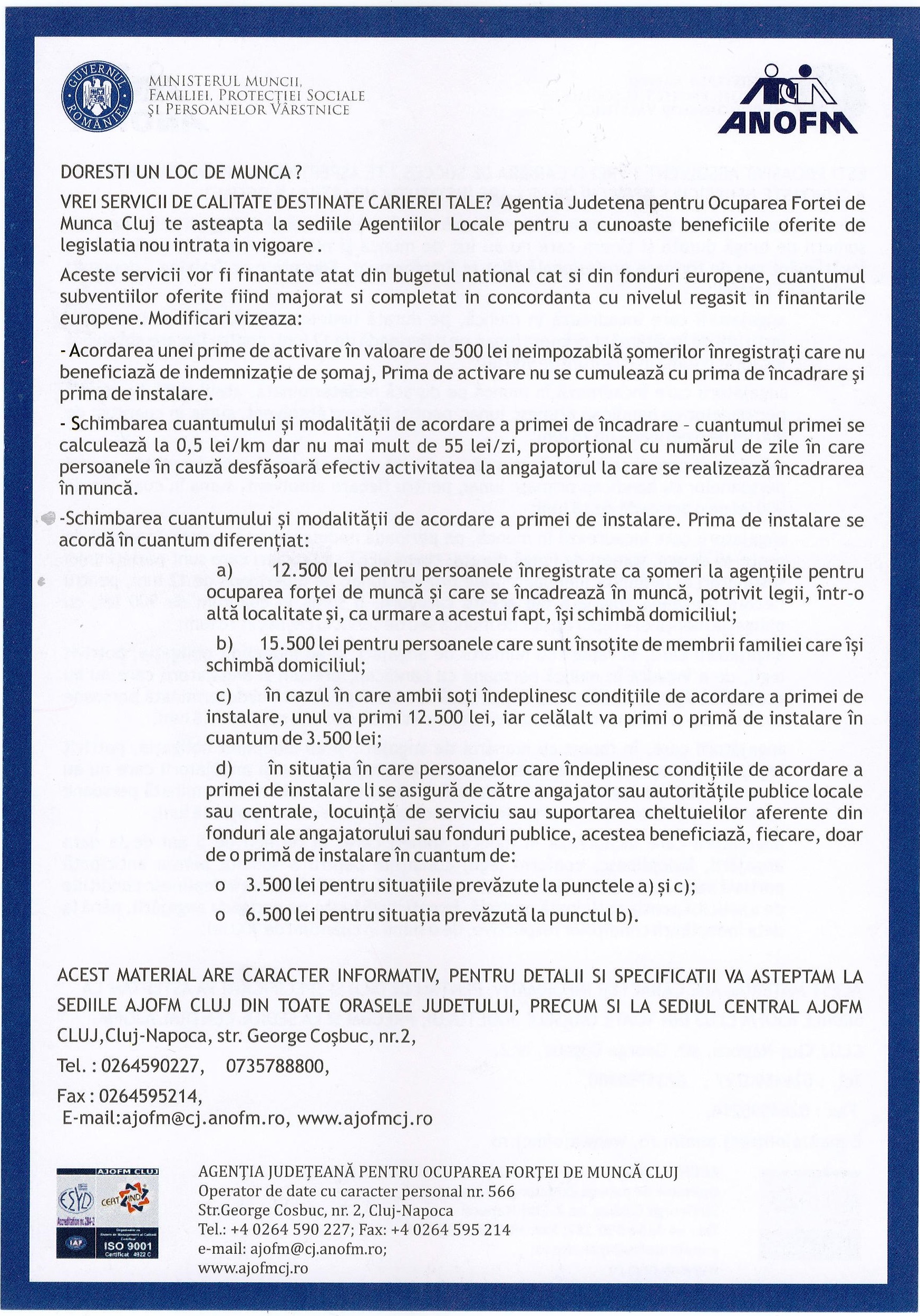 | 09.11.2016 | Locurile de munca disponibile in Judetul Cluj, sosite pe adresa Serviciului de Asistenta Sociala al Primariei Comunei Apahida. (vezi detalii) |