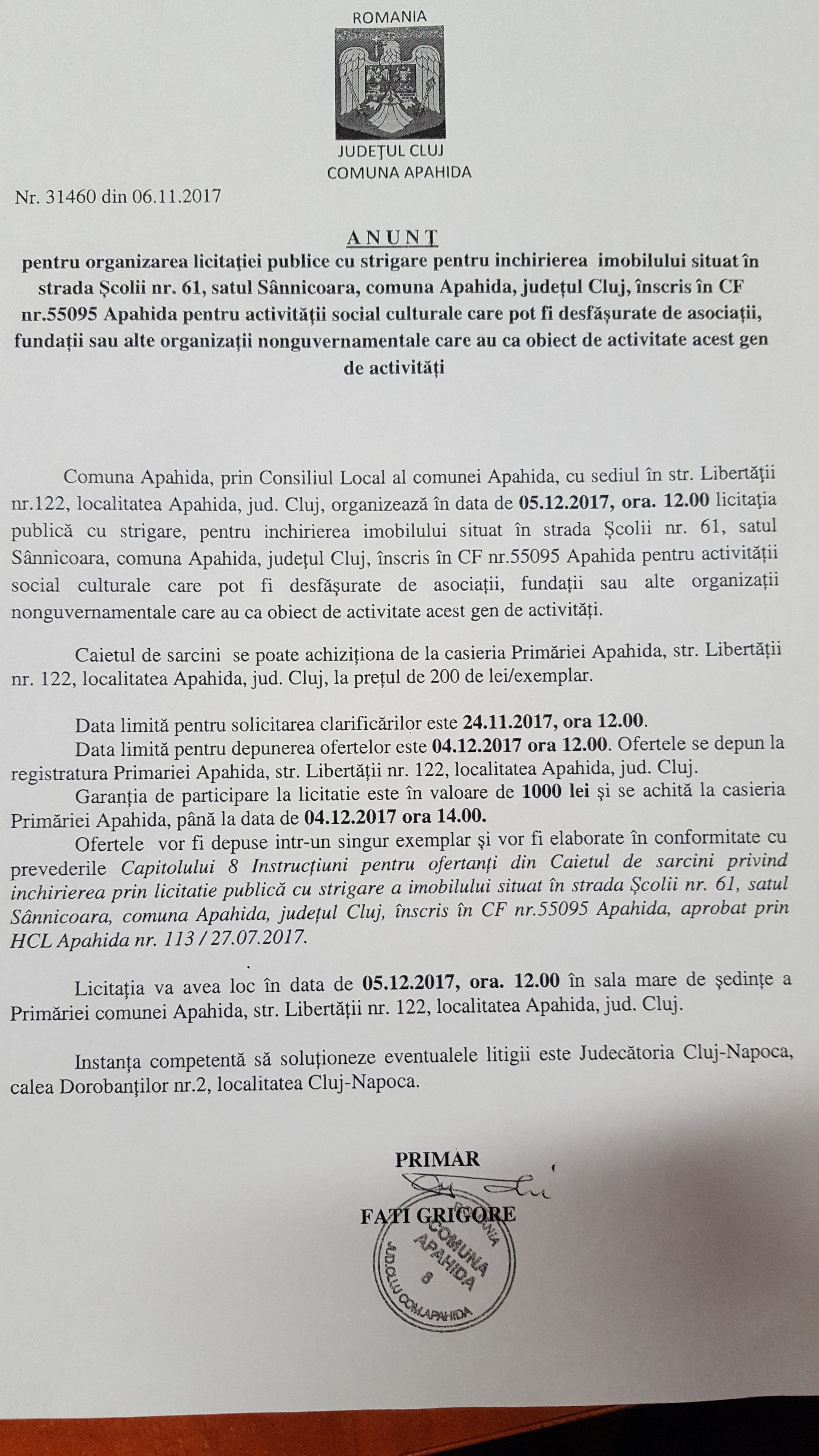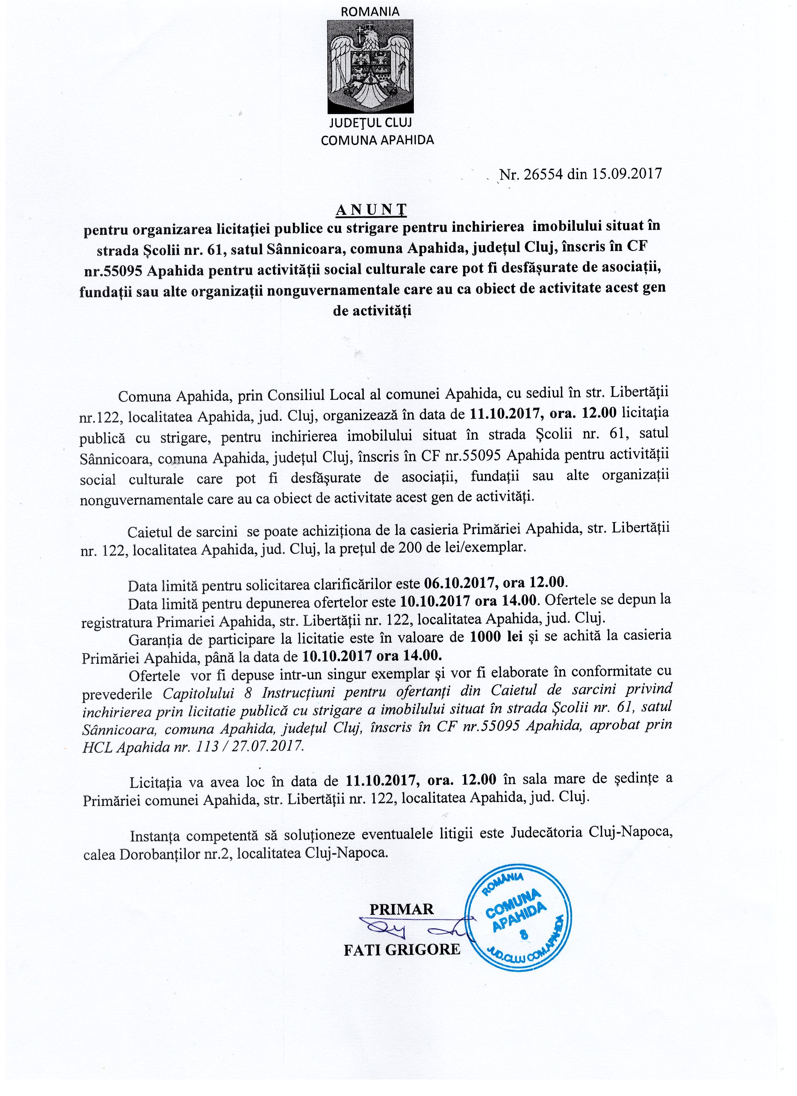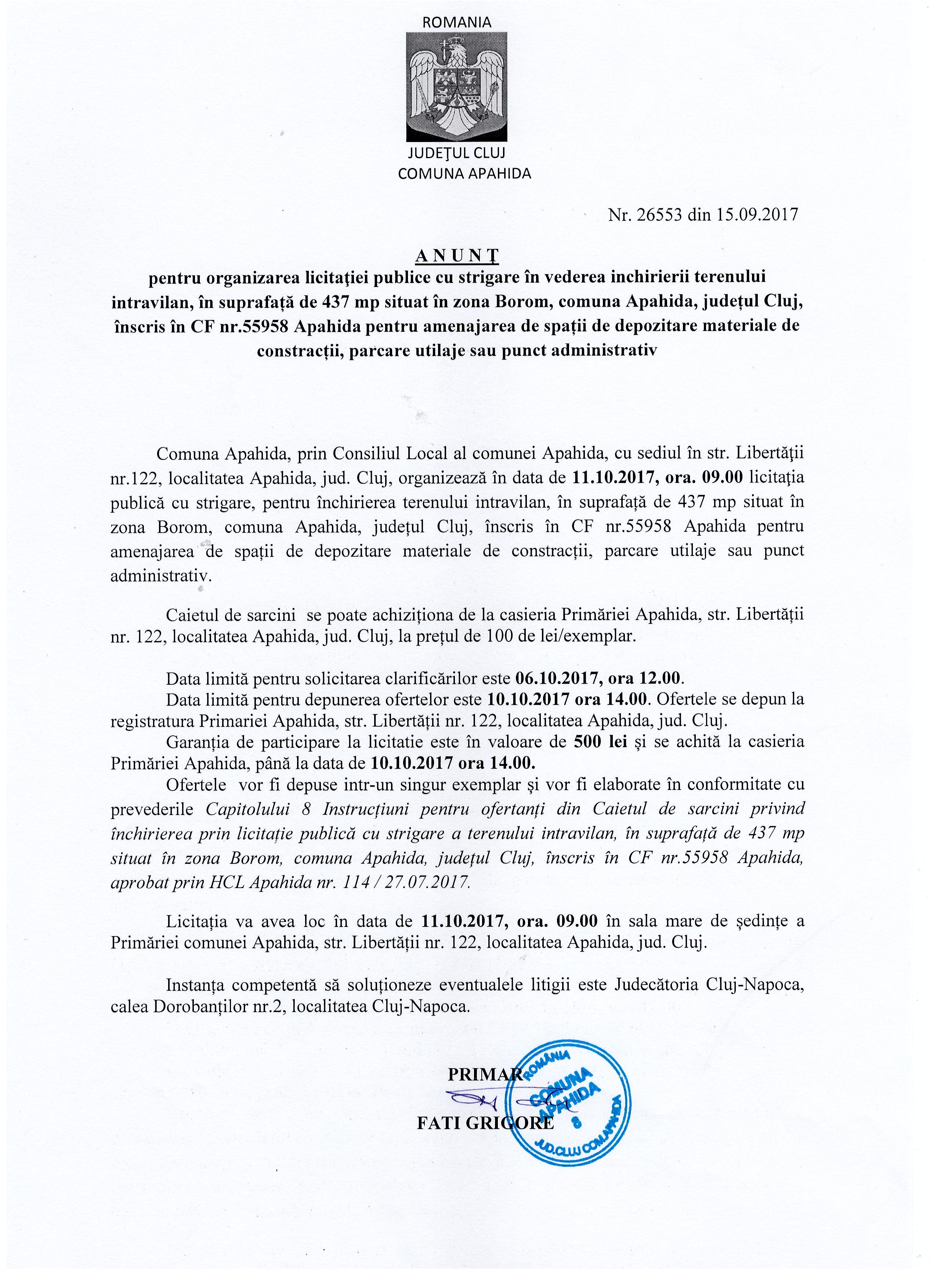 | 08.01.2016 | ANUNT pentru organizarea licitatiei publice in vederea concesionarii imobilului teren in suprafata de 3745 mp situat in tarla 25, parcela 730, din localitatea Sannicoara, comuna Apahida, inscris in CF nr. 57653 Apahida, sub nr. cadastral 57653, imobil apartinand domeniului public al comunei Apahida. (vezi document) |