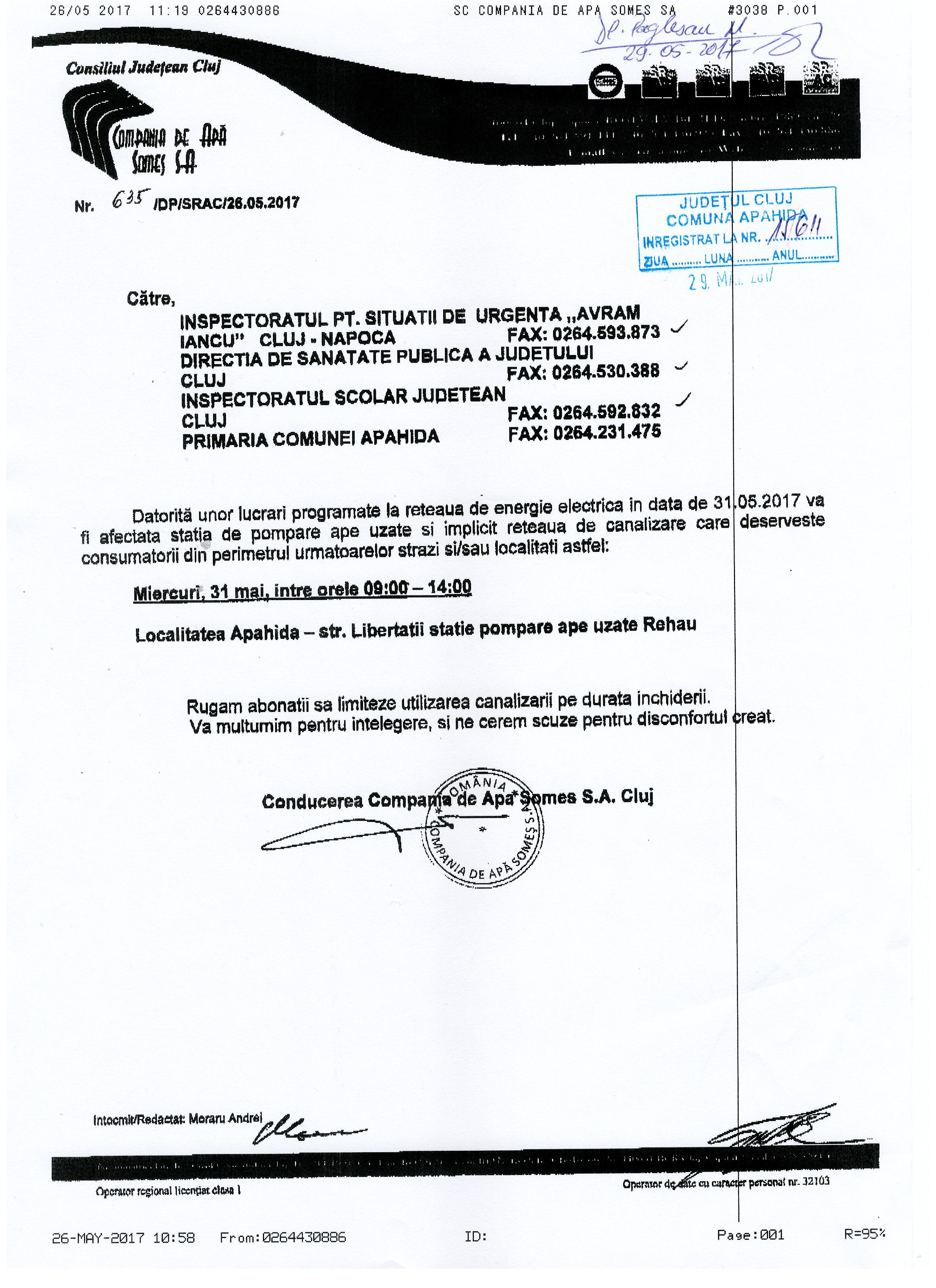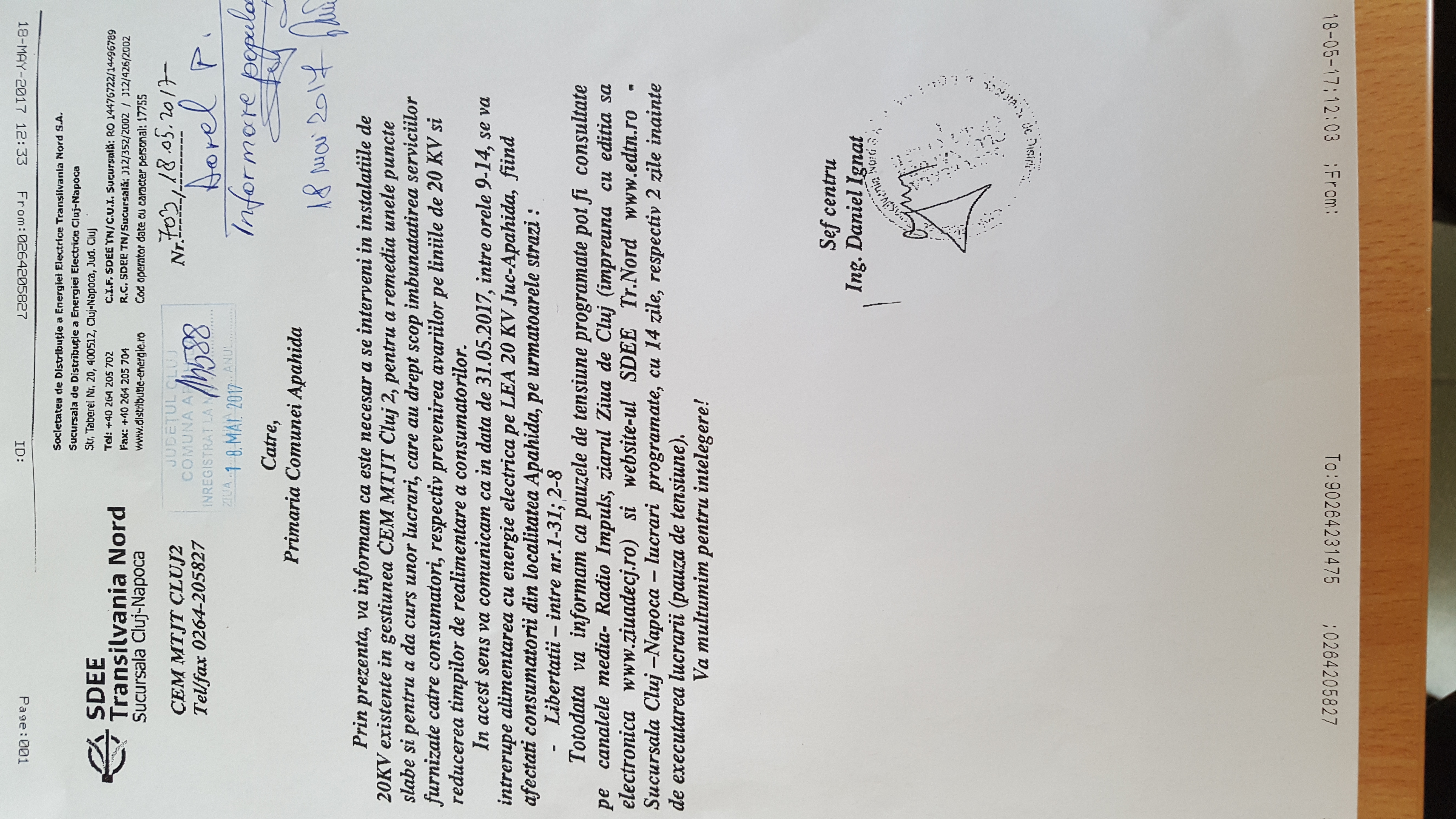 | 30.06.2016 | ANUNT FOARTE IMPORTANT PENTRU ZONA MOLITURA APAHIDA. Azi 30 iunie 2016 s-a predat reteaua LEA 0,4 KV catre Electrica SA SDEE , PL GHERLA, din ZONA MOLITURA str. Mircea cel Batran.(in baza contractului de comodat nr.15950/22.06.2016). PRIMAR, FATI GRIGORE |