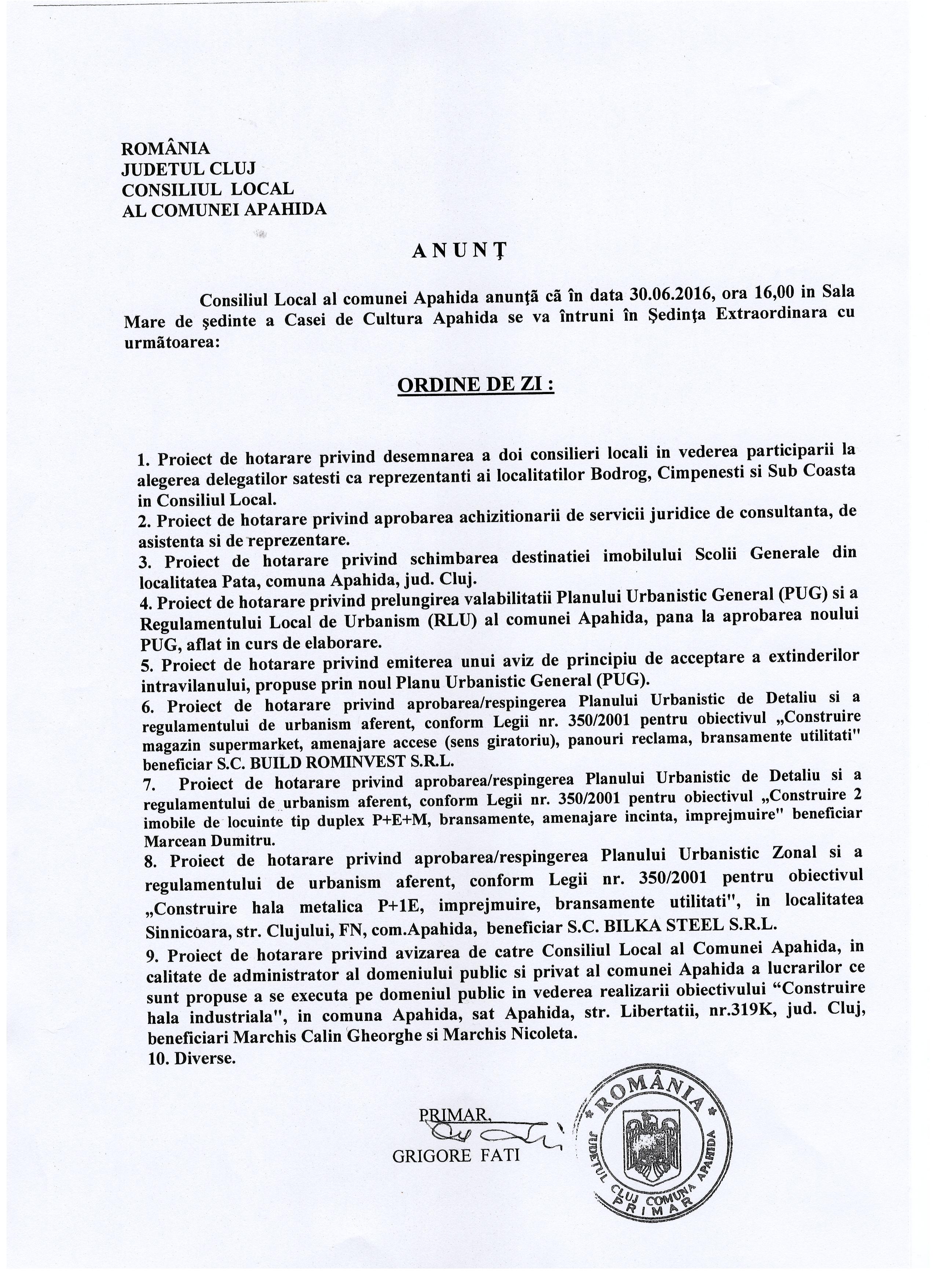 | 29.06.2016 | ANUNT Consiliul Local aI comunei Apahida anunÅ£ã ca în data 30.06.2016, ora 16,00 in SaIa Mare de sedinte a Casei de Cultura Apahida se va întruni în Sedinta Extraordinara cu ordinea de zi din fisierul atasat (vezi ordinea de zi)... |
