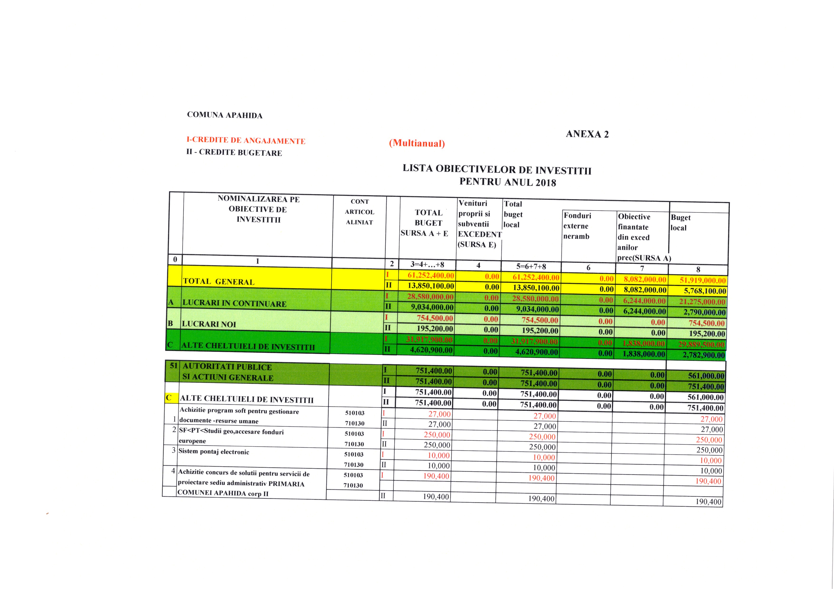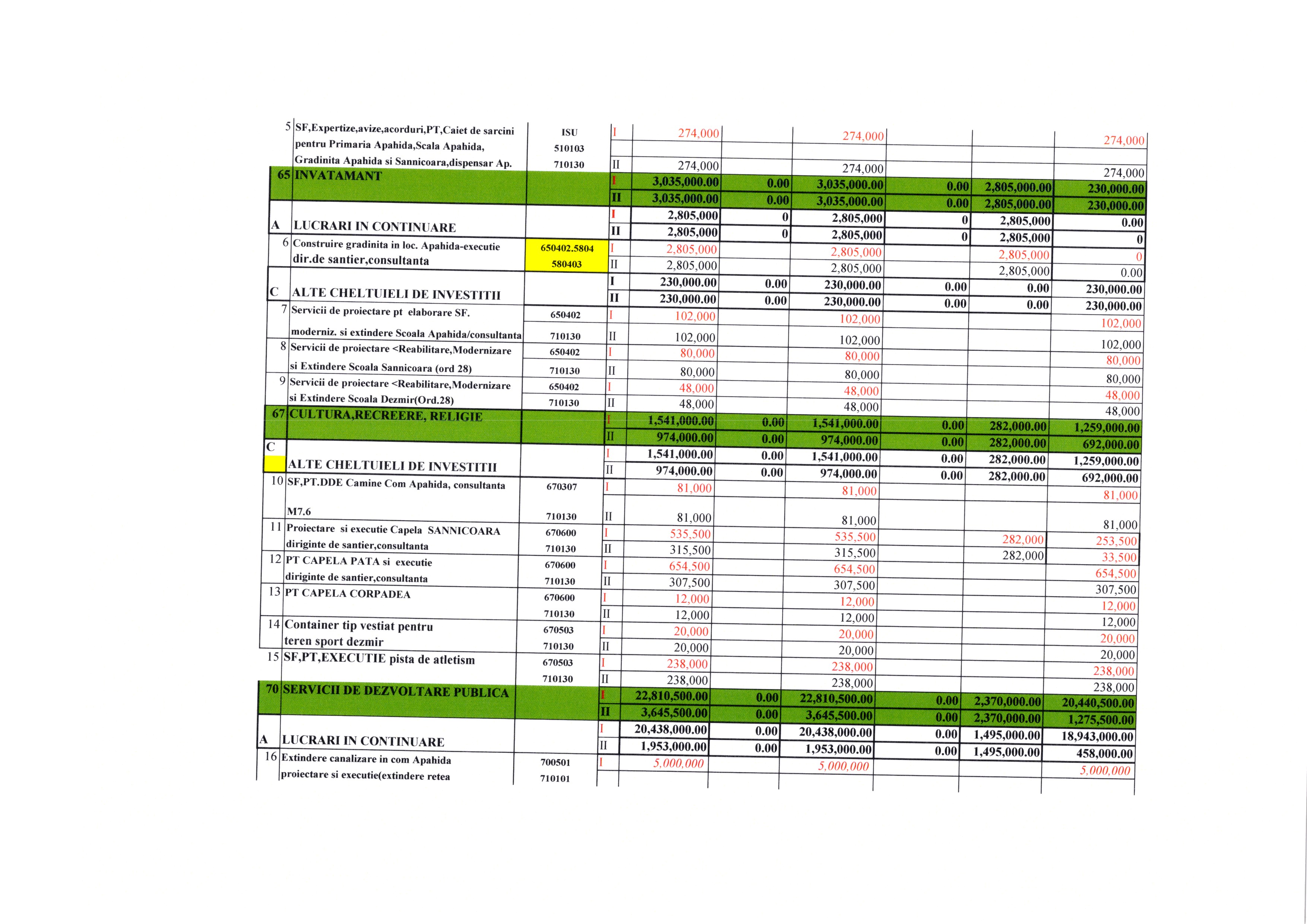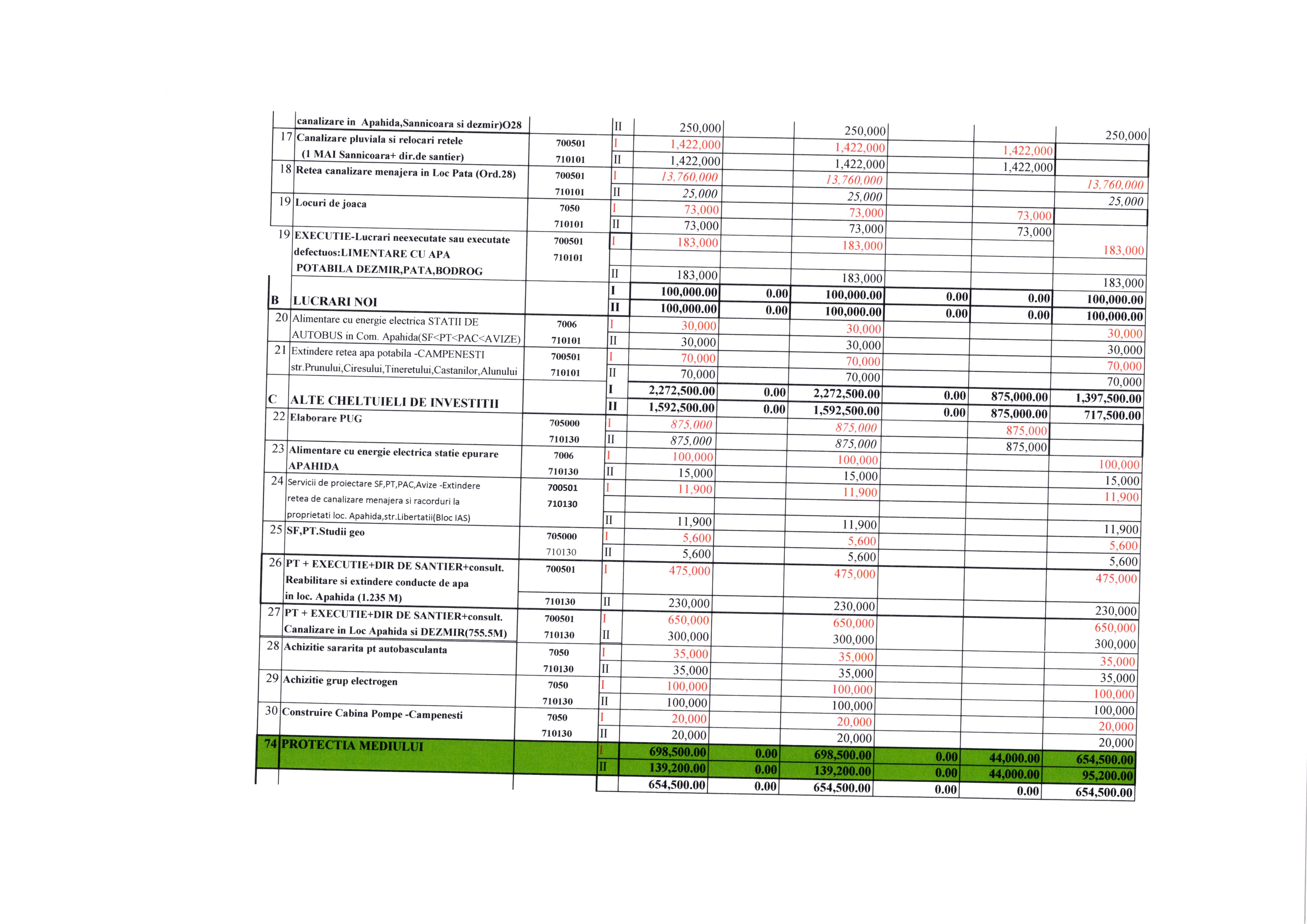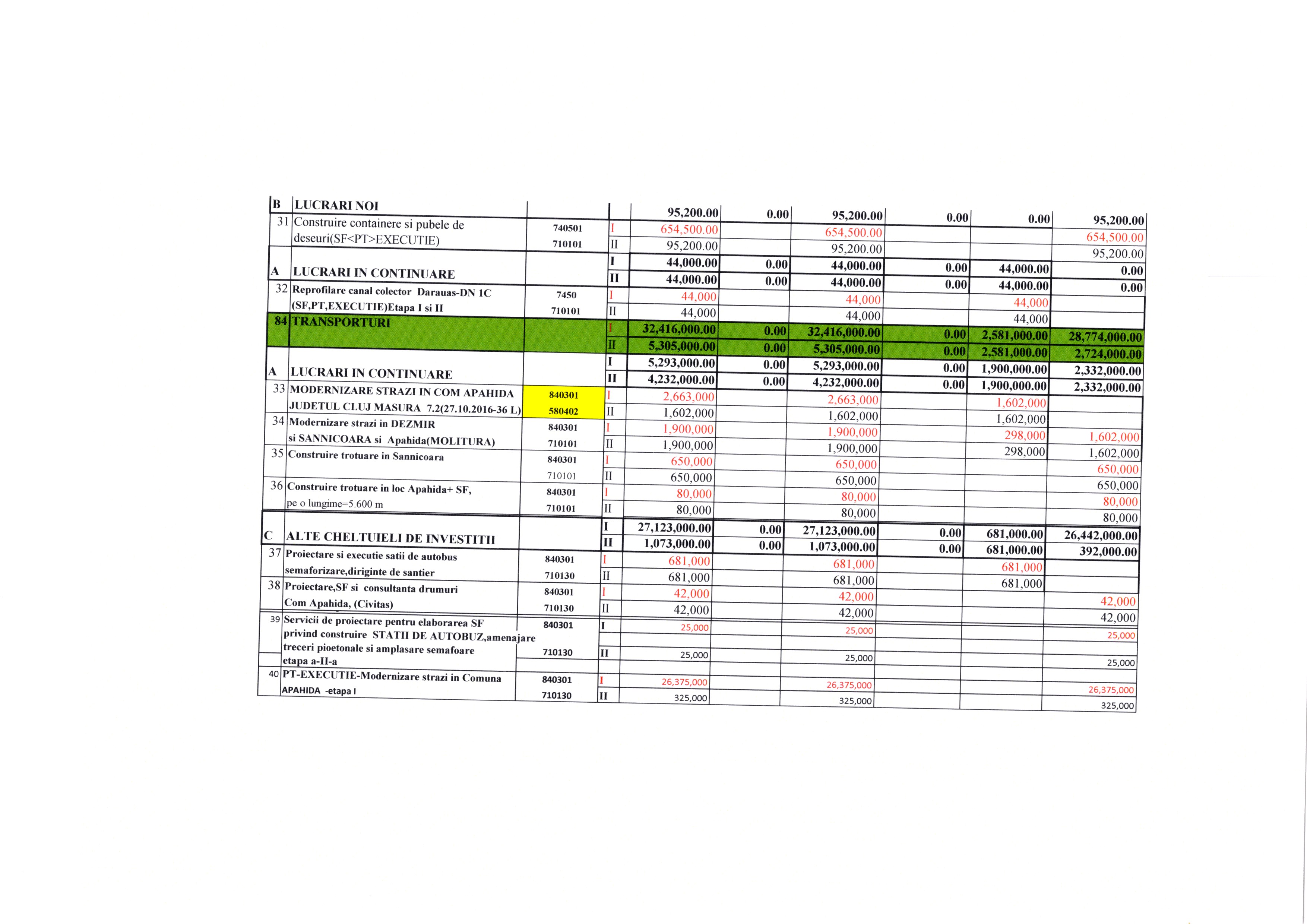| 25.10.2016 | Programul de "Modernizare si reabilitare strazi in com. Apahida", cod CPV 45233140-2 Lucrari de drumuri (Rev.2). Cerere de oferta, Ordonanta 34/2006. Contractul de modernizare este semnat din data de 30.06.2016, cu o durata a contractului de 20 luni de la data emiterii ordinului de incepere a lucrarilor, si o suma de 9.220.776,06 la care se adauga TVA , contractul este de tip bianual se desfasoara pe perioada a doi ani 2016-2017. Modernizare strazi in satele Dezmir si Sannicoara si DC41 Str. Tudor Vladimirescu din Apahida, dupa cum urmeaza : (vezi detalii...) |