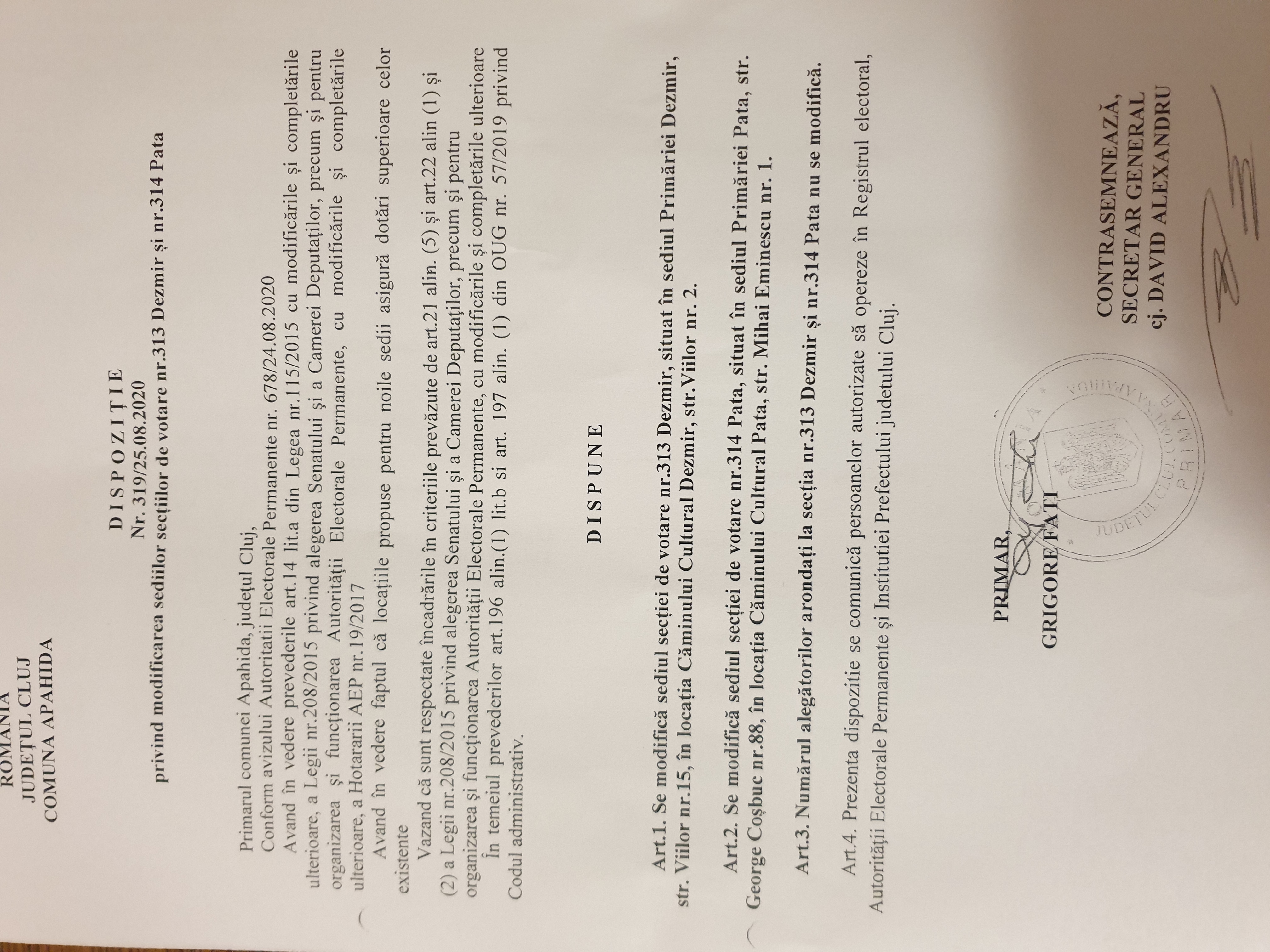 | 29.04.2016 | DISPOZIÅ¢IE Nr. 363/29.04.2016 privind locurile in care sunt interzise organizarea si desfasurarea adunarilor publice Comunei Apahida. Se interzice organizarea si desfasurarea adunarilor publice in zona Garii Apahida, situata in str. Libertatii‚ nr. 6. |