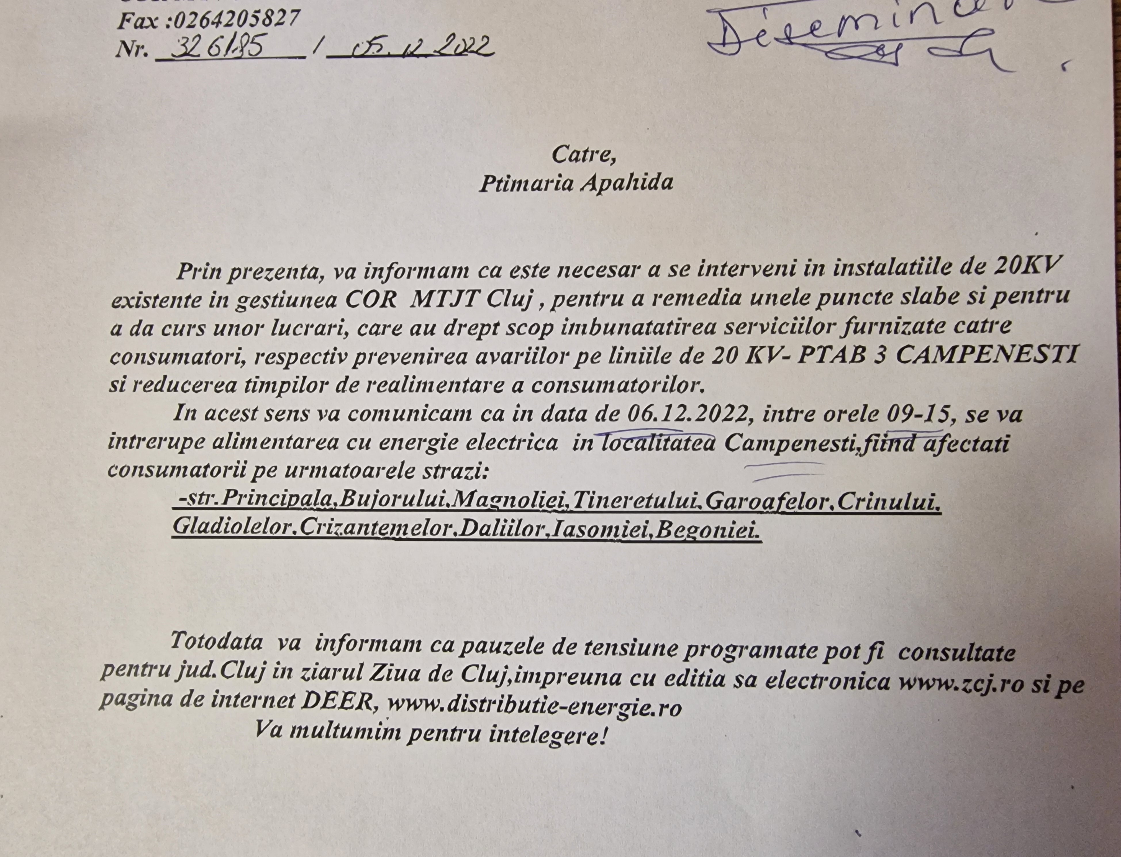 - Libertatii de la Primaria Apahida pana la intersectia cu str. Tudor Vladimirescu, - Barcului nr. 1-7, - E. Pascu , Mihai Eminescu, Crisan, Decebal, Parcului, Horea( inclusiv Primaria Apahida ) , integral -Republicii bl. 1-2-3-4. Intreruperea energiei electrice are ca scop imbuntatairea serviciilor furnizate catre consumatori si solicitarilor primariei pentru lucrari la iluminatul public.