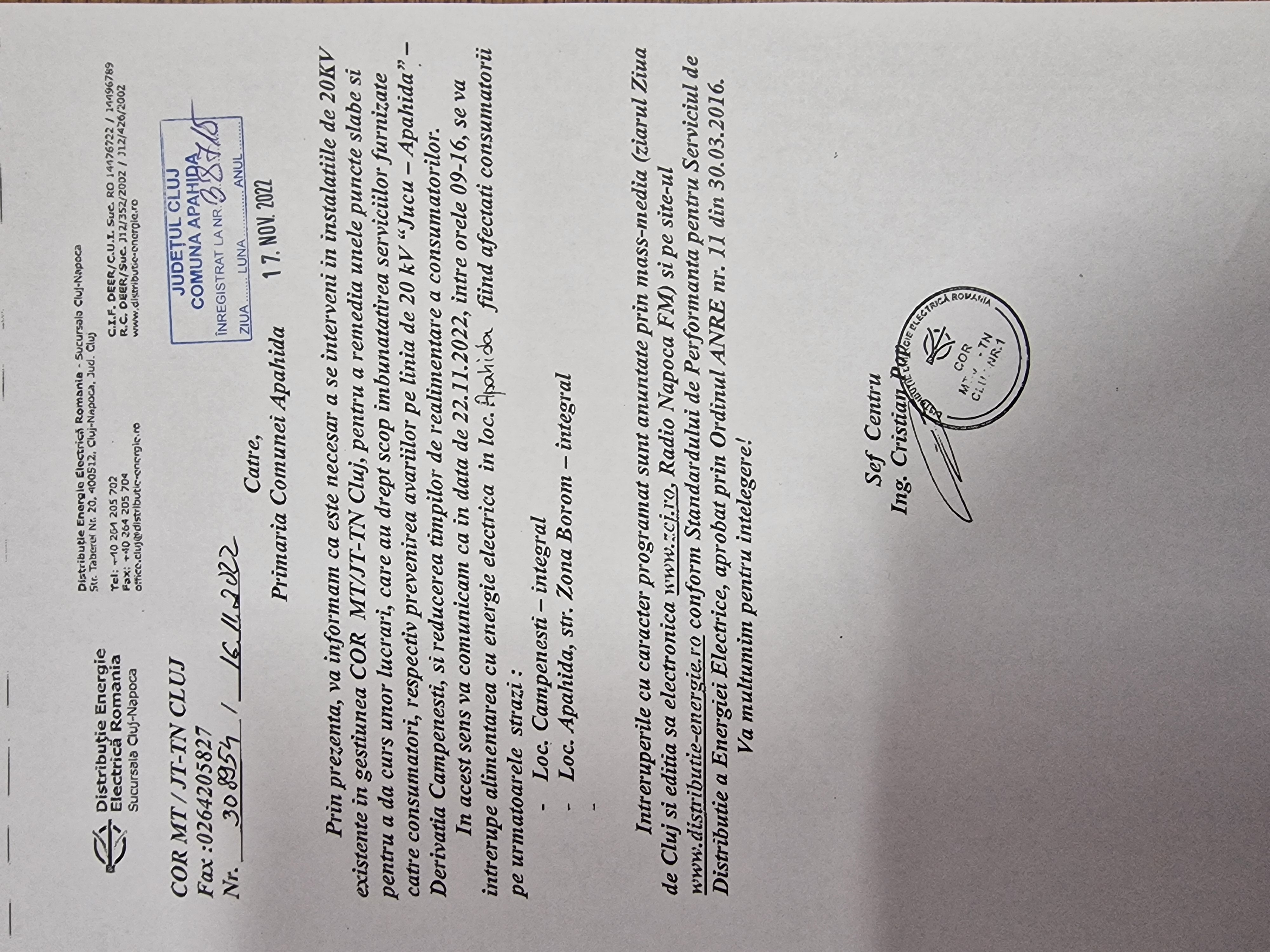 | 21.10.2025 | Întrerupere alimentare cu energie electrică in locatitatea Câmpenești în data de 23.10.2025 între orele 09.00-16.00 - vezi anunț |