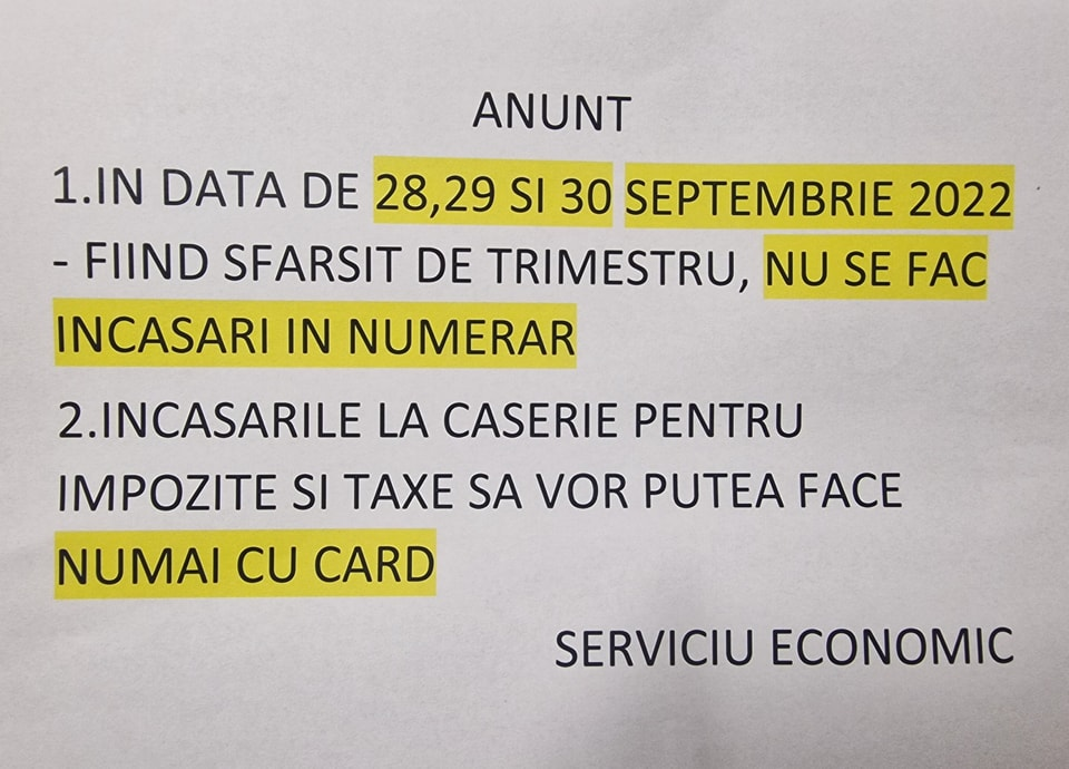Incepand cu 1 octombrie 2015, taxa speciala de salubrizare se va incasa numai la caseria Primariei Apahi