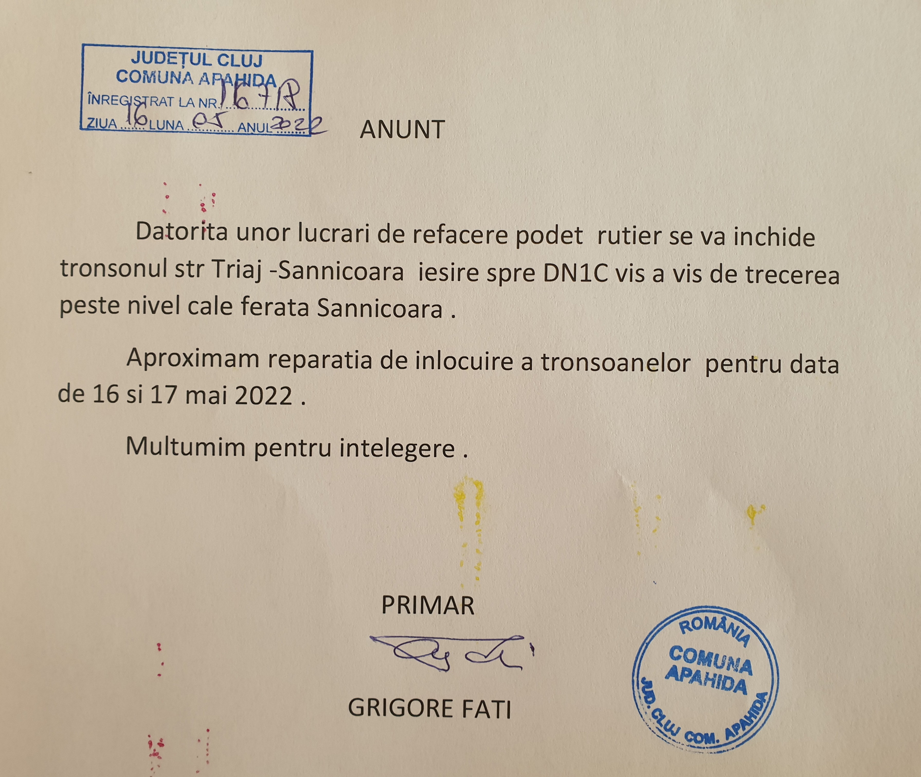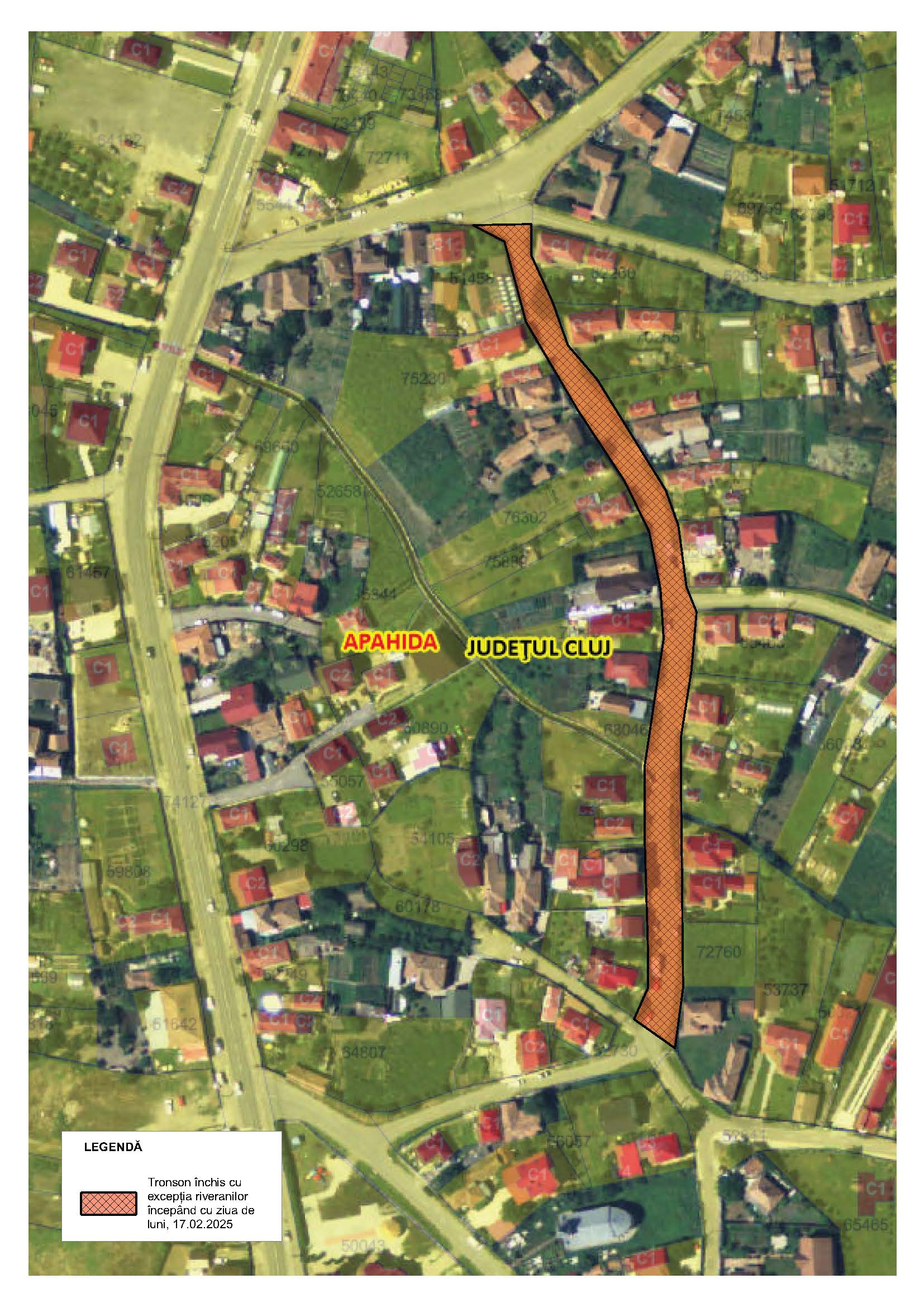 | 25.04.2025 | ANUNȚ IMPORTANT ! Pentru protejarea tronsonului de drum STRADA ȘCOLII – DEZMIR, Primăria Comunei Apahida anunță instituirea ACCESULUI INTERZIS CU EXCEPȚIA RIVERANILOR. Această măsura va proteja construcția imobilului CREȘĂ DEZMIR și infrastructura edilitară de o alunecare de teren iminentă. |