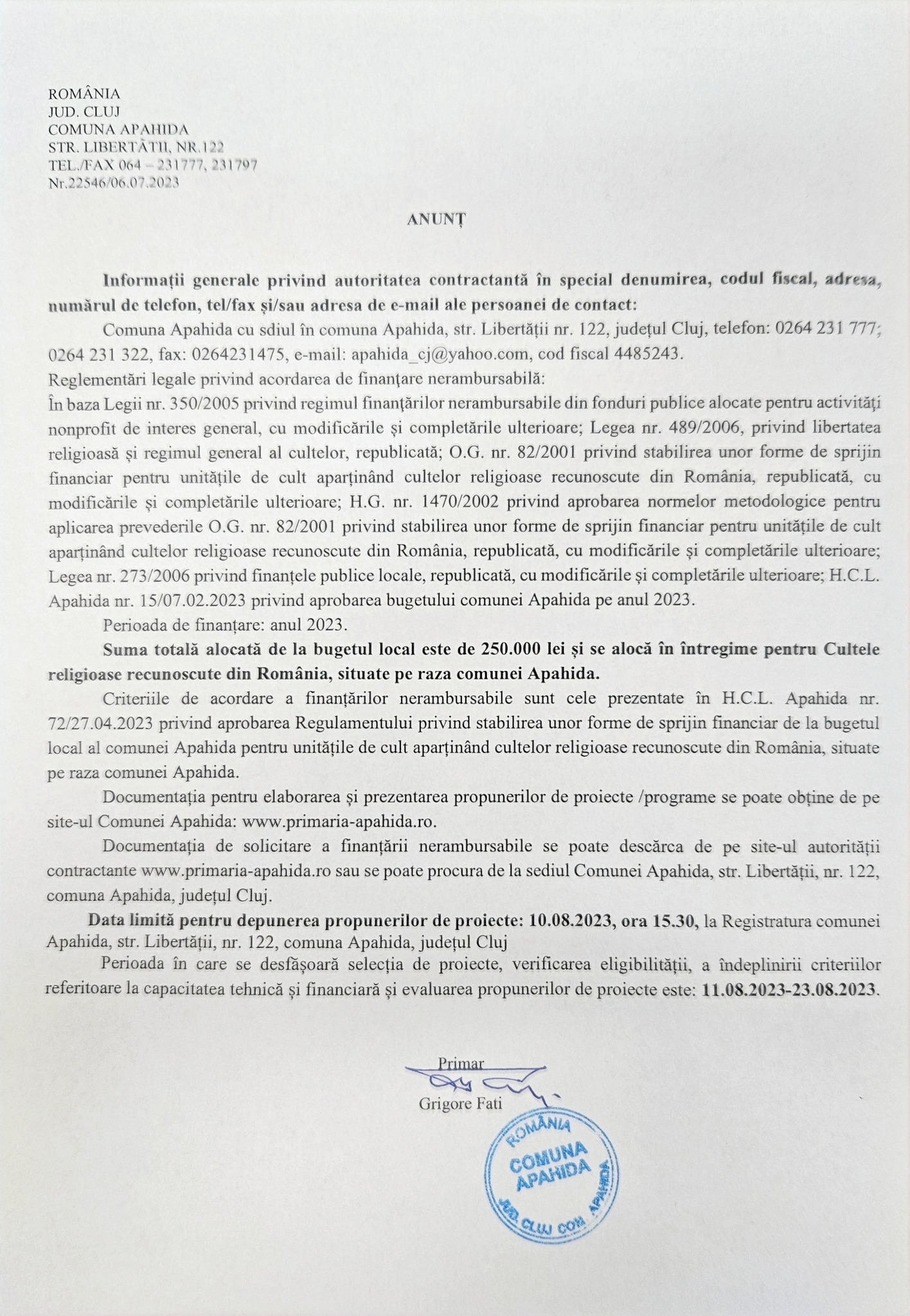 | 17.10.2025 | Anunț privind repartizarea sumelor reprezentând sprijin financiar de la bugetul local al comunei Apahida, pentru unităţile de cult aparţinând cultelor religioase recunoscute din România, situate pe raza comunei Apahida, pentru anul 2025 - vezi anunț |
