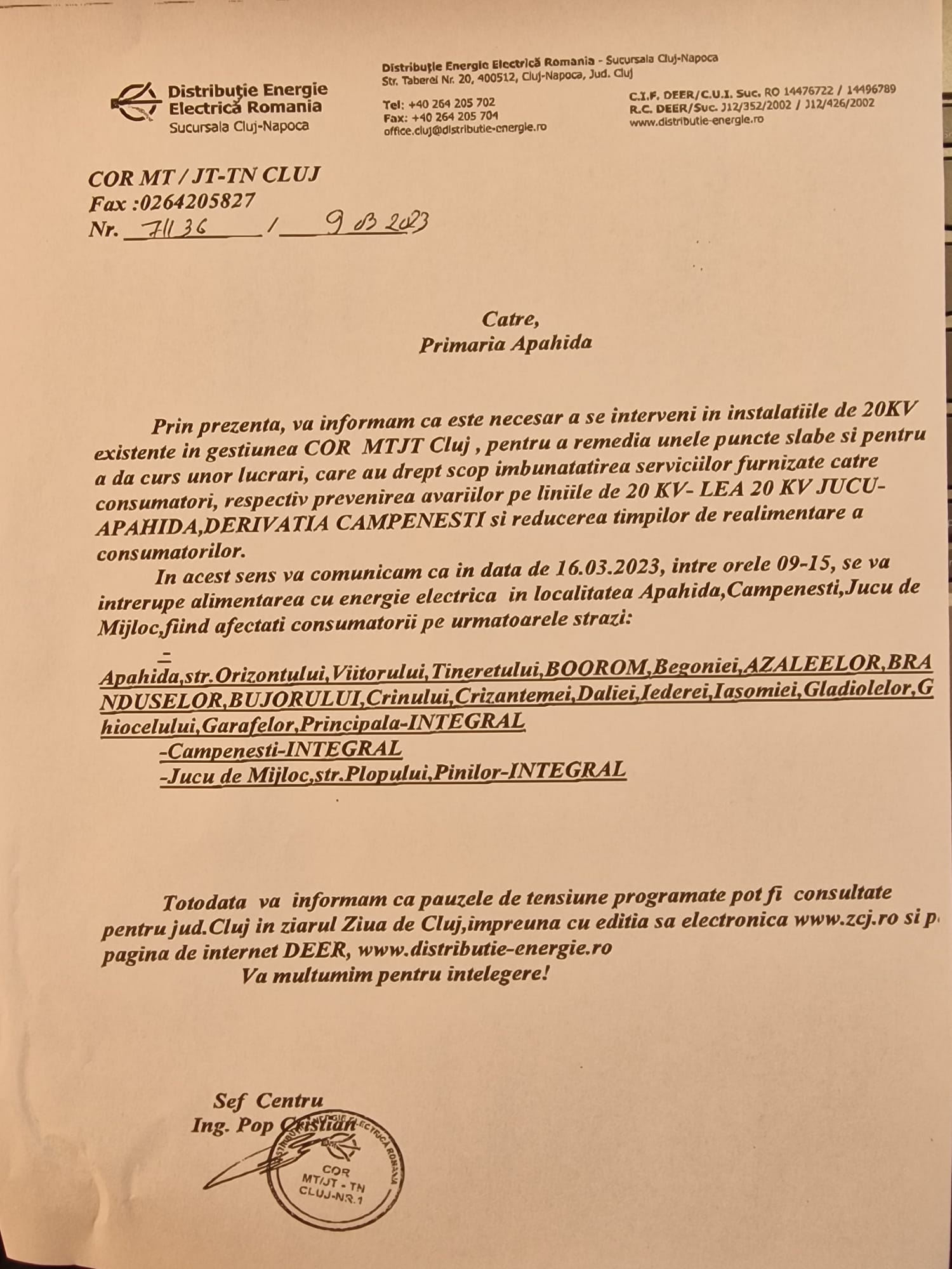 | 11.04.2016 | Atentie, se va intrerupe alimentarea cu Energie electrica, in data de 12.04.2016 intre orele 09:00-16:00, zona afectata in comuna Apahida fiind strazile: Tudor Vladimirescu, de la intersectia cu str. Liliacului pâna la capat spre Jucu, I.C. Bratianu, Campia, Morii, Octavian Paler, Iuliu Maniu, Amurgului, 1 Mai - toate integral (...vezi anunt) |